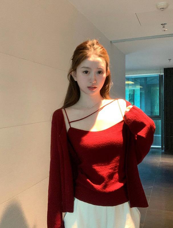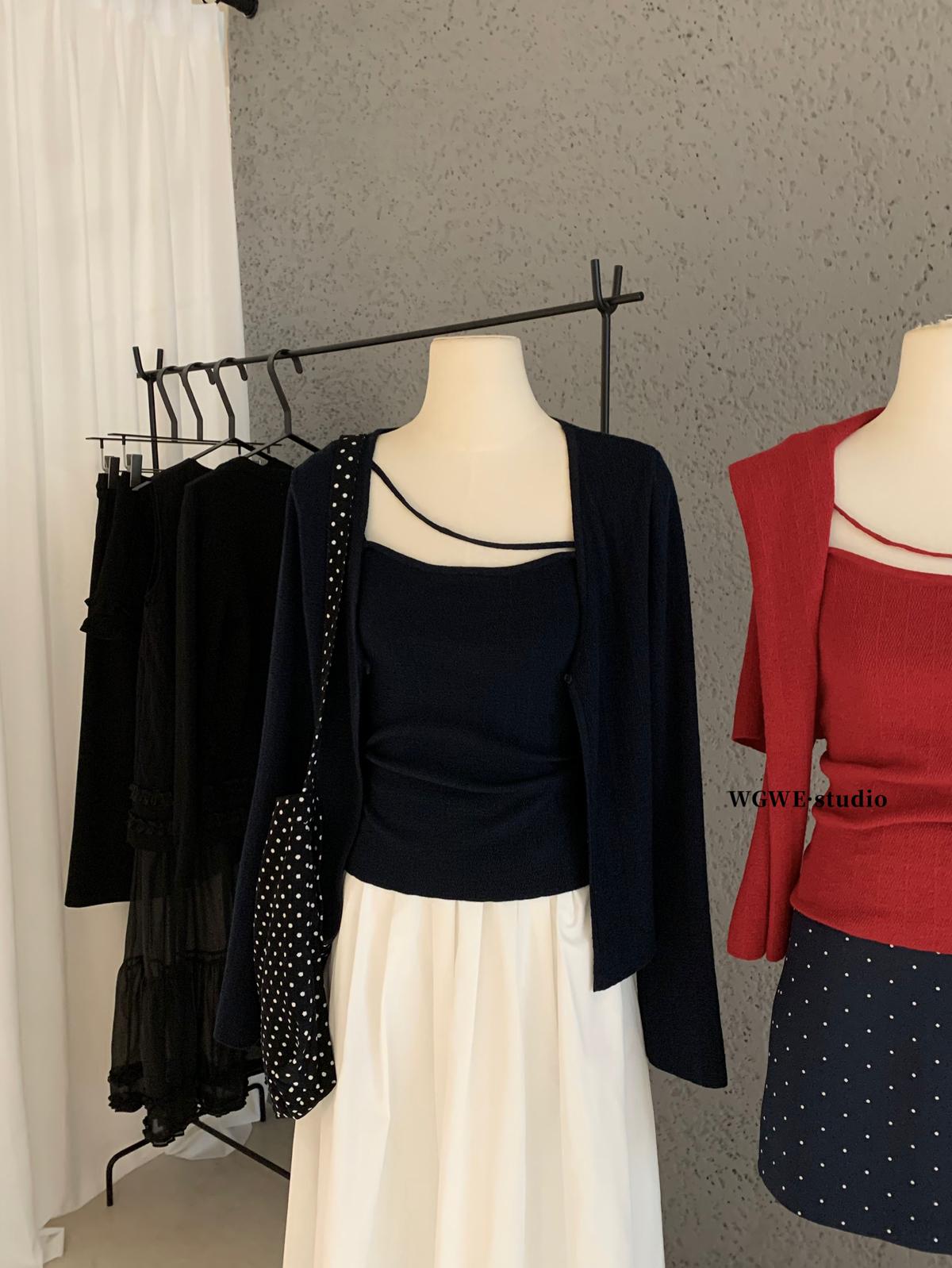 【C7701】針織開衫外套上衣+吊帶背心兩件套修身顯瘦時尚套裝