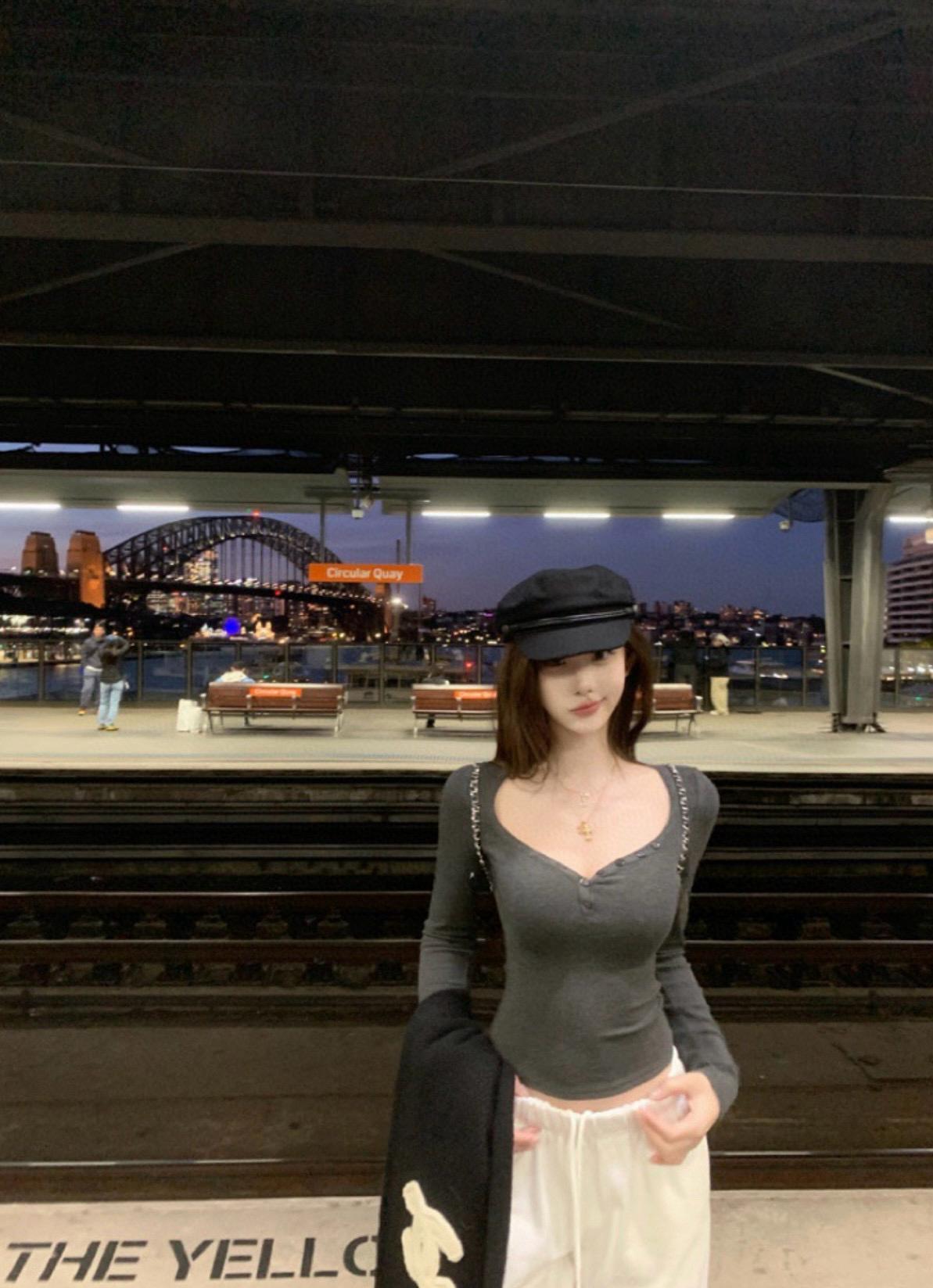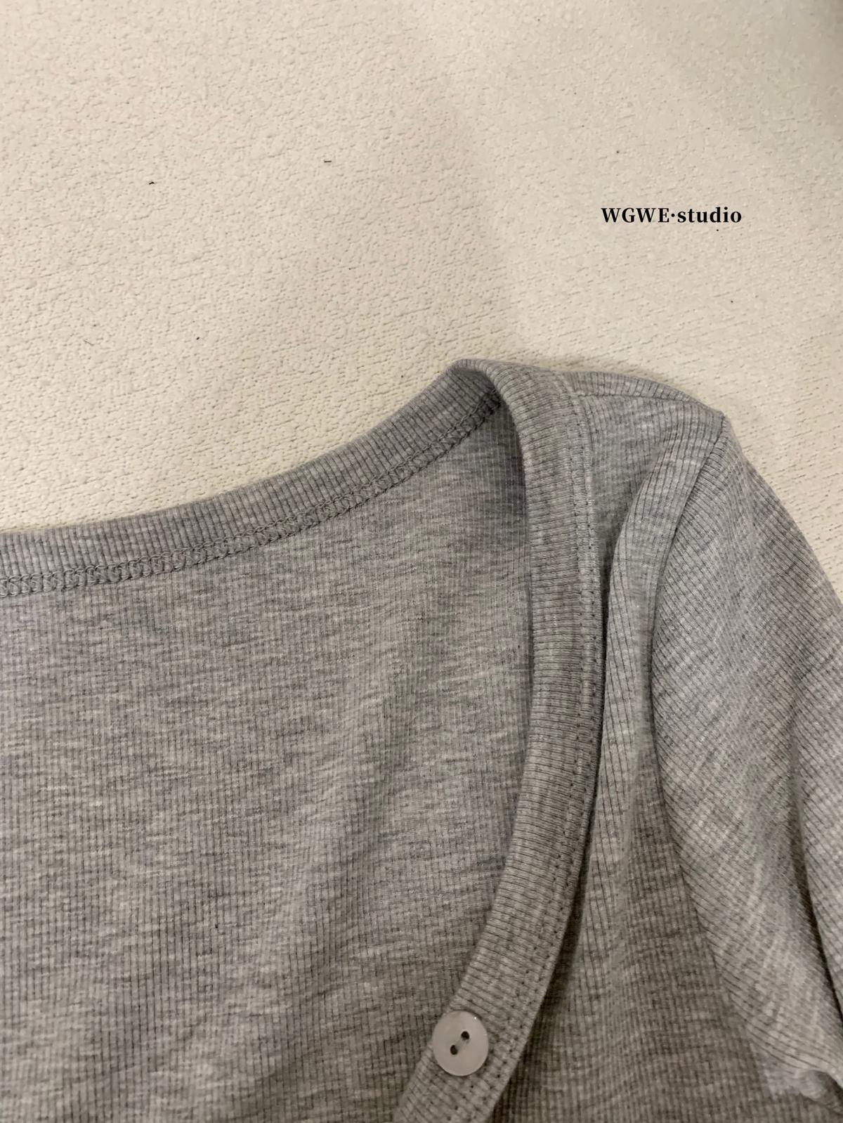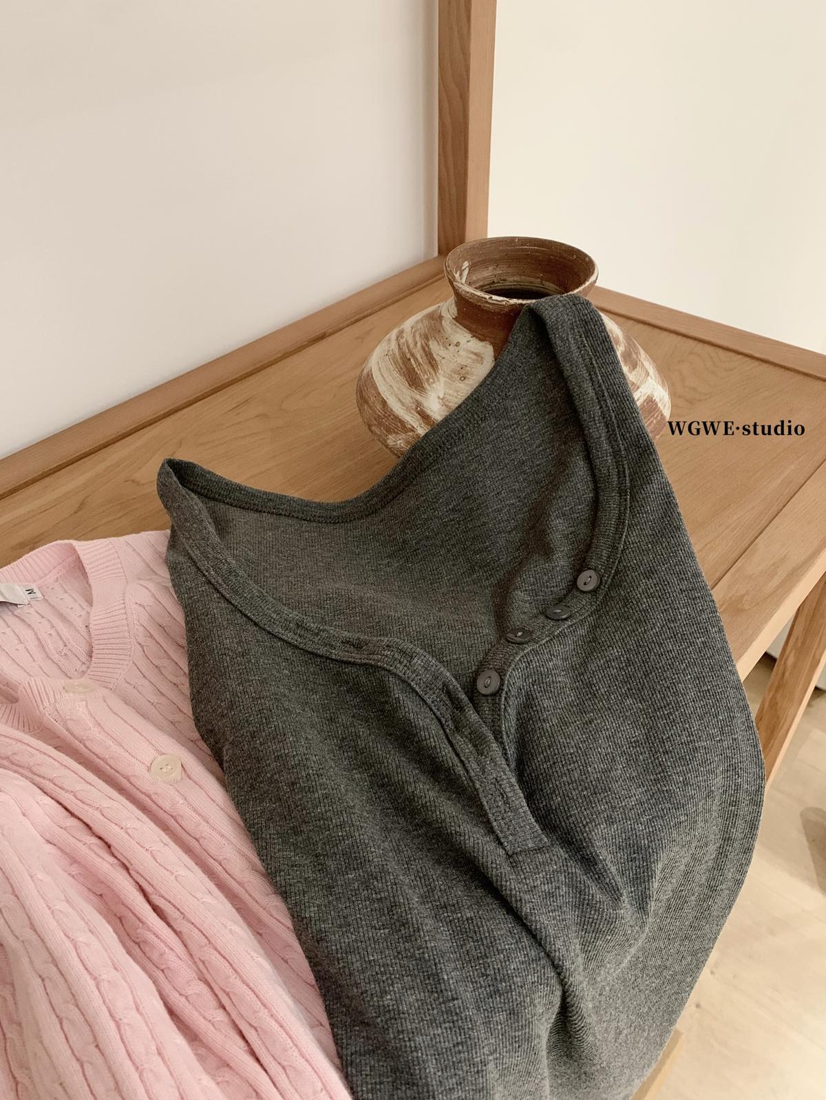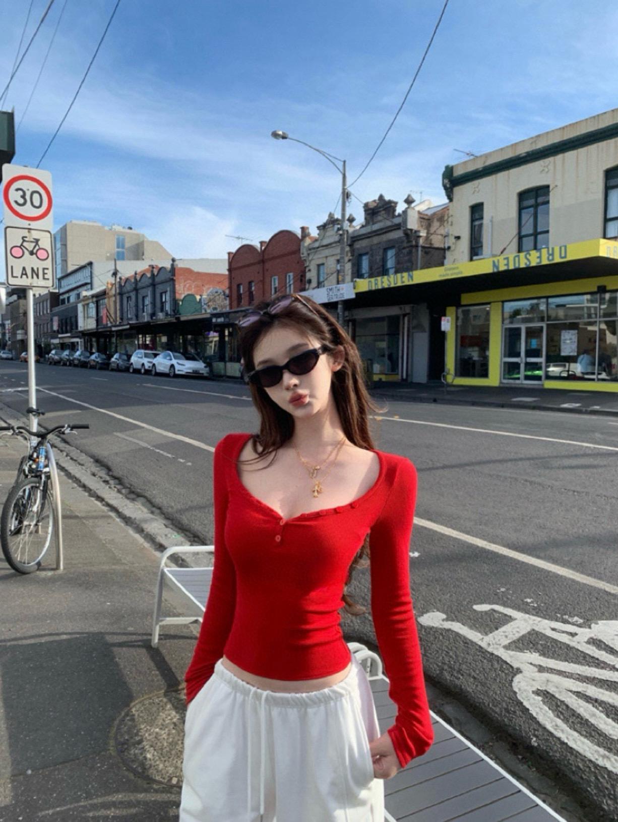 3. 【C7712】辣妹風桃心領鈕釦長袖單穿修身顯瘦長袖T恤