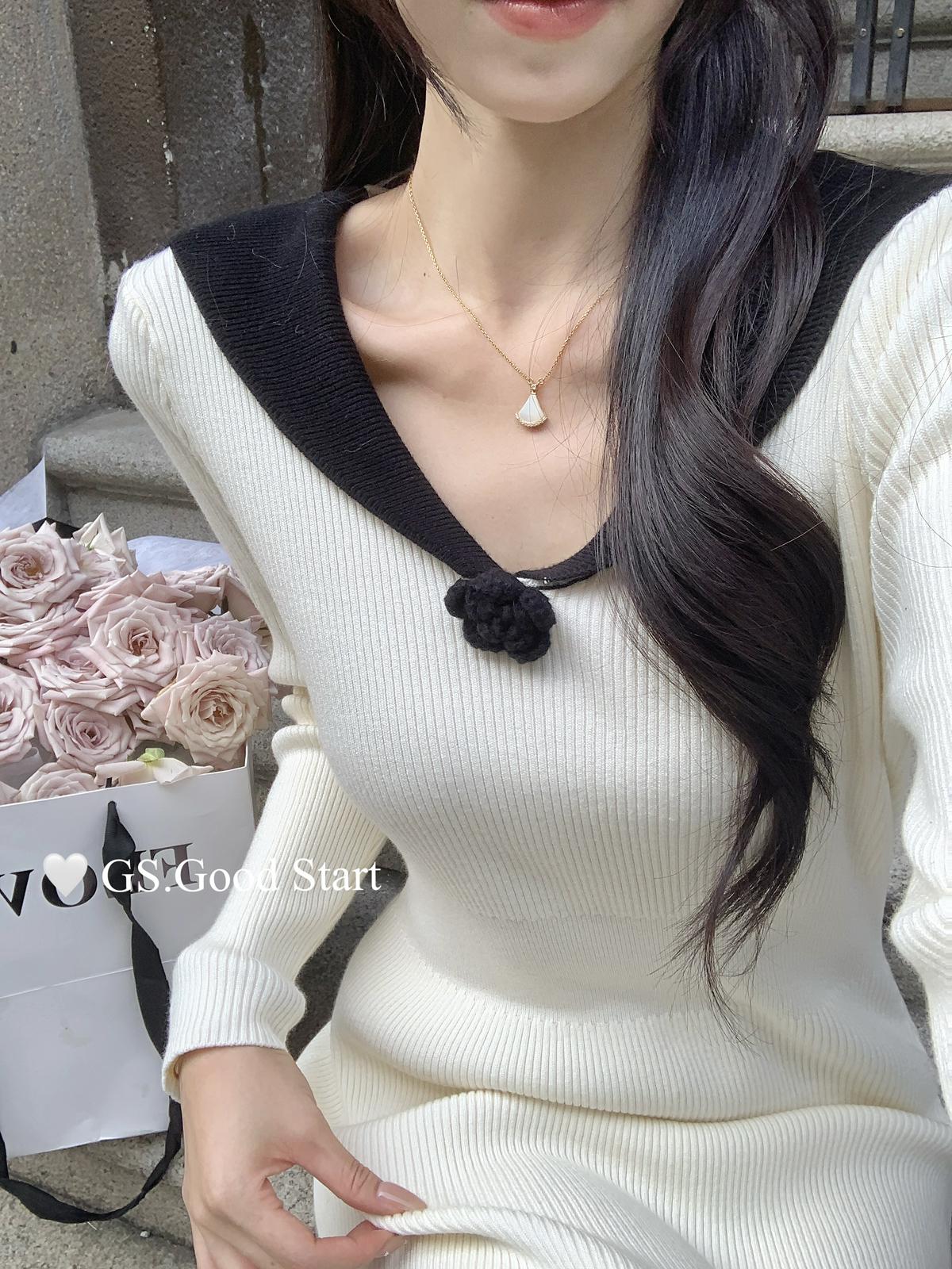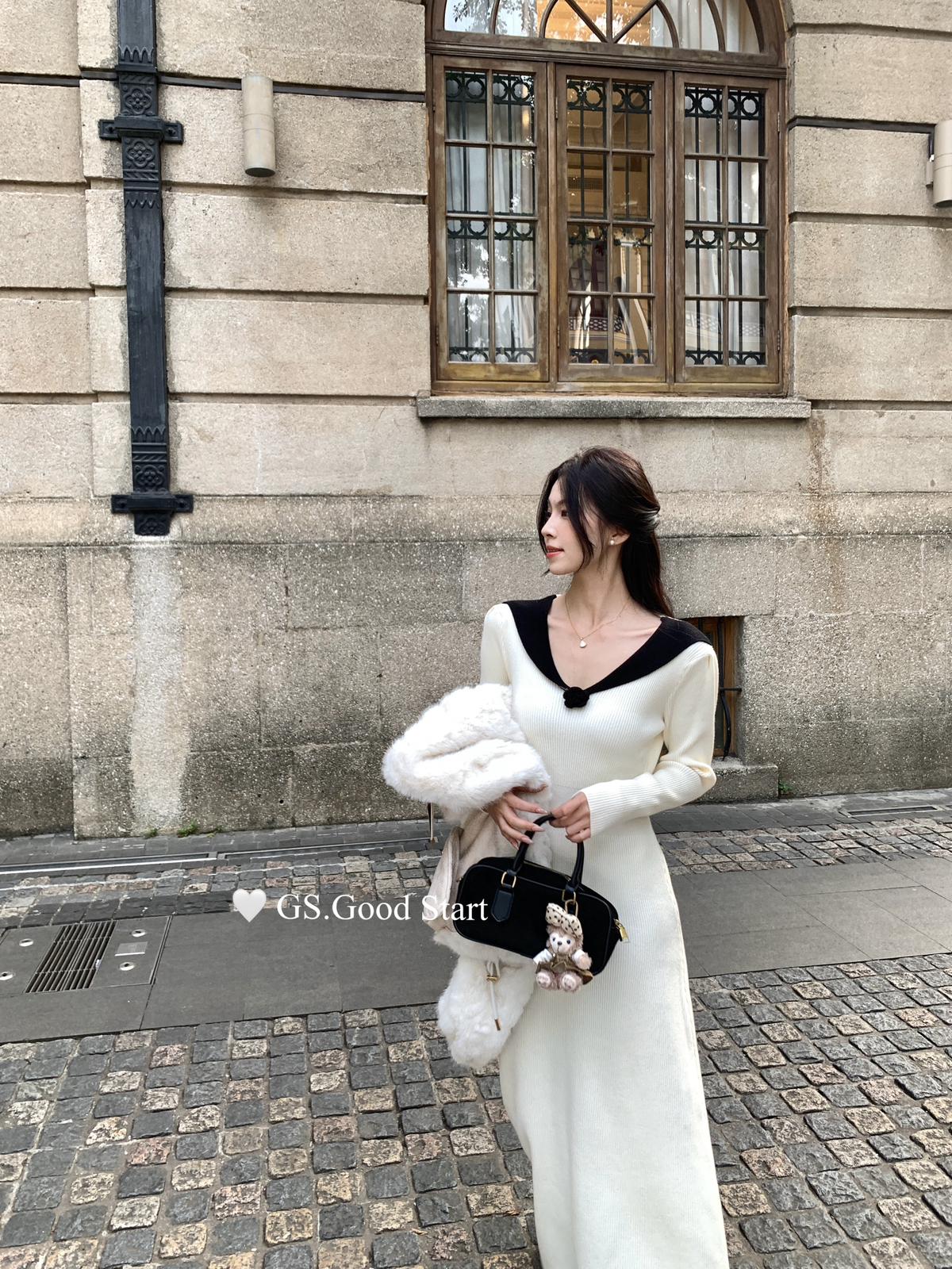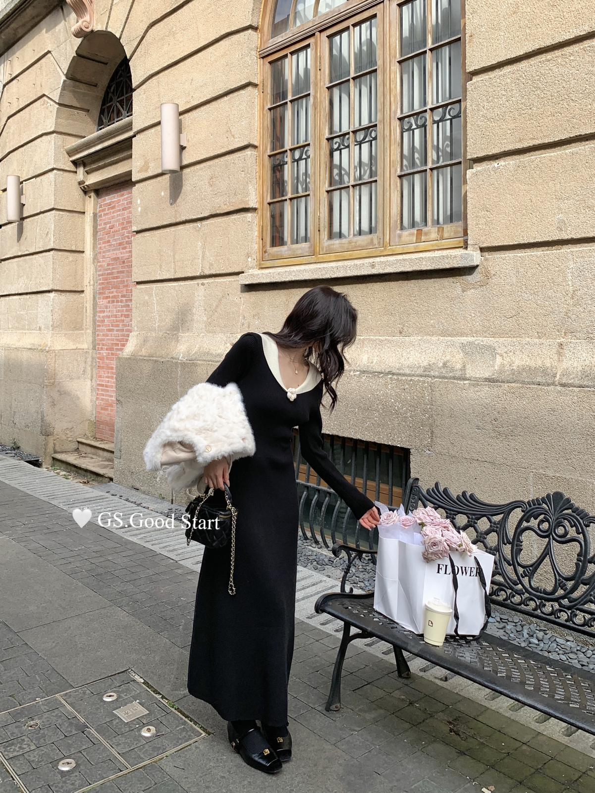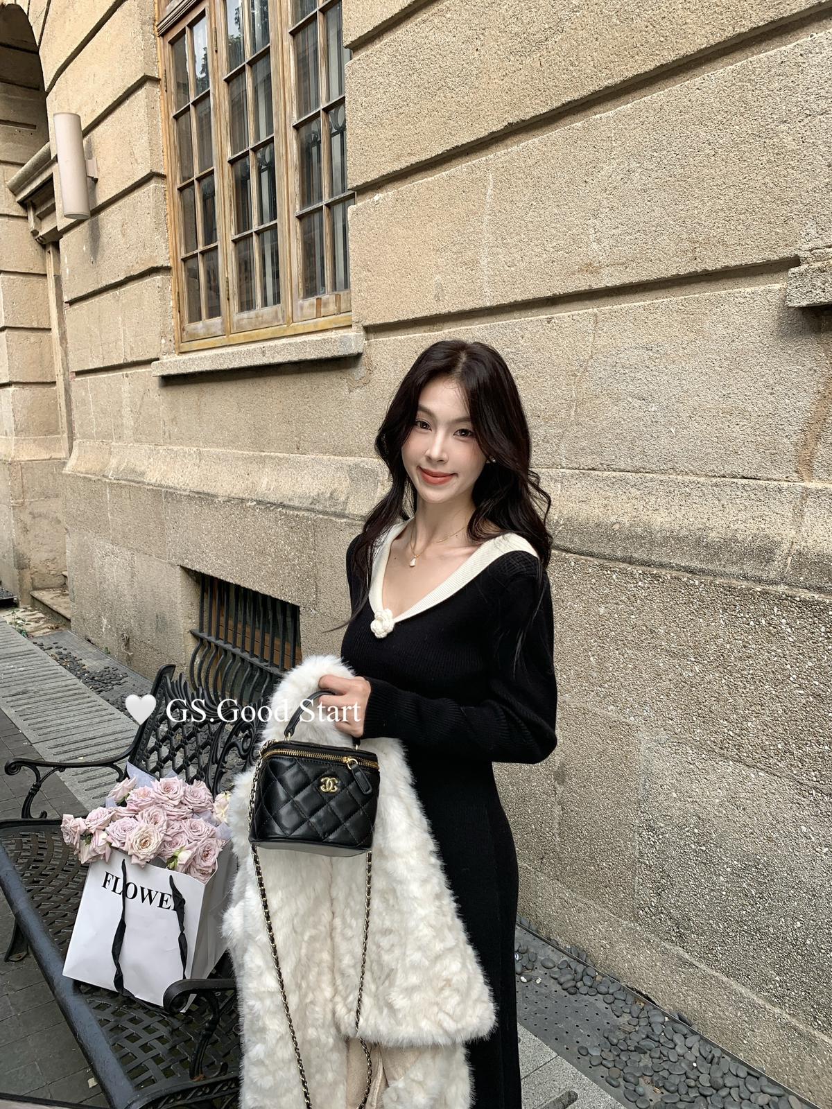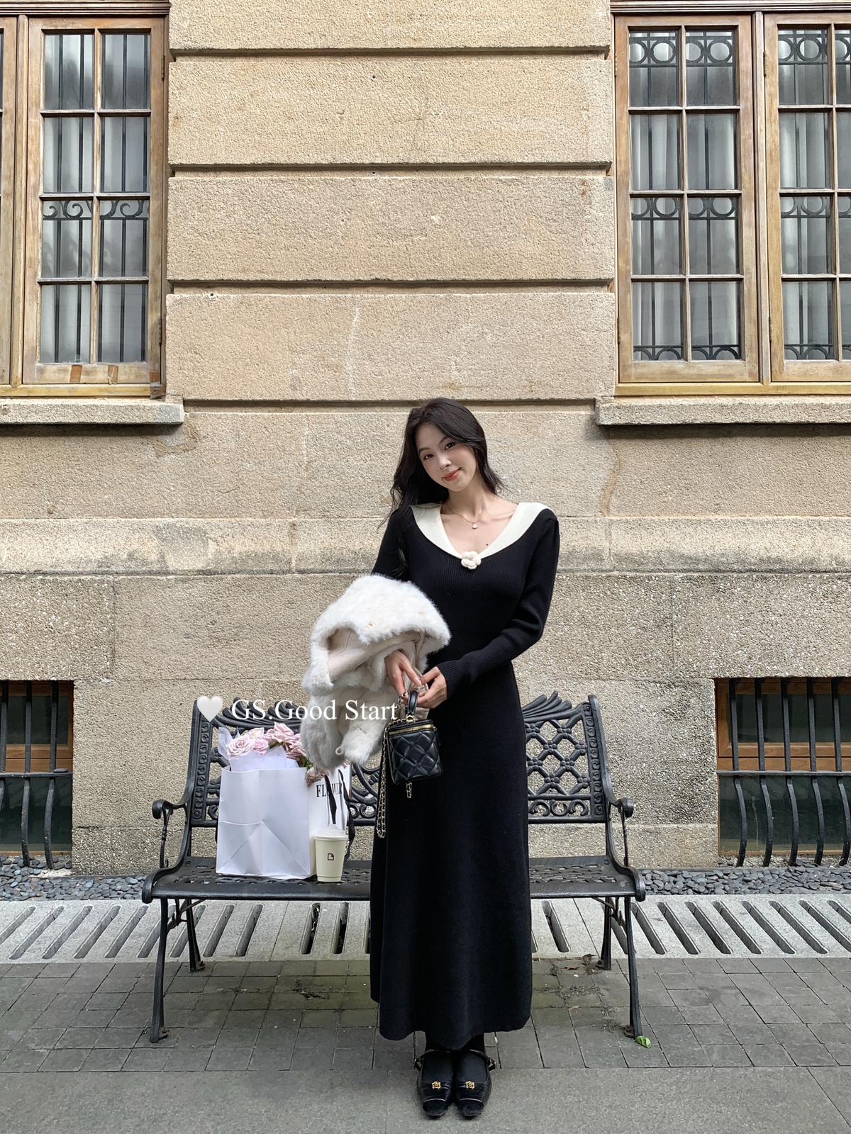 【C7736】美爆了*仙品赫本裙!強推必入!秋冬法式溫柔氣質v領針織顯瘦連衣裙(配花朵可拆)