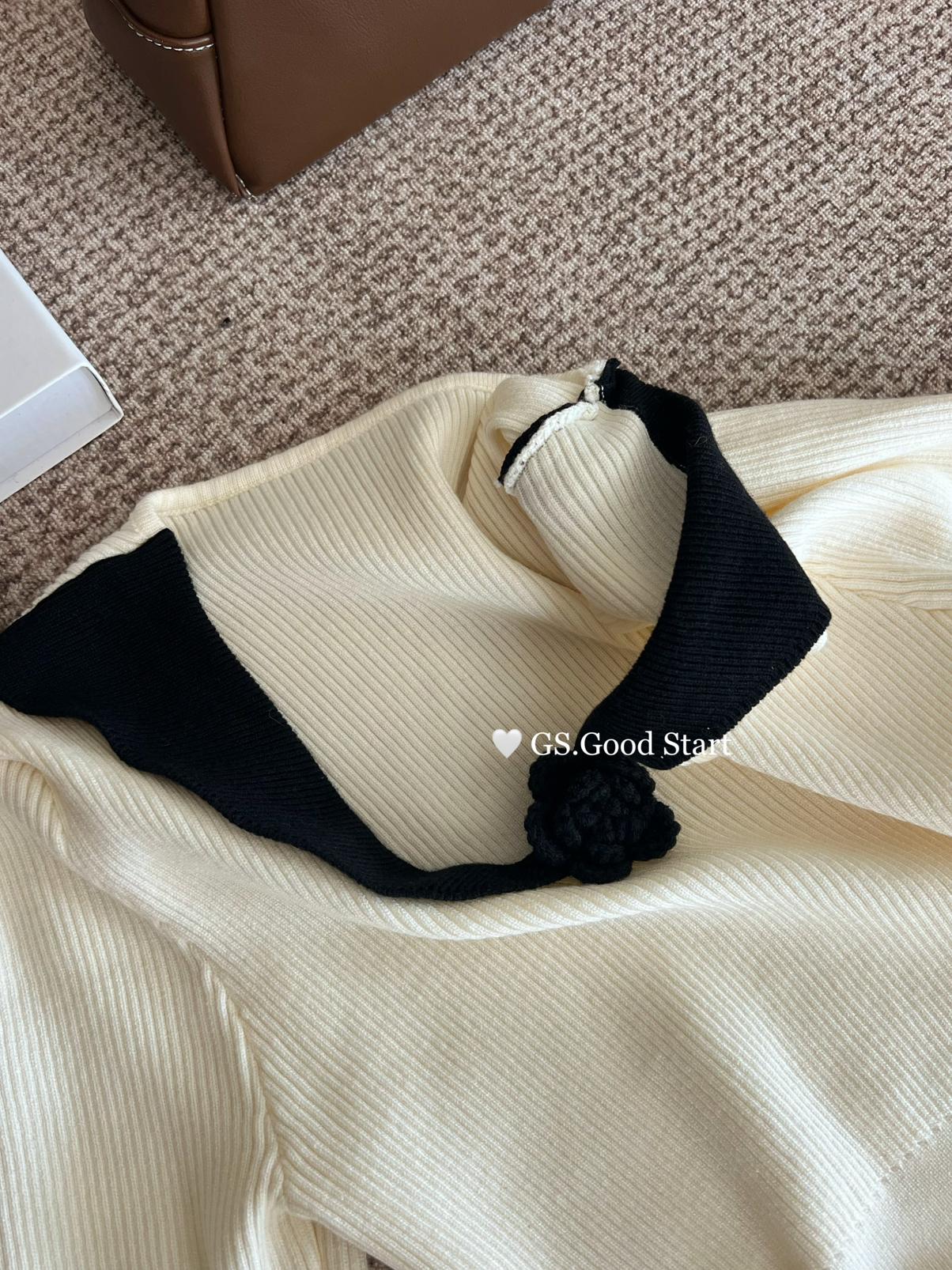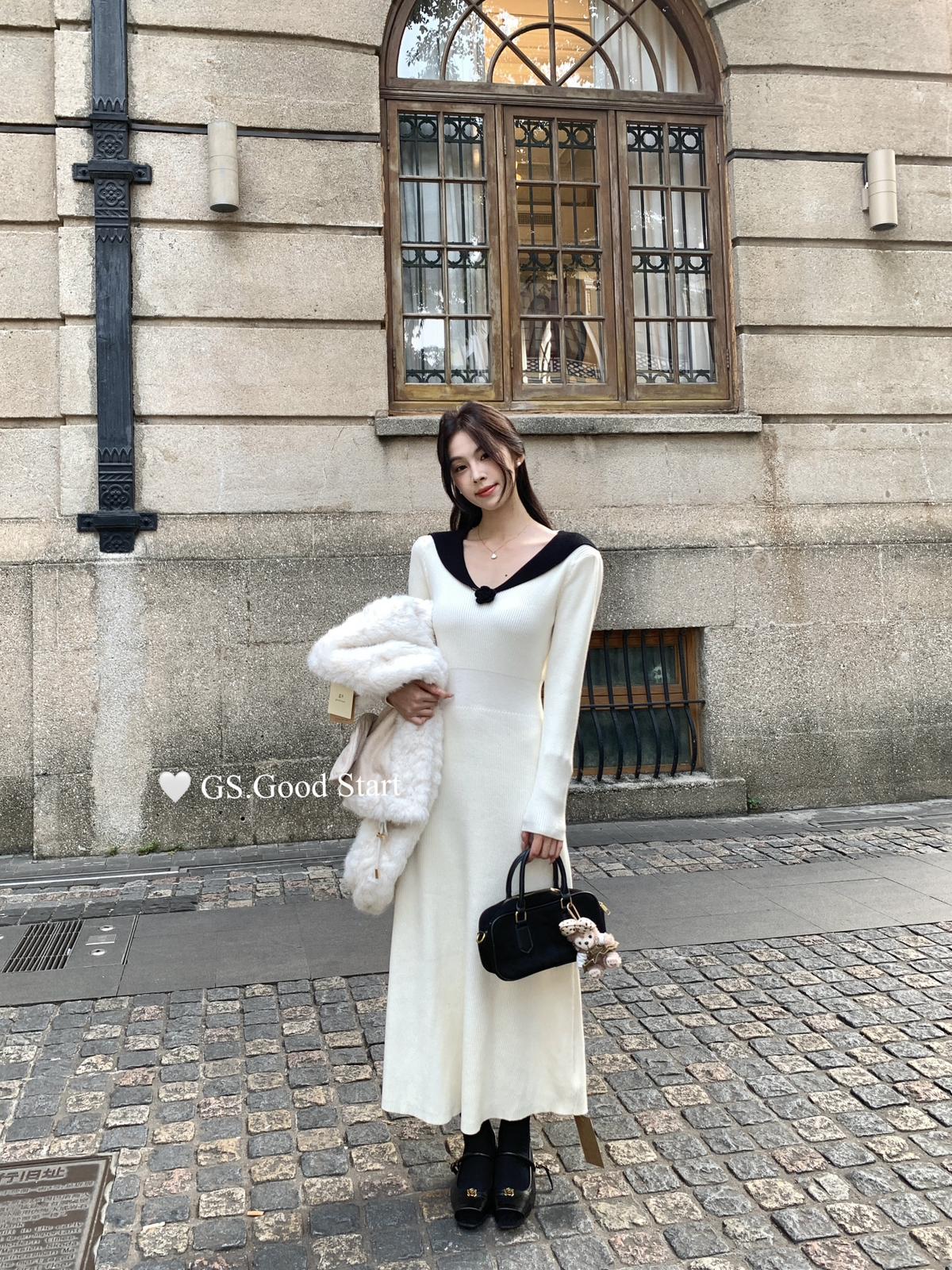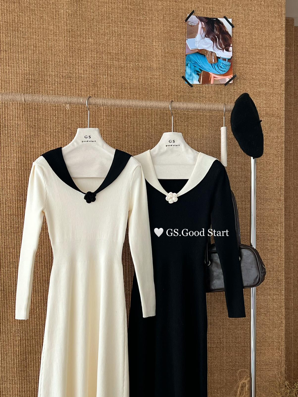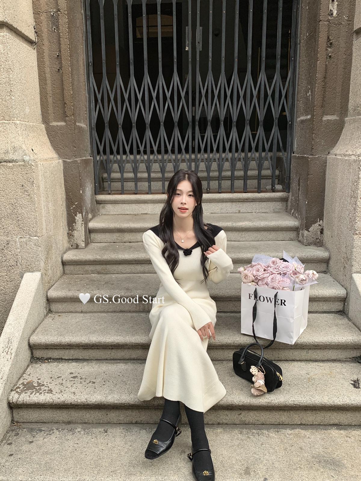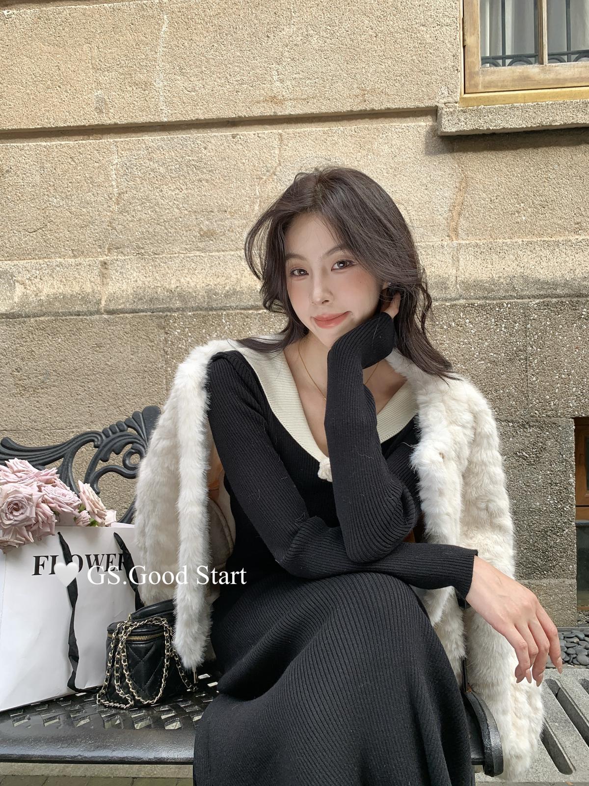 【C7736】美爆了*仙品赫本裙!強推必入!秋冬法式溫柔氣質v領針織顯瘦連衣裙(配花朵可拆)