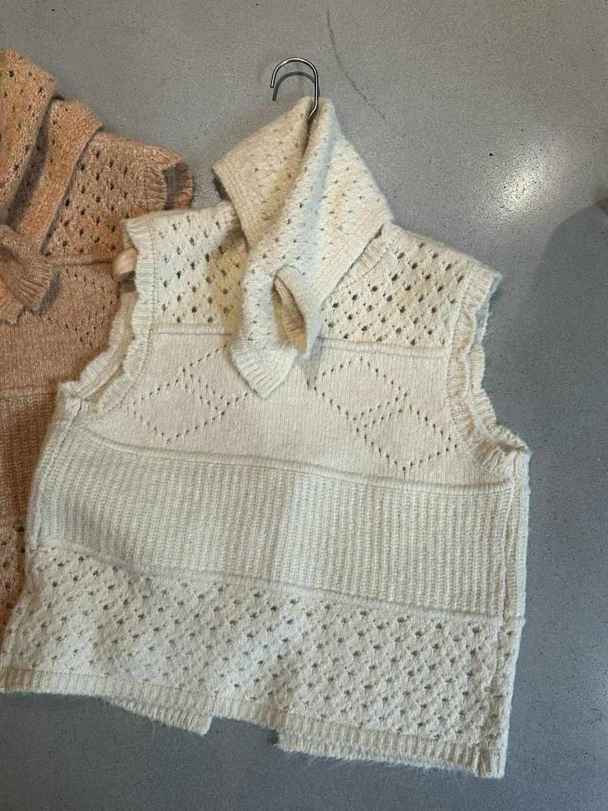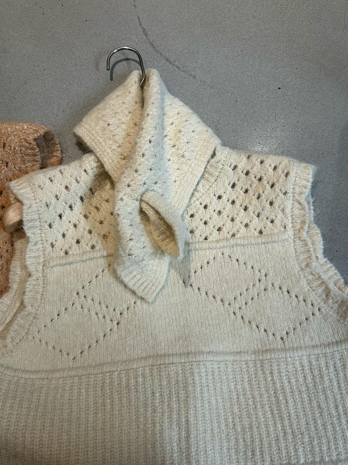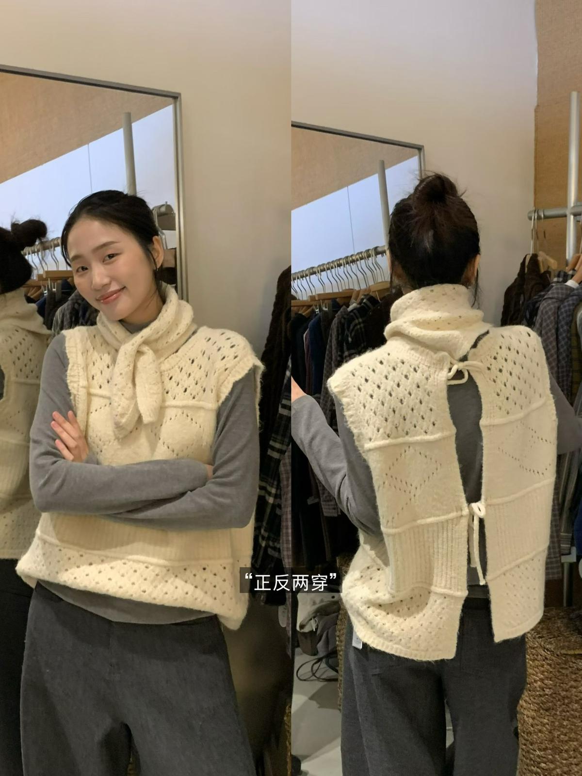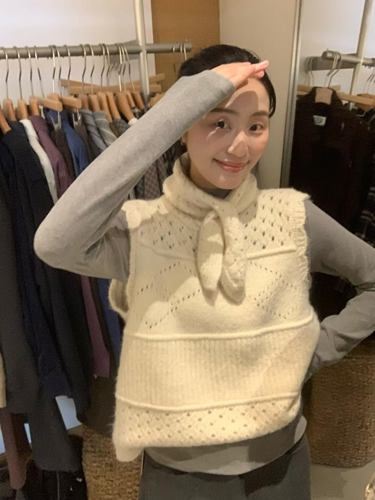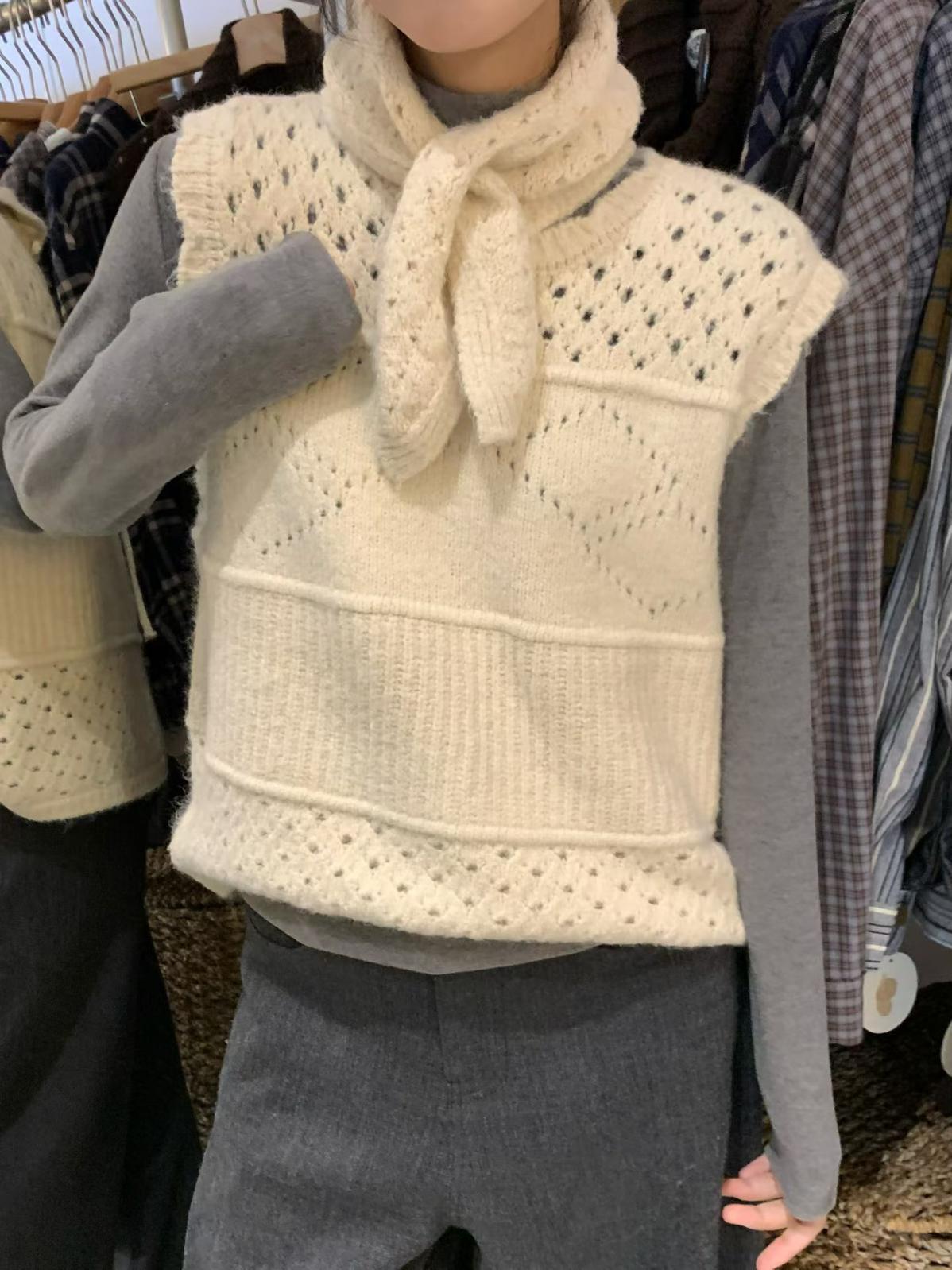 【C7744】復古學院鏤空正反兩穿毛織針織馬甲(配圍脖)(含6%羊毛)