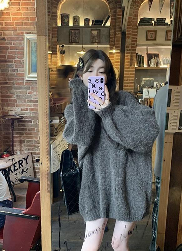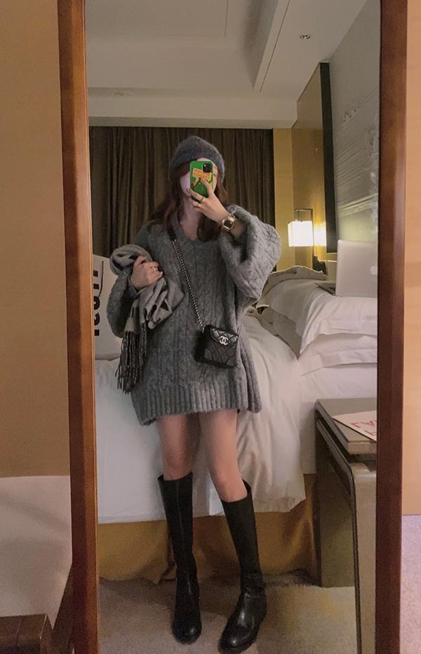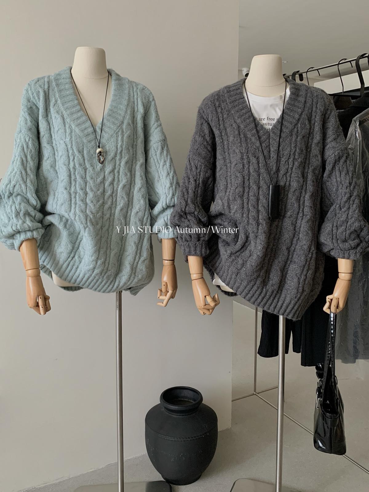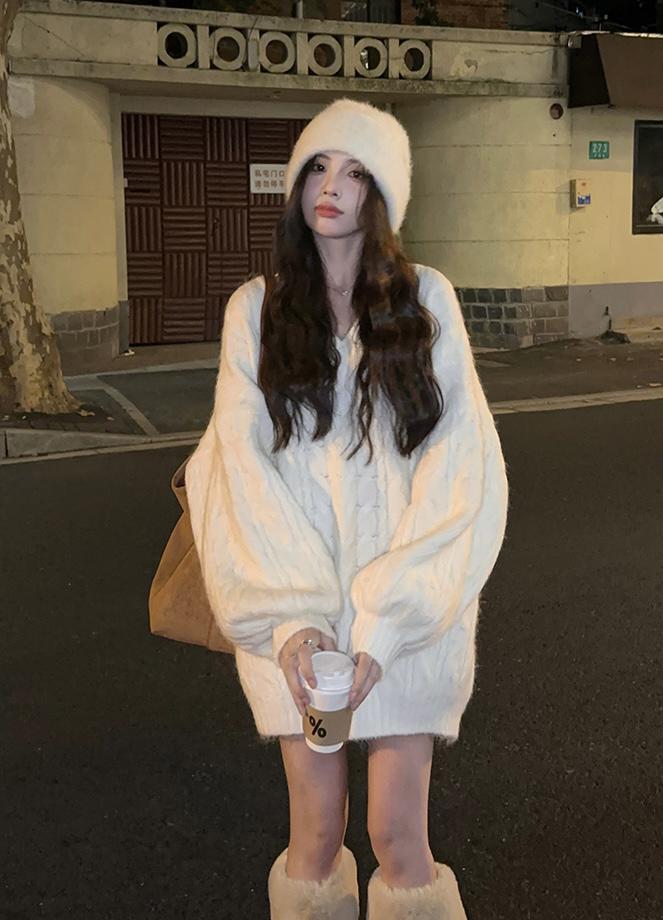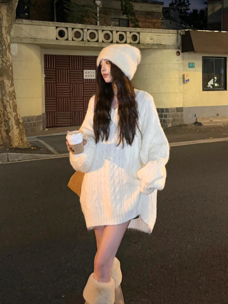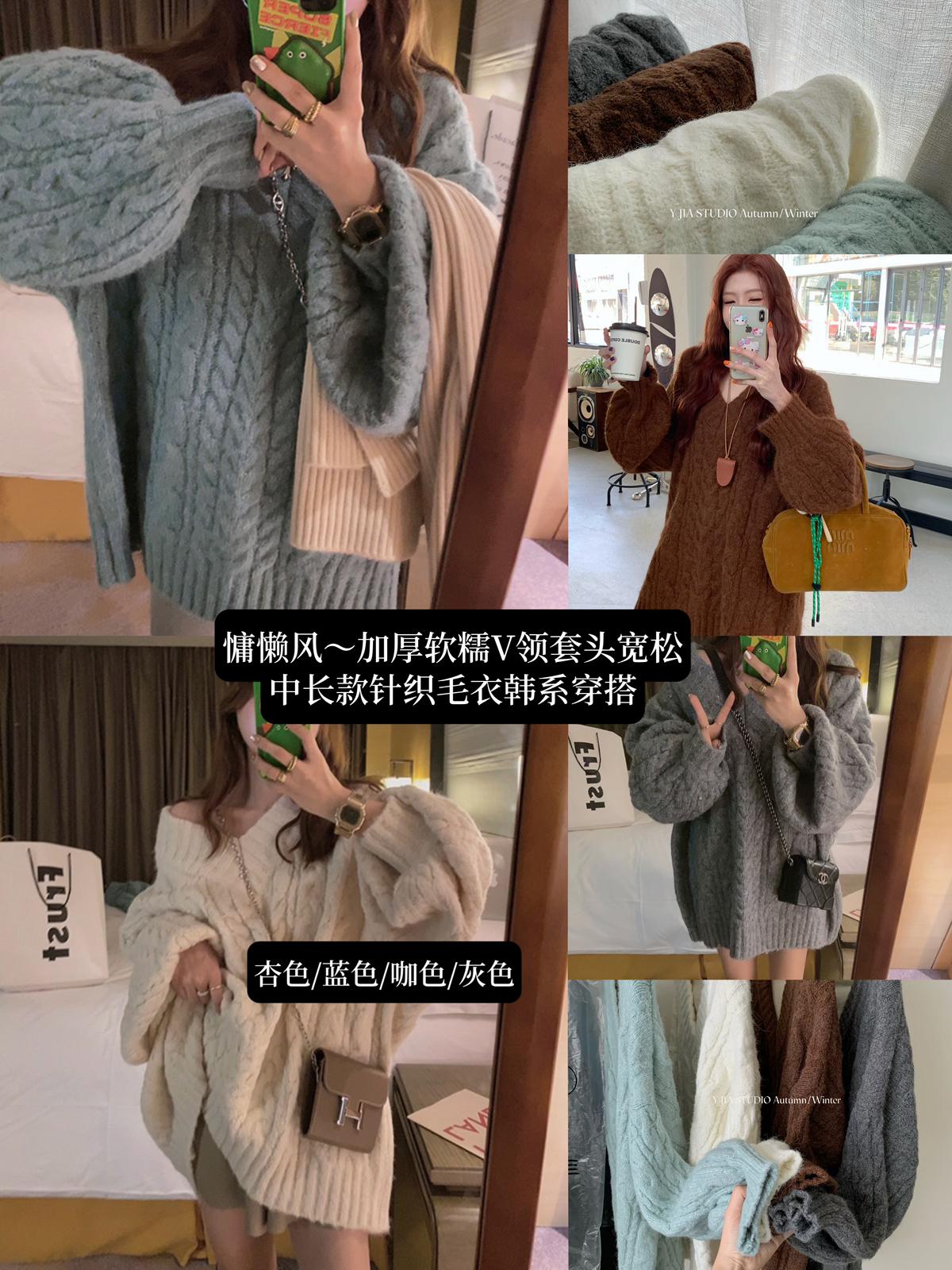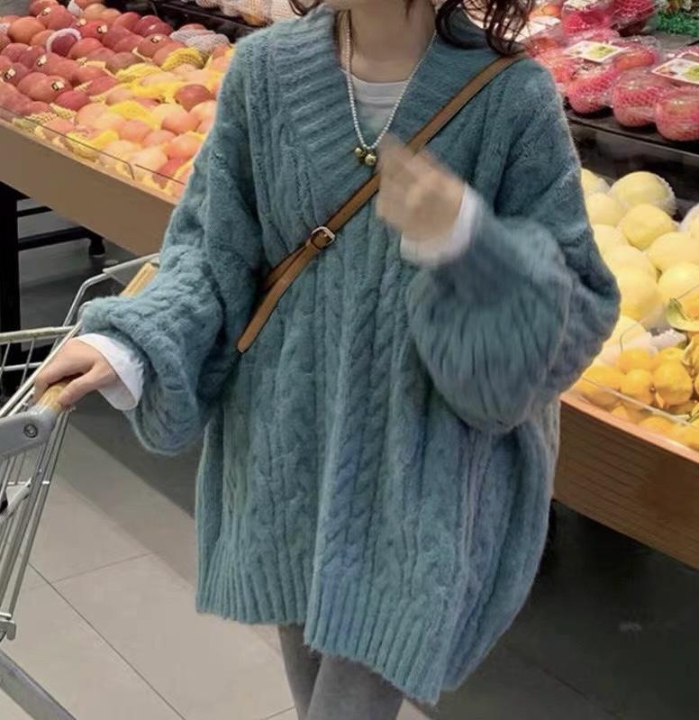 【C7749】慵懶風~加厚軟糯V領套頭寬鬆中長款針織毛衣韓系穿搭保暖毛衣
