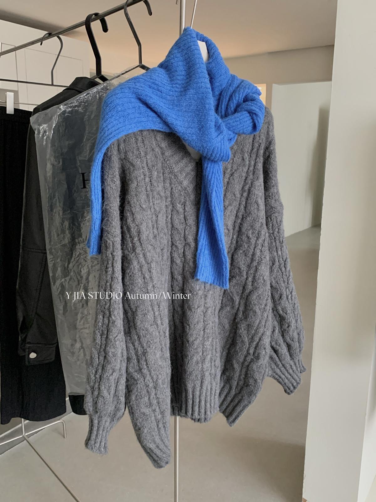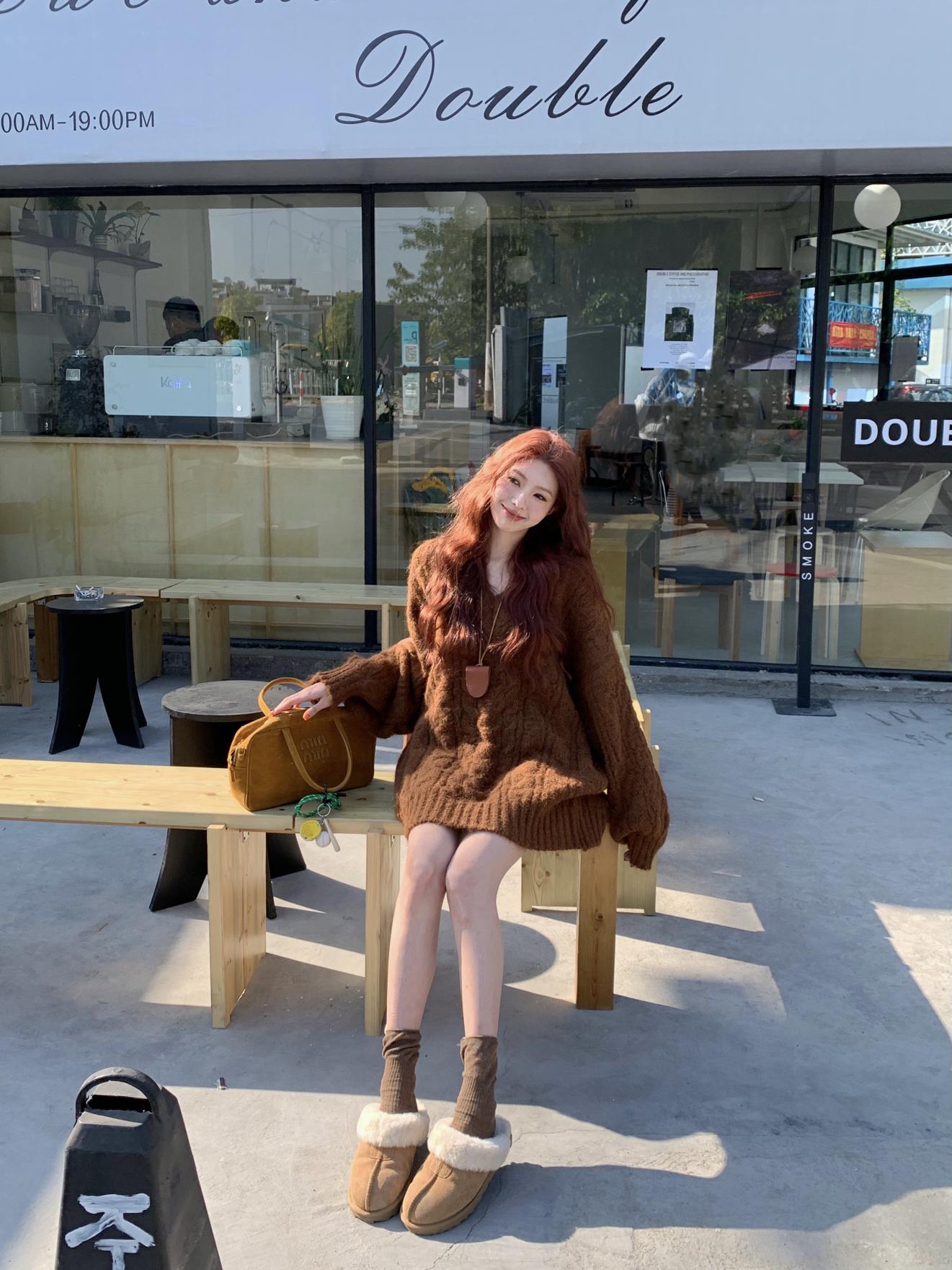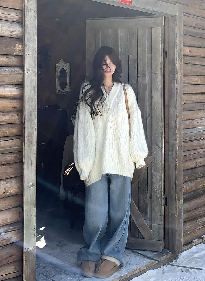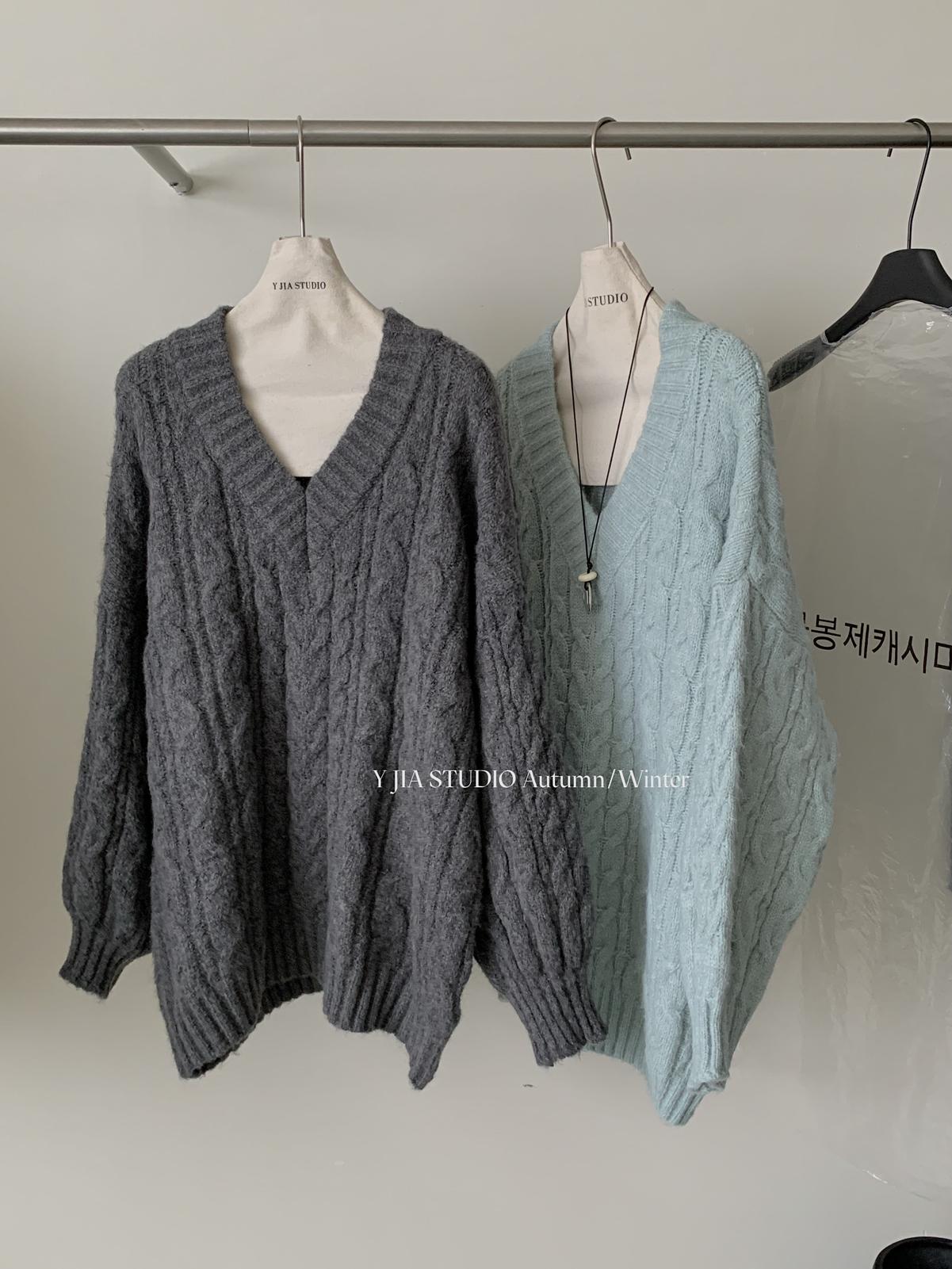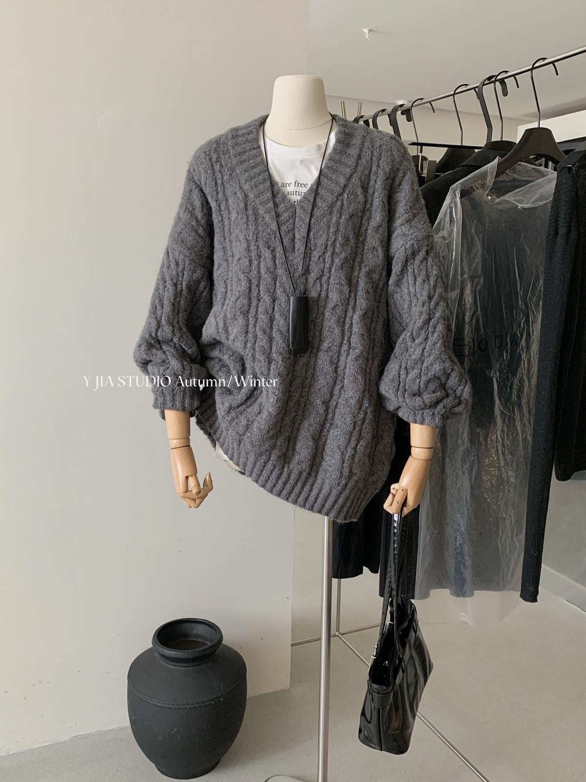【C7749】慵懶風~加厚軟糯V領套頭寬鬆中長款針織毛衣韓系穿搭保暖毛衣