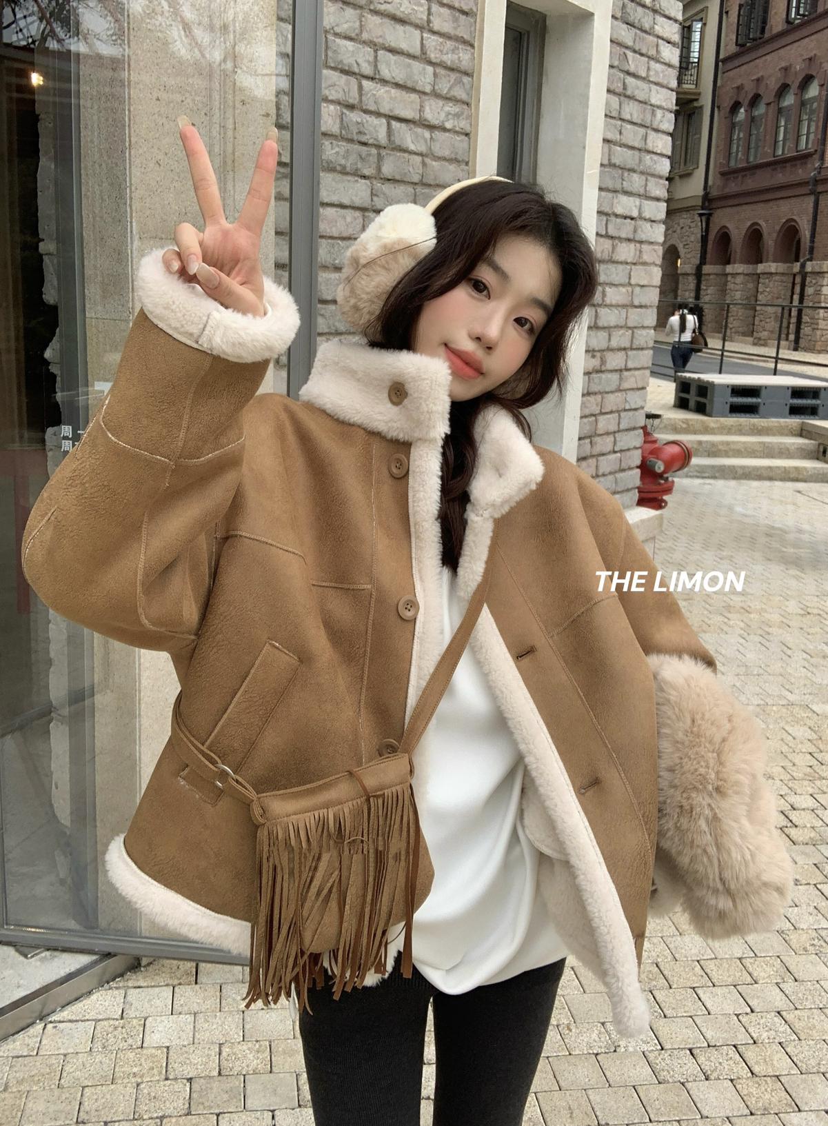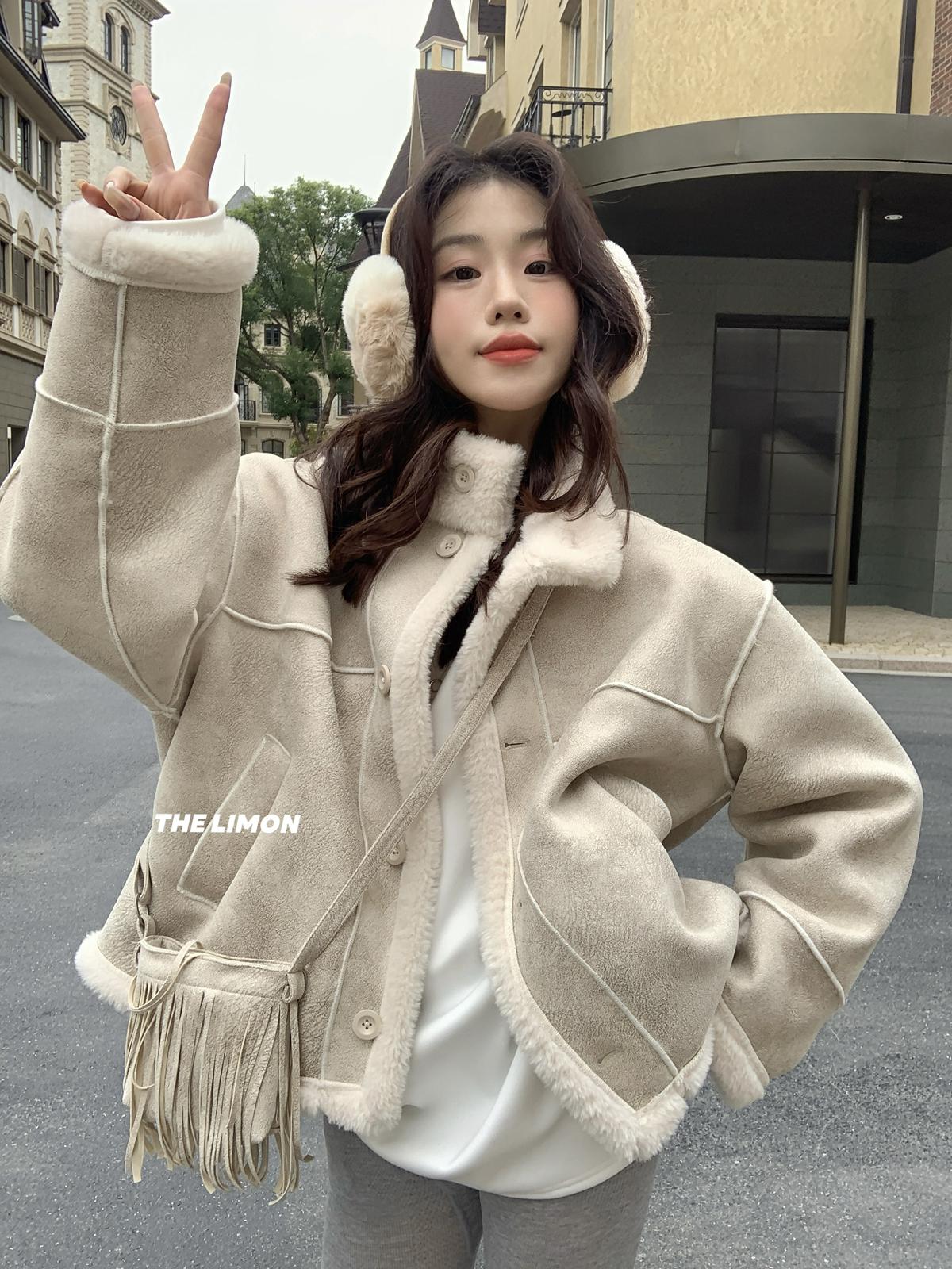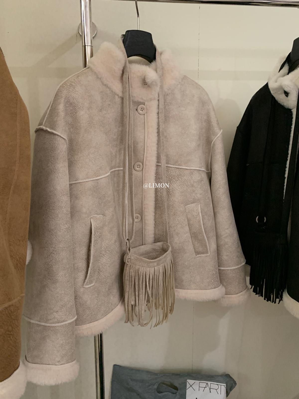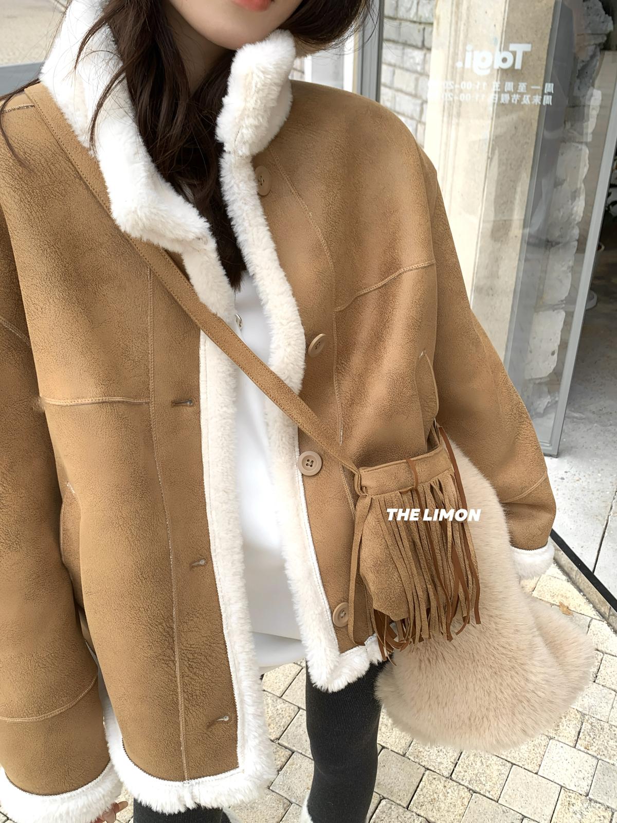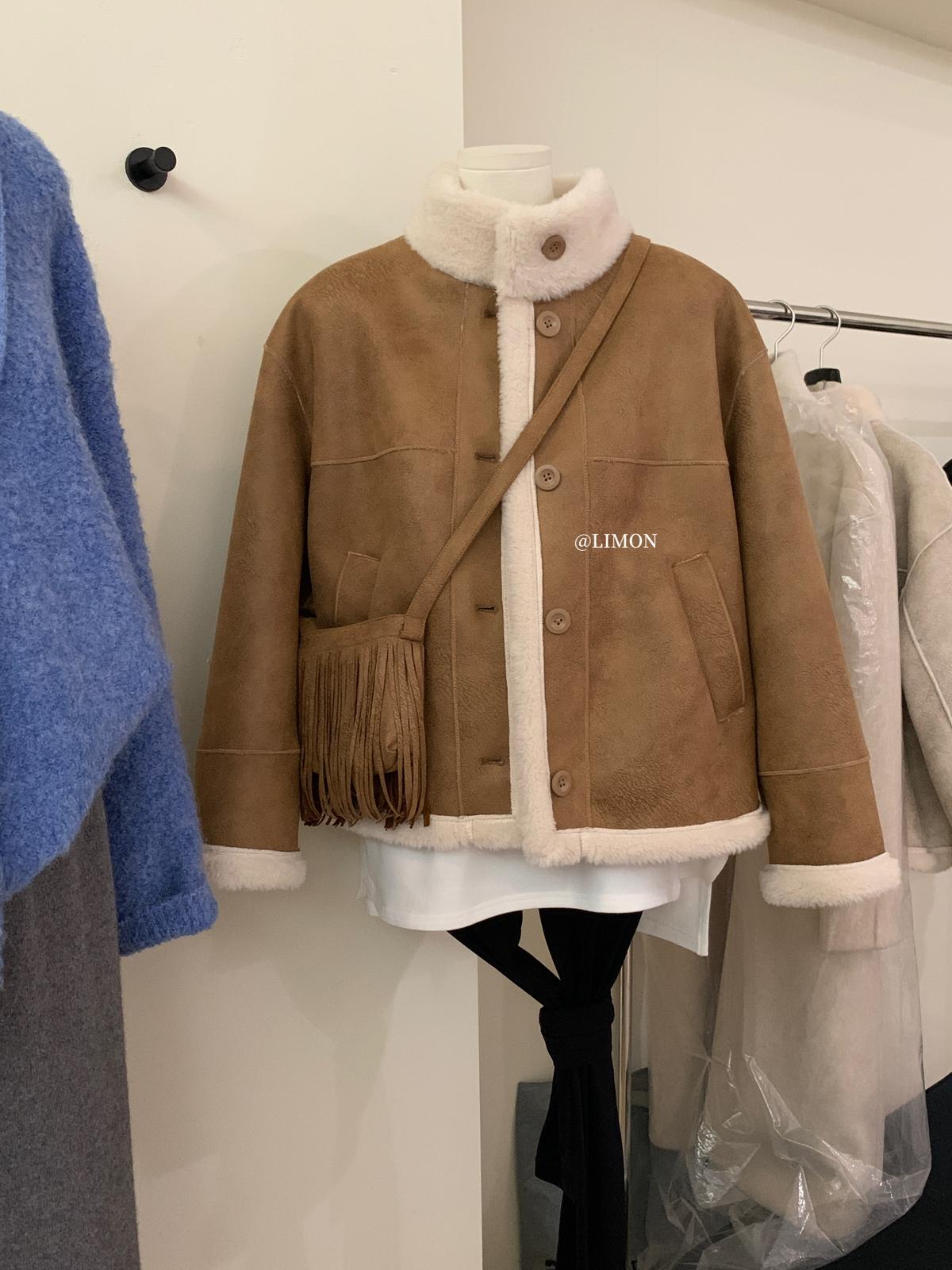 【C7769】巨好看!保暖立領仿皮毛一體短外套(配流蘇包)