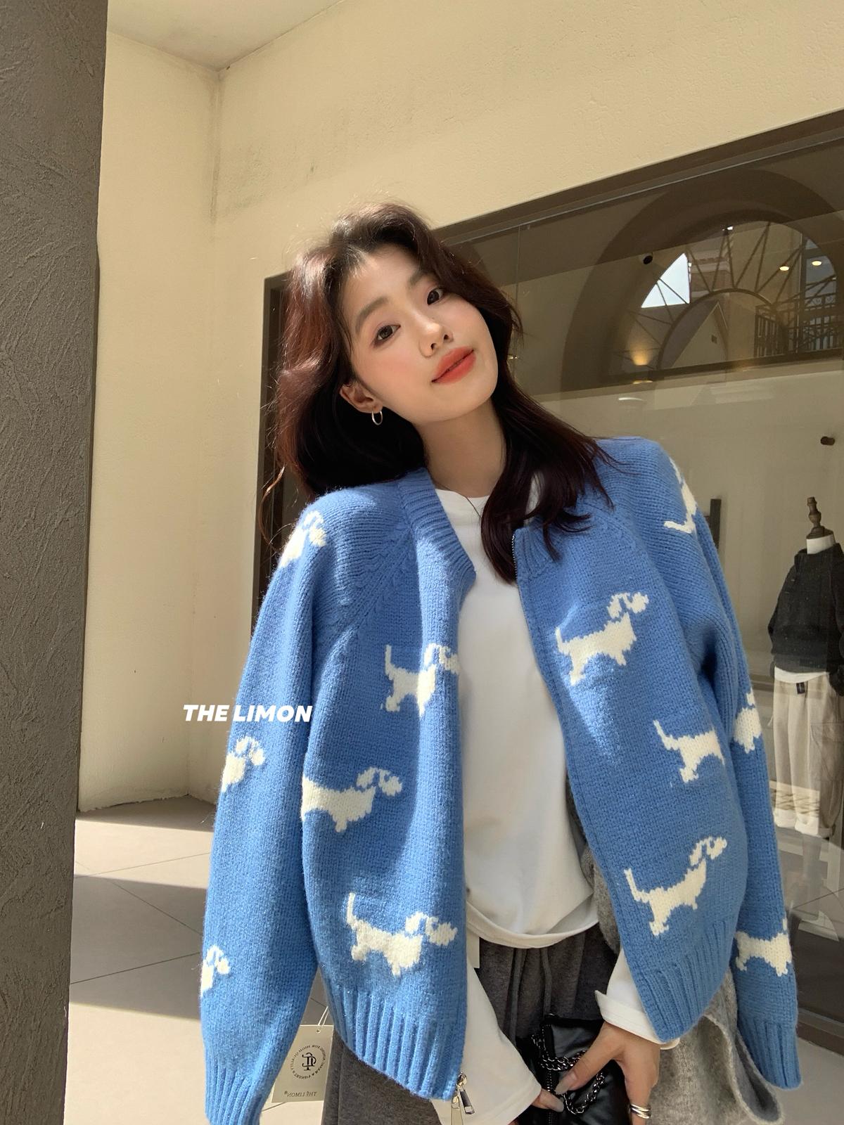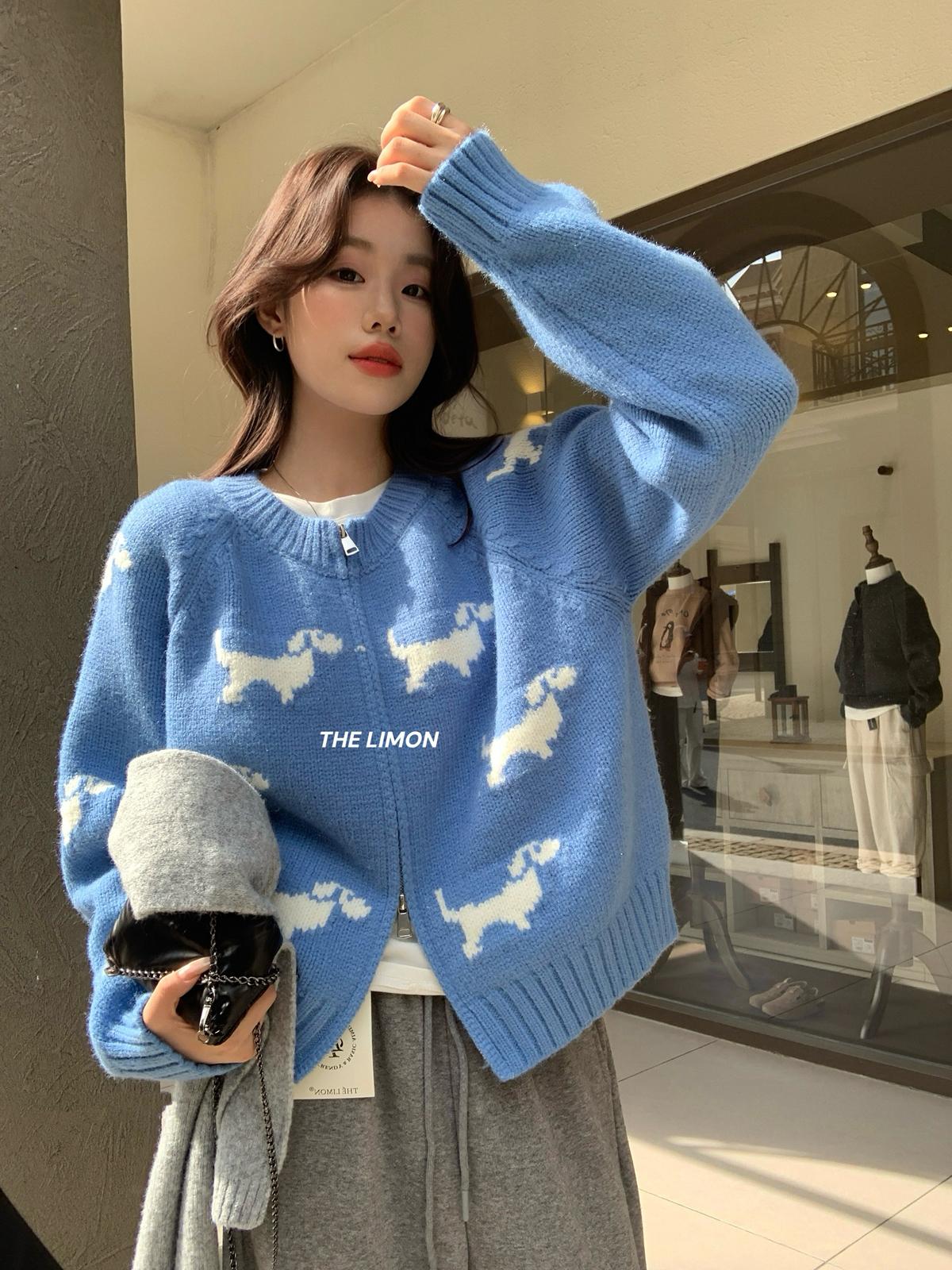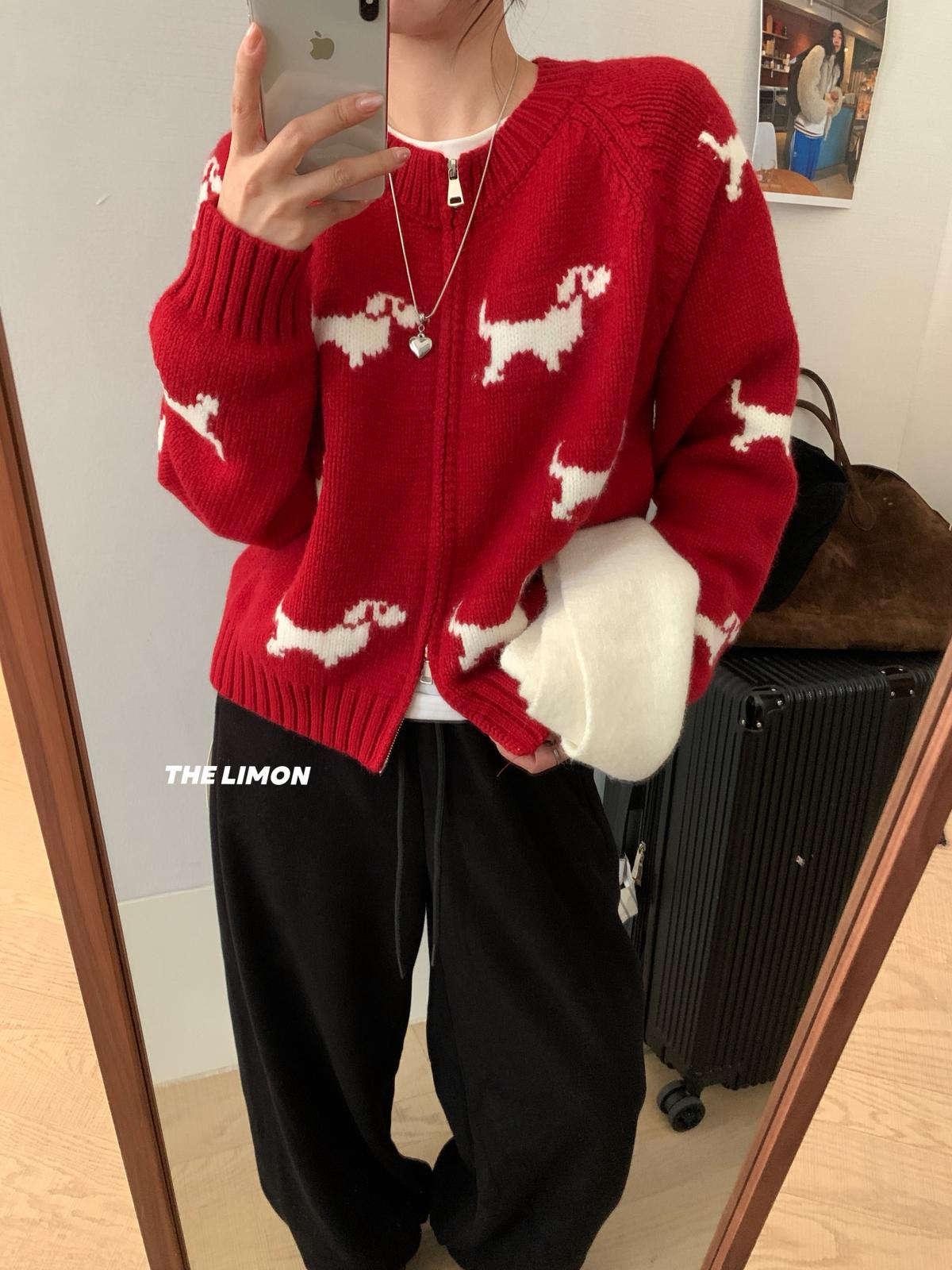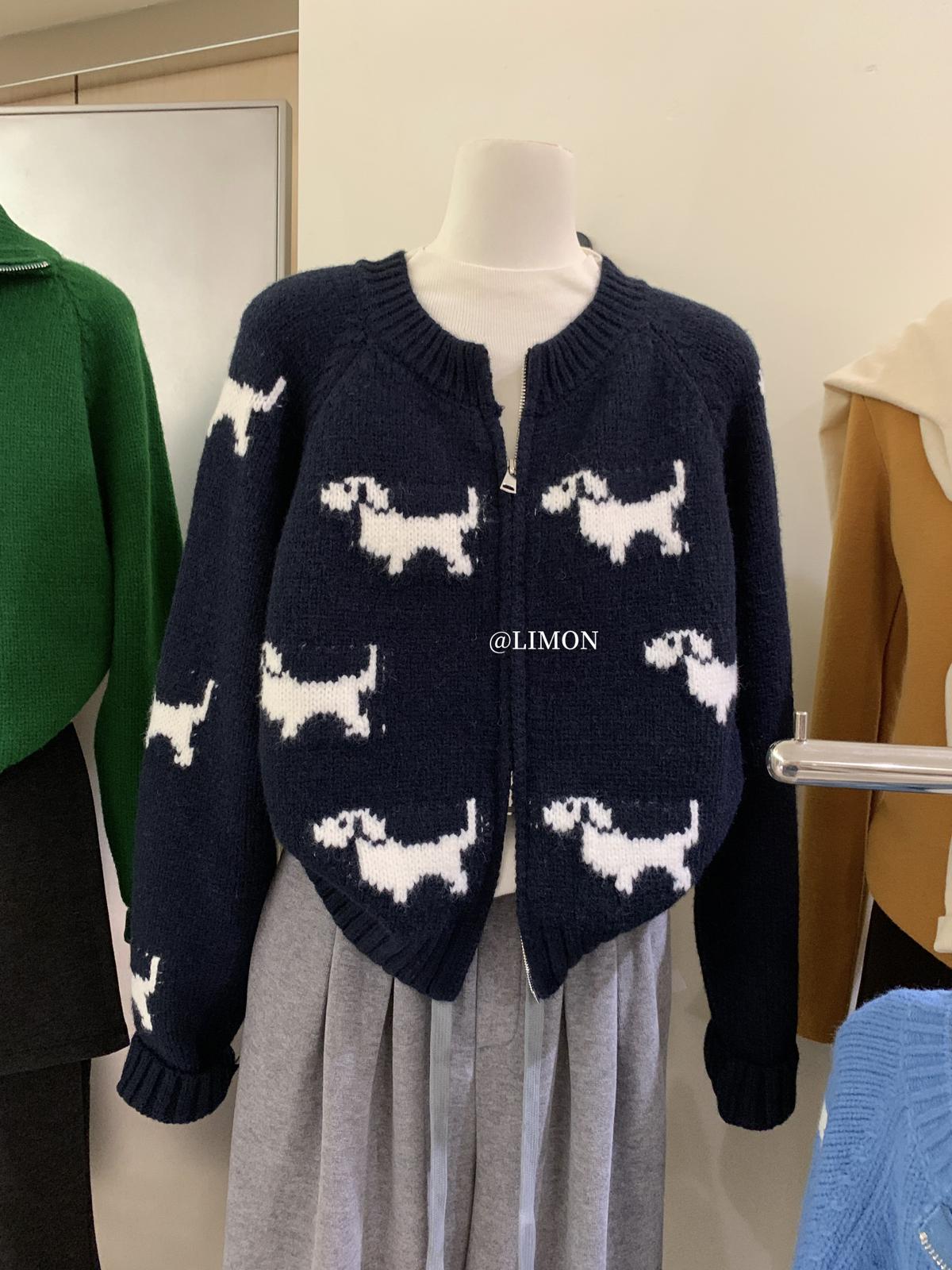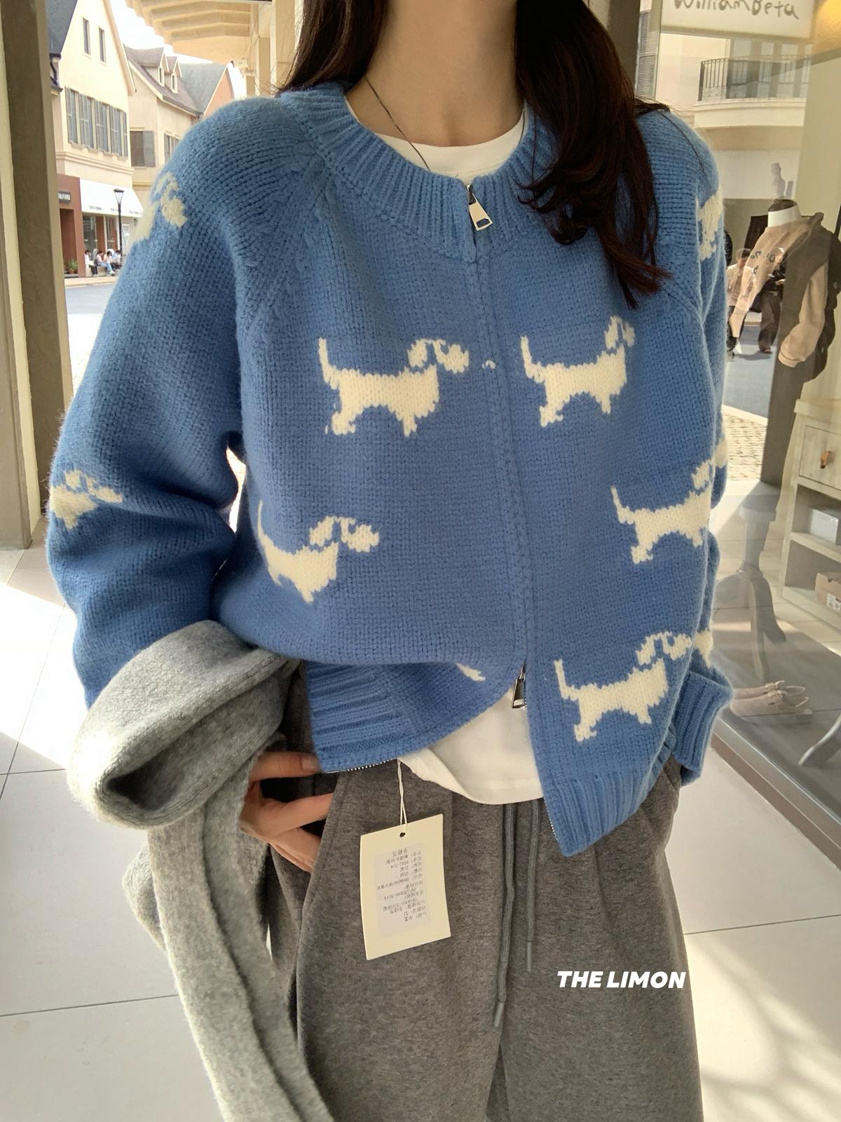 【C7765】韓系減齡趣味小狗圓領拉鍊北極絨開衫保暖毛衣