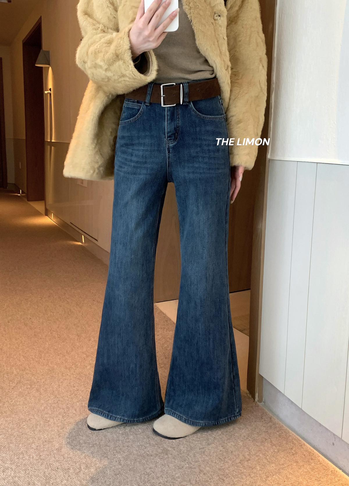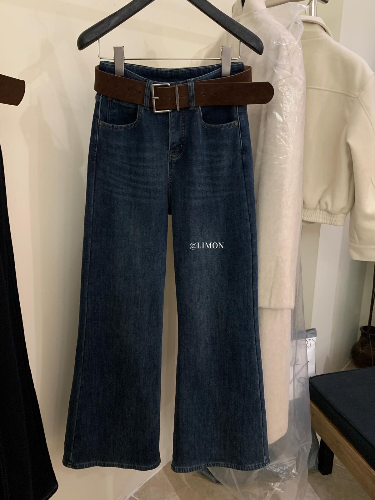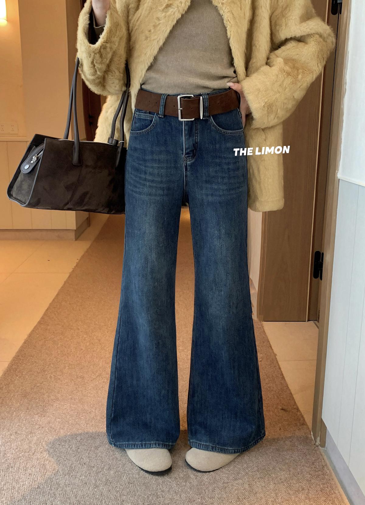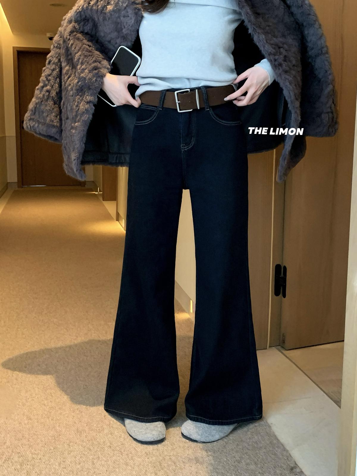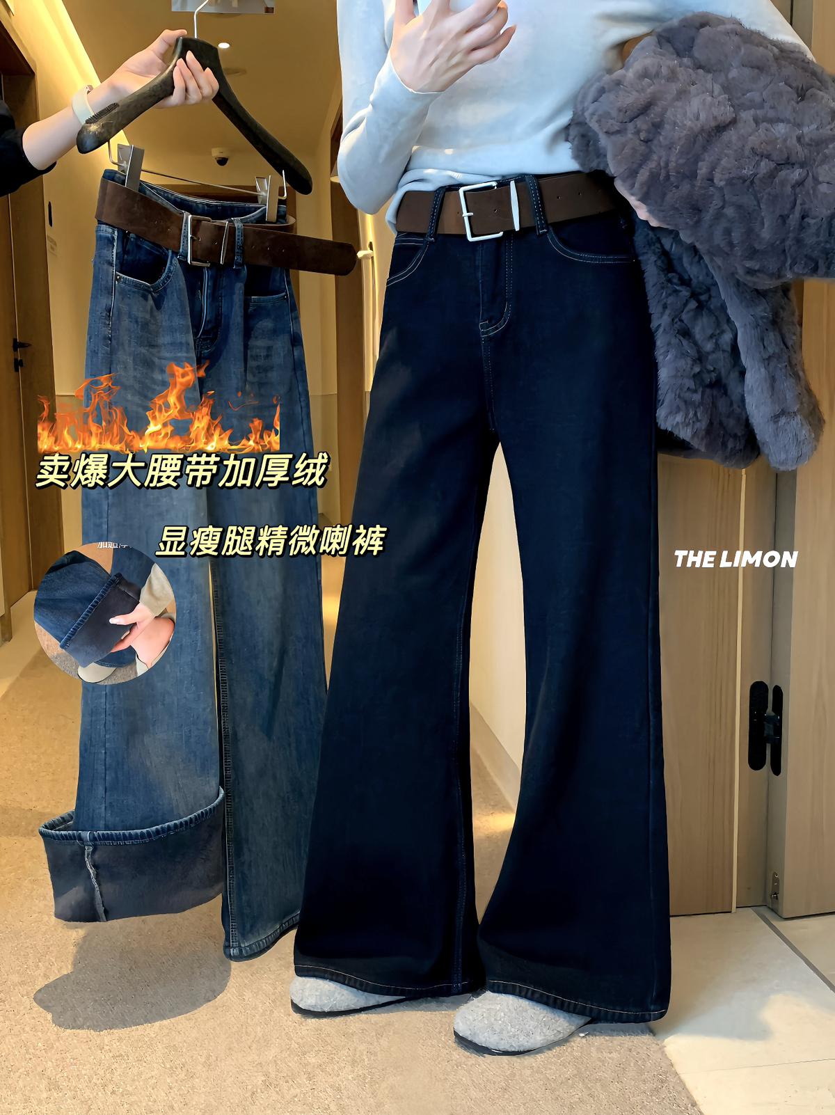 【C7766】超顯腿長!高腰微喇顯瘦加絨牛仔褲