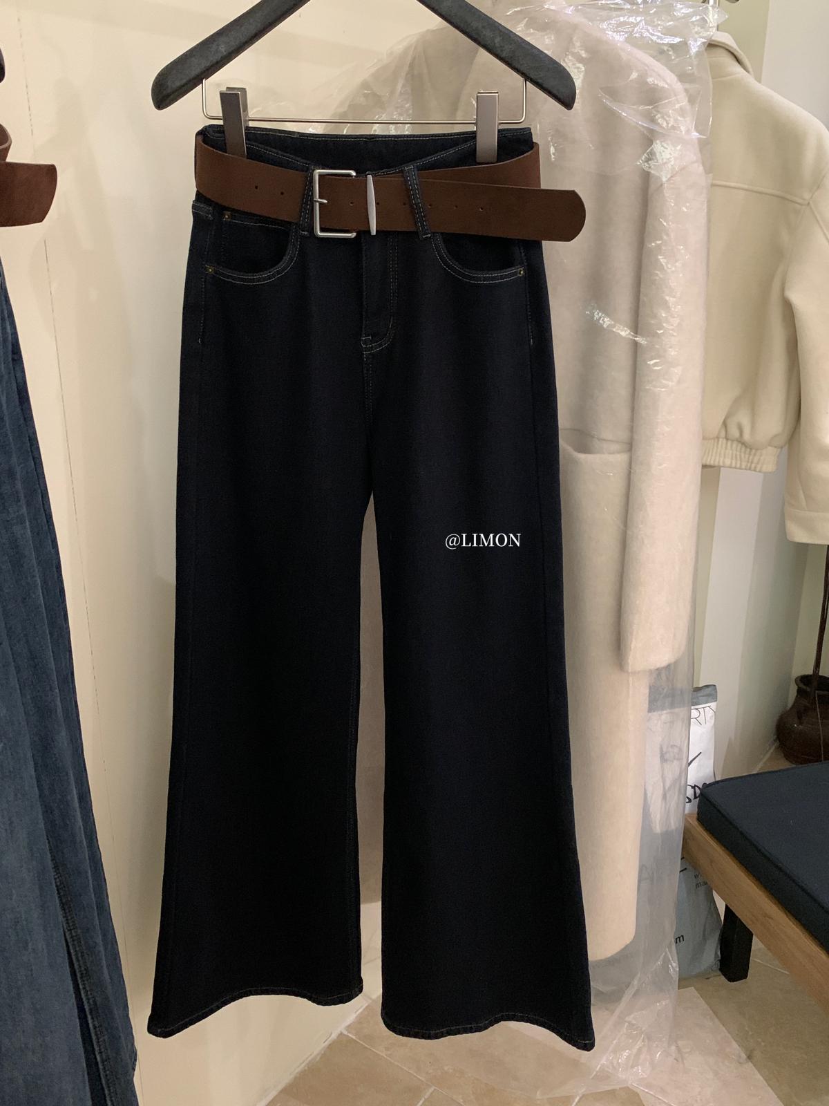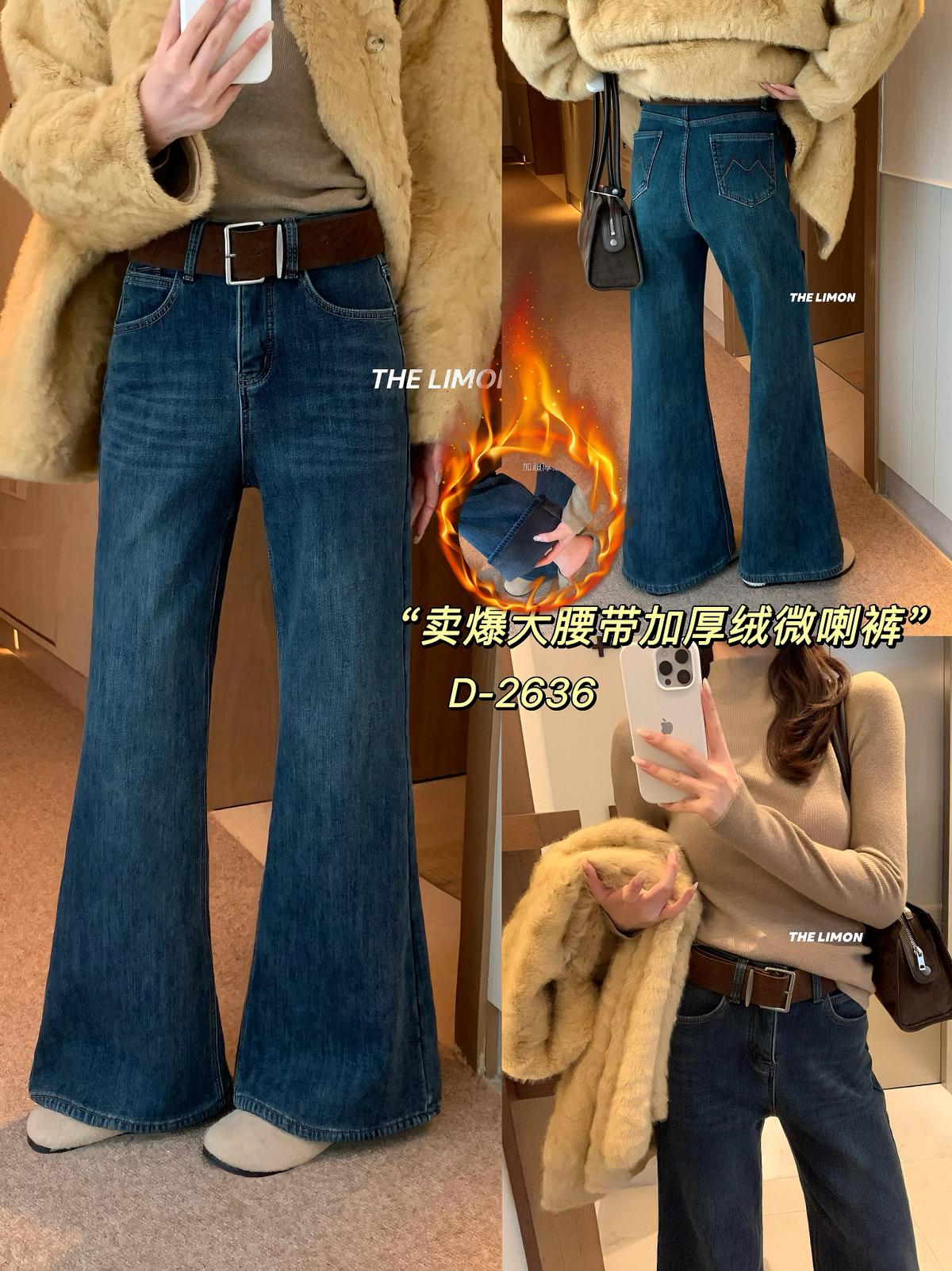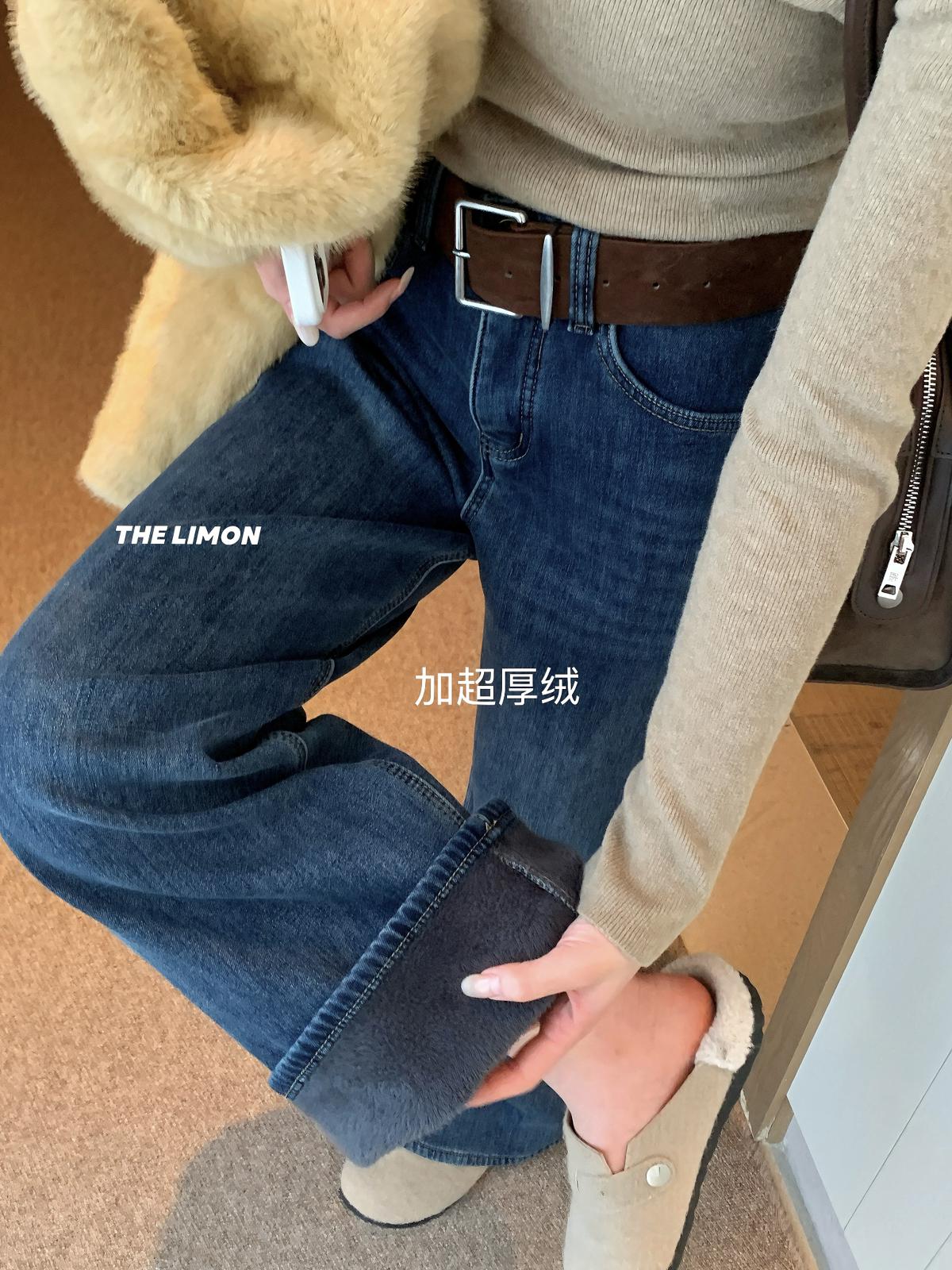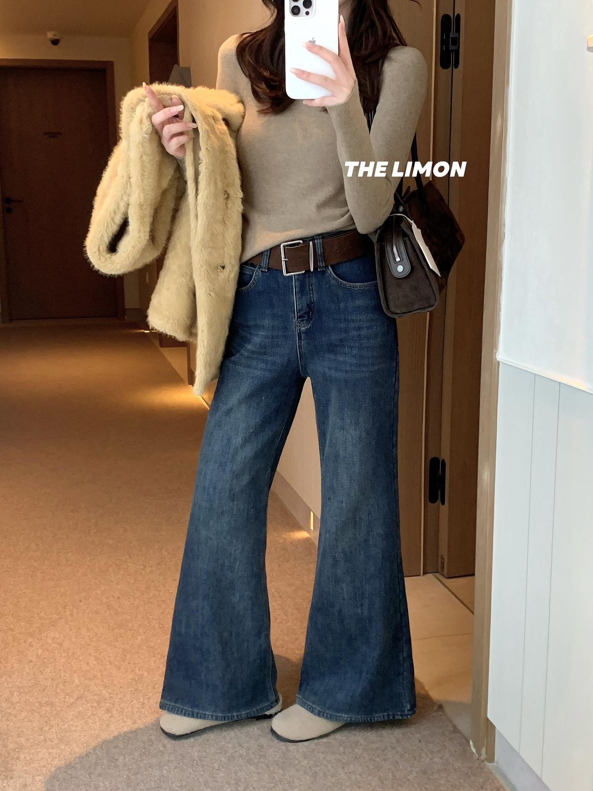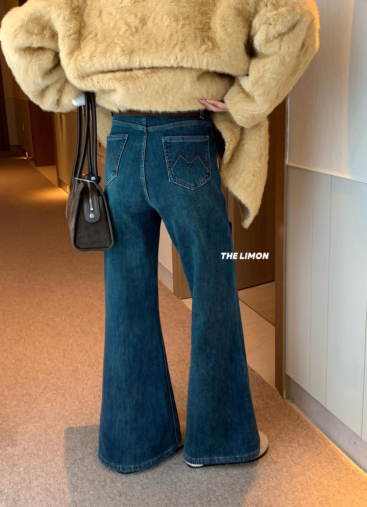 【C7766】超顯腿長!高腰微喇顯瘦加絨牛仔褲