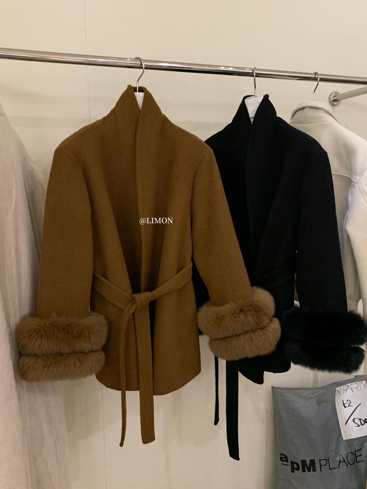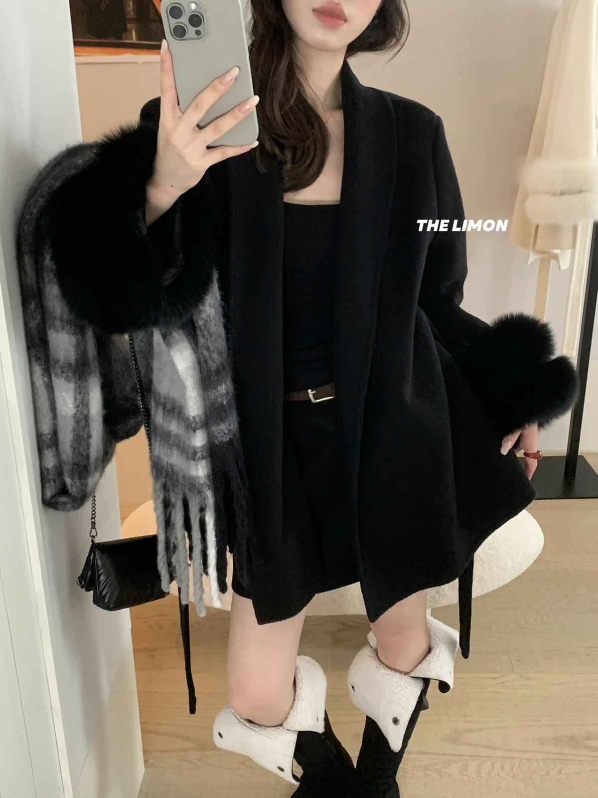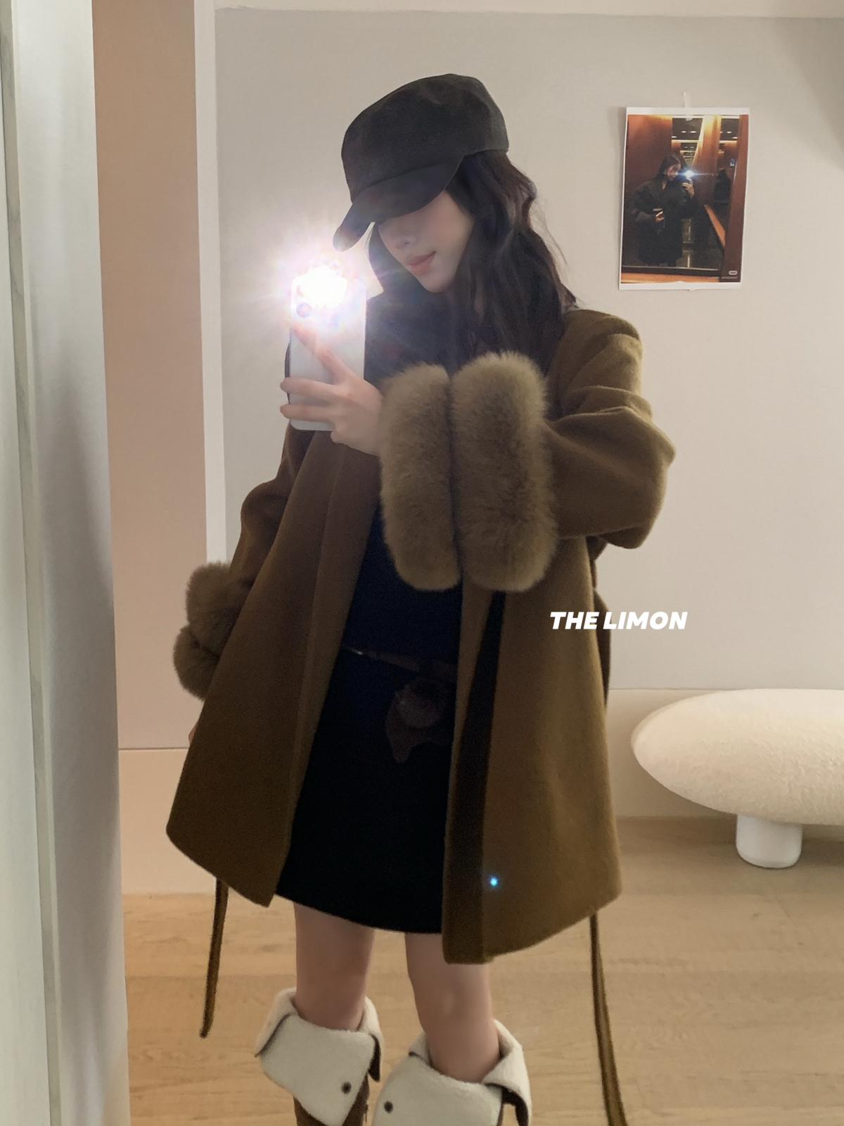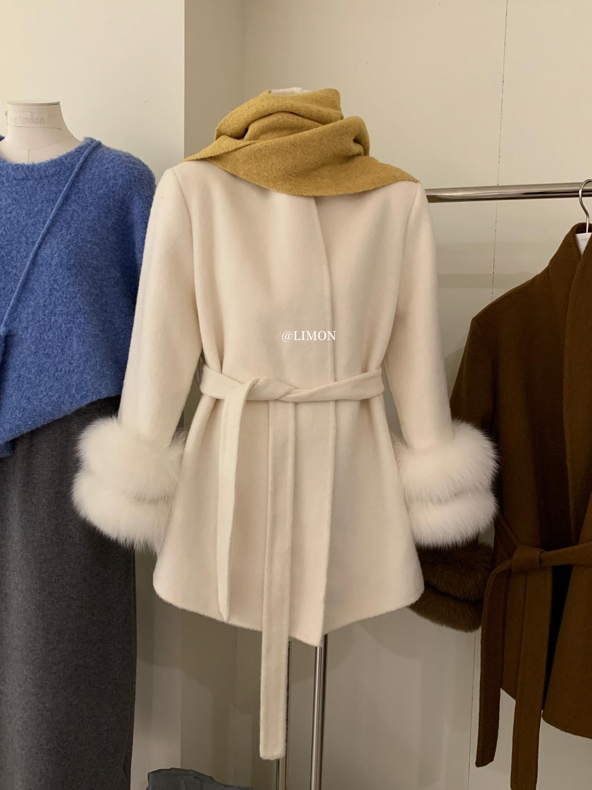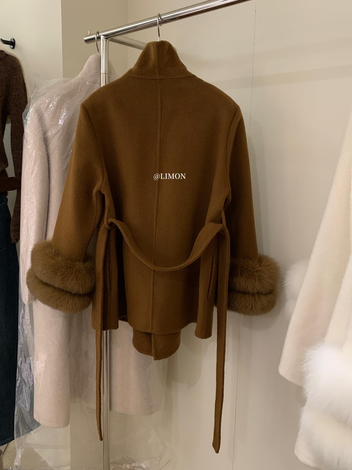 【C7767】高級感雙面尼氣質大衣羊毛外套(配可拆卸真狐狸毛毛圈,腰帶)(含70%羊毛)