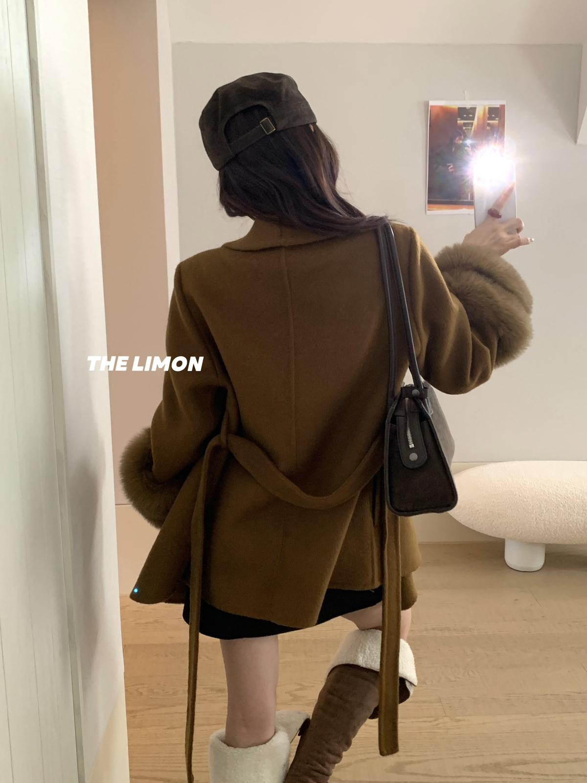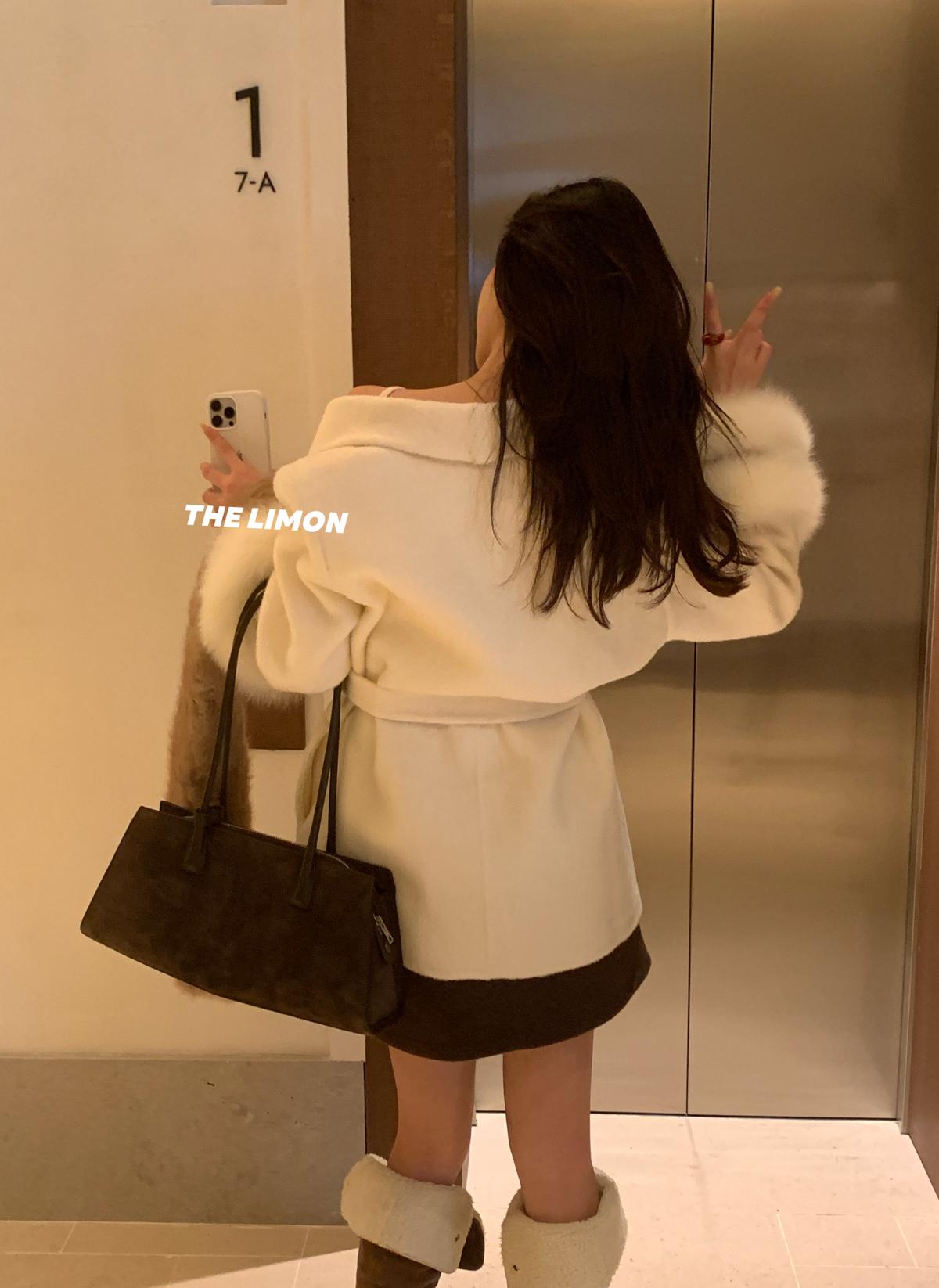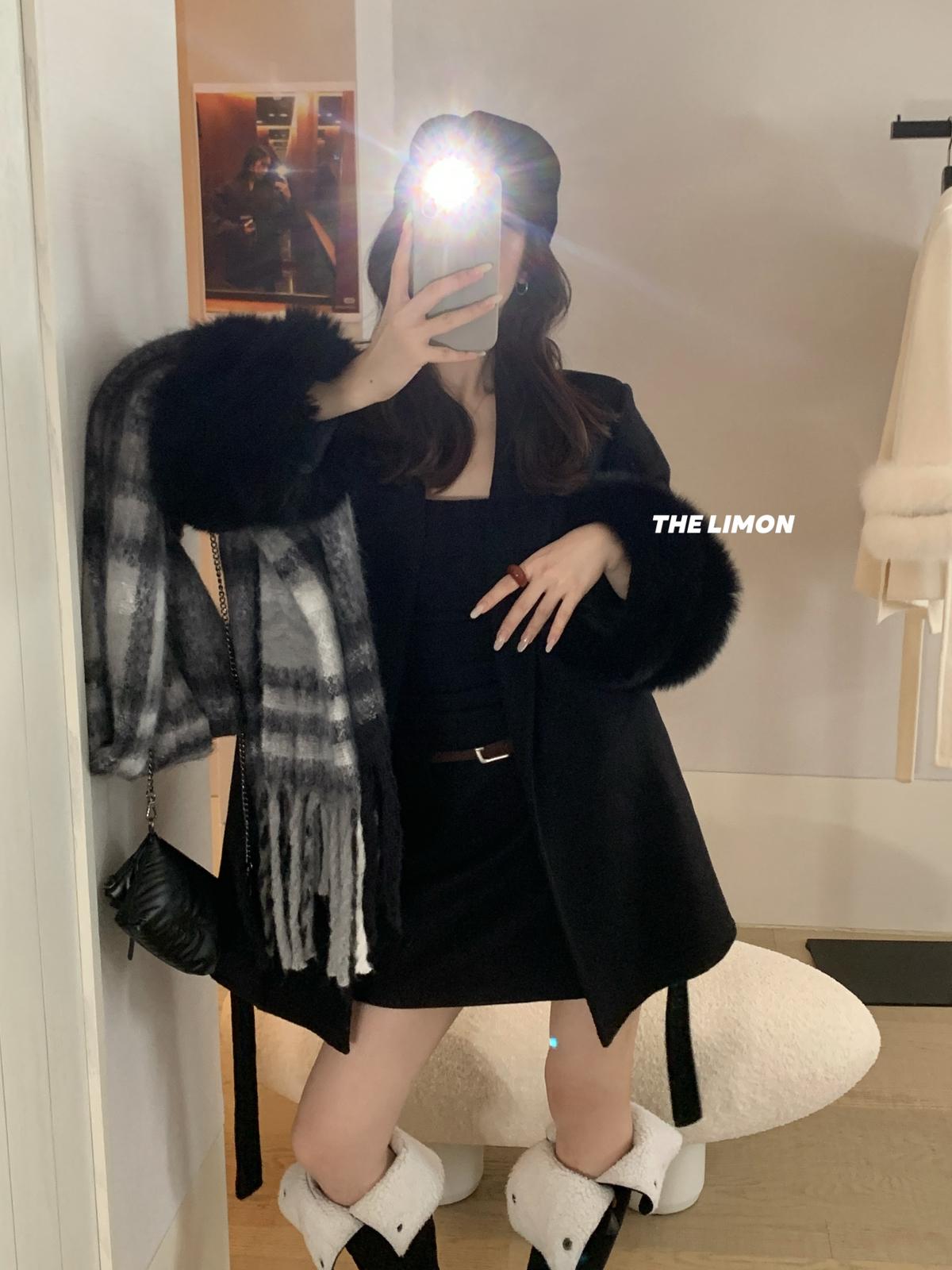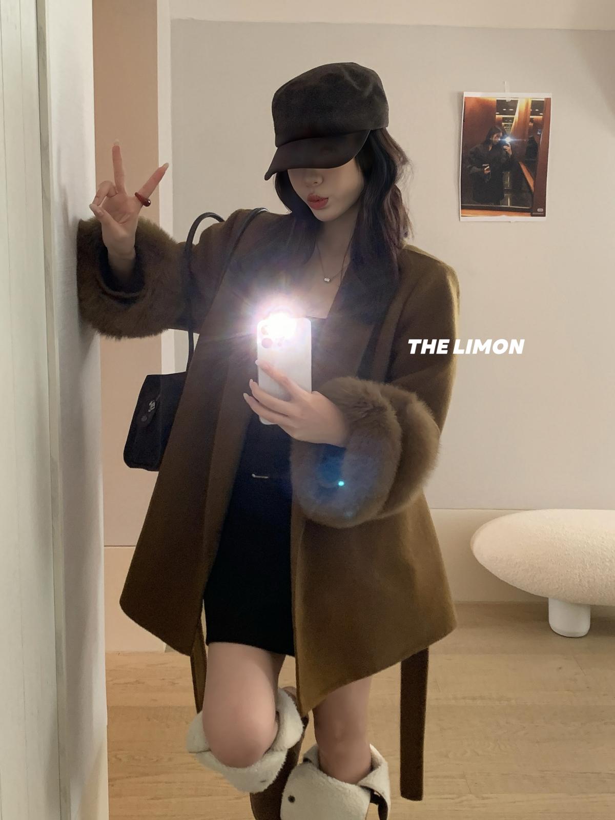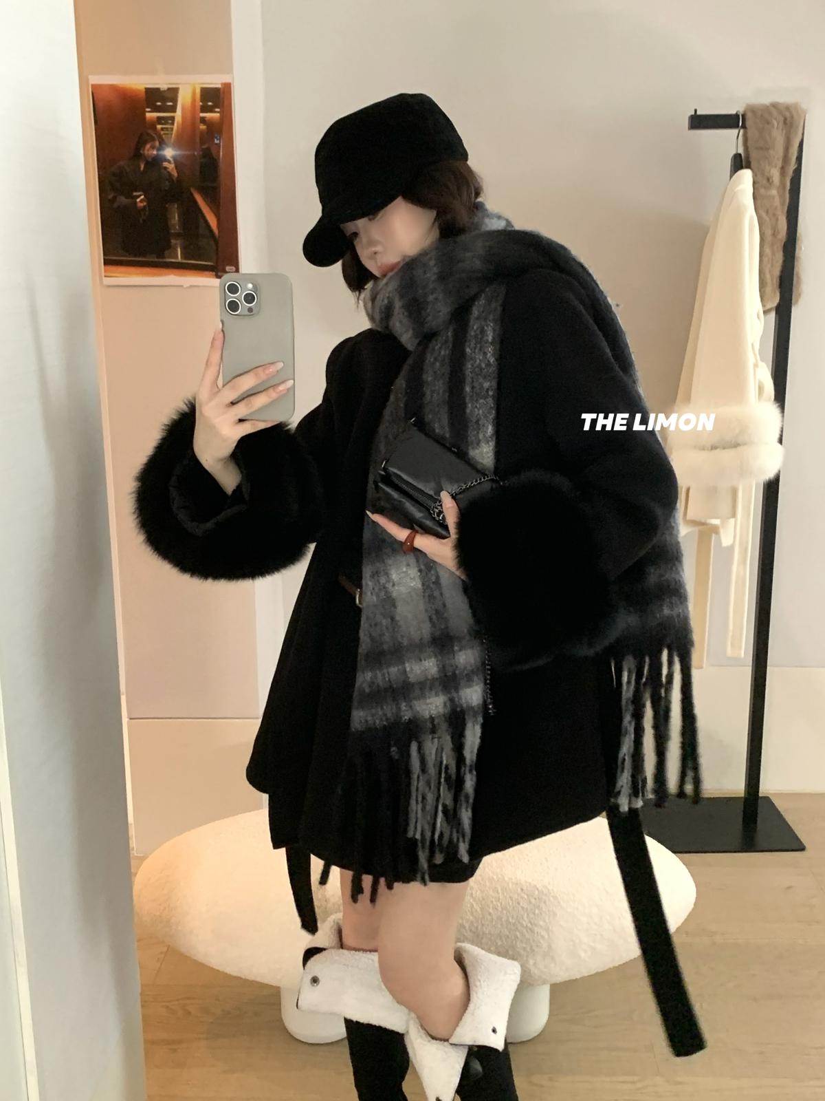【C7767】高級感雙面尼氣質大衣羊毛外套(配可拆卸真狐狸毛毛圈,腰帶)(含70%羊毛)