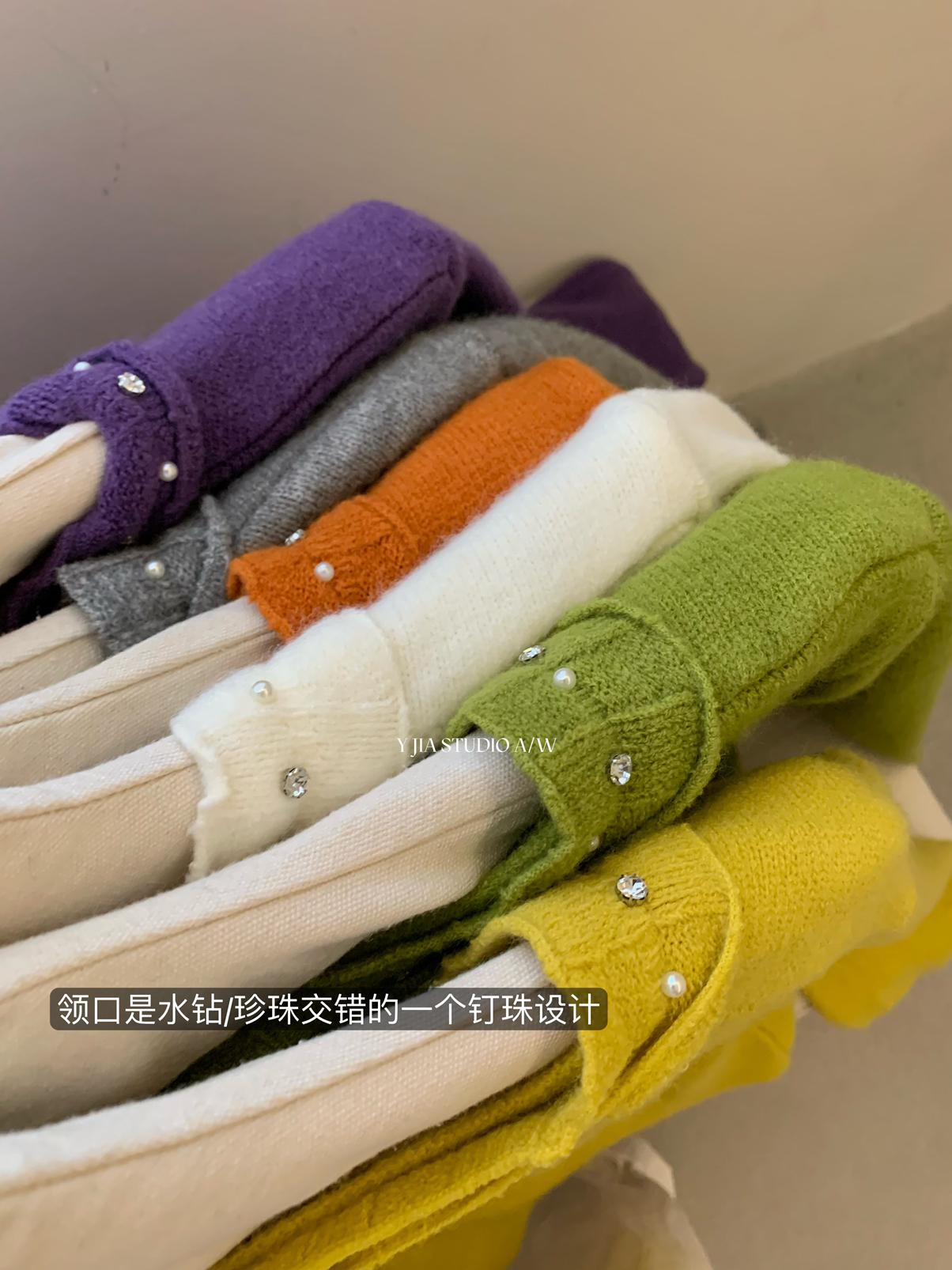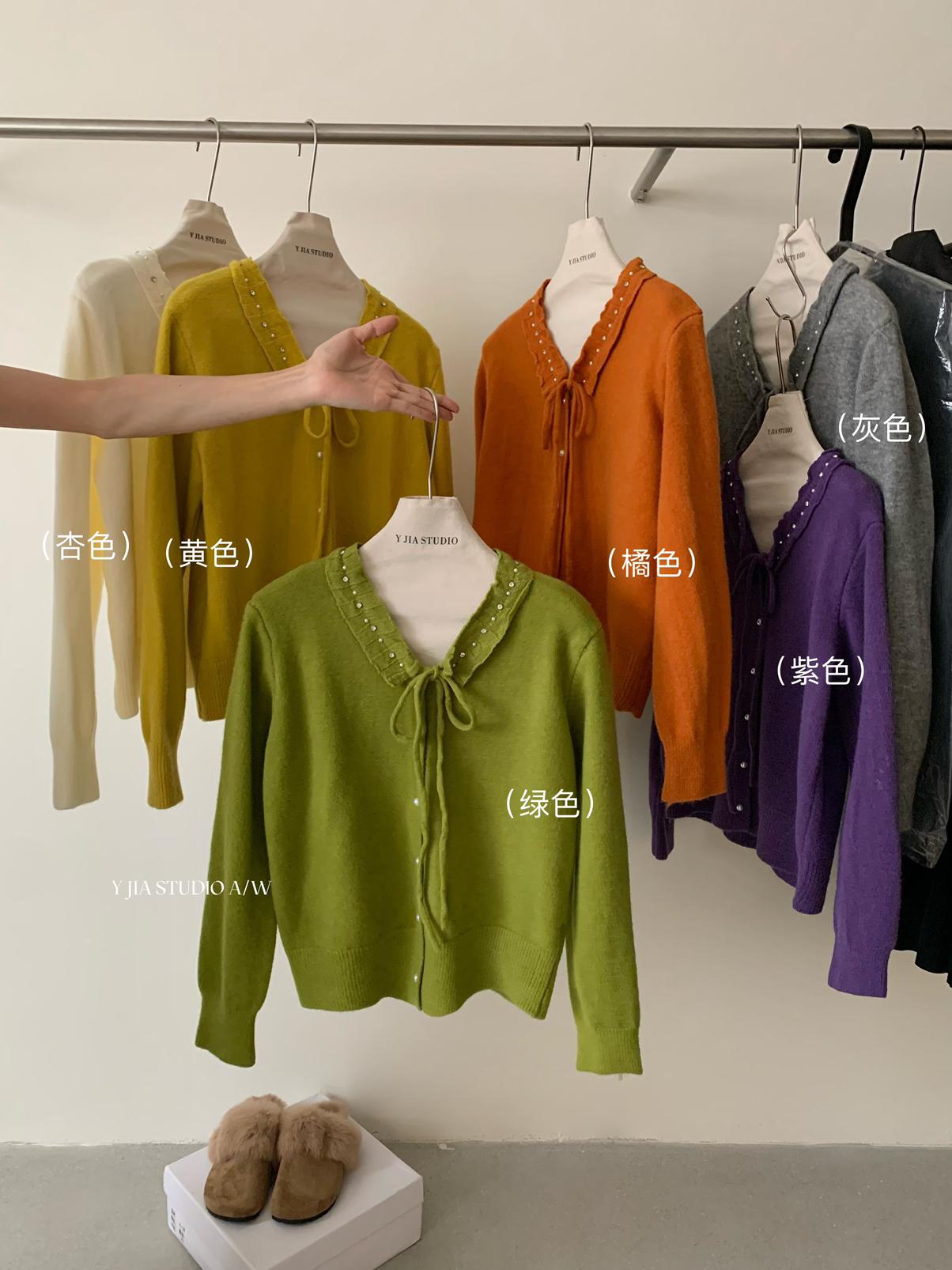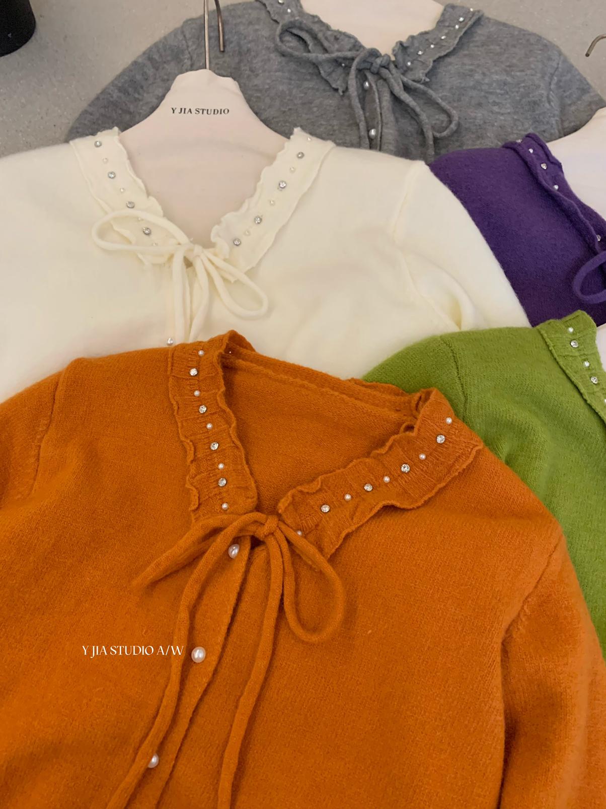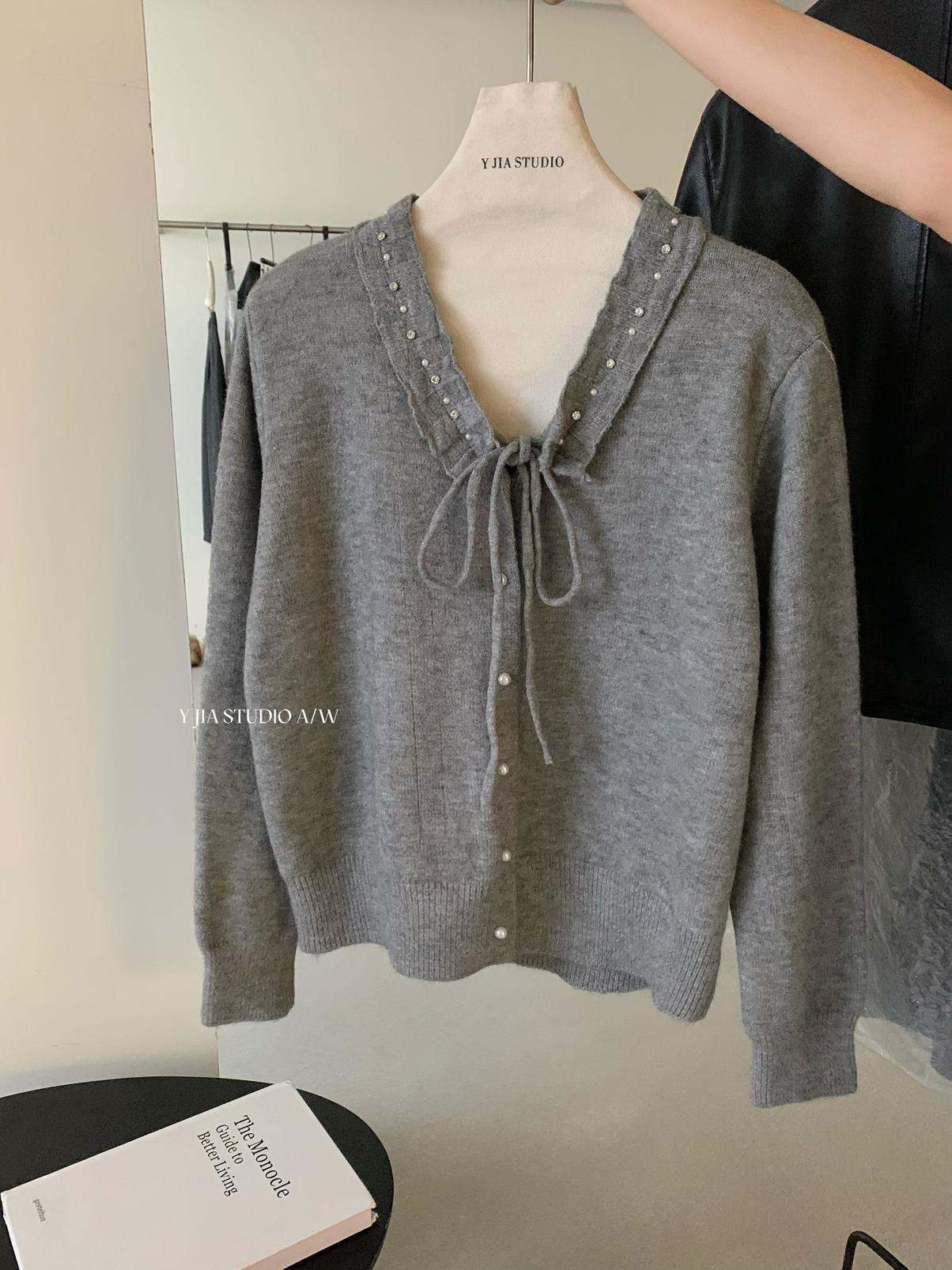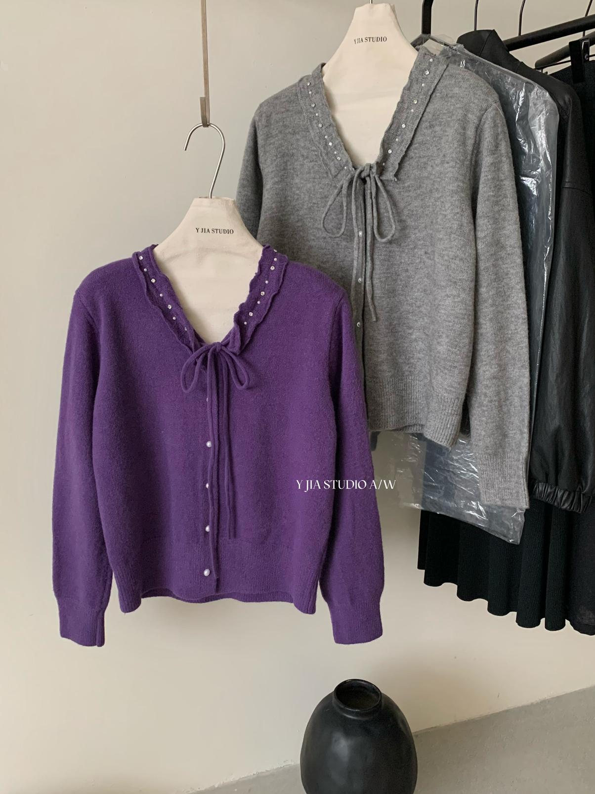 【C7785】精緻氣質V領花邊釘珠針織開衫保暖毛衣