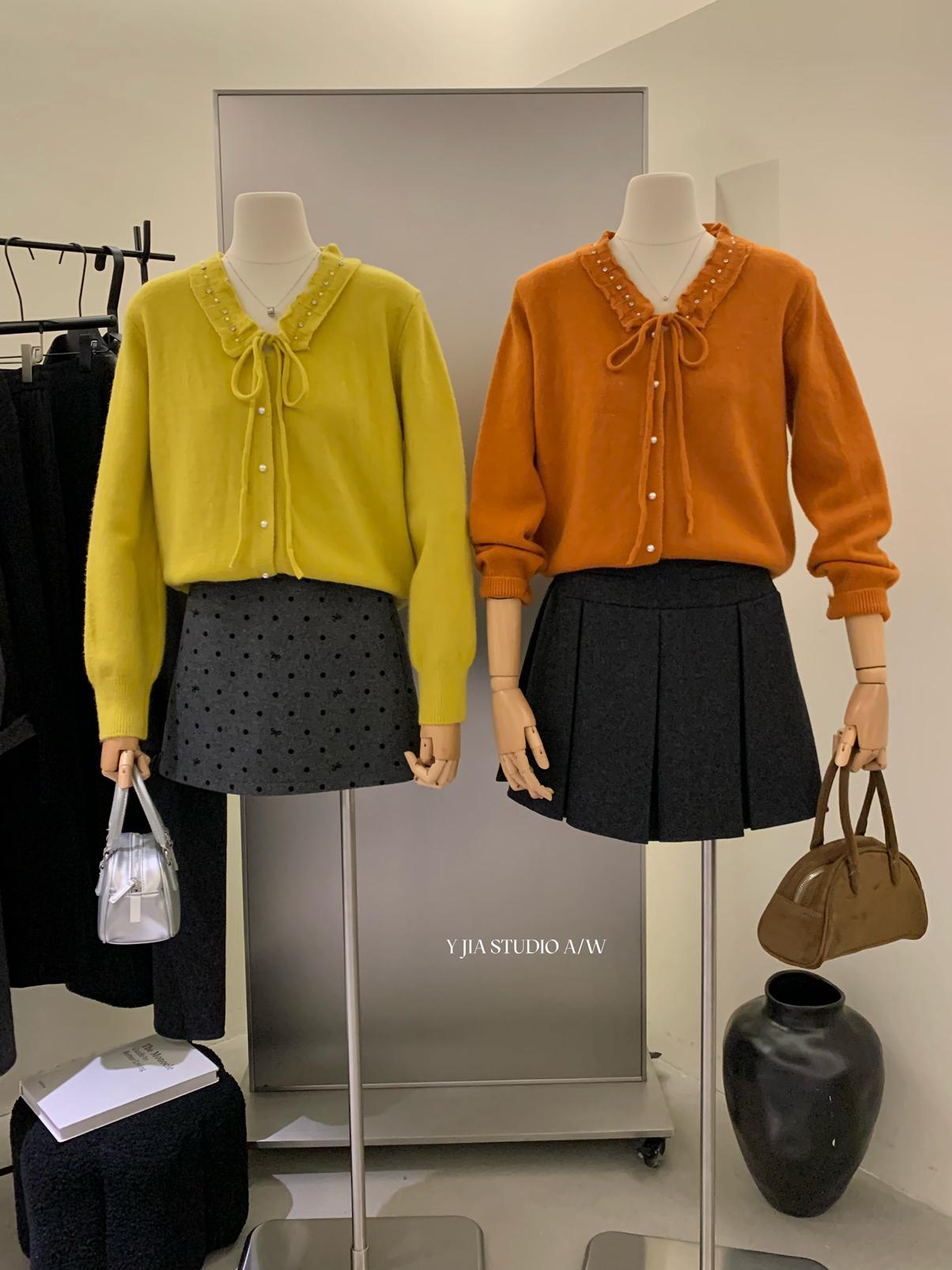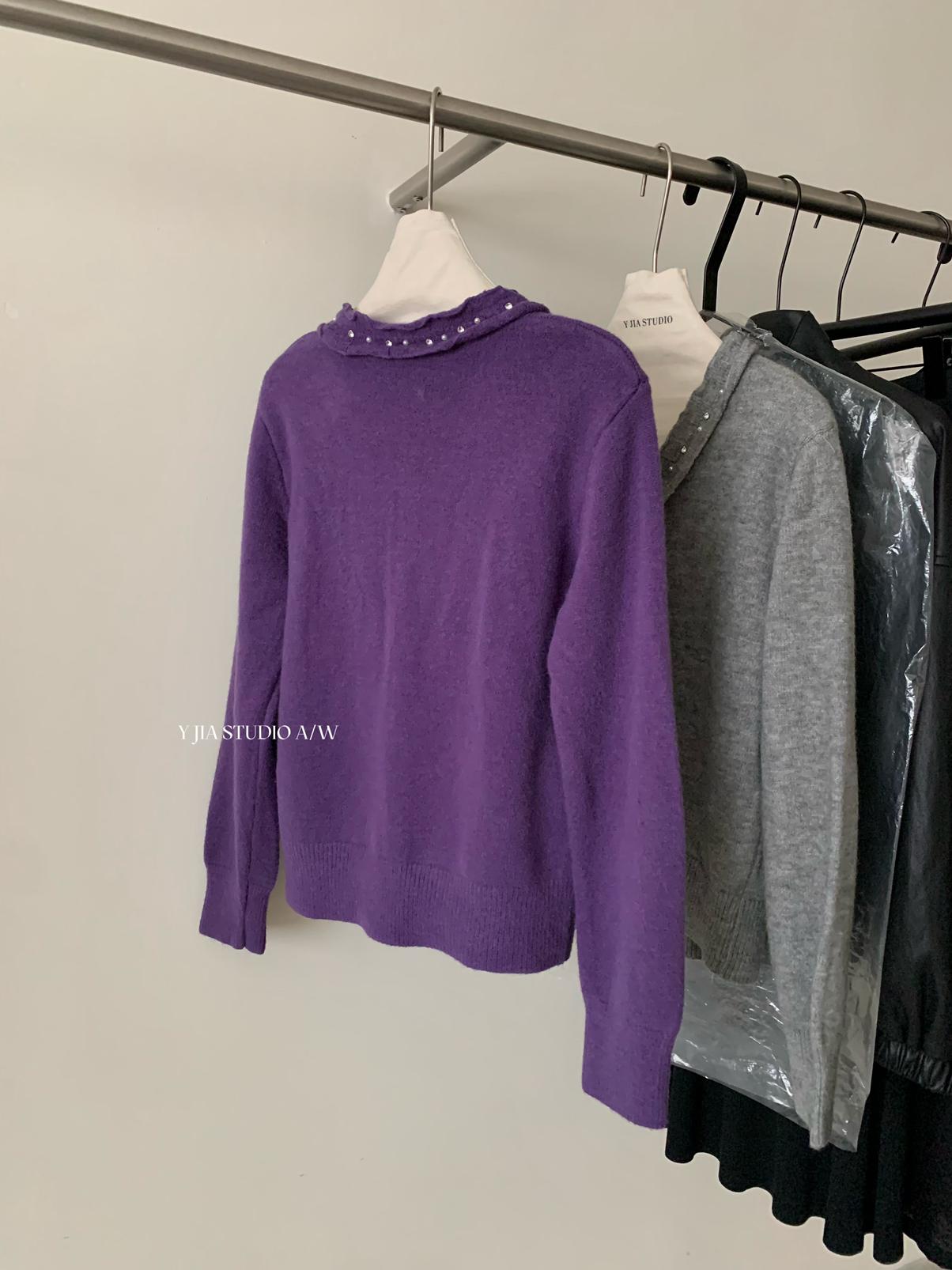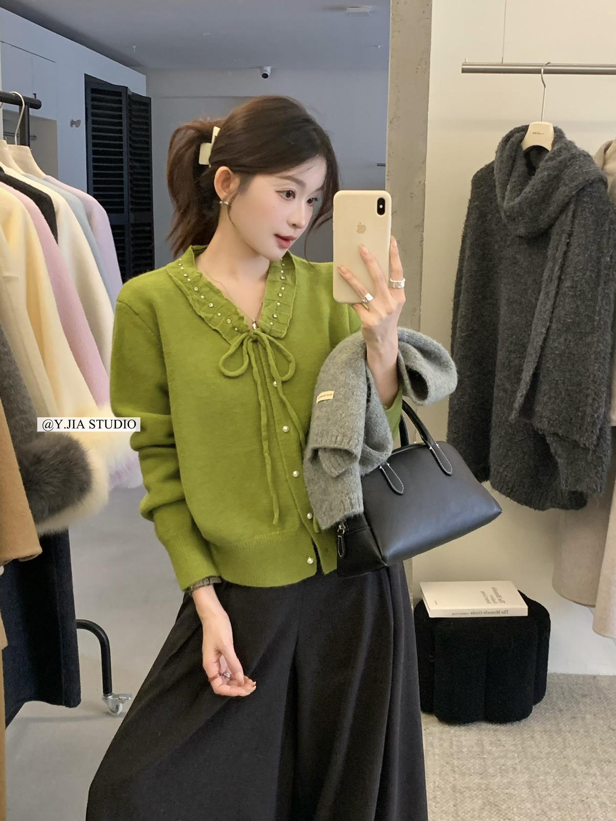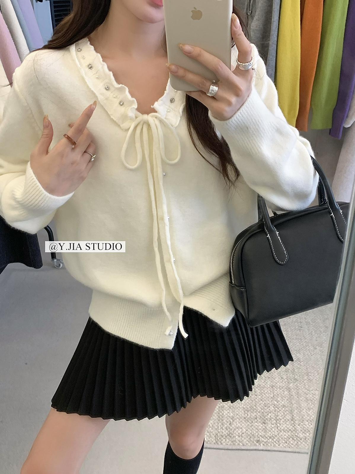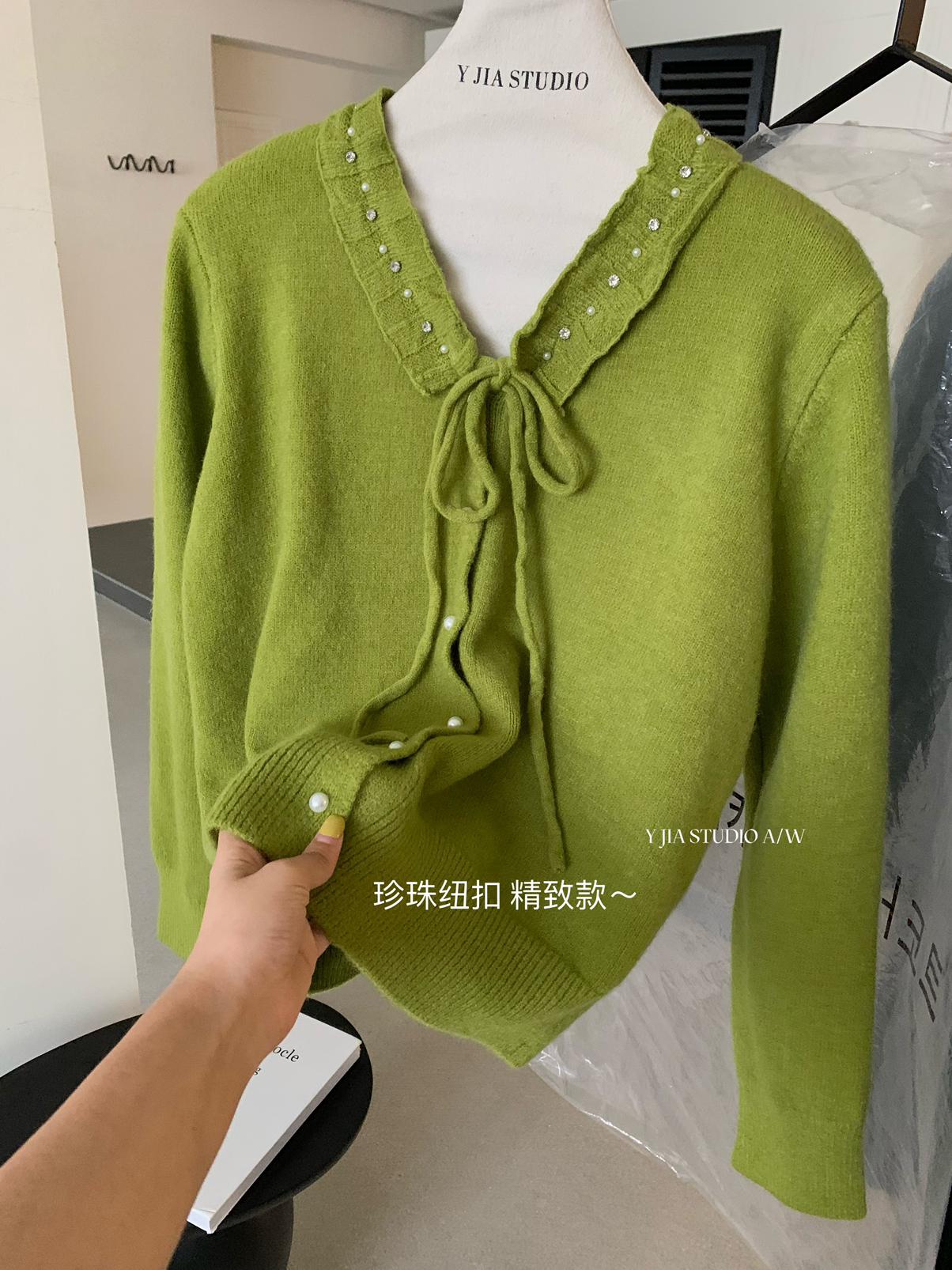 【C7785】精緻氣質V領花邊釘珠針織開衫保暖毛衣