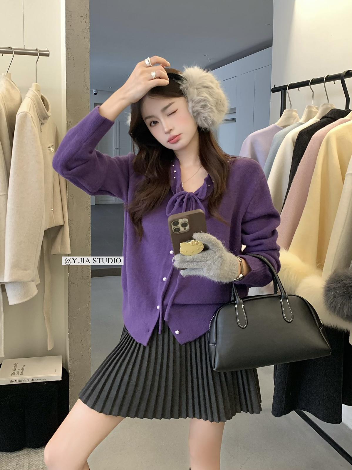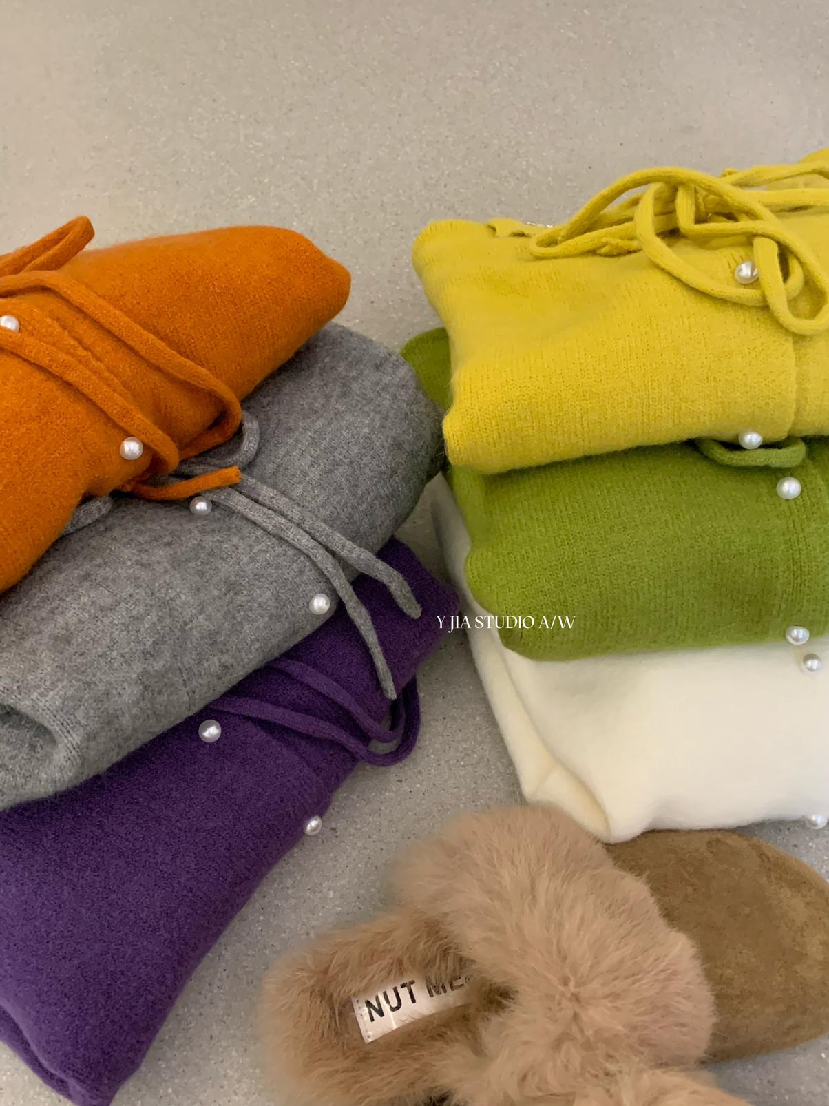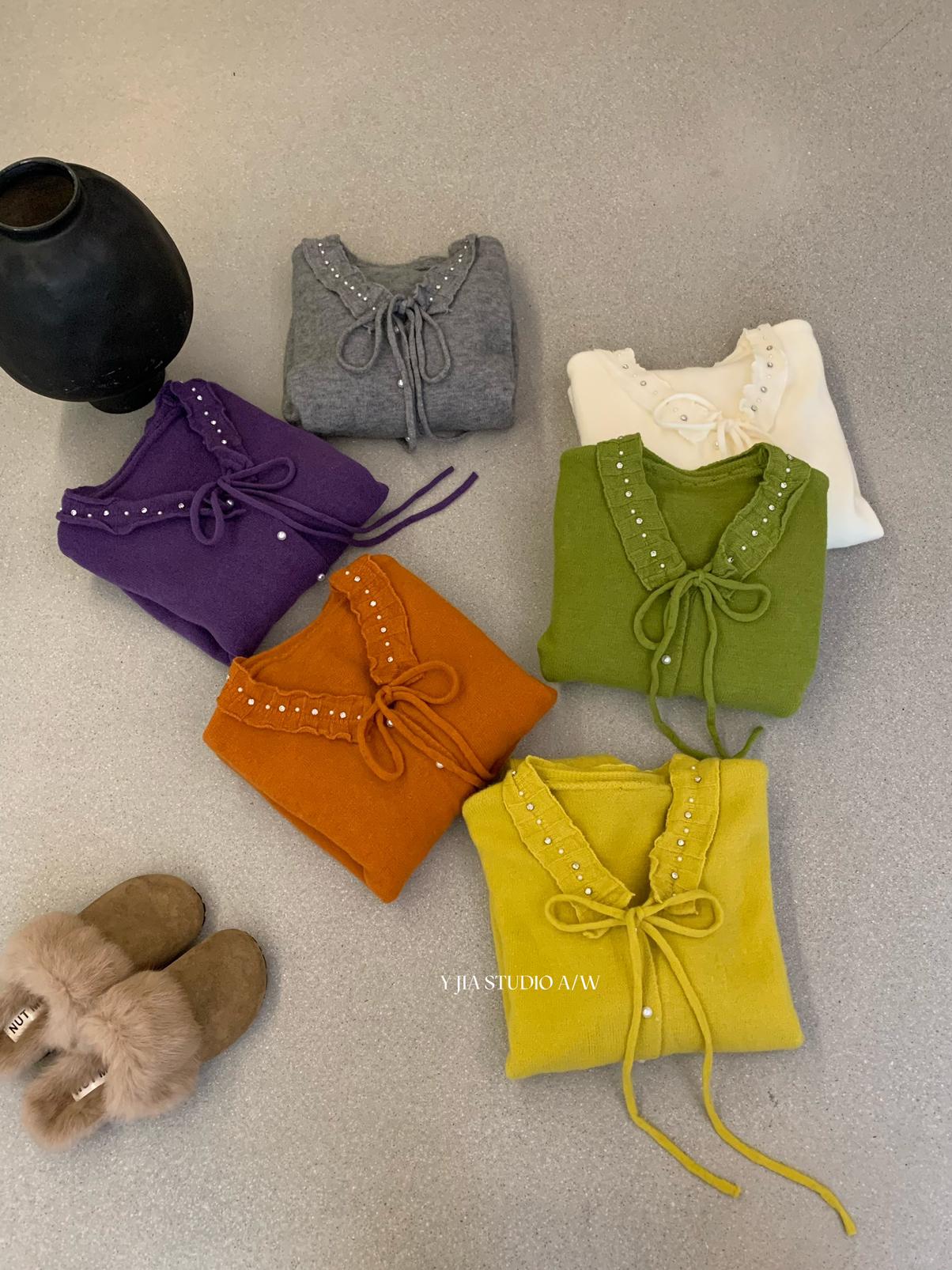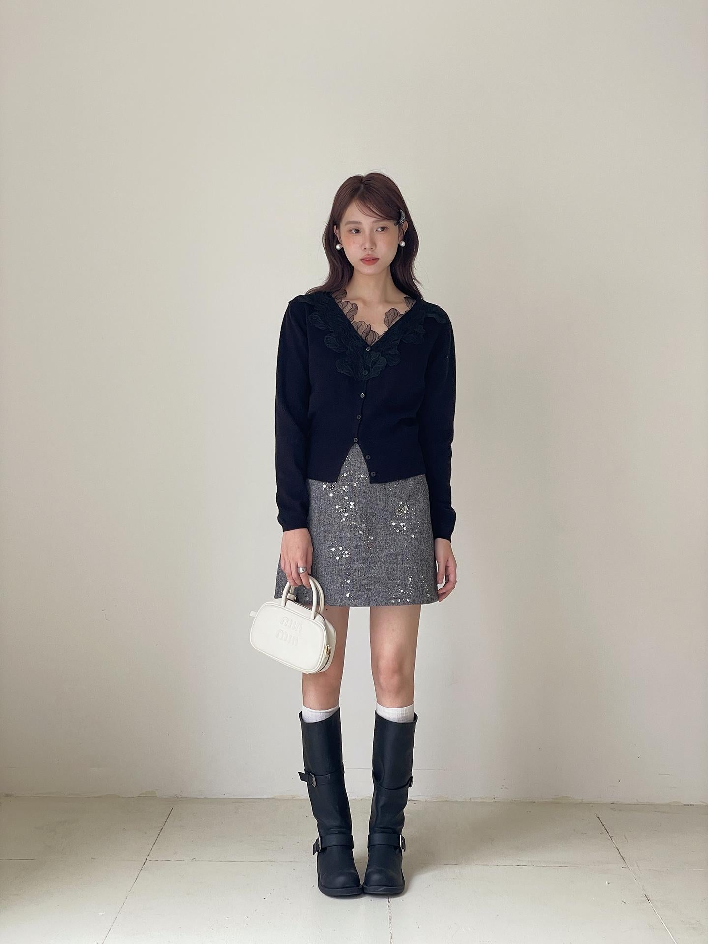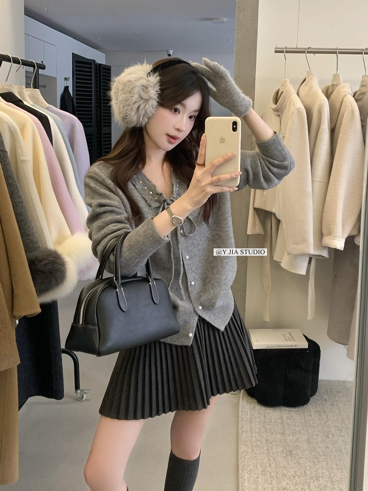 【C7785】精緻氣質V領花邊釘珠針織開衫保暖毛衣