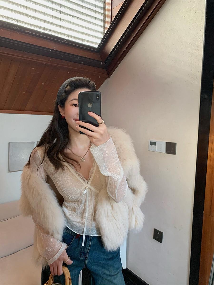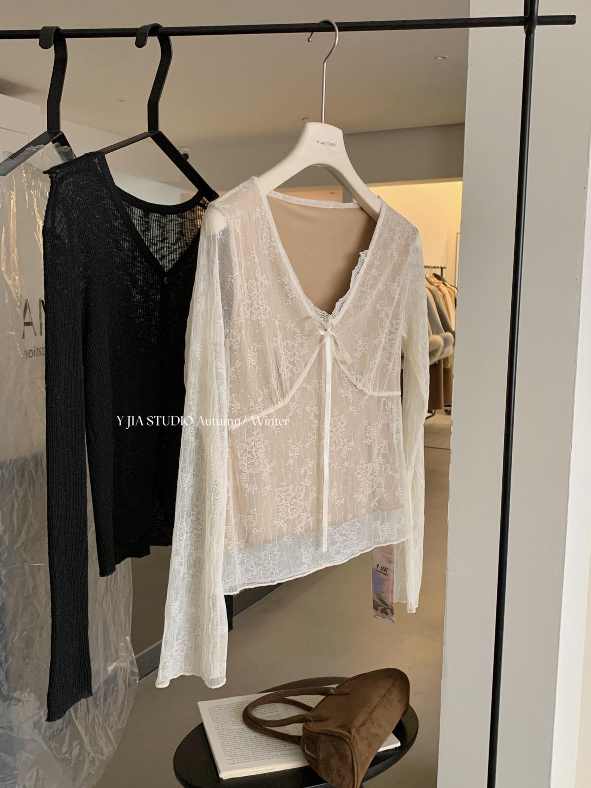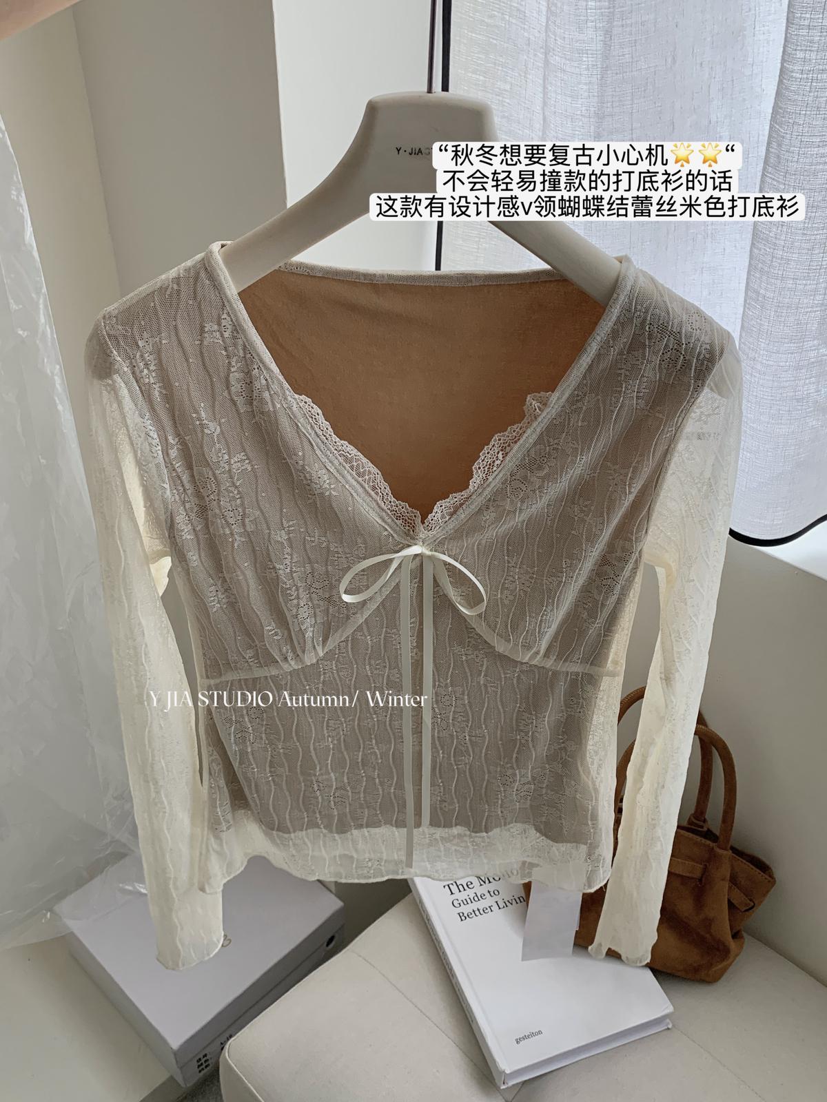 【C7787】心動story~時髦升級內裏磨毛蕾絲內搭疊穿V領蕾絲衫小衫