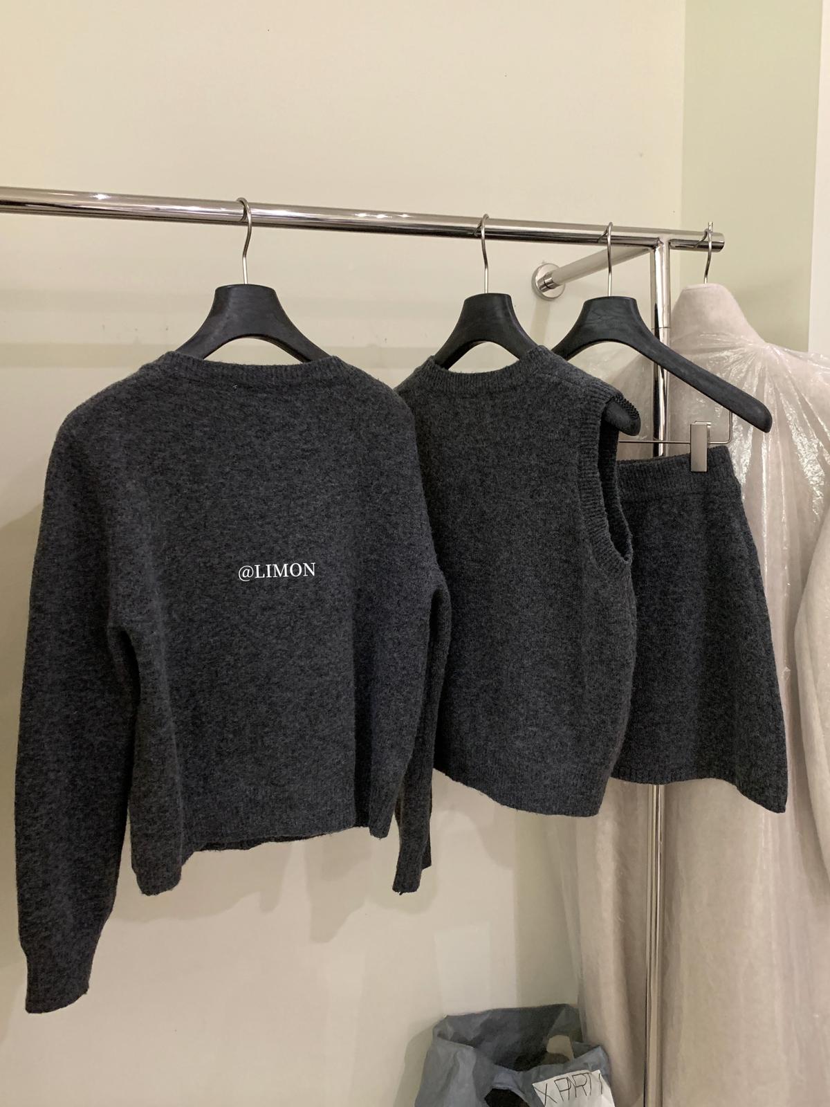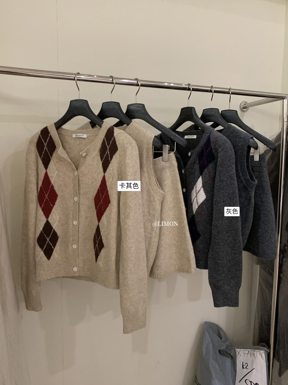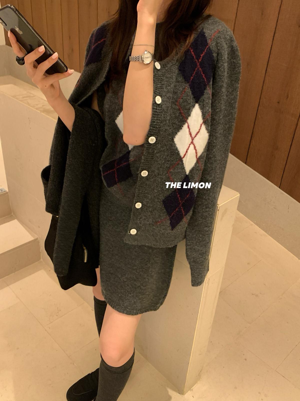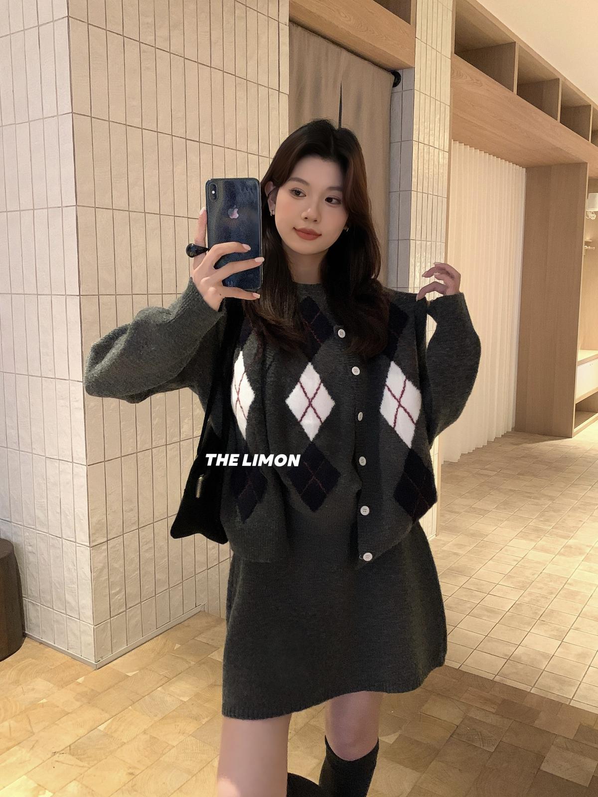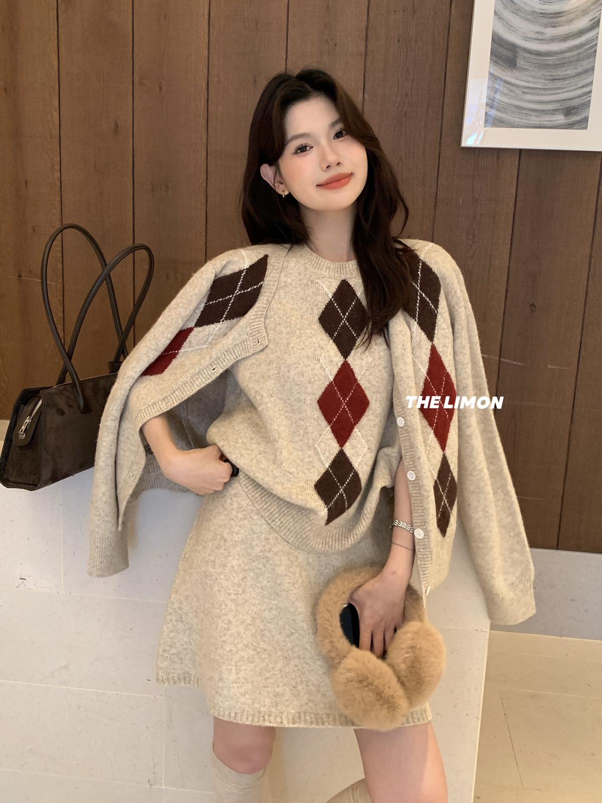 【C7789】超有氣質!菱格針織開衫+圓領背心+高腰半身裙三件套套裝