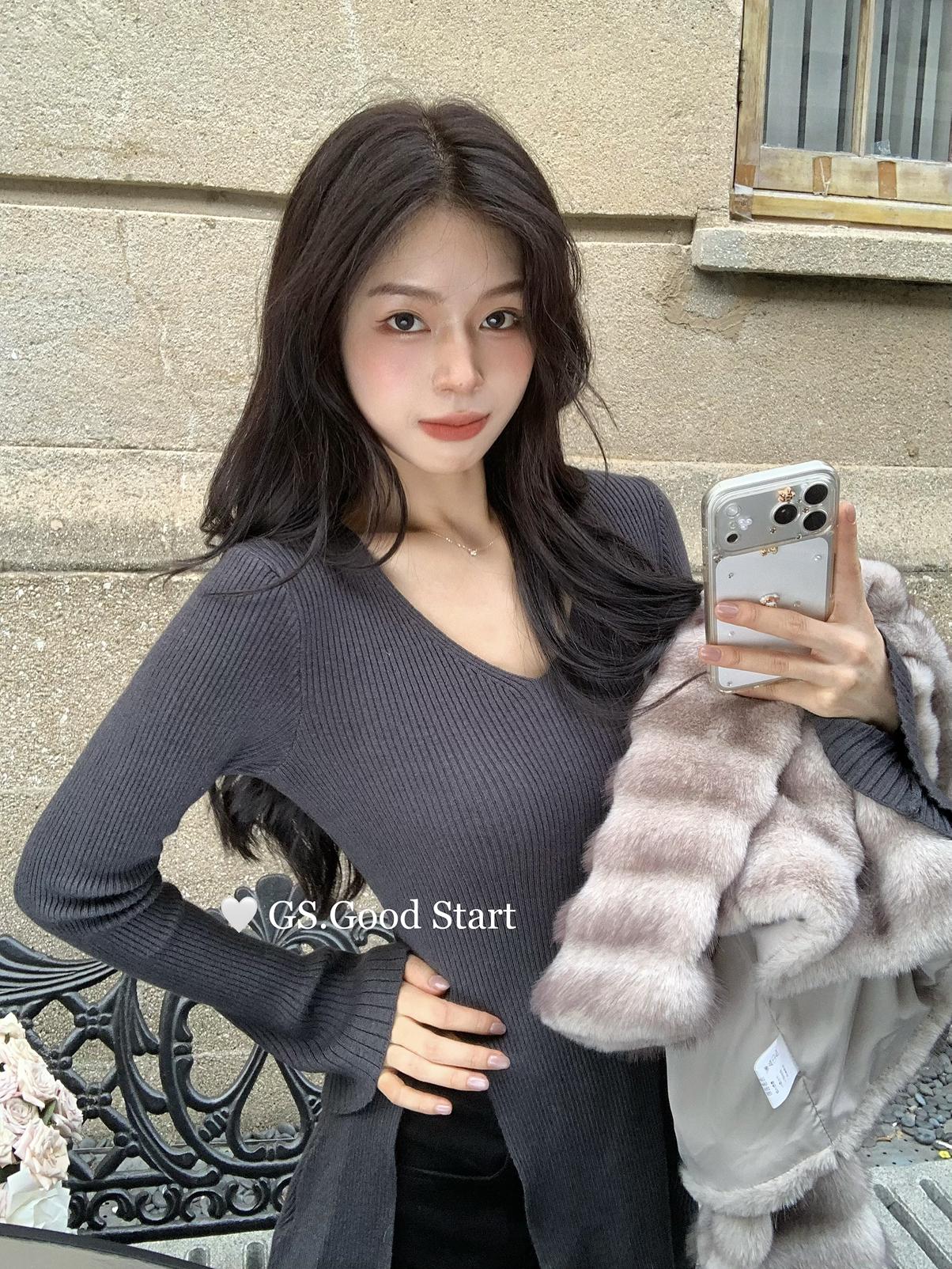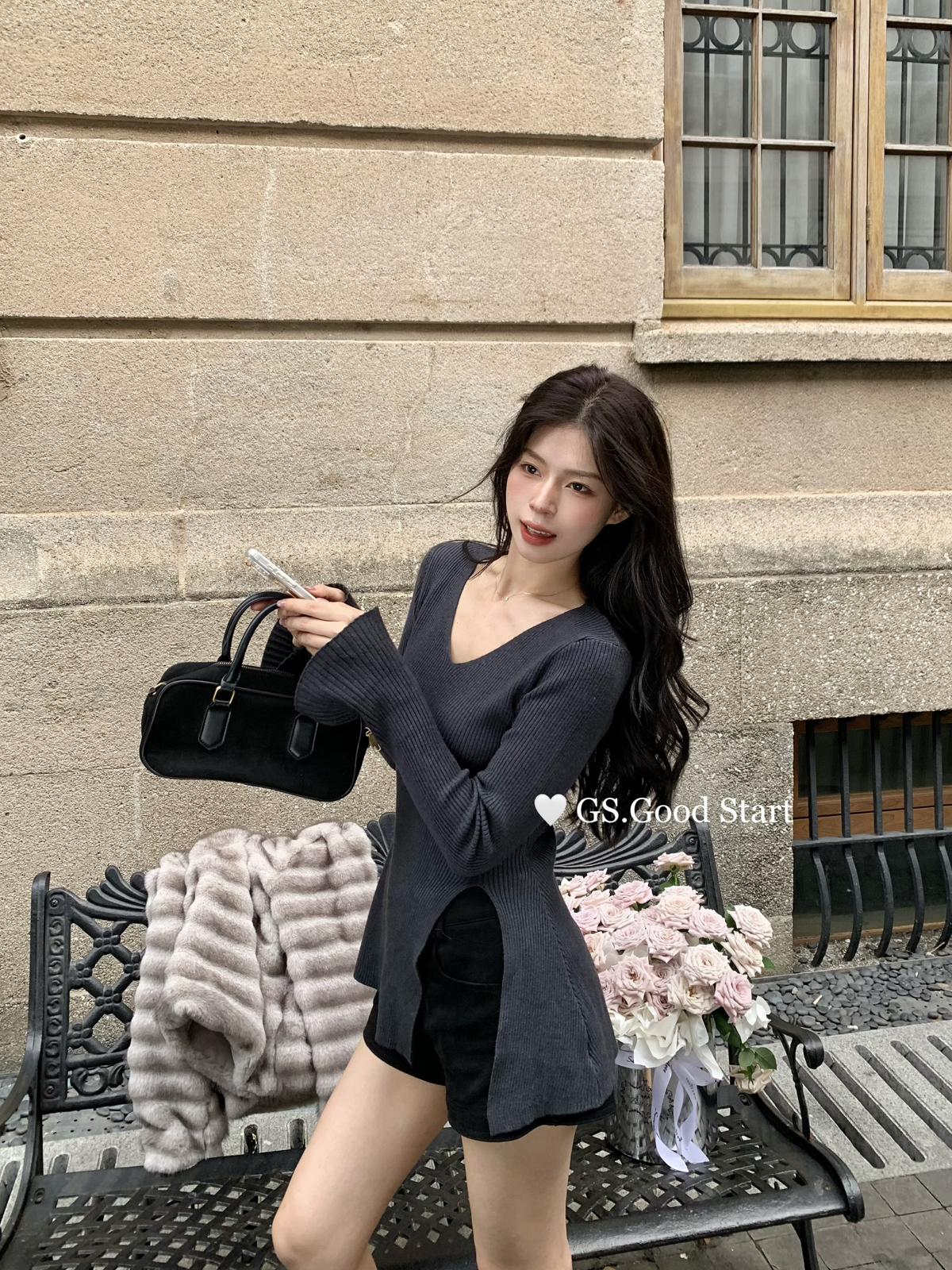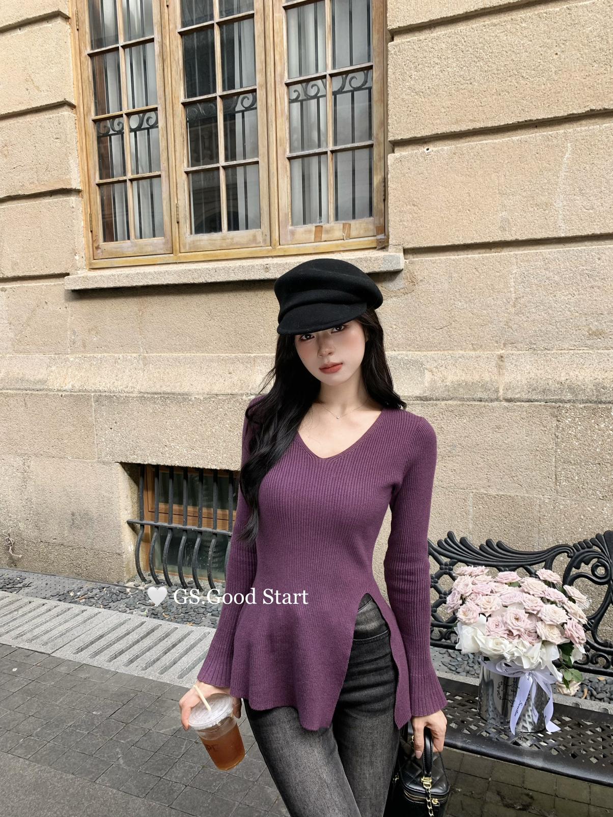 【C7809】爆賣*小腰精!秒開顯瘦濾鏡~補單王!冬氣質純欲開衩修身針織小衫