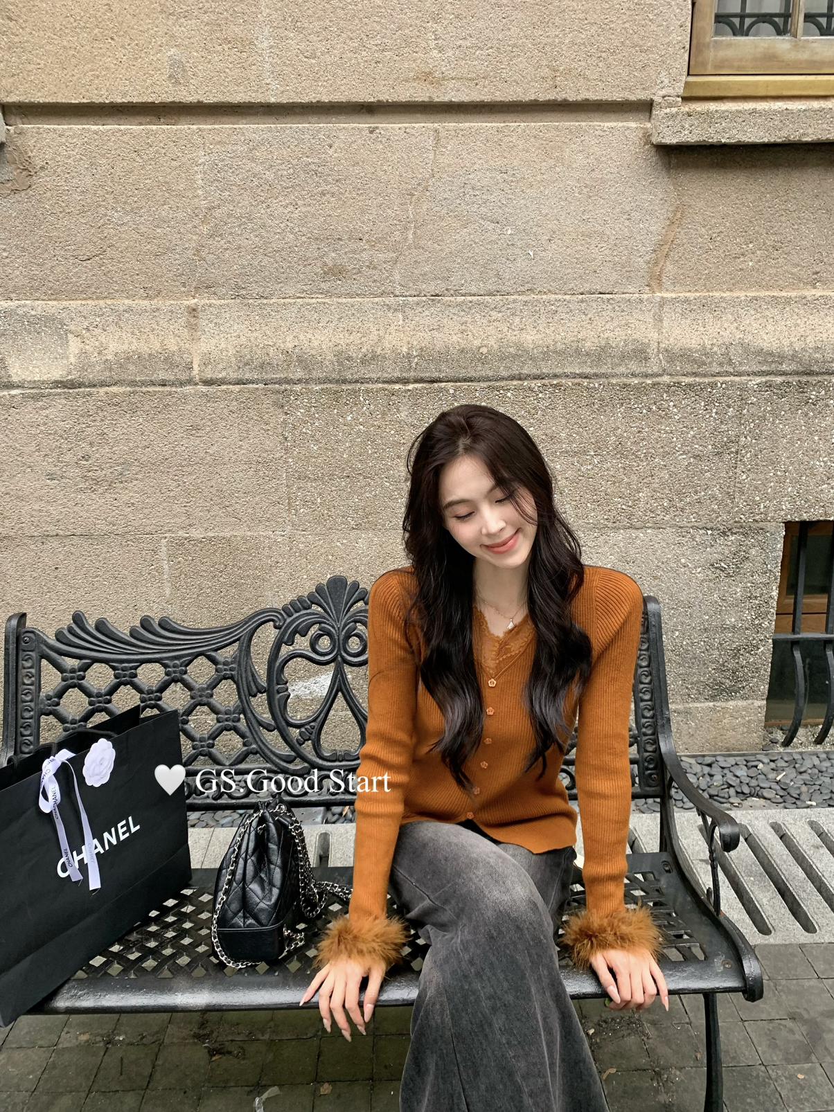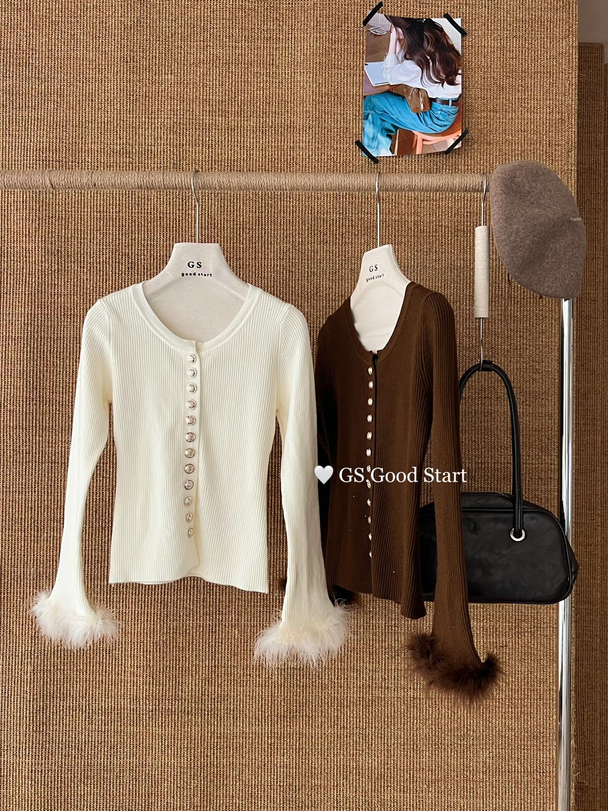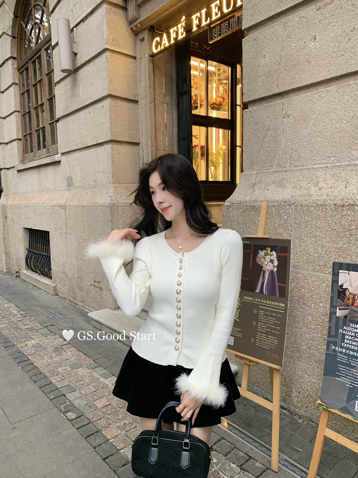 【C7811】熱賣必入!貴氣感buff*疊加~秋冬氣質千金感排扣毛毛袖顯瘦針織衫