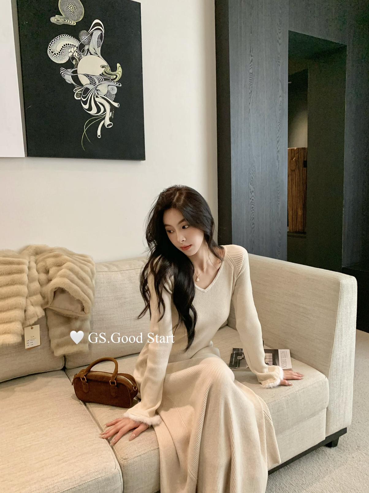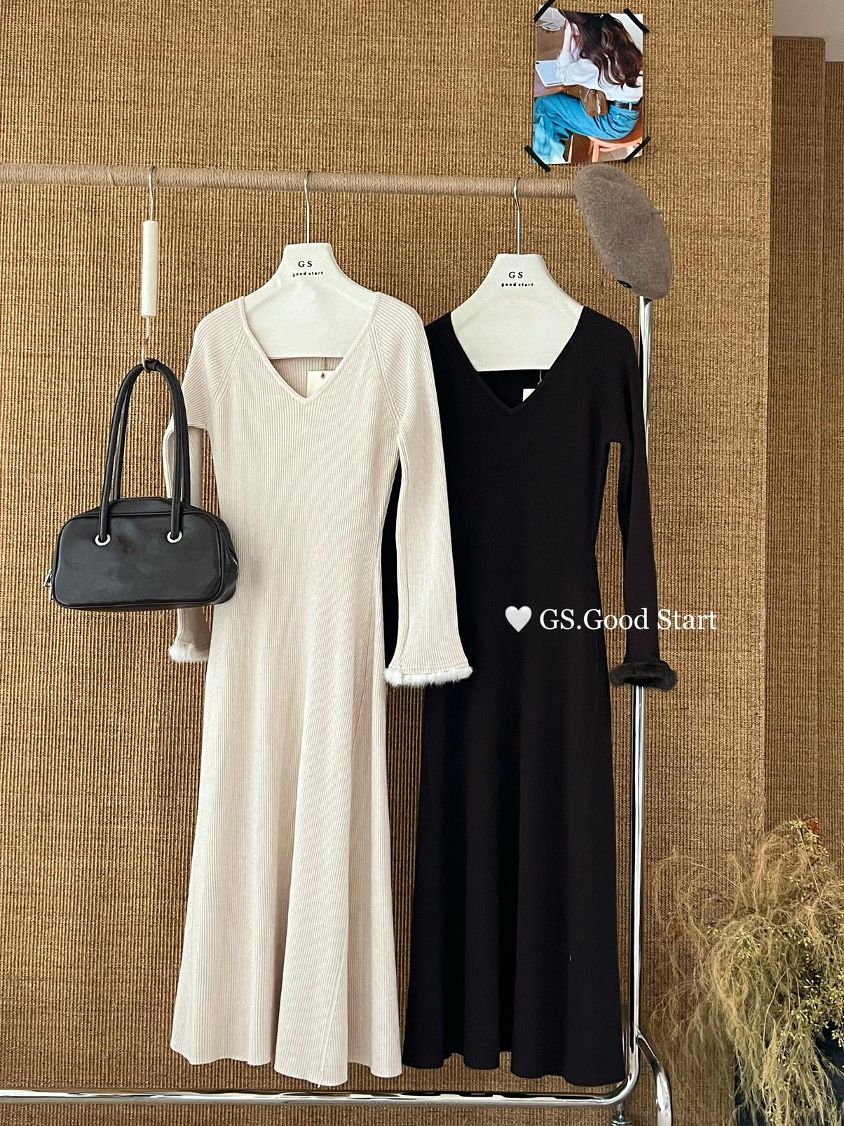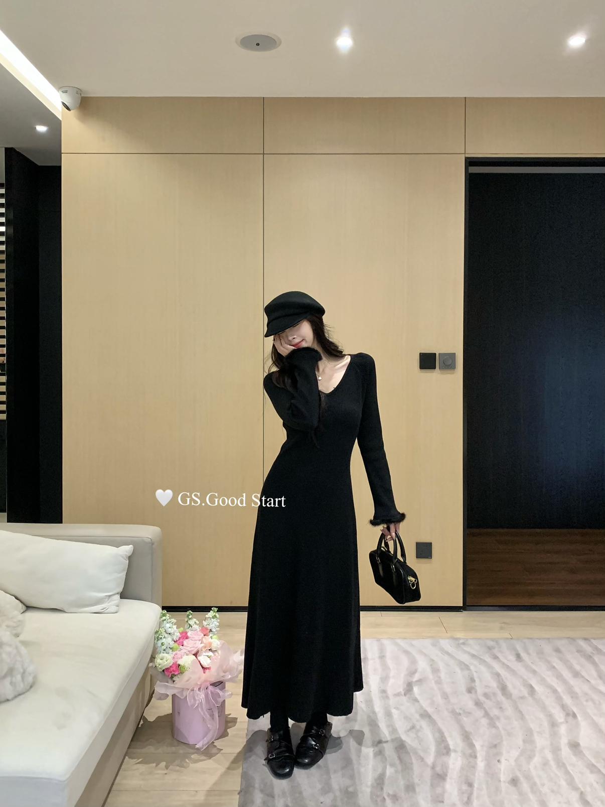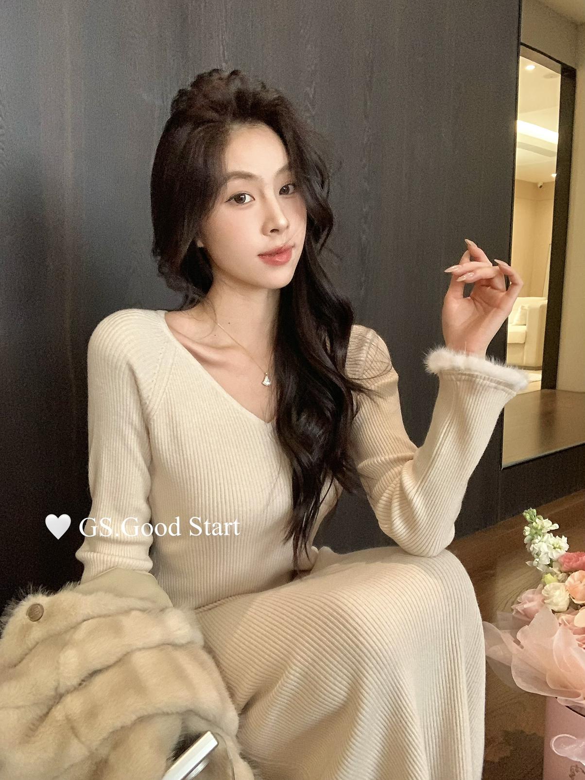 【C7812】狂安利!曼妙S曲線~絕美內搭!秋冬氣質純欲v領毛袖收腰針織連衣裙