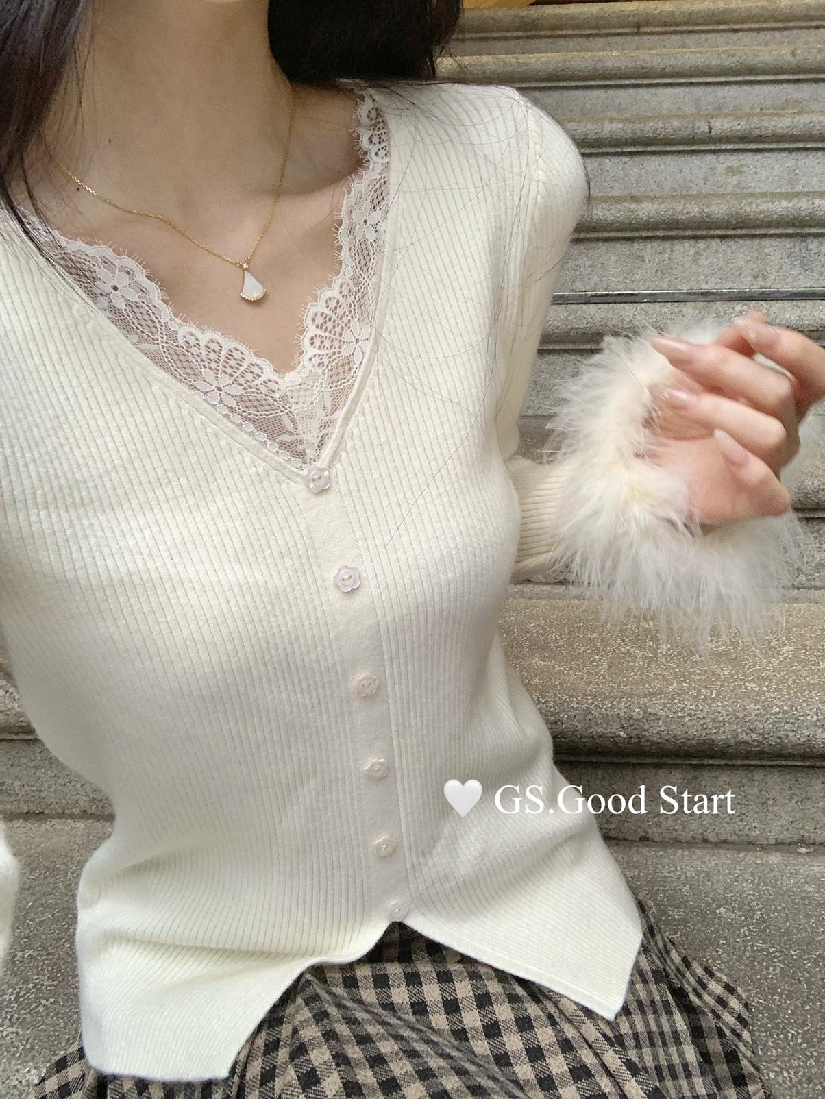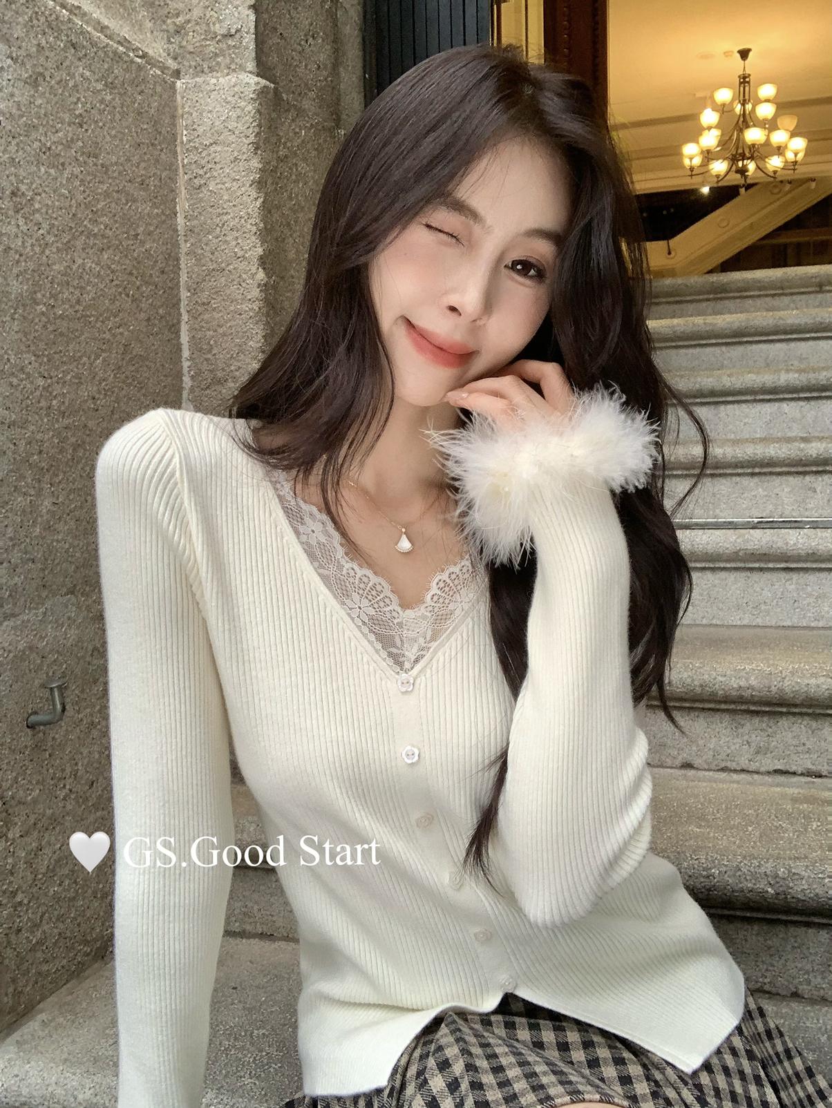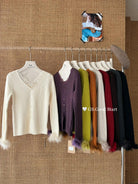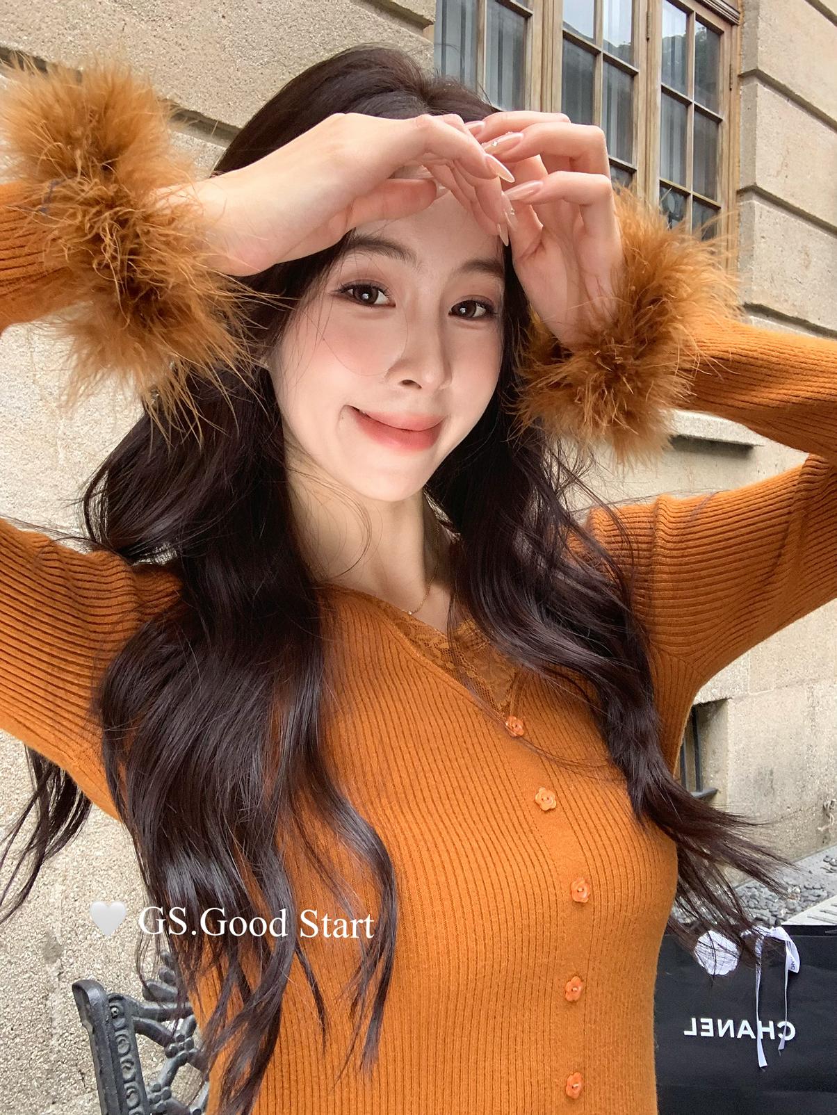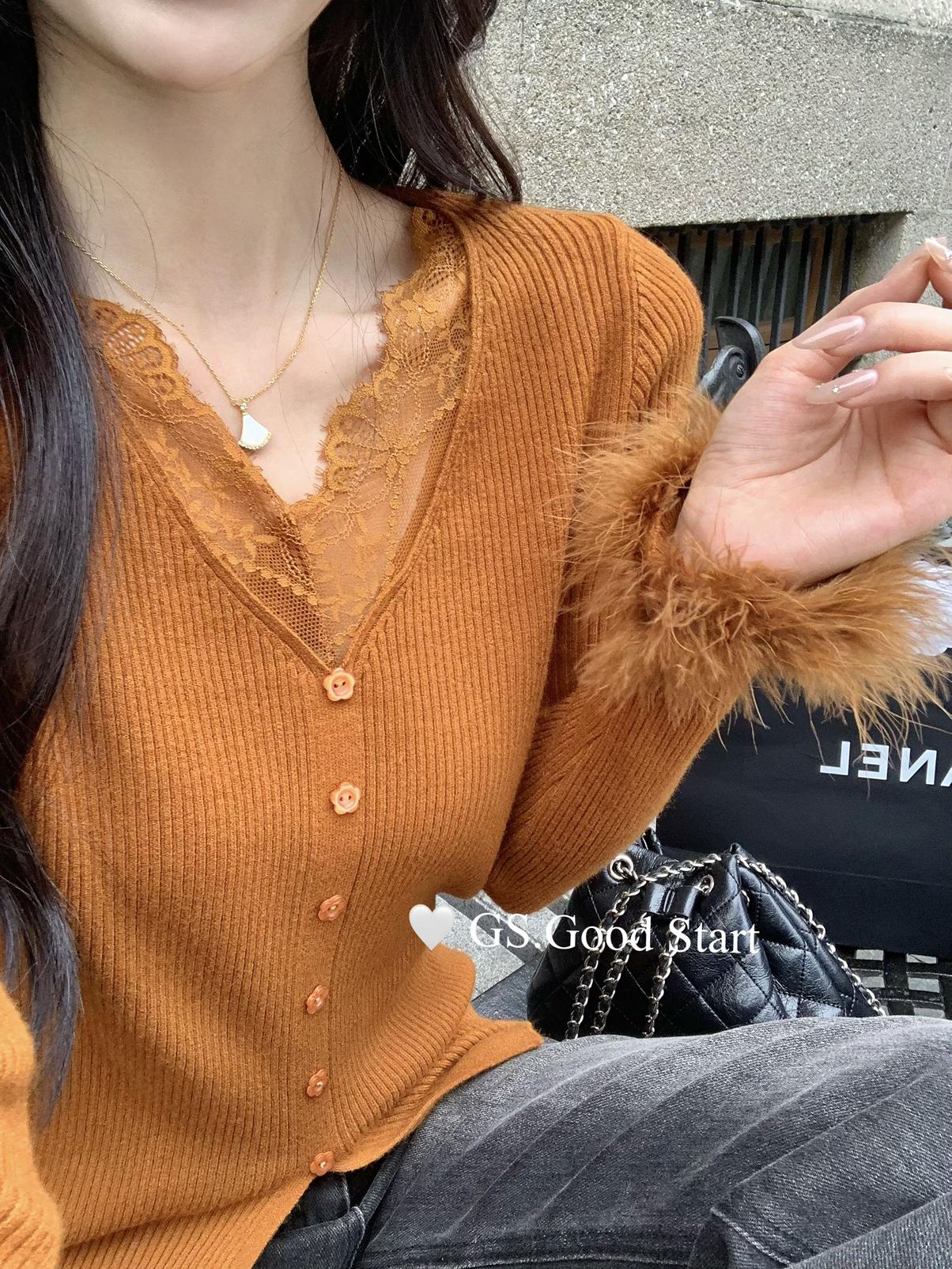 【C7814】吸睛爆款!心頭愛@嬌貴千金~冬氣質純欲感蕾絲v領毛毛袖針織衫