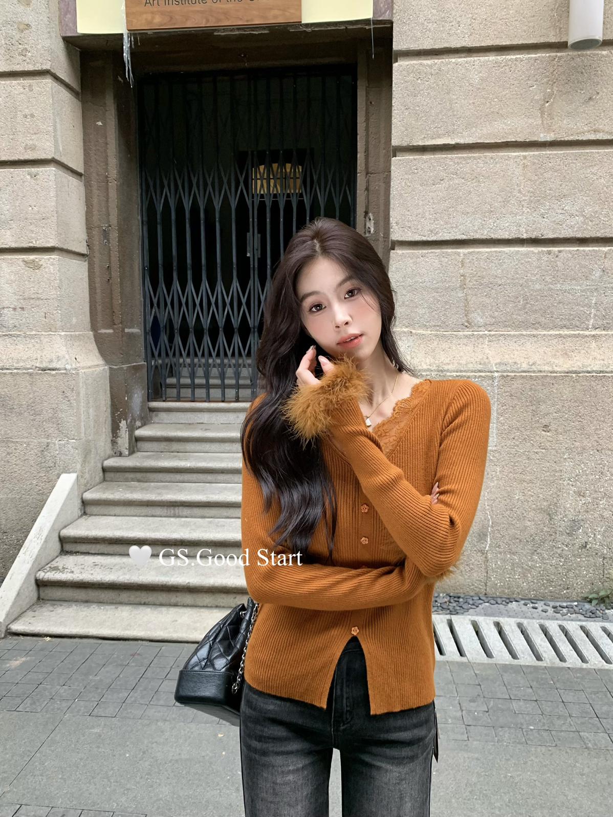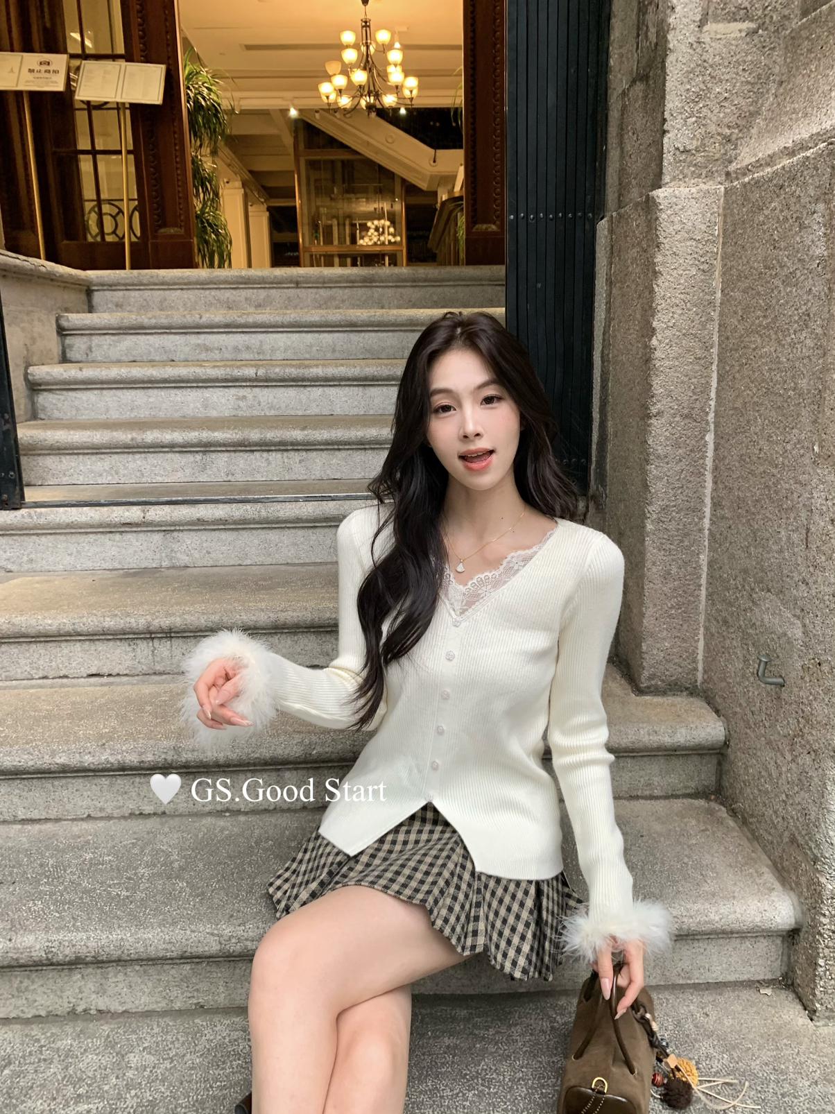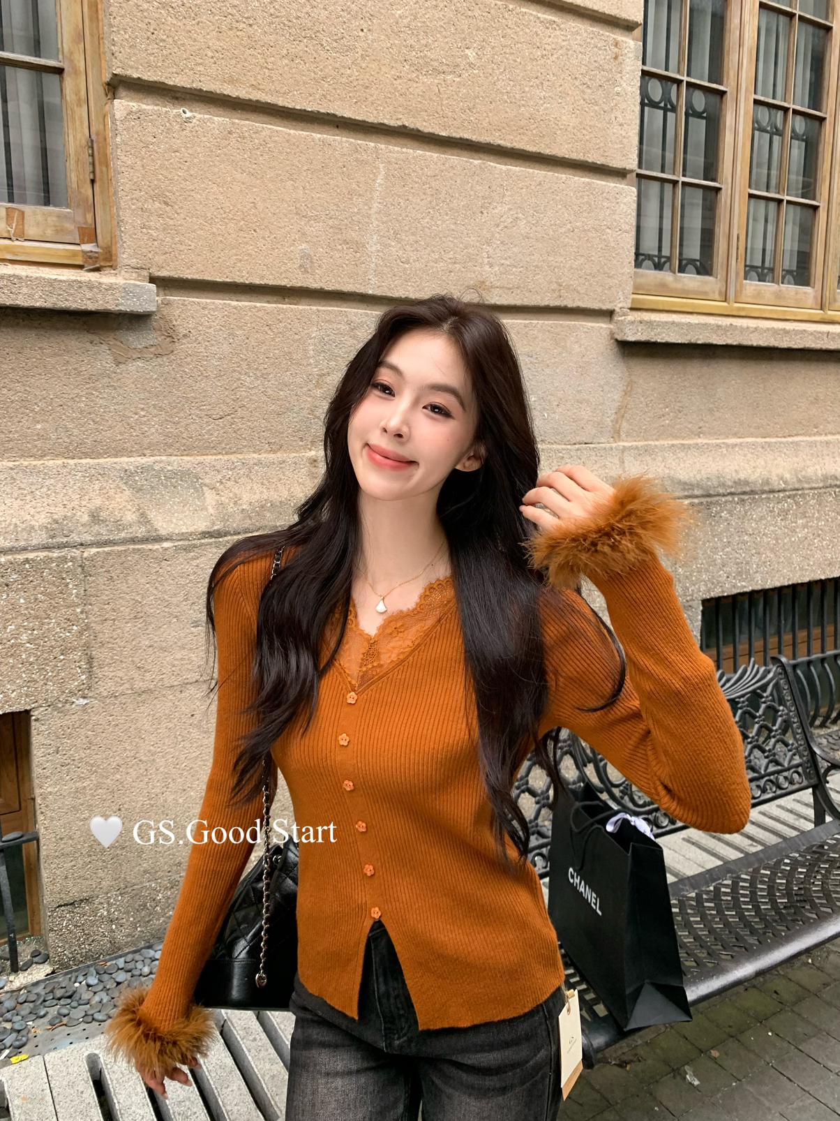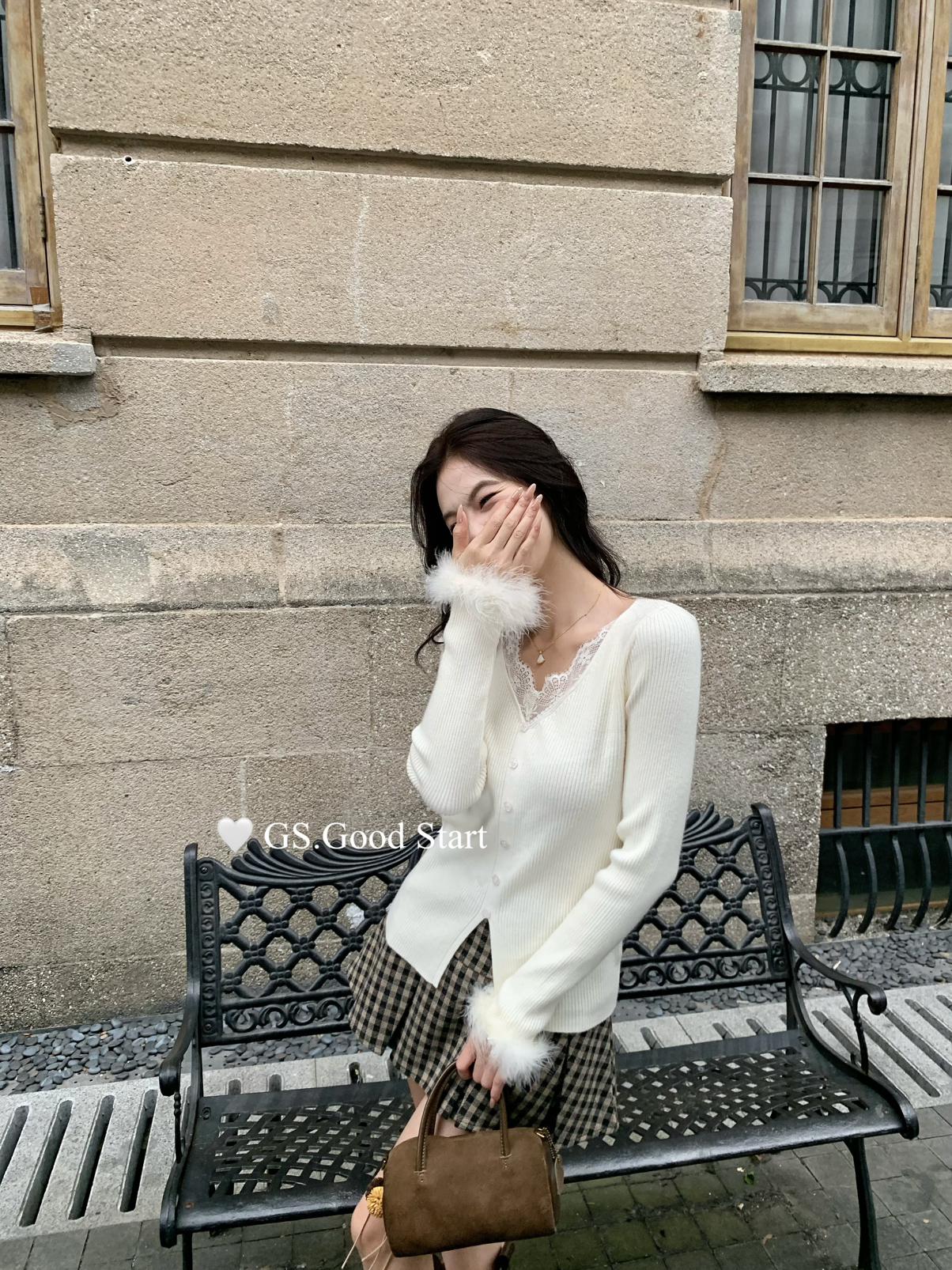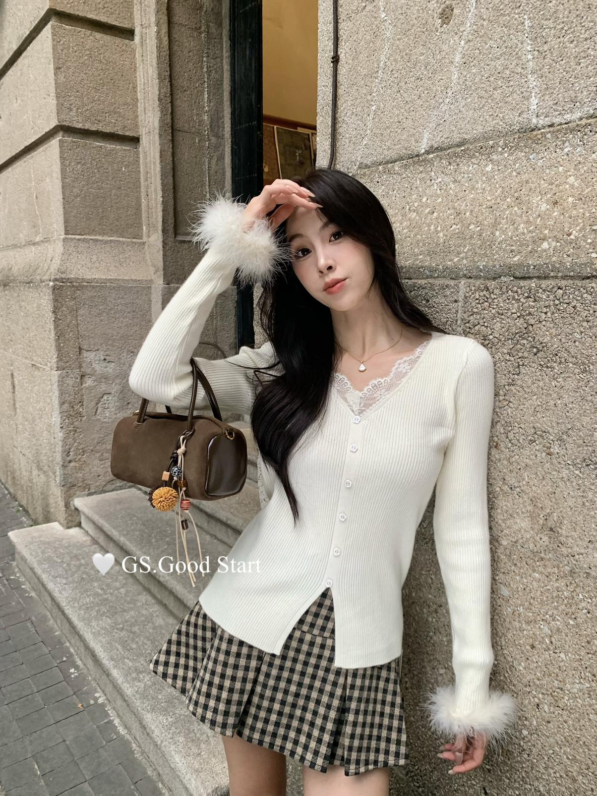 【C7814】吸睛爆款!心頭愛@嬌貴千金~冬氣質純欲感蕾絲v領毛毛袖針織衫