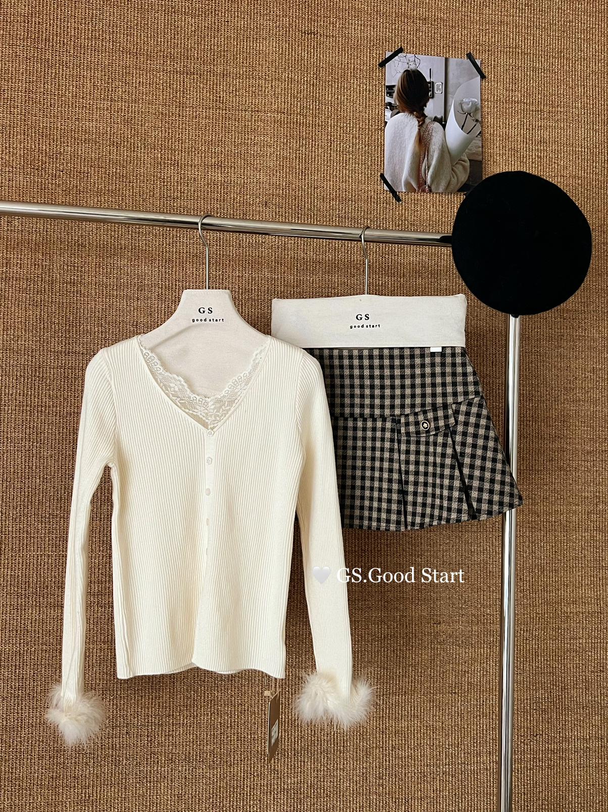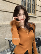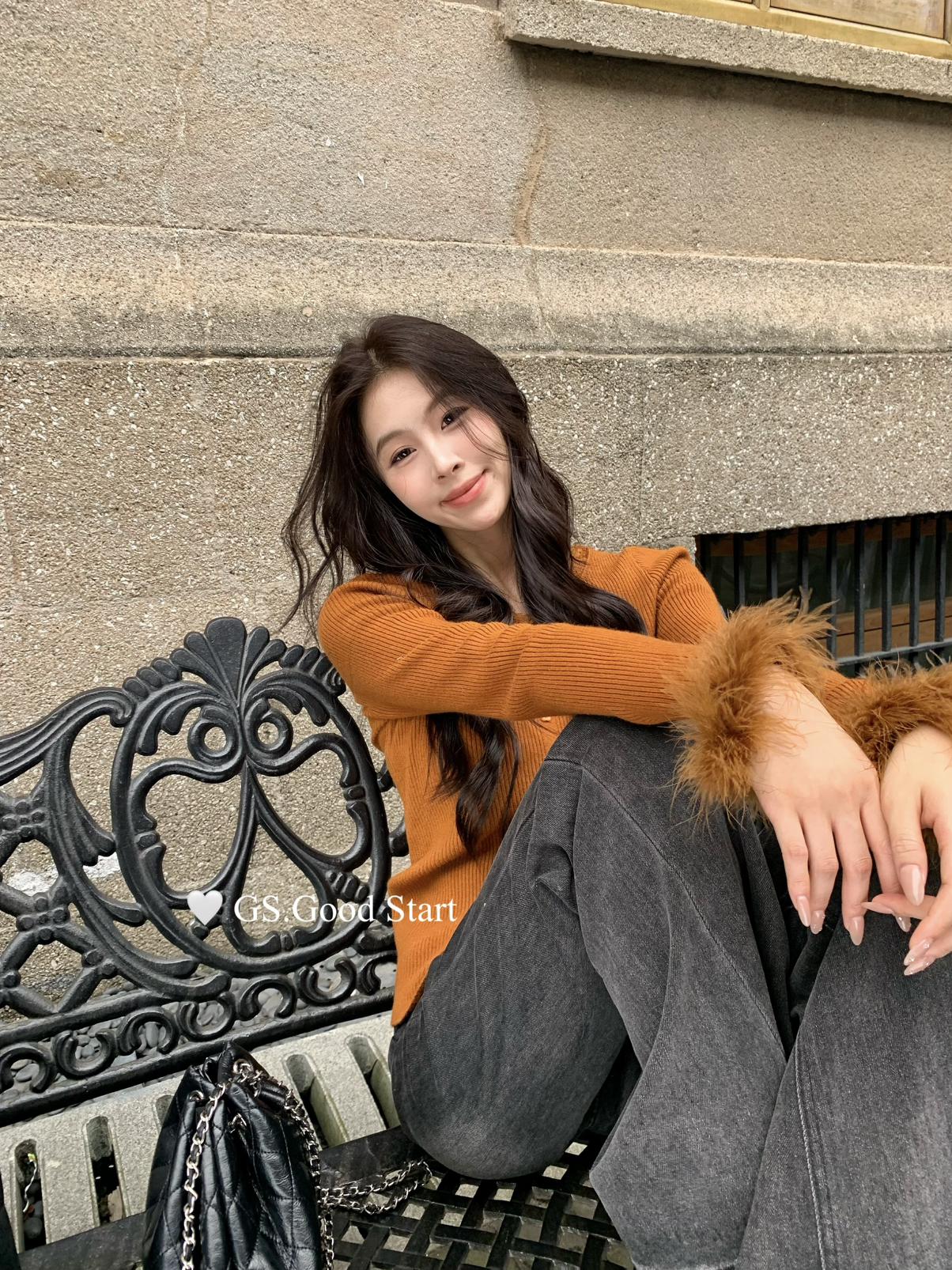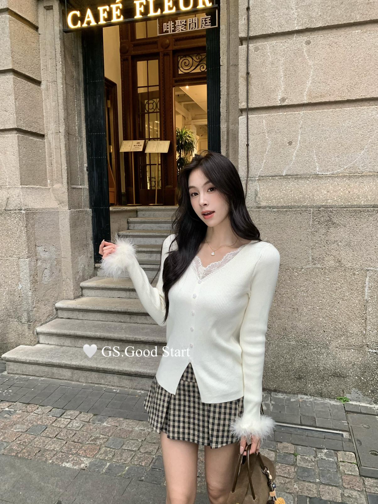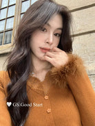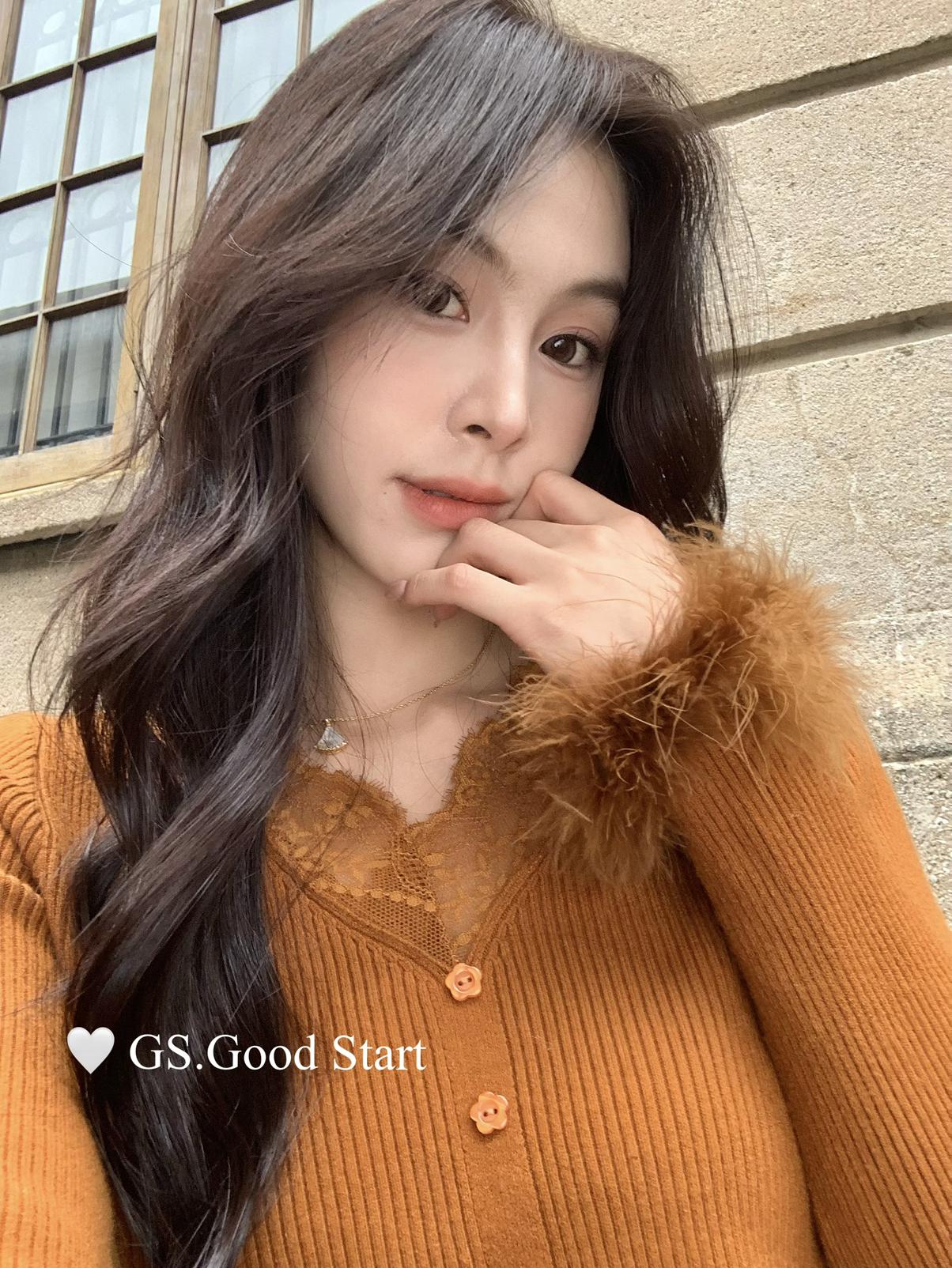 【C7814】吸睛爆款!心頭愛@嬌貴千金~冬氣質純欲感蕾絲v領毛毛袖針織衫