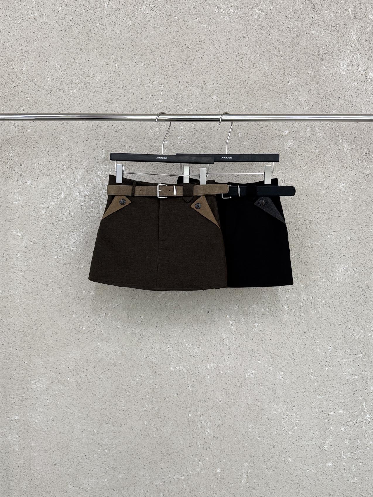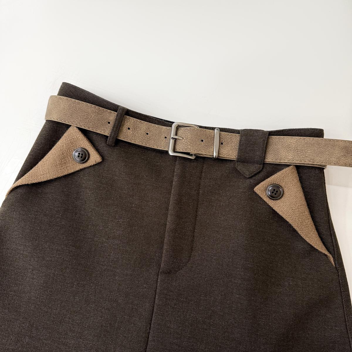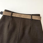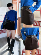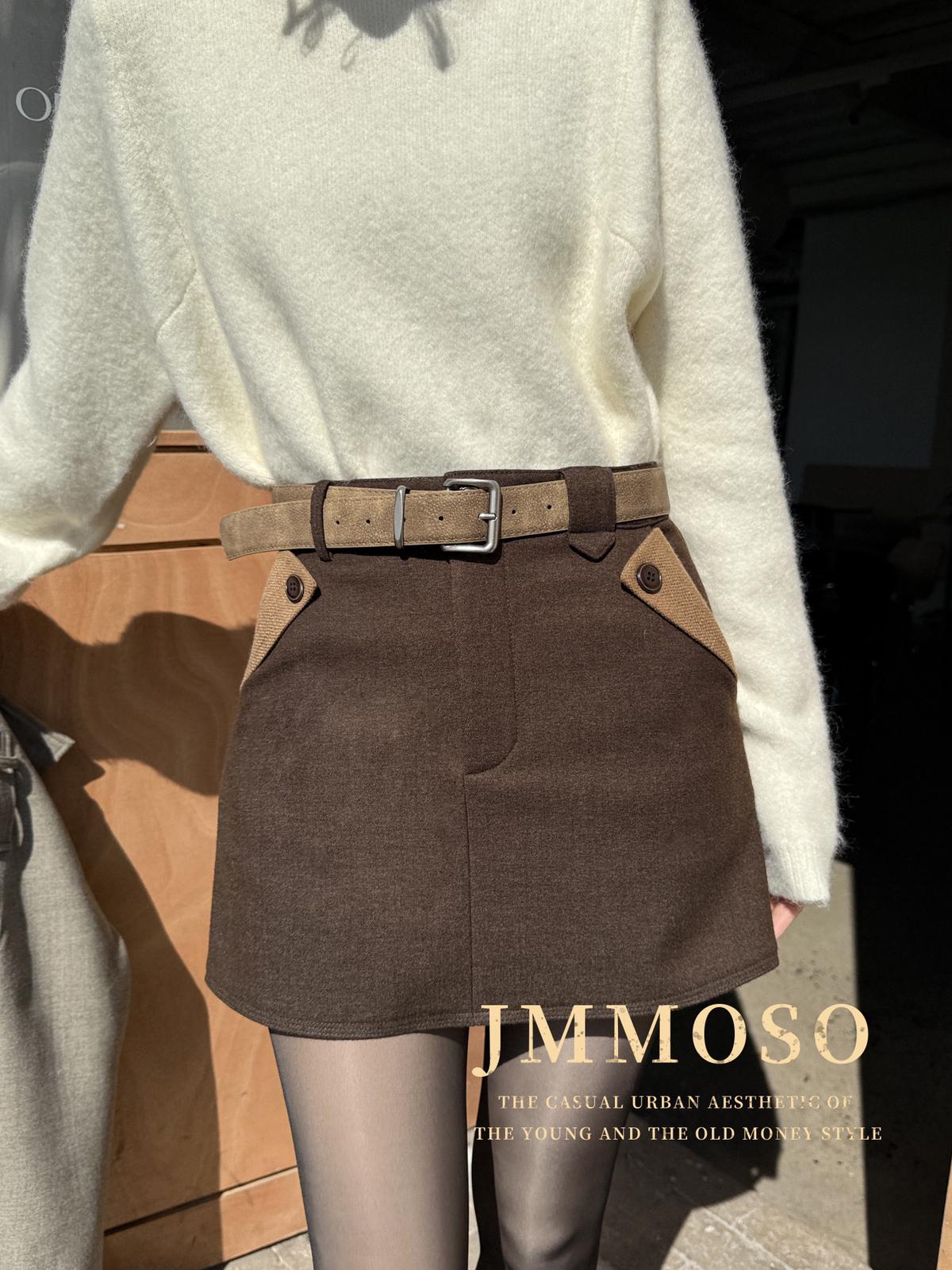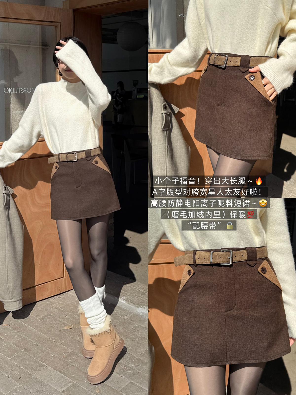 【C7817】時髦博主韓版復古高腰撞色口袋防靜電陽離子呢料A字短裙半身裙(配腰帶)(磨毛加絨內裏)