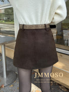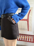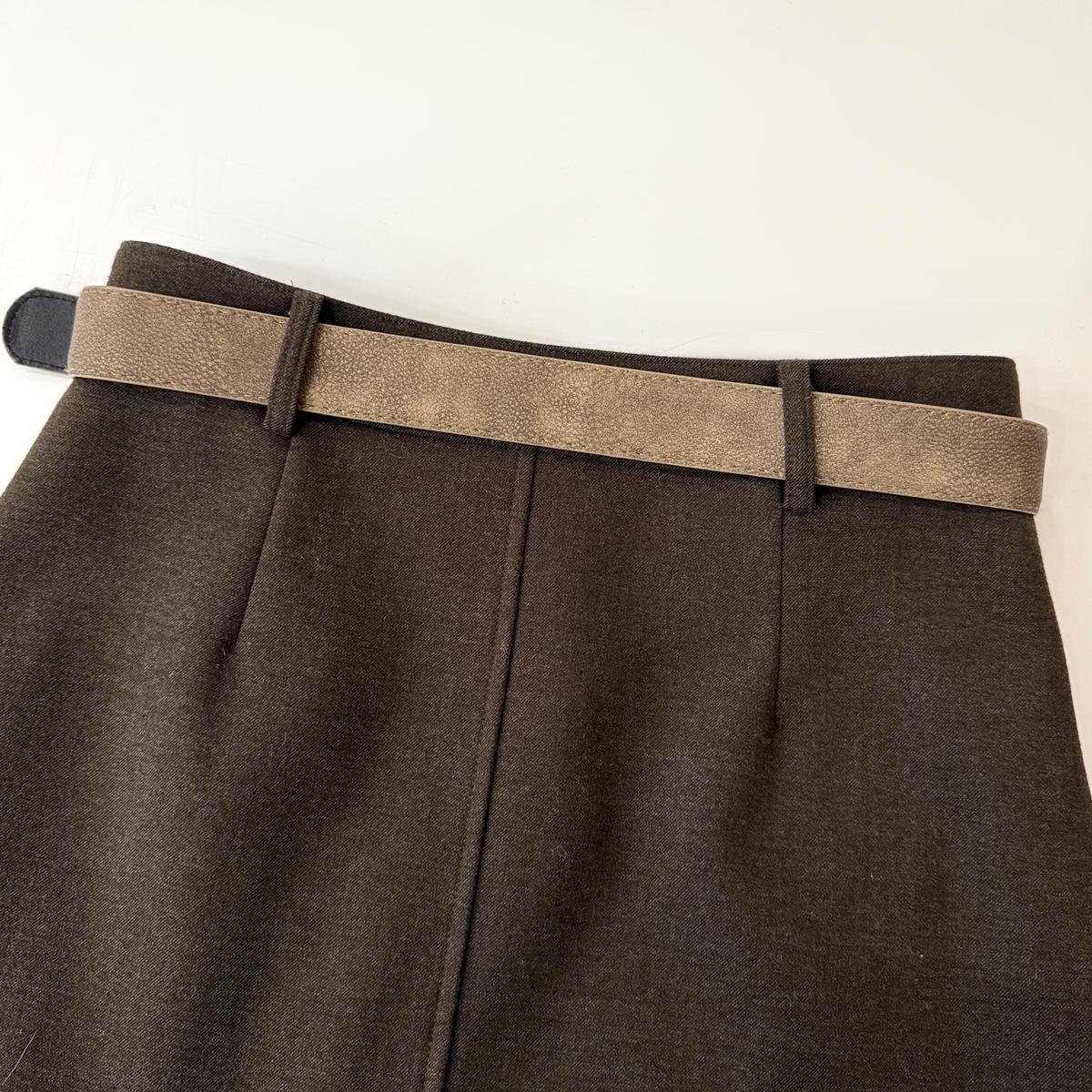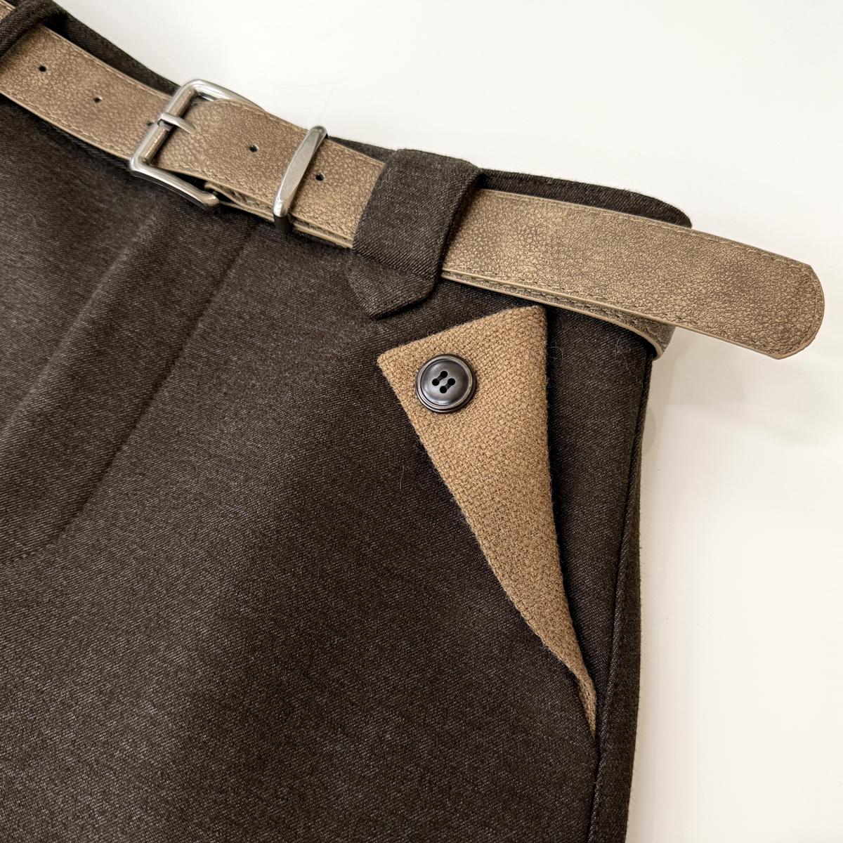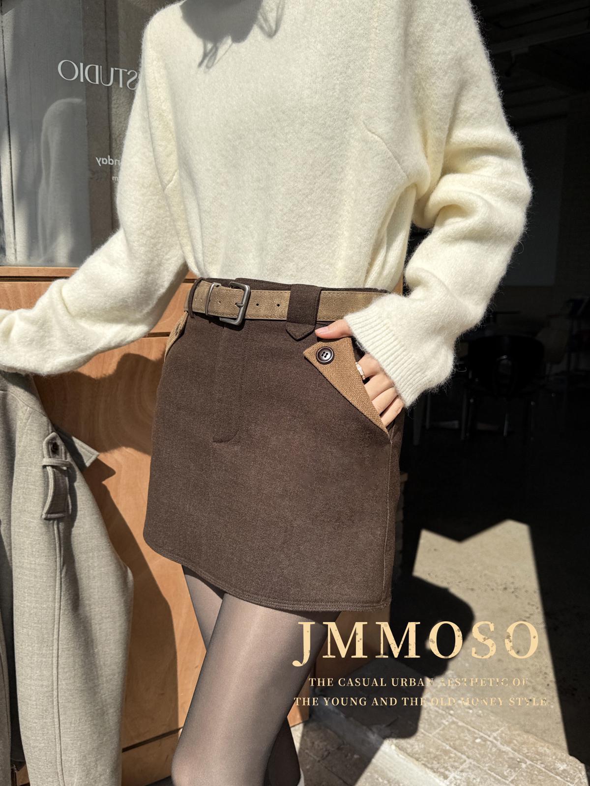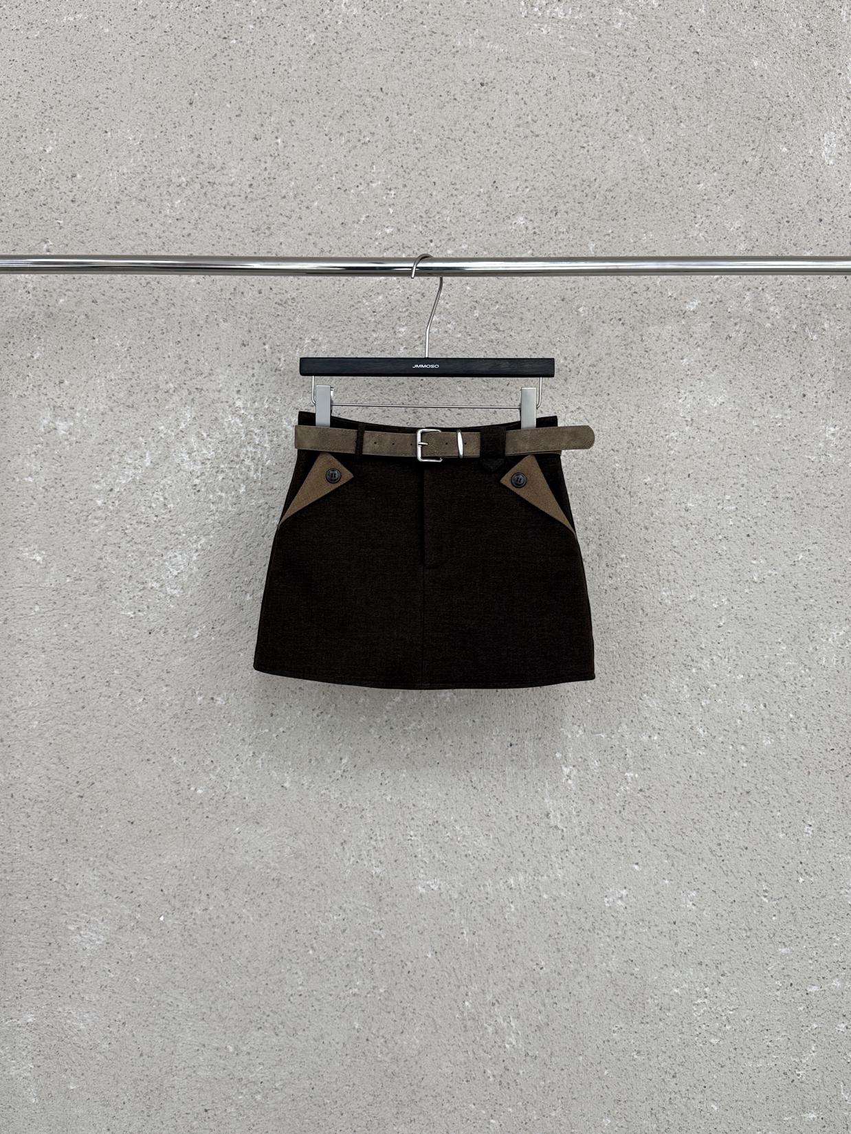 【C7817】時髦博主韓版復古高腰撞色口袋防靜電陽離子呢料A字短裙半身裙(配腰帶)(磨毛加絨內裏)