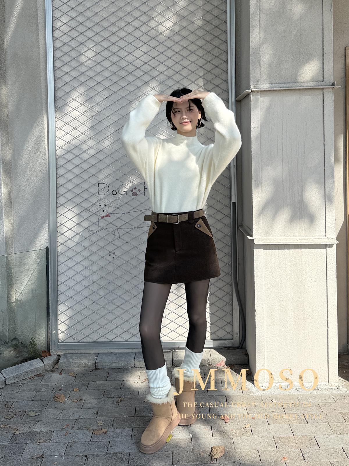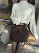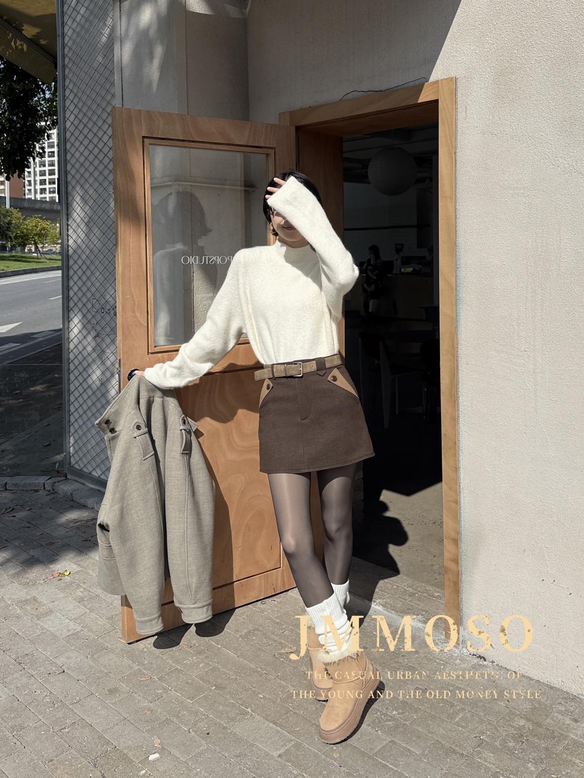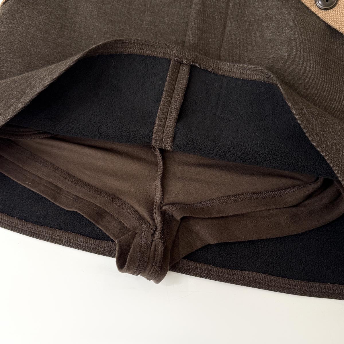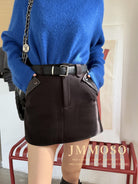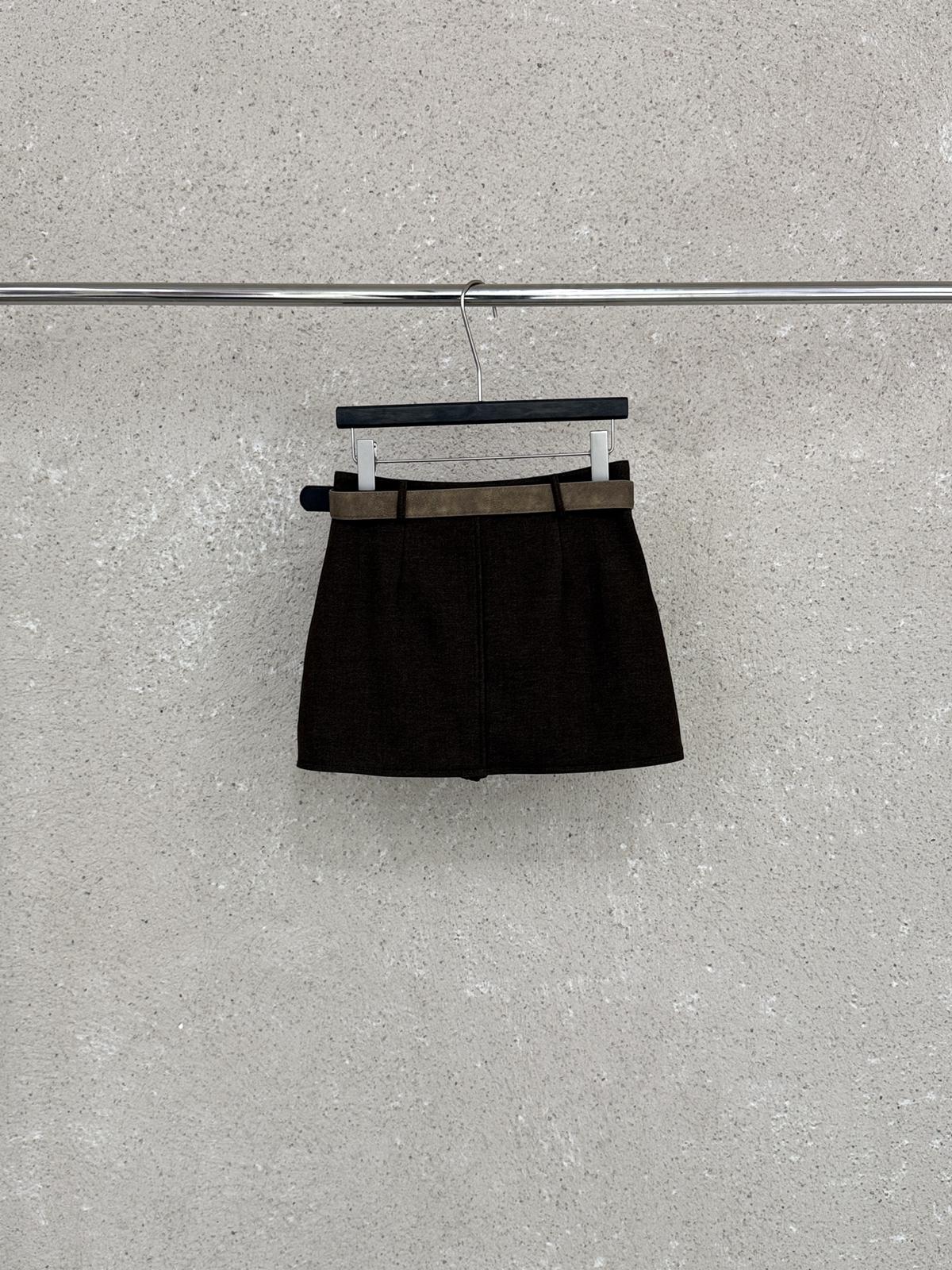 【C7817】時髦博主韓版復古高腰撞色口袋防靜電陽離子呢料A字短裙半身裙(配腰帶)(磨毛加絨內裏)