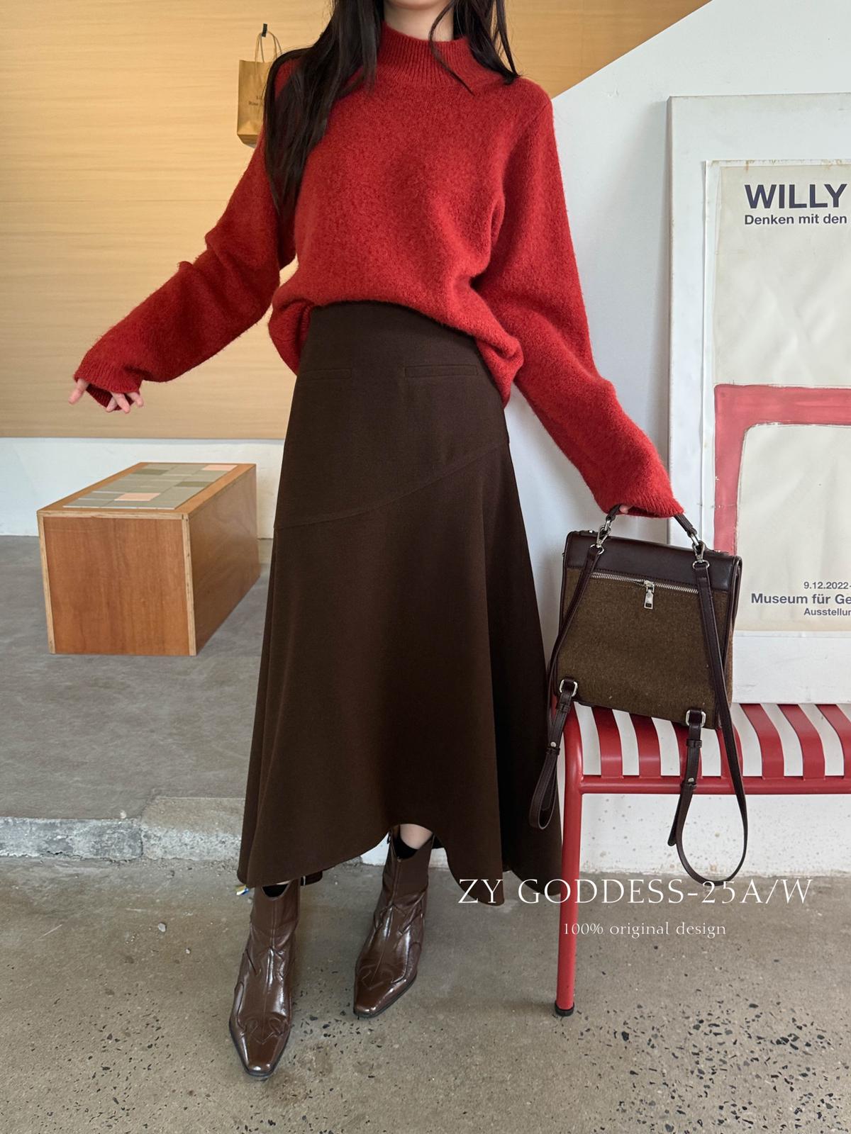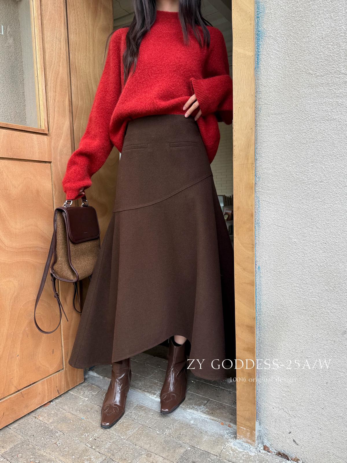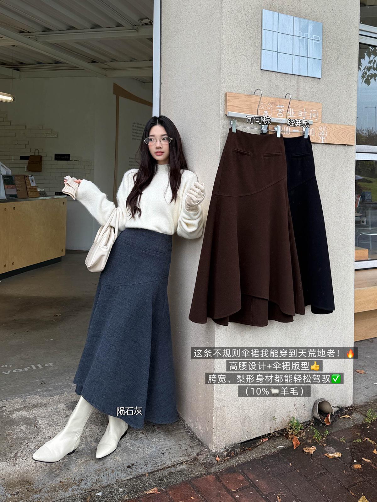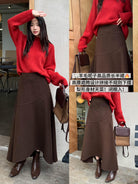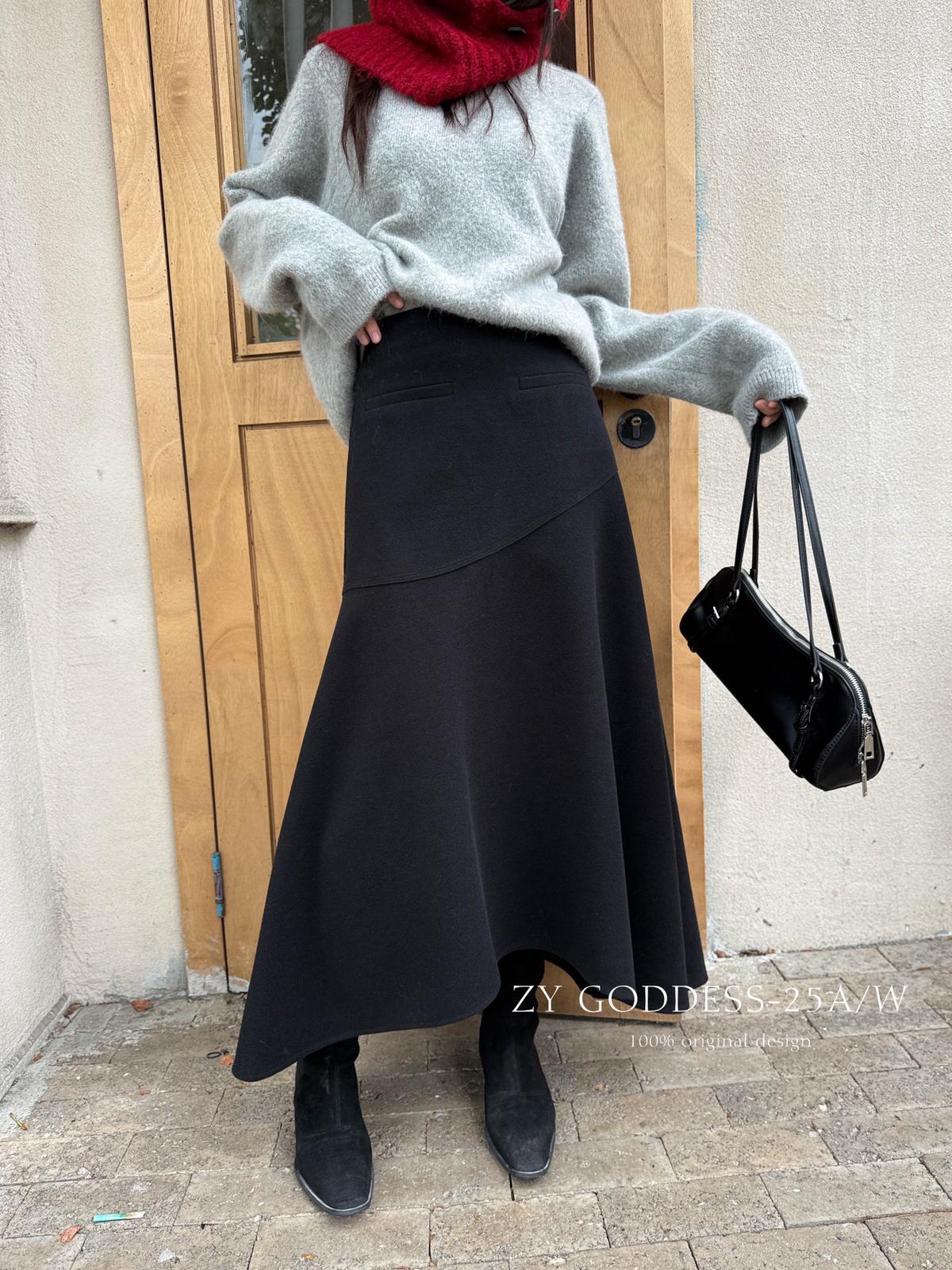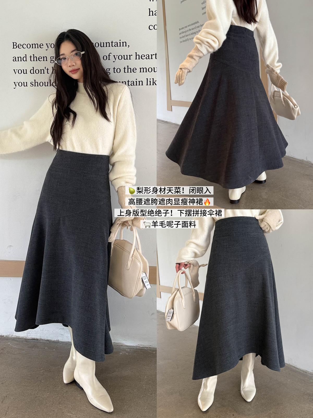 【C7818】韓版復古簡約優雅羊毛保暖高腰拼接不規則裙襬長裙半身裙(含10%羊毛)(牛奶絲抓毛加絨內裏)