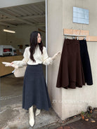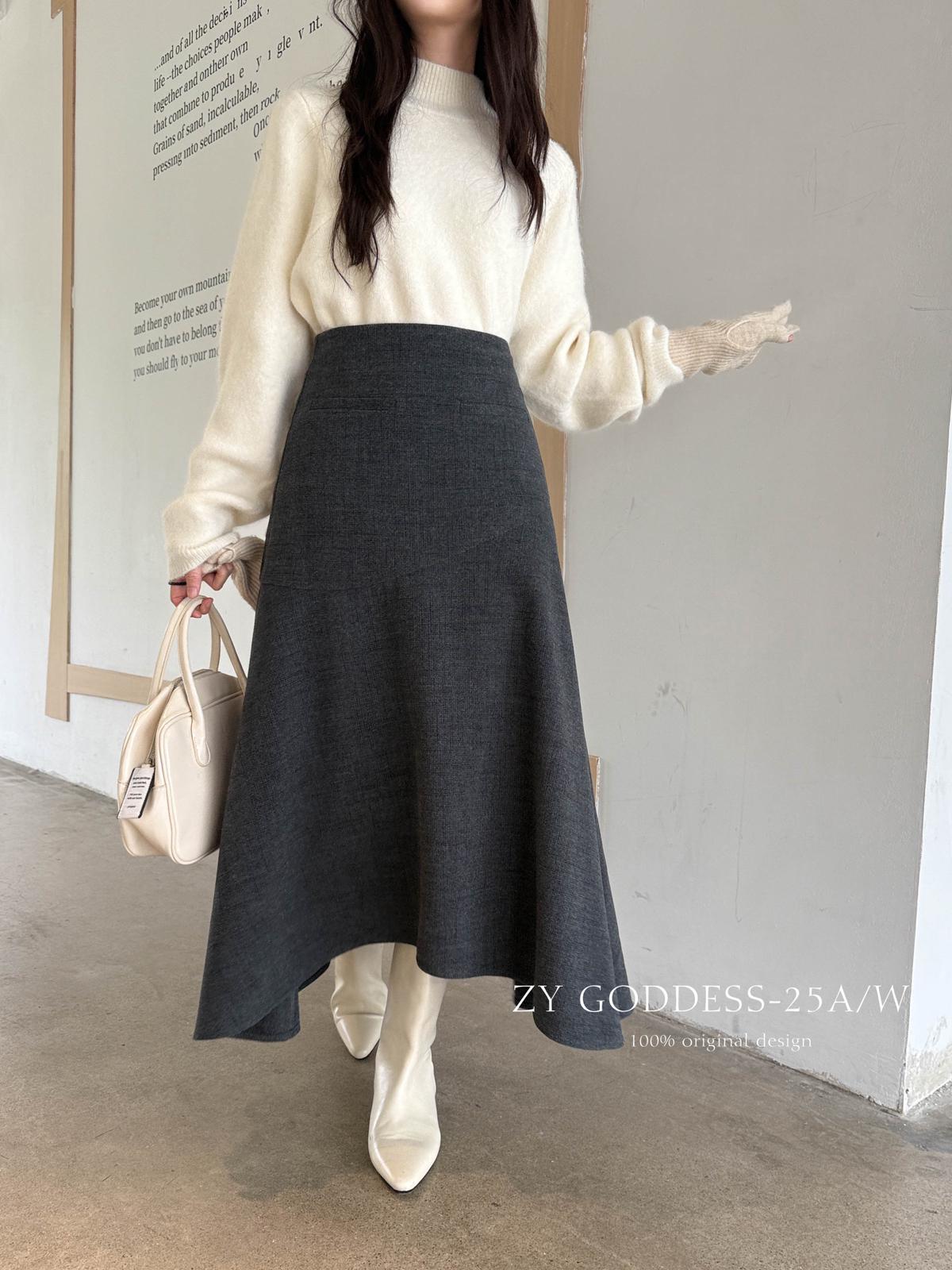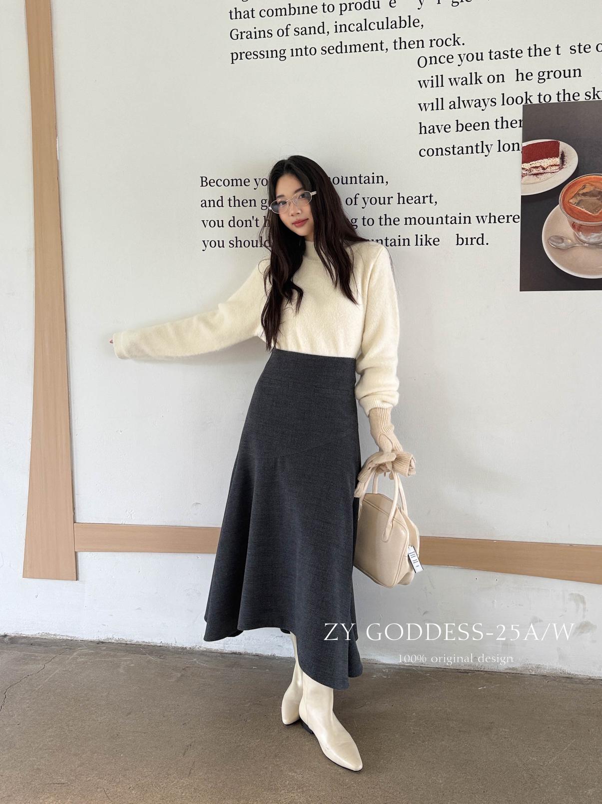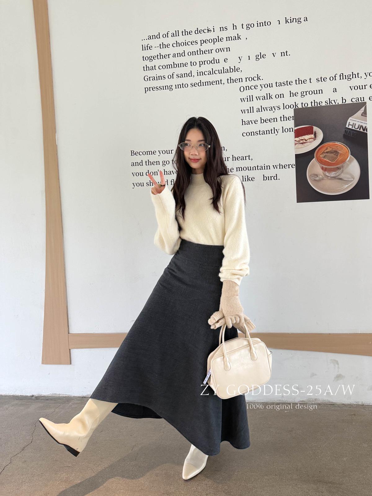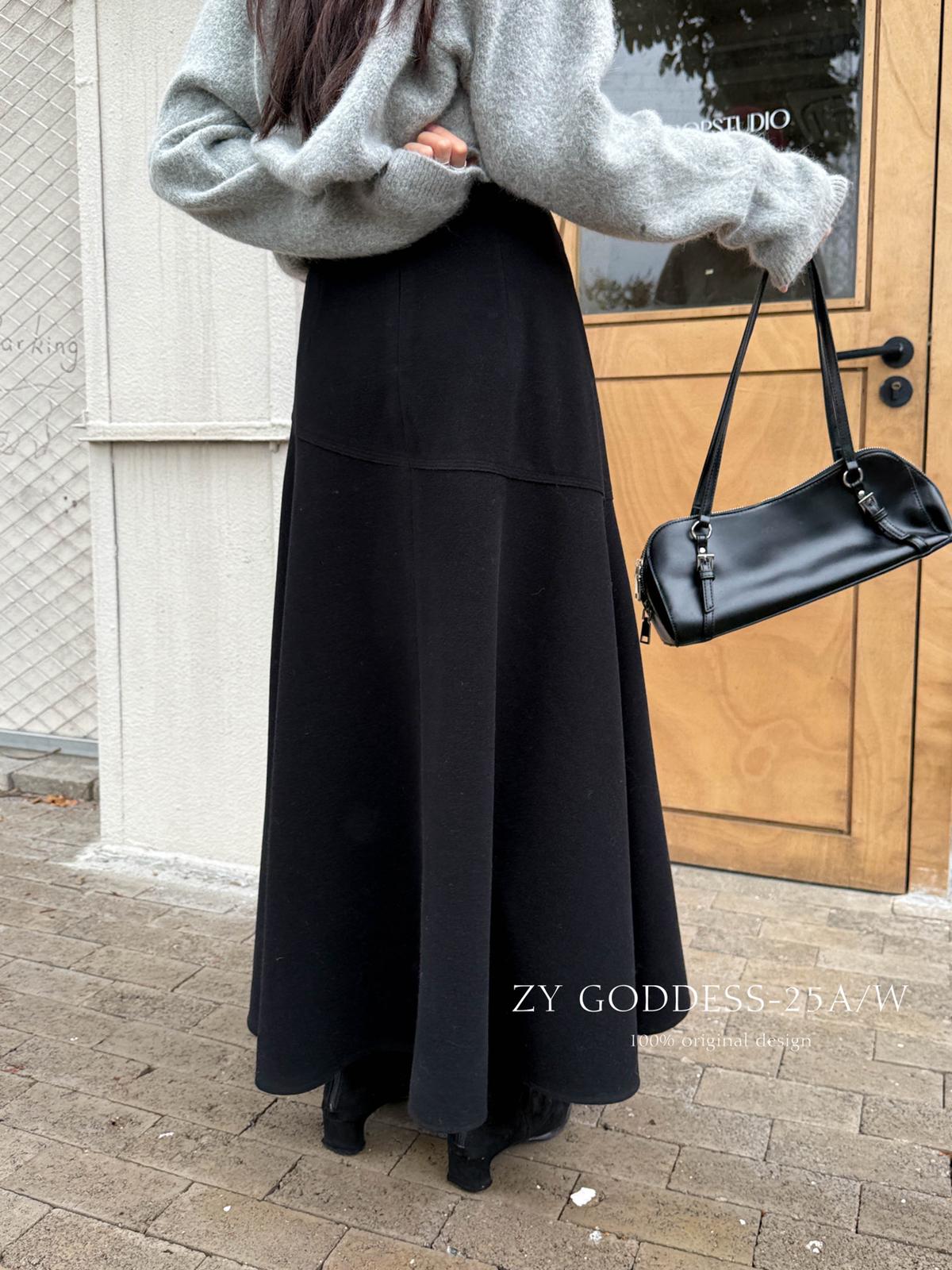 【C7818】韓版復古簡約優雅羊毛保暖高腰拼接不規則裙襬長裙半身裙(含10%羊毛)(牛奶絲抓毛加絨內裏)
