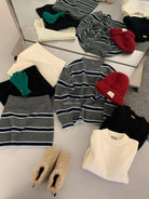 【C7829】慵懶假日韓標條紋純色軟糯寬鬆套頭毛衣+修身顯腿長包臀短裙套裝