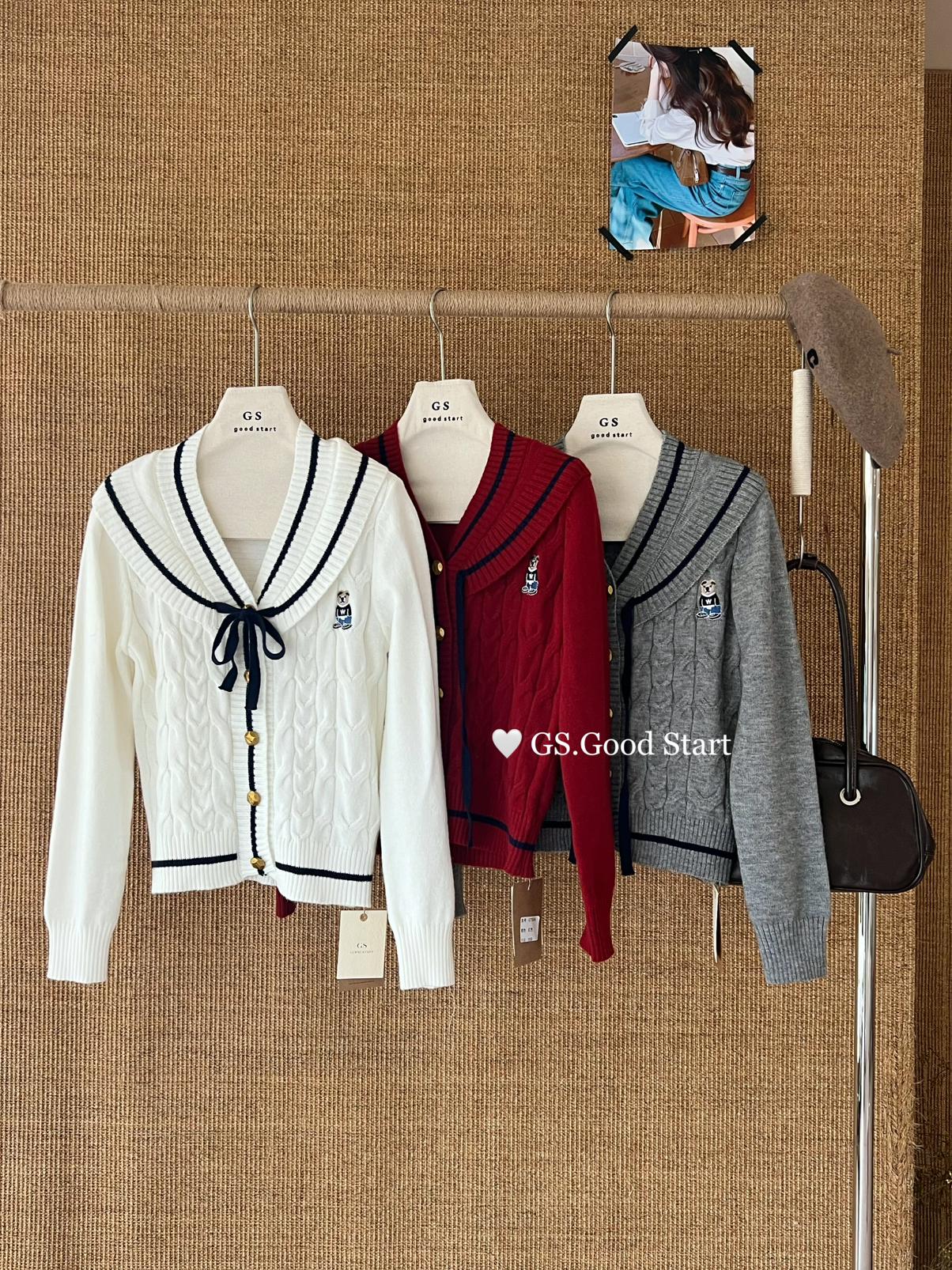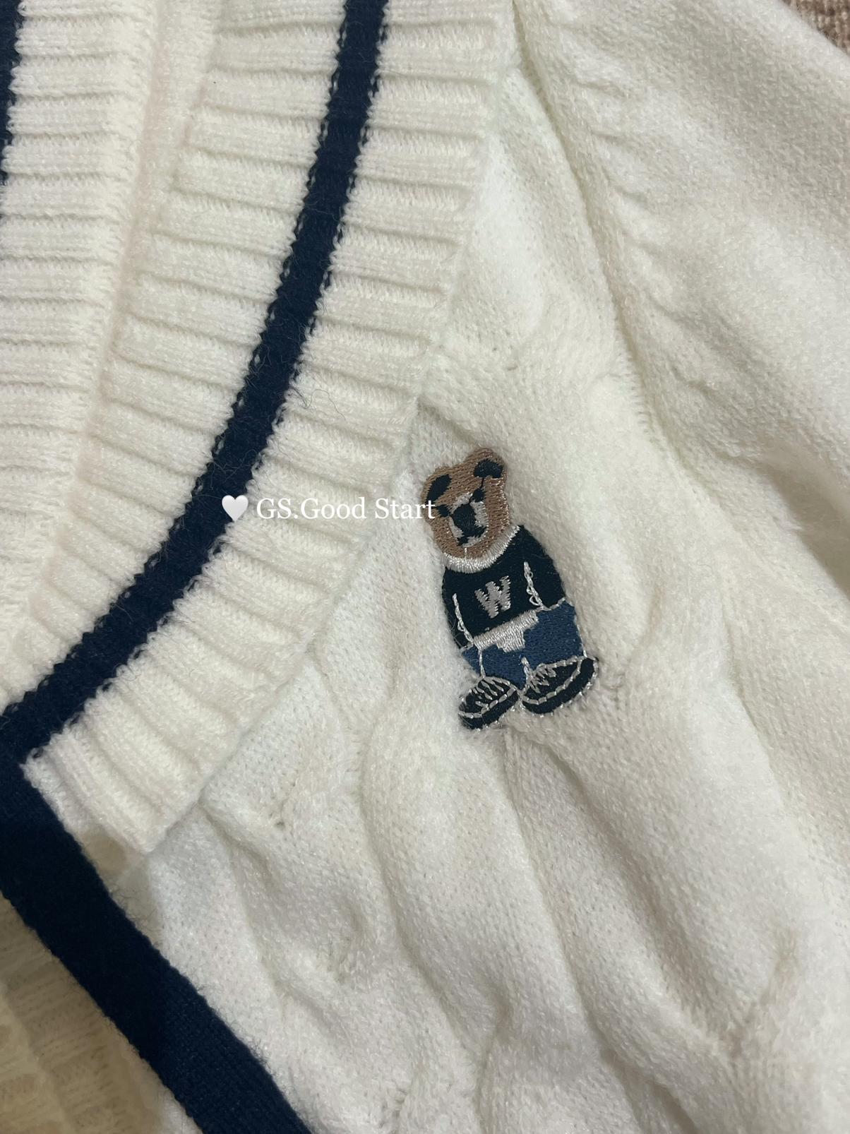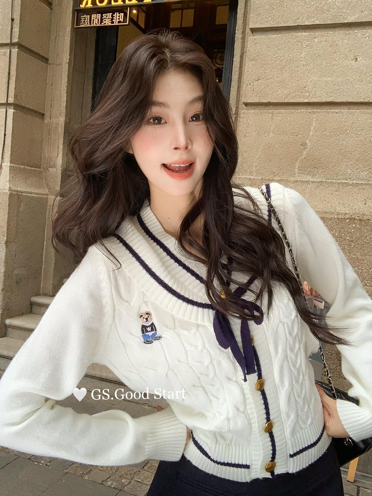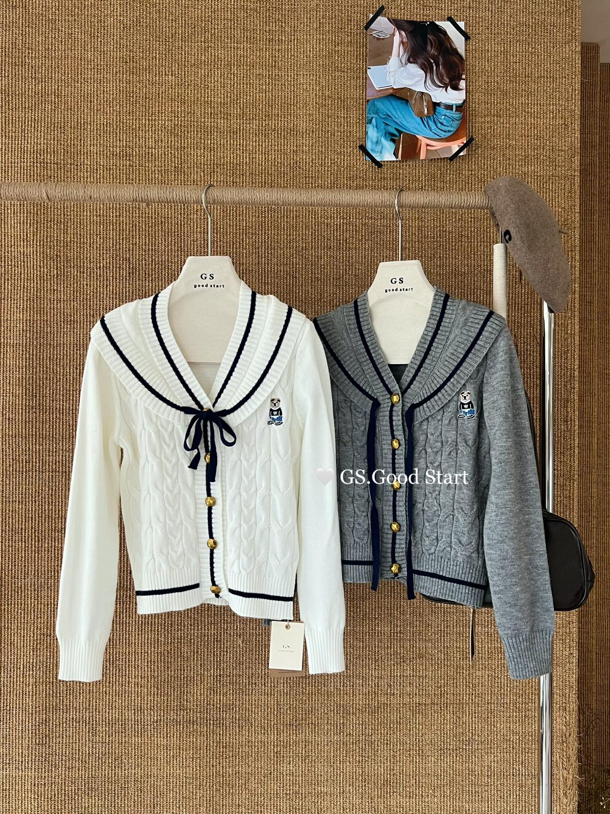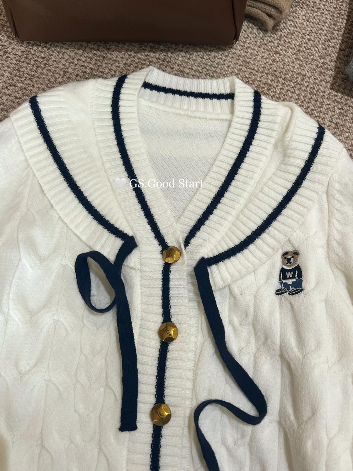 【C7834】減齡首選!上身就是*英倫院校學妹~秋冬復古甜美少女感小熊刺繡針織開衫