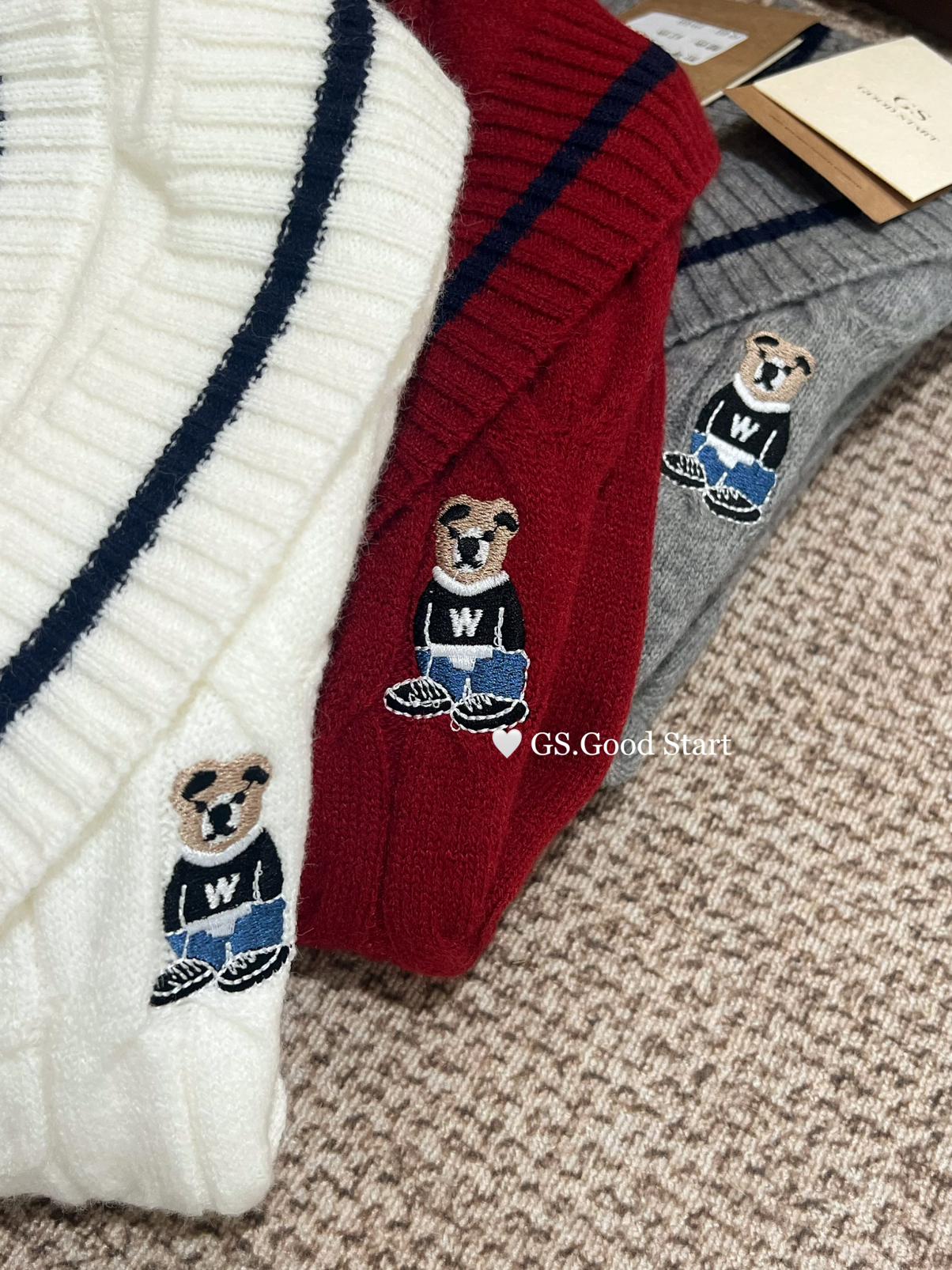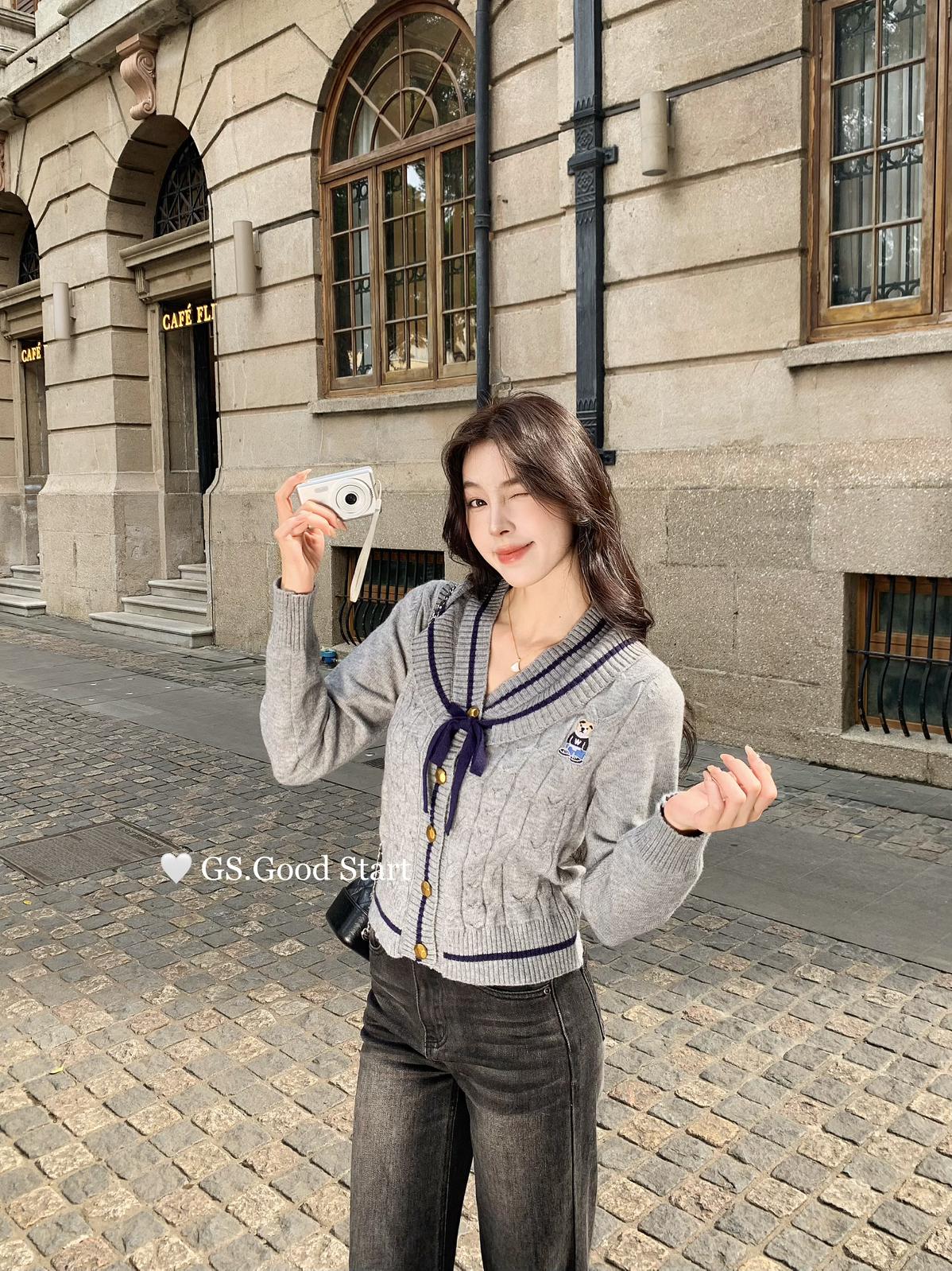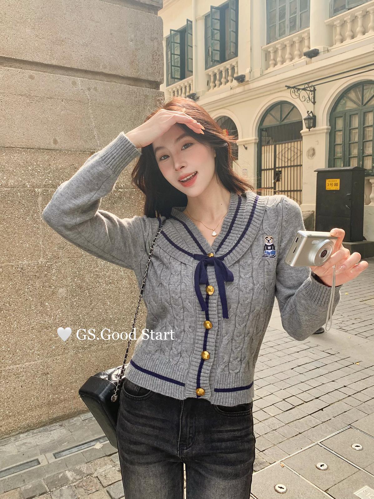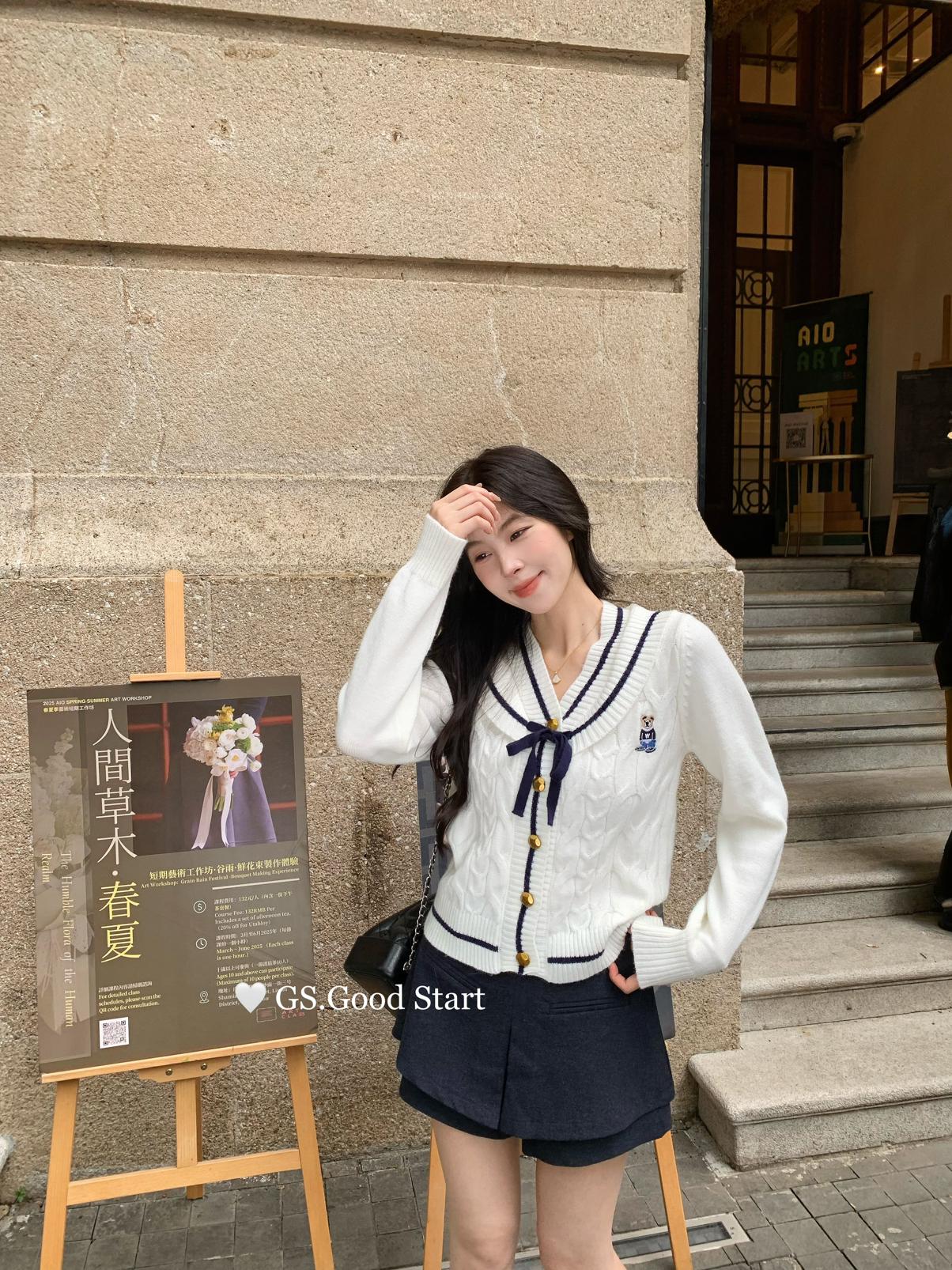 【C7834】減齡首選!上身就是*英倫院校學妹~秋冬復古甜美少女感小熊刺繡針織開衫