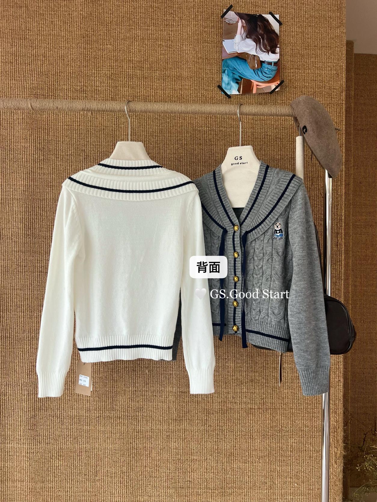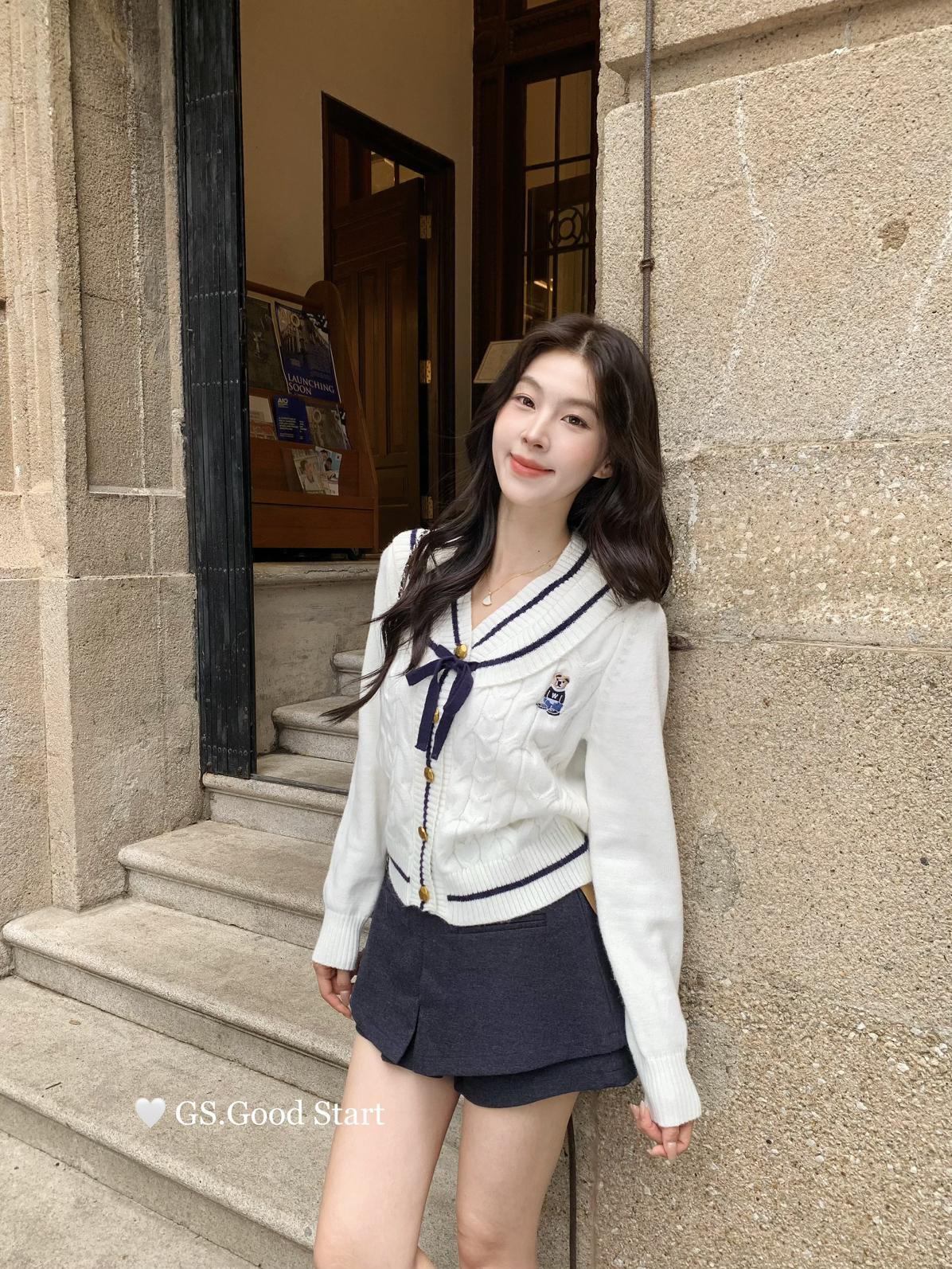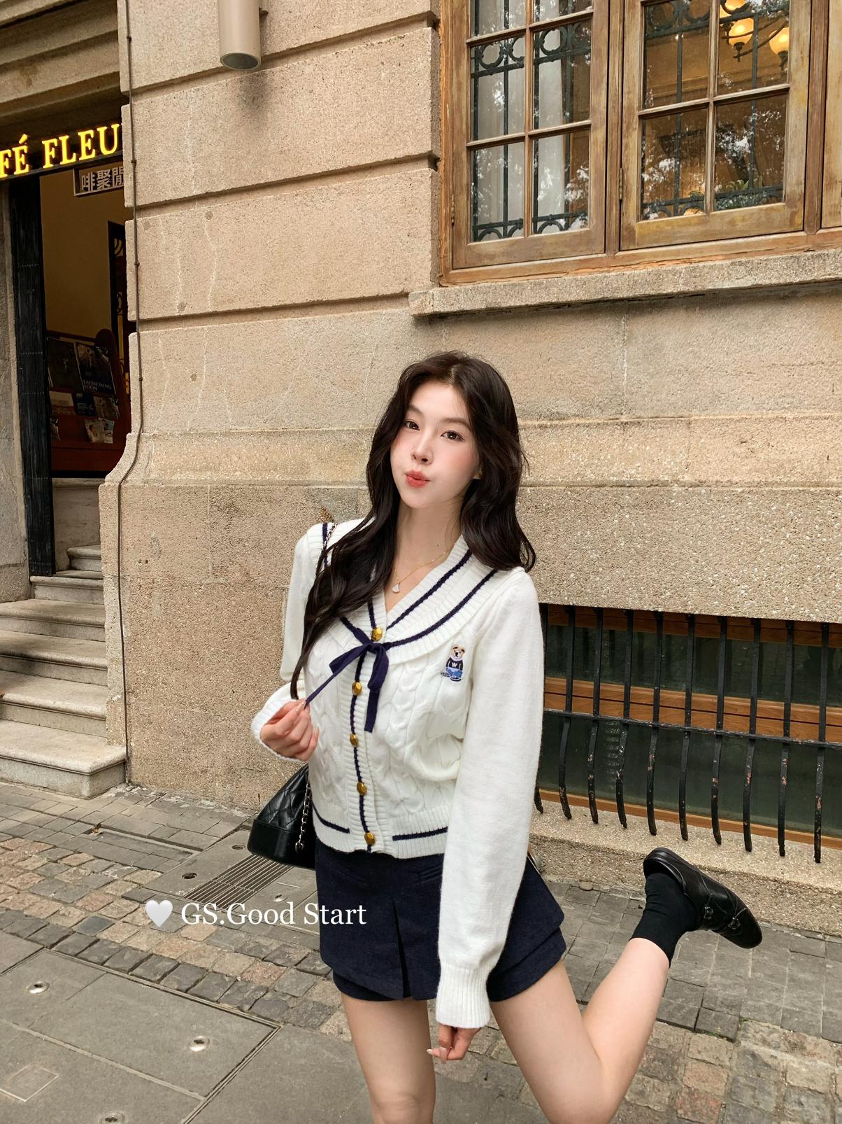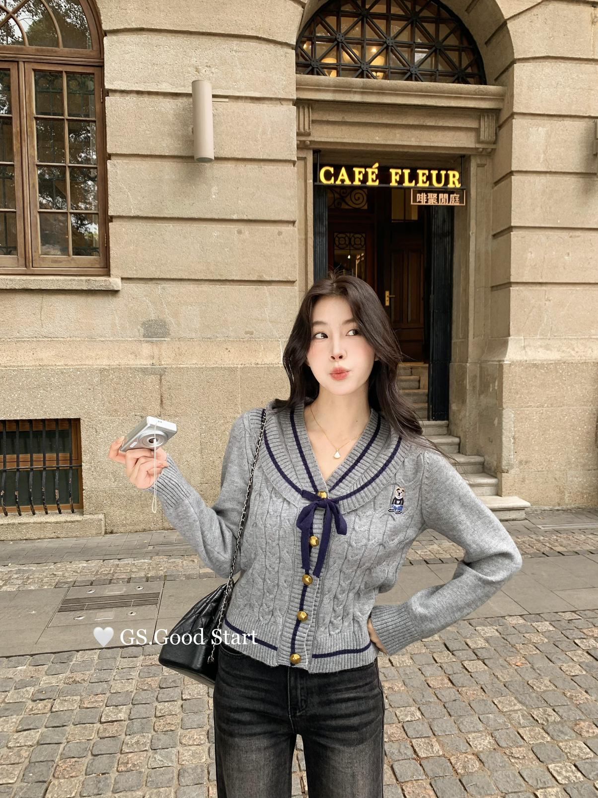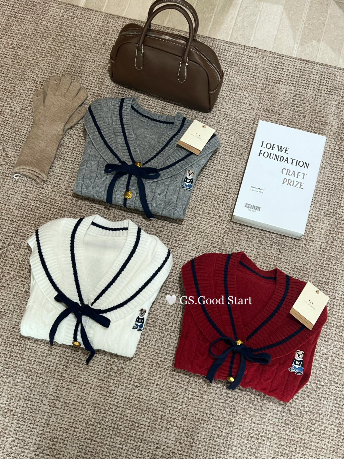【C7834】減齡首選!上身就是*英倫院校學妹~秋冬復古甜美少女感小熊刺繡針織開衫