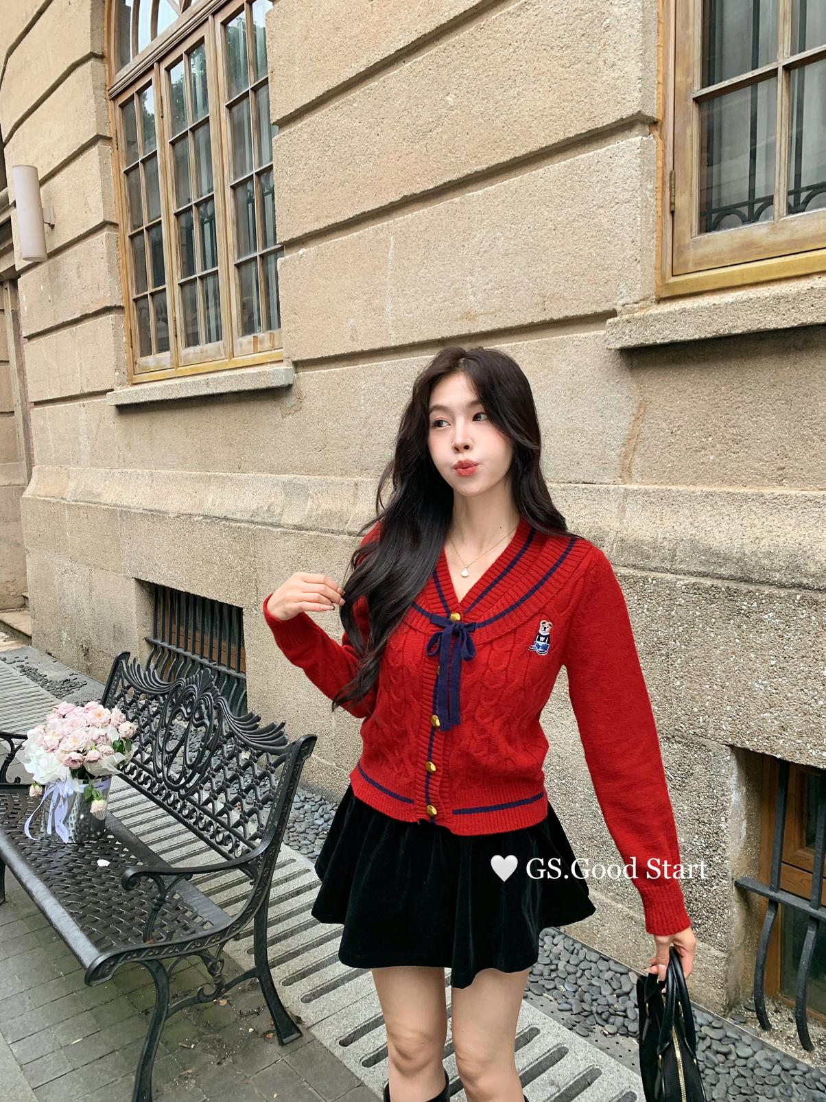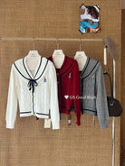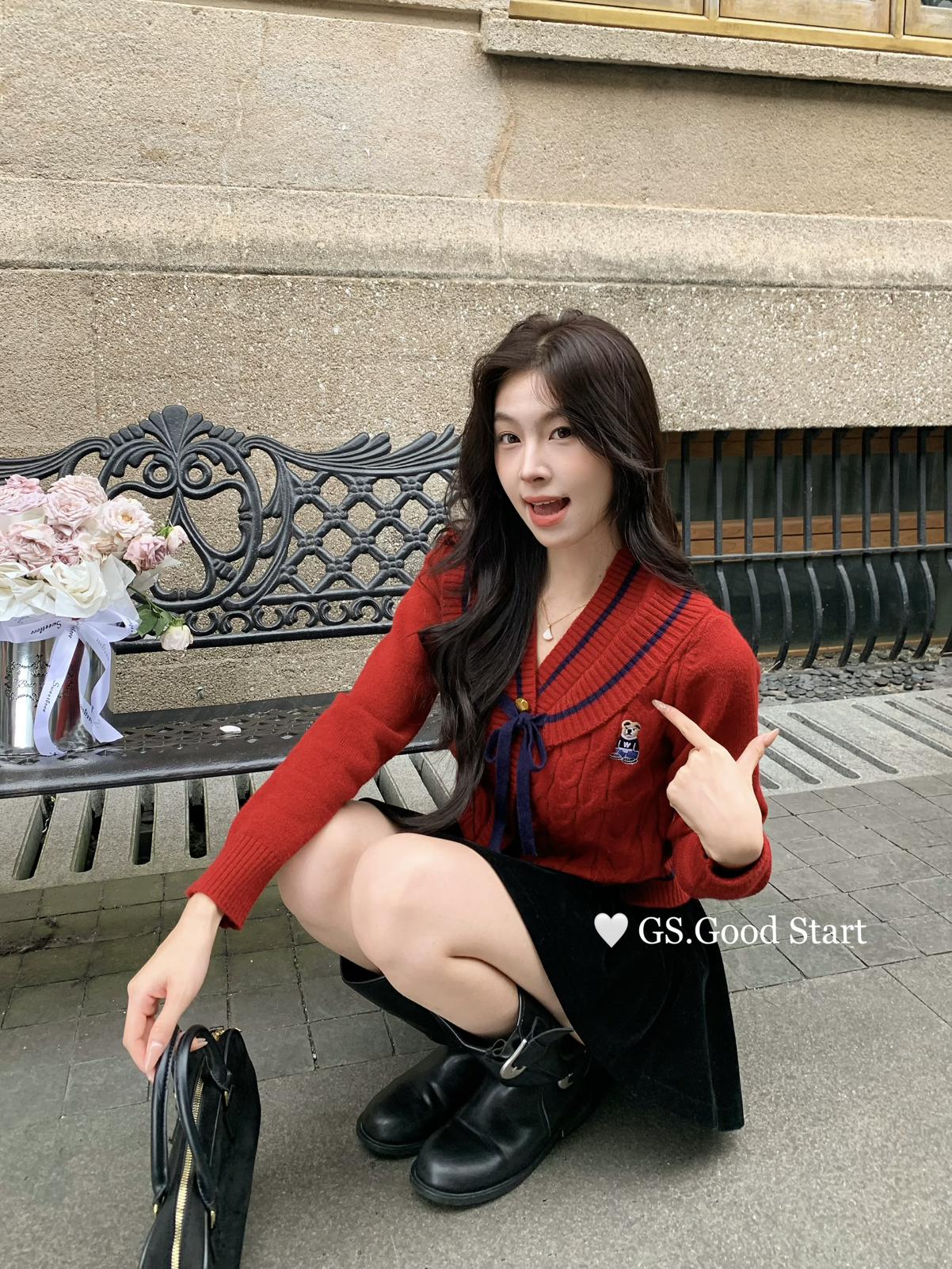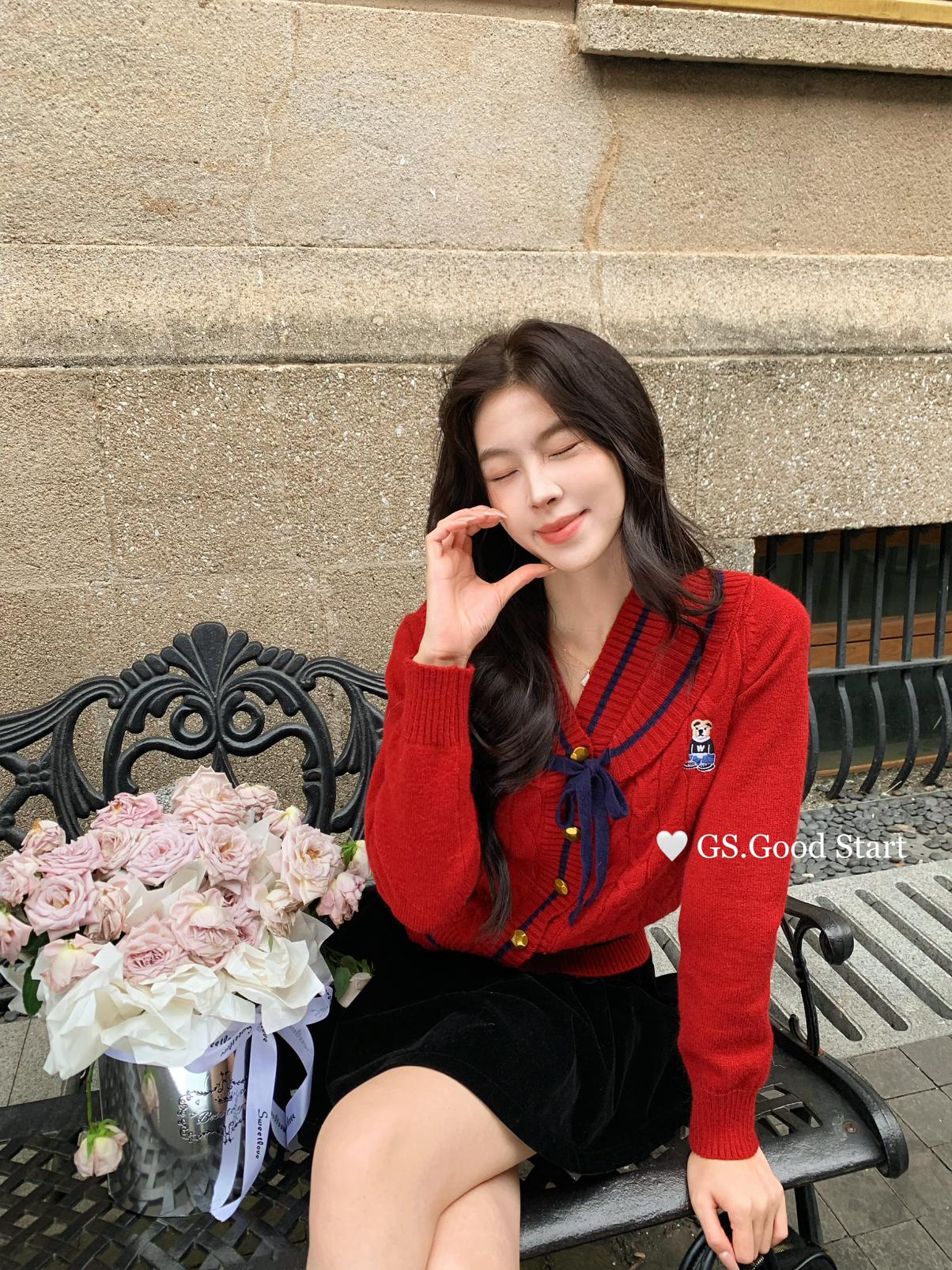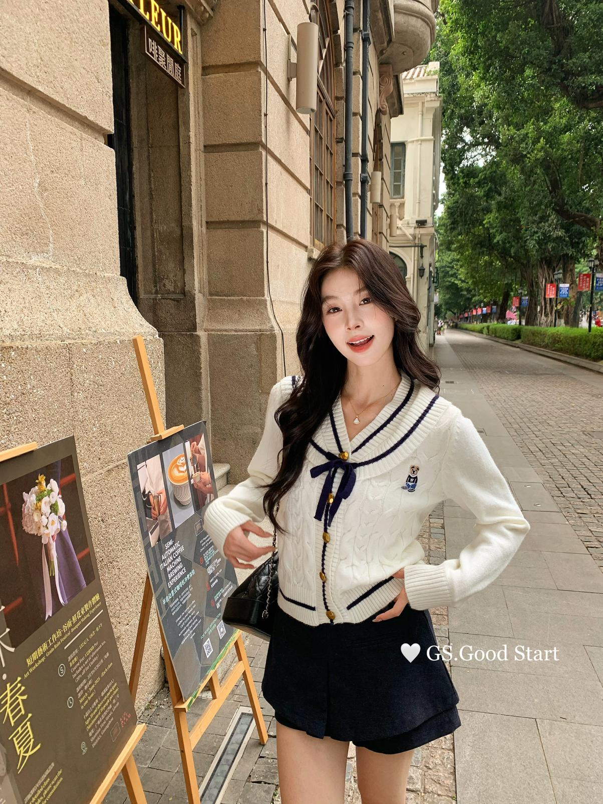 【C7834】減齡首選!上身就是*英倫院校學妹~秋冬復古甜美少女感小熊刺繡針織開衫