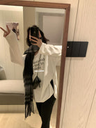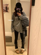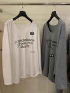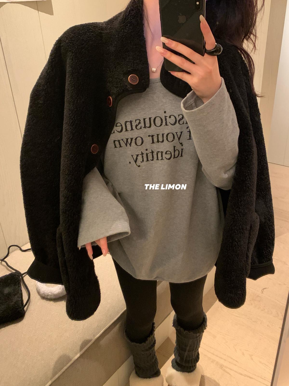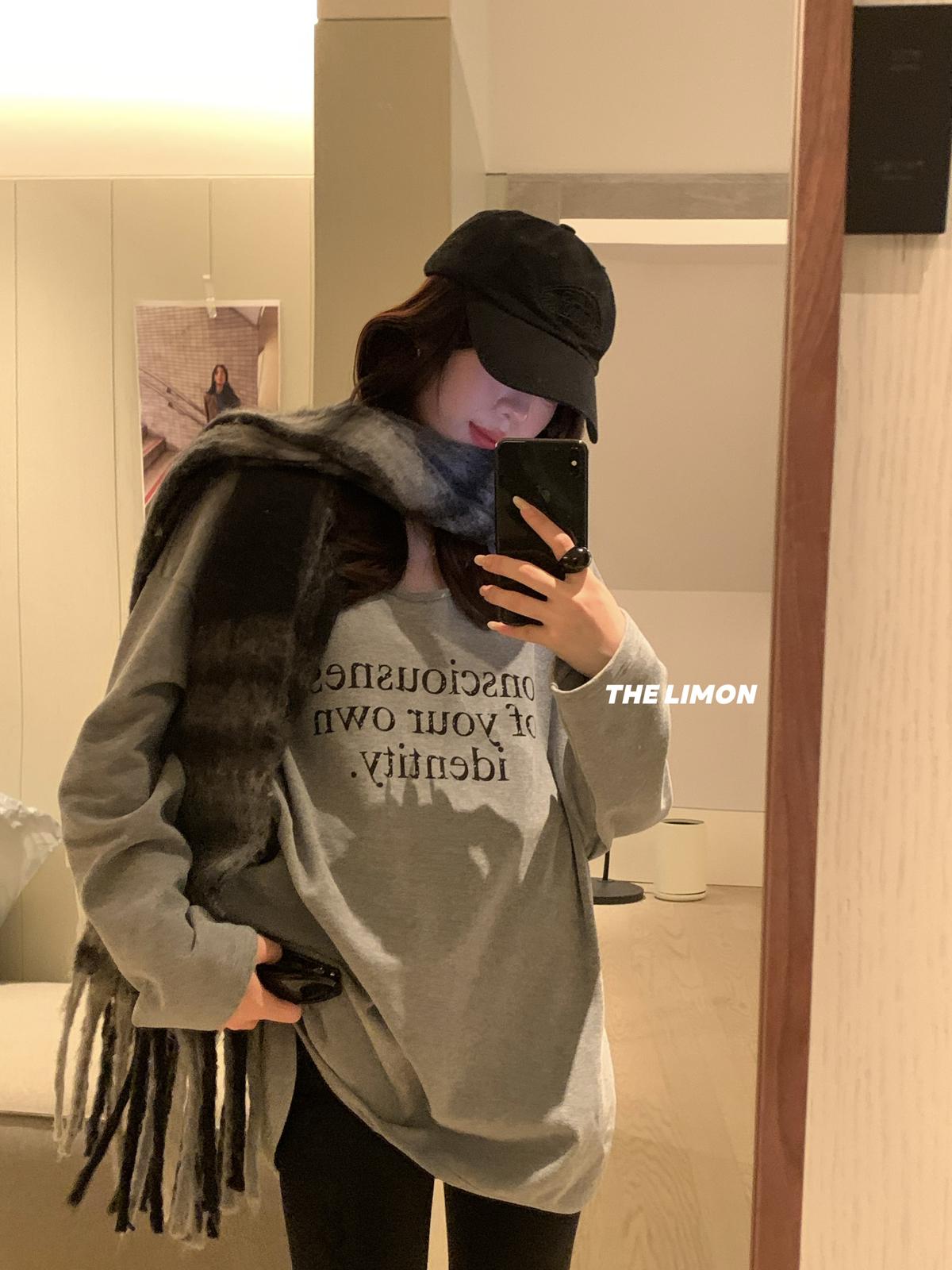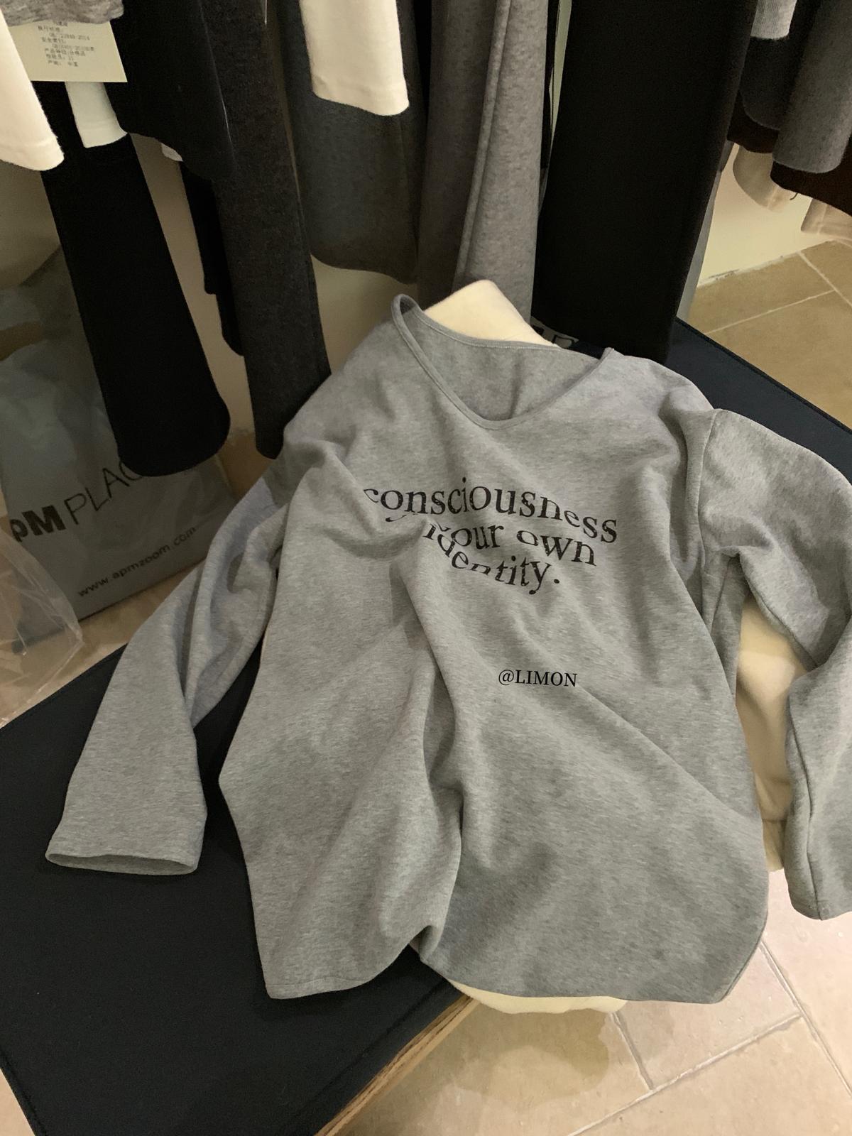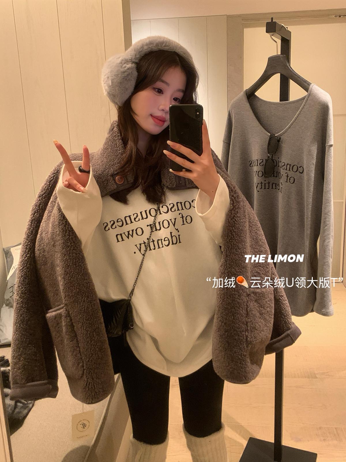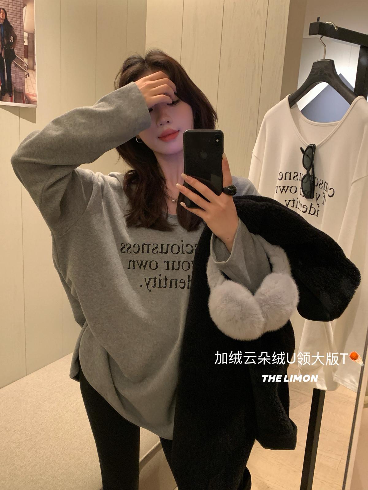 【C7849】慵懶棉感寬鬆字母雲朵絨U領長袖T恤