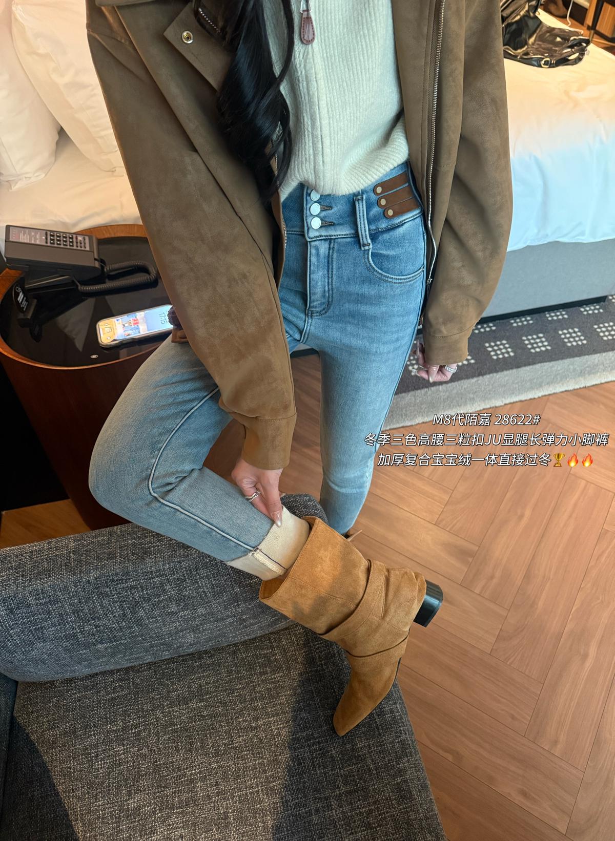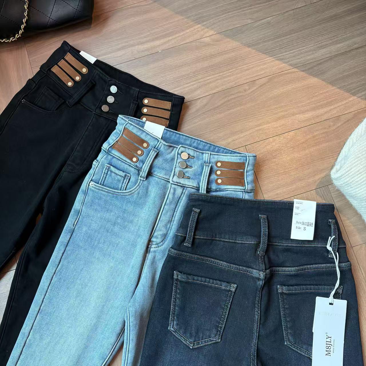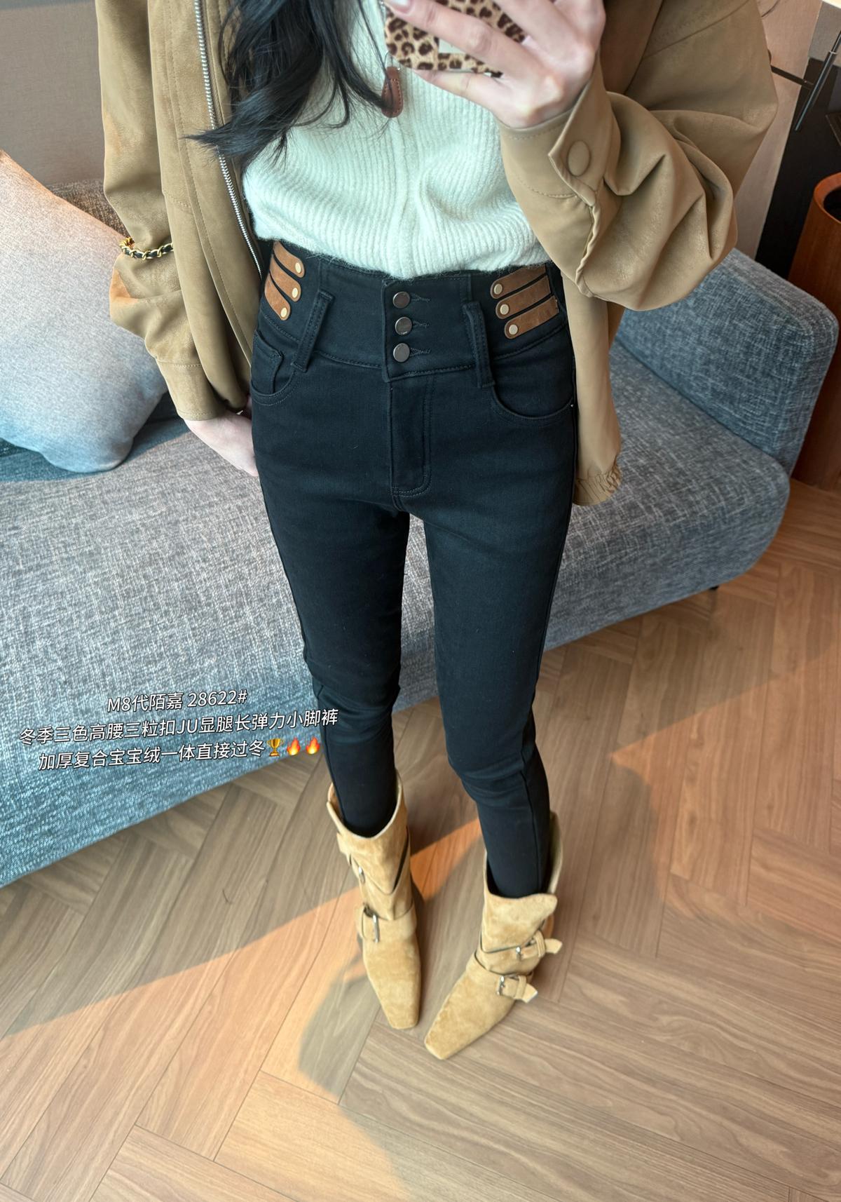 【C7855】冬季加厚複合寶寶絨高腰三粒扣修身顯腿長女神必備彈力小腳褲牛仔褲
