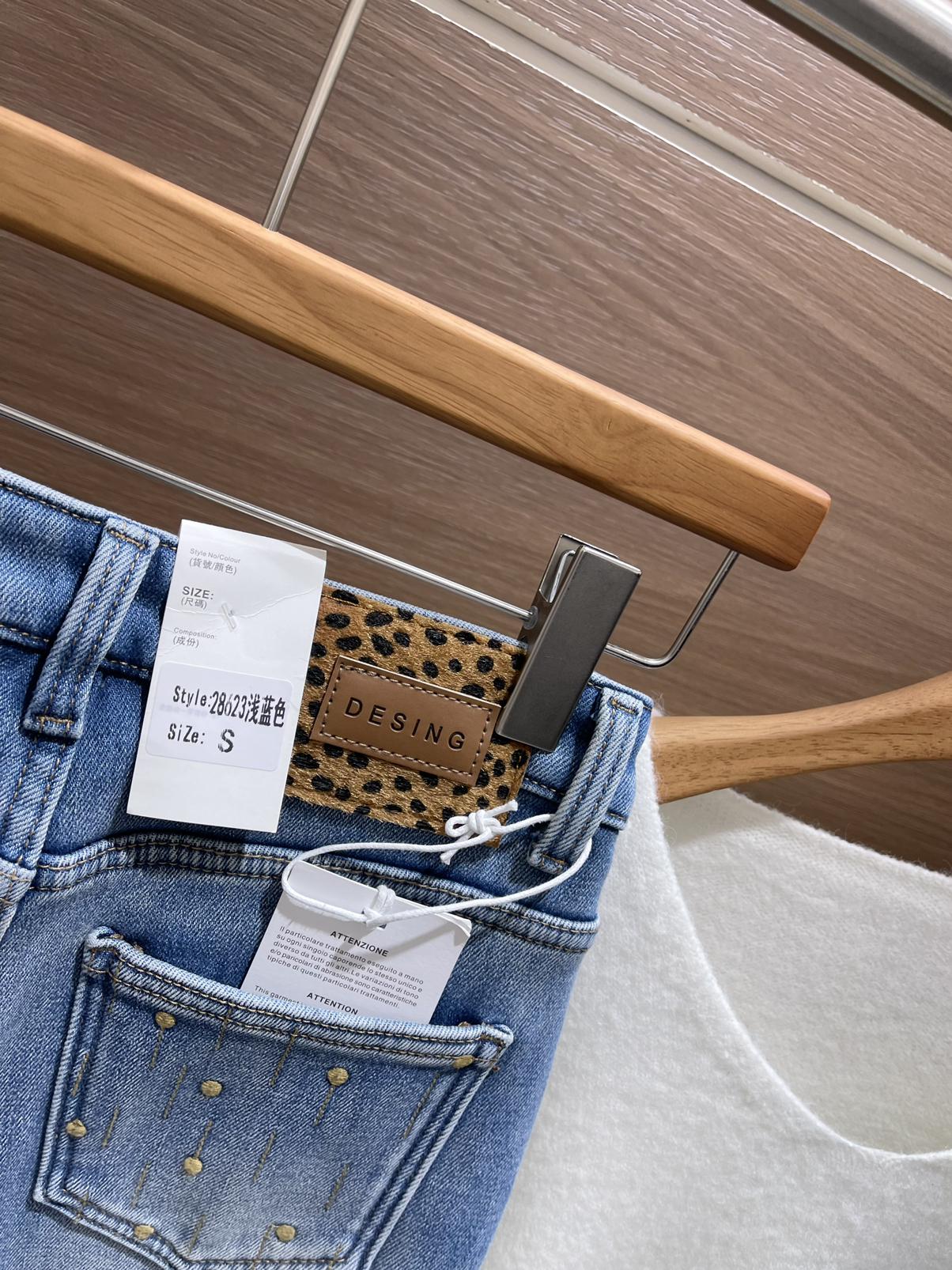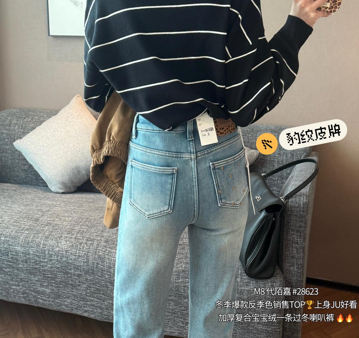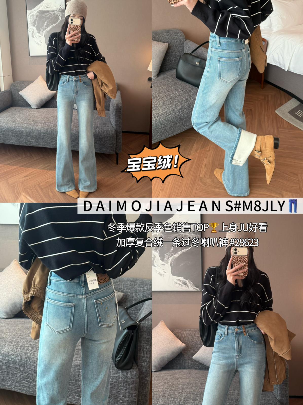 3. 【C7856】冬季加厚複合寶寶絨反季淺藍色前後豹紋皮牌呼應裝飾彈力喇叭褲牛仔褲