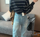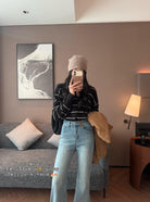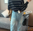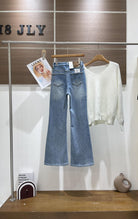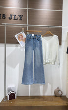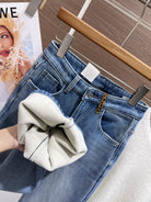 【C7856】冬季加厚複合寶寶絨反季淺藍色前後豹紋皮牌呼應裝飾彈力喇叭褲牛仔褲