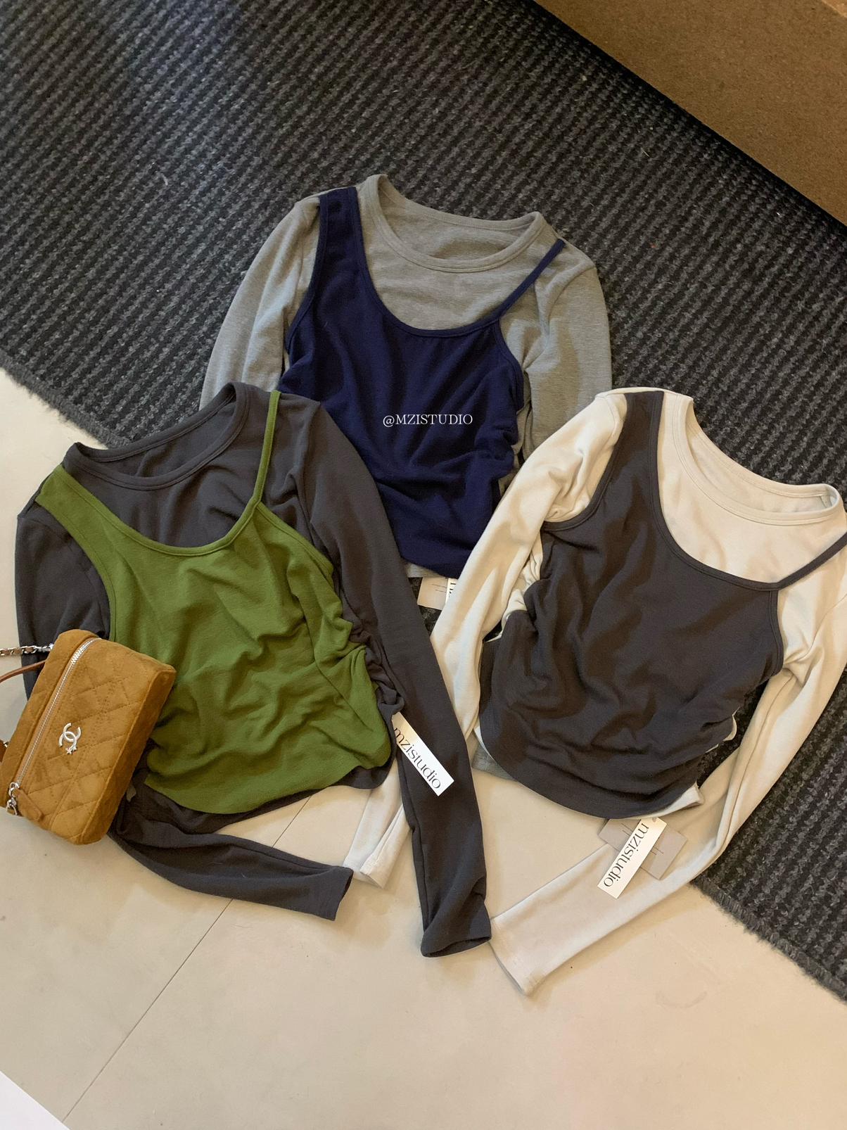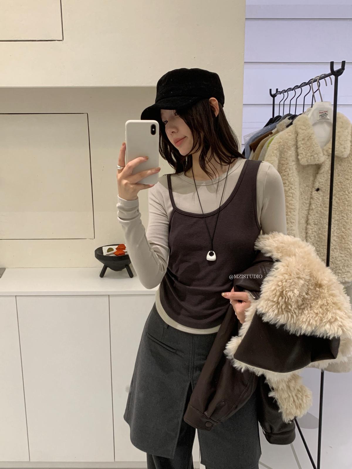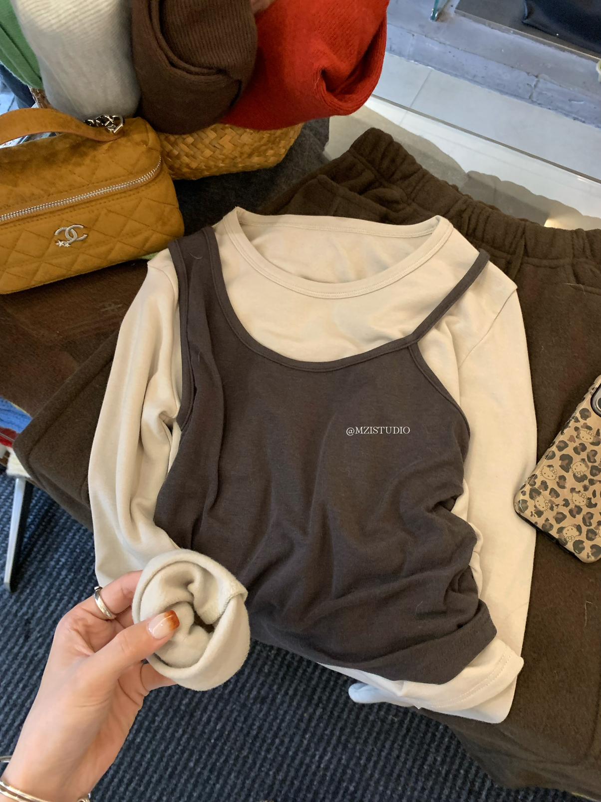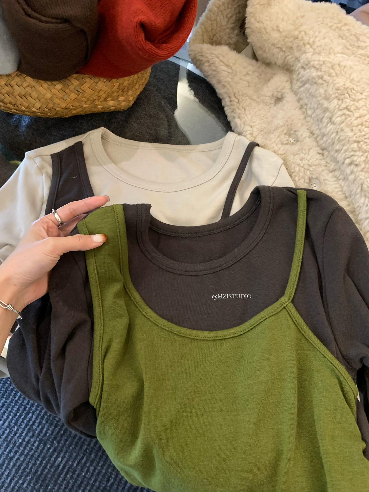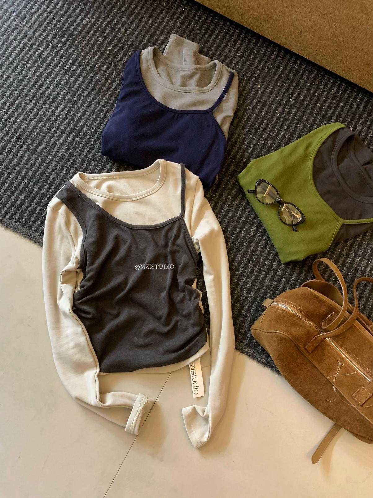 【C7880】凜冬時信韓感滿滿假兩件撞色磨毛收腰修身顯瘦長袖T恤