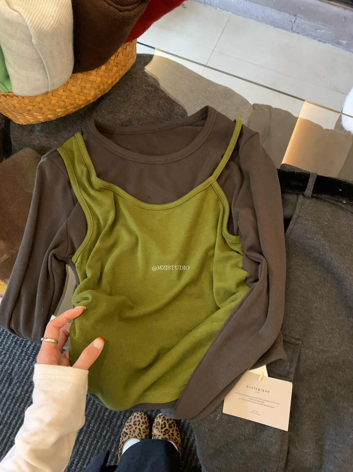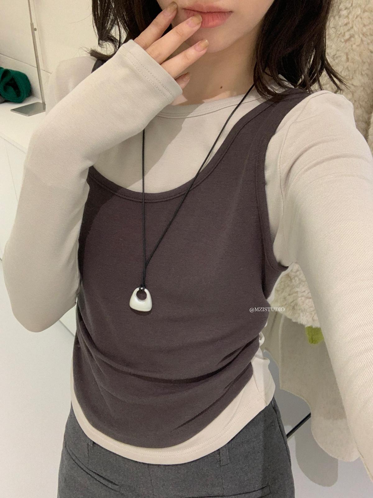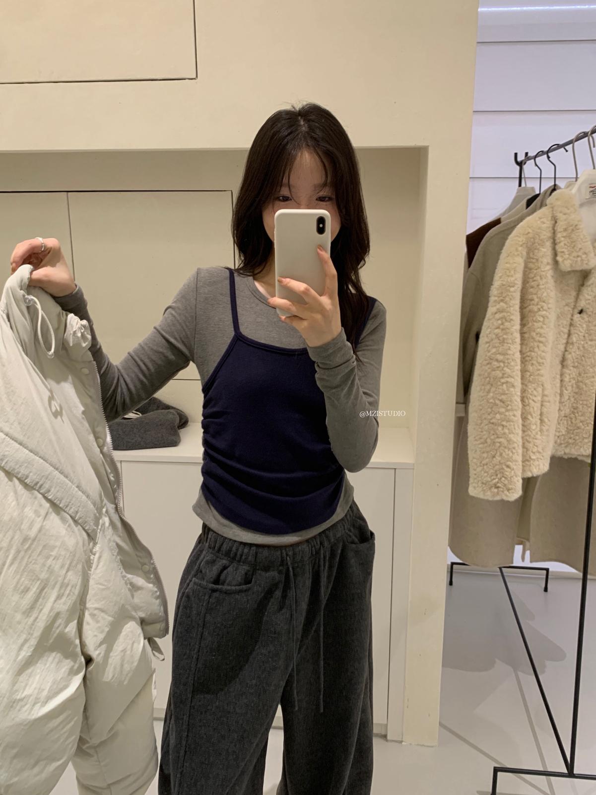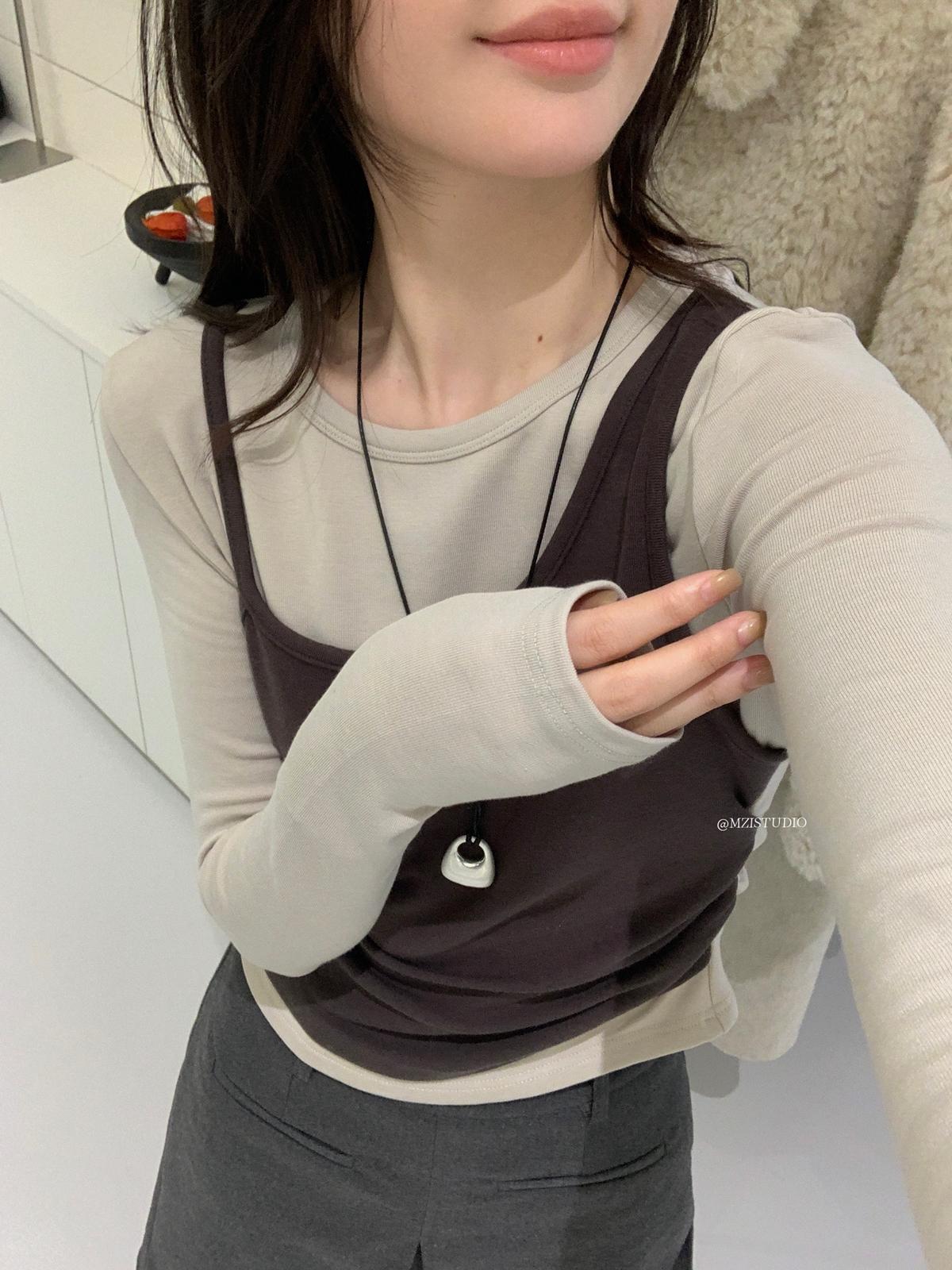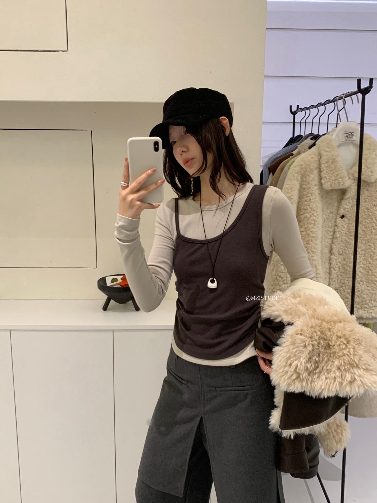 【C7880】凜冬時信韓感滿滿假兩件撞色磨毛收腰修身顯瘦長袖T恤