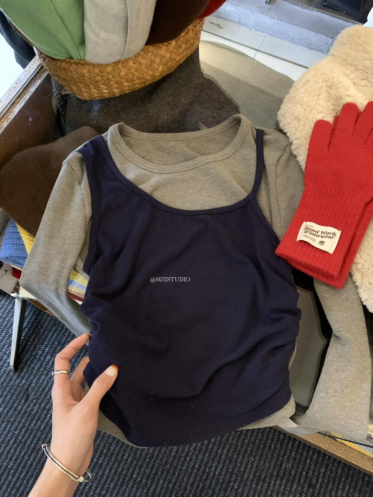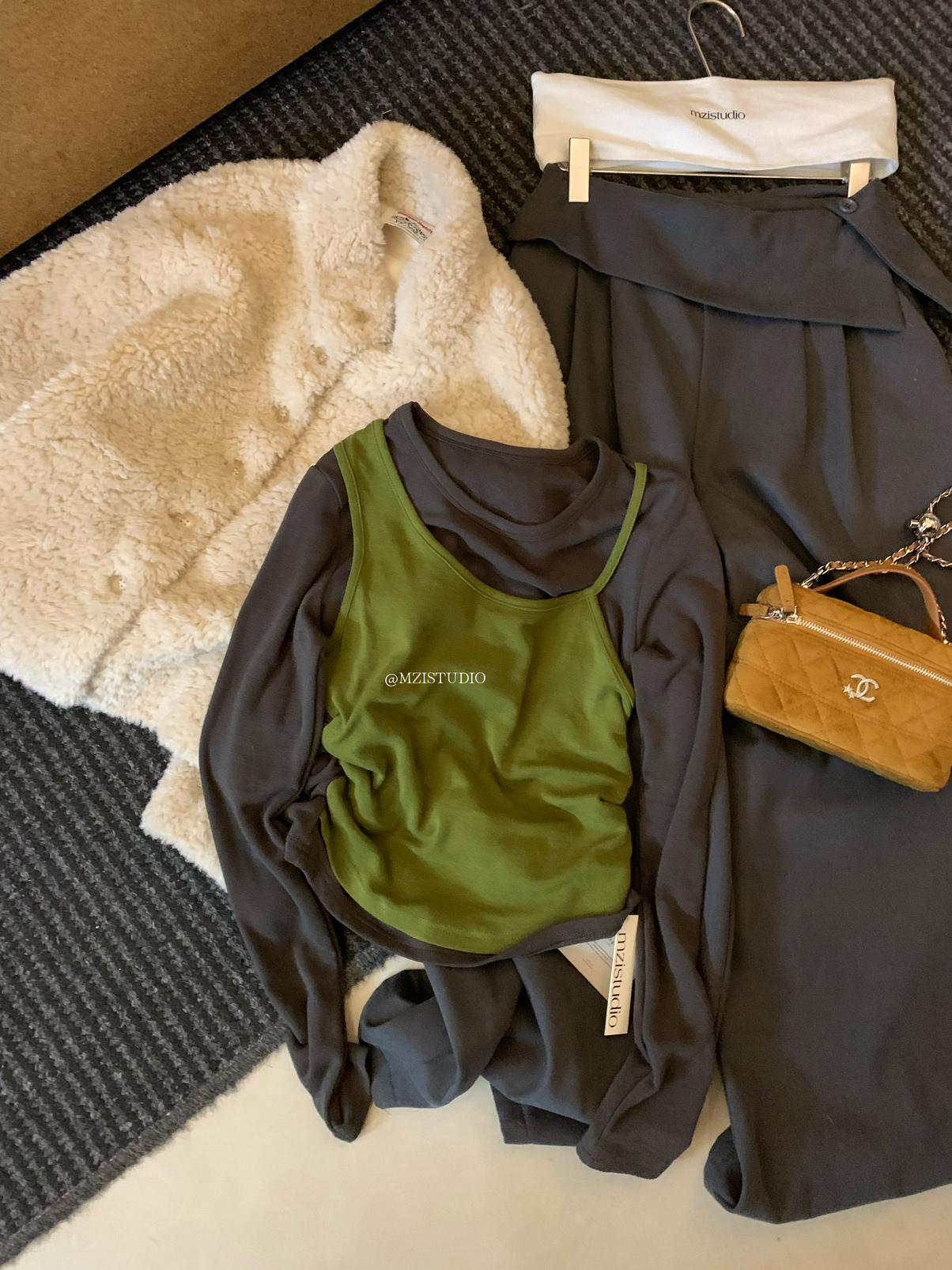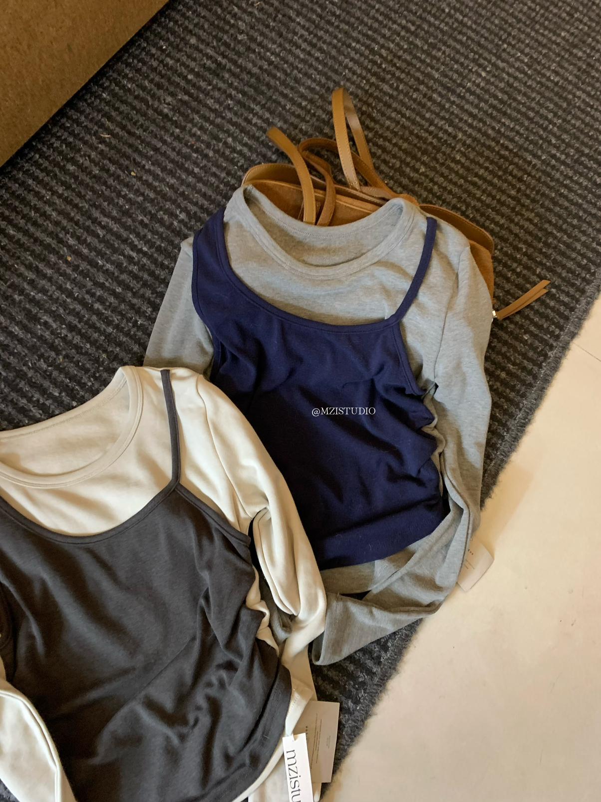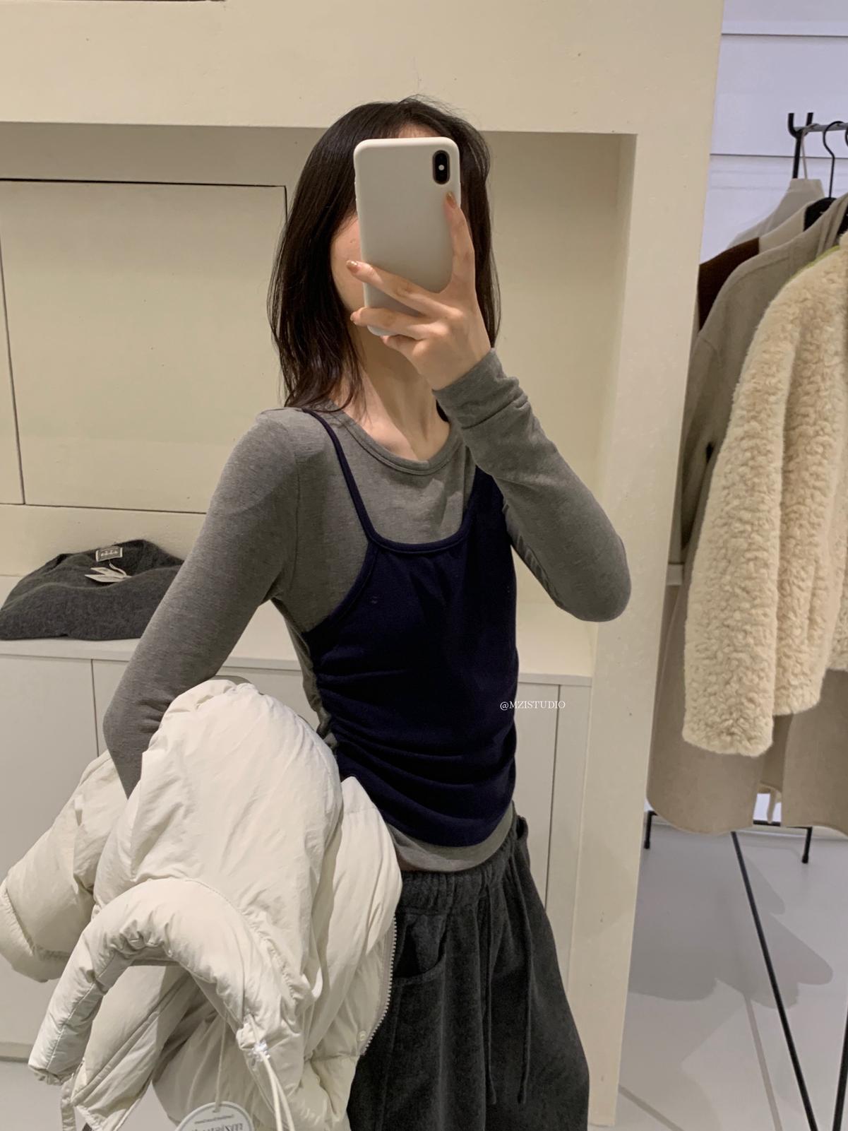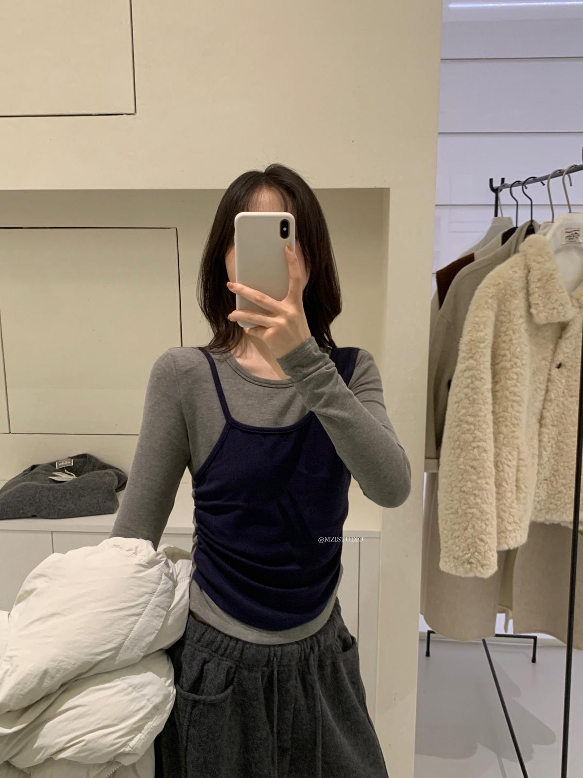 【C7880】凜冬時信韓感滿滿假兩件撞色磨毛收腰修身顯瘦長袖T恤