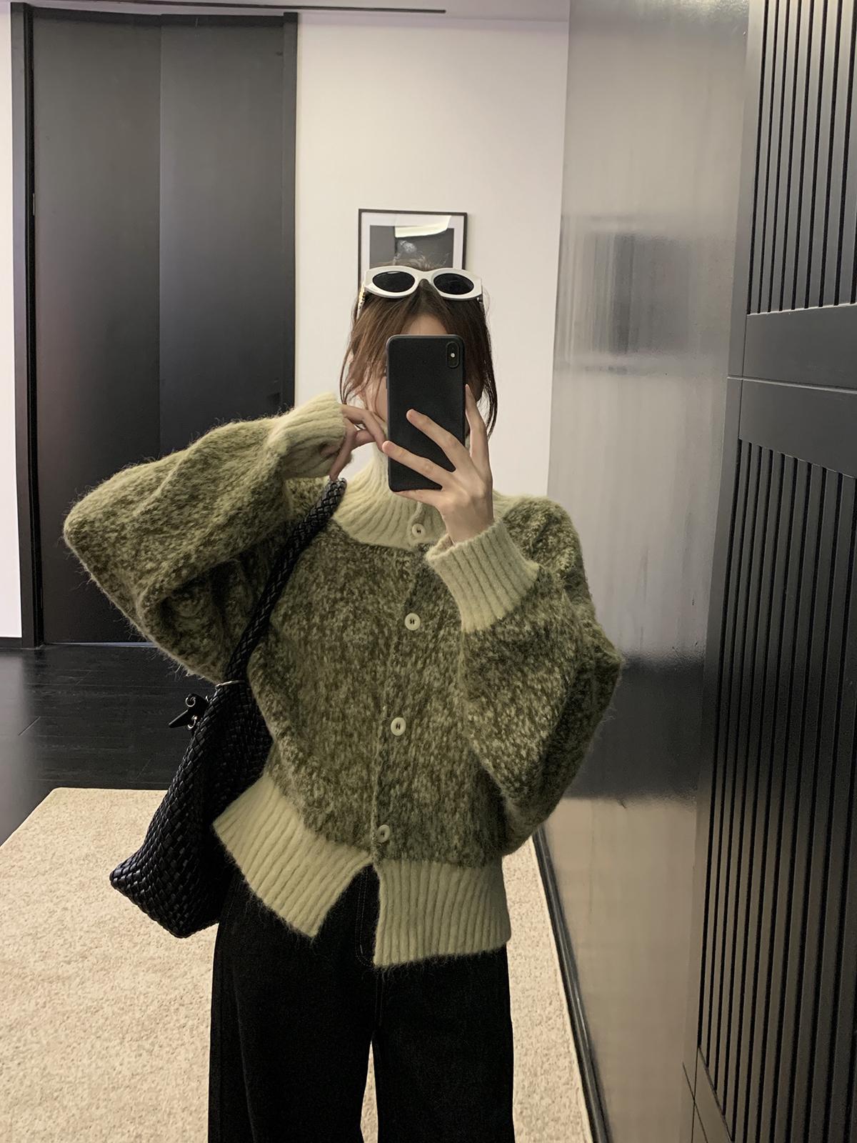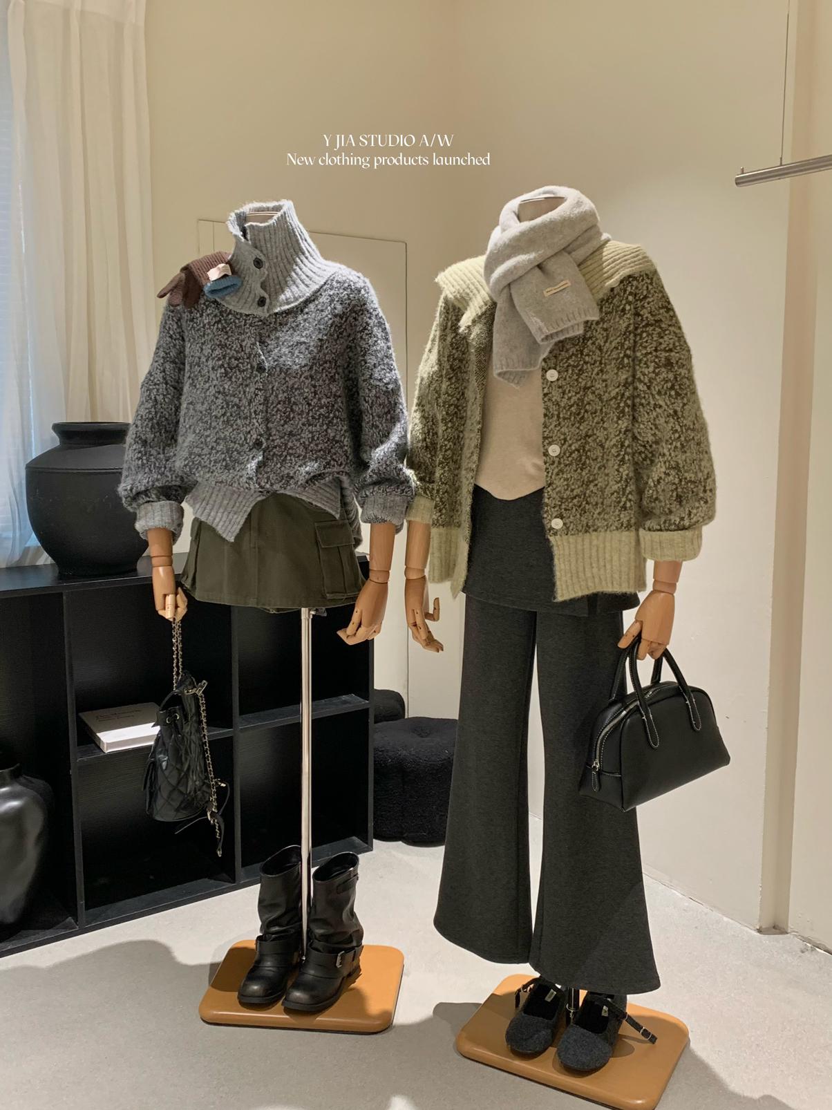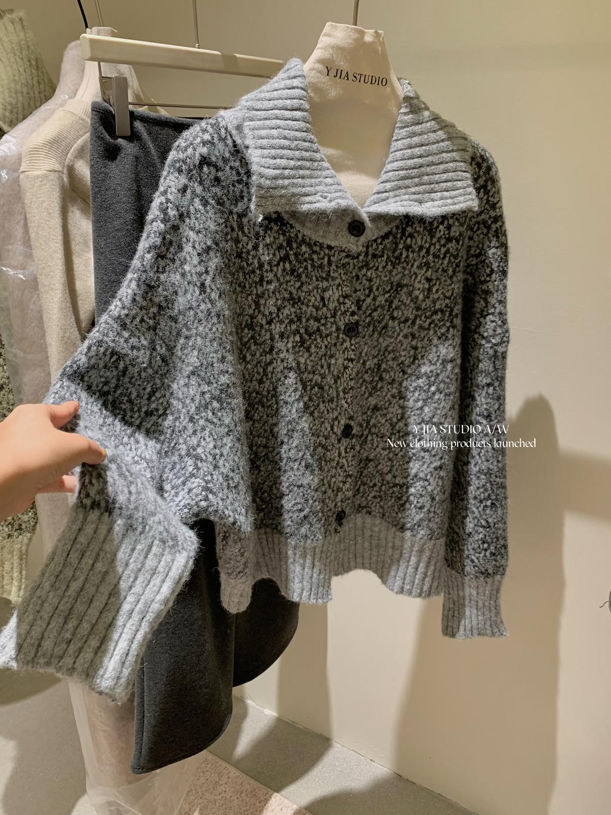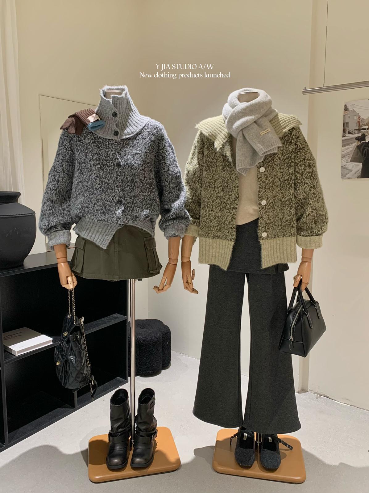 3. 【C7891】鬆弛意式慵懶設計感百搭大翻領立領兩穿混色開衫保暖毛衣