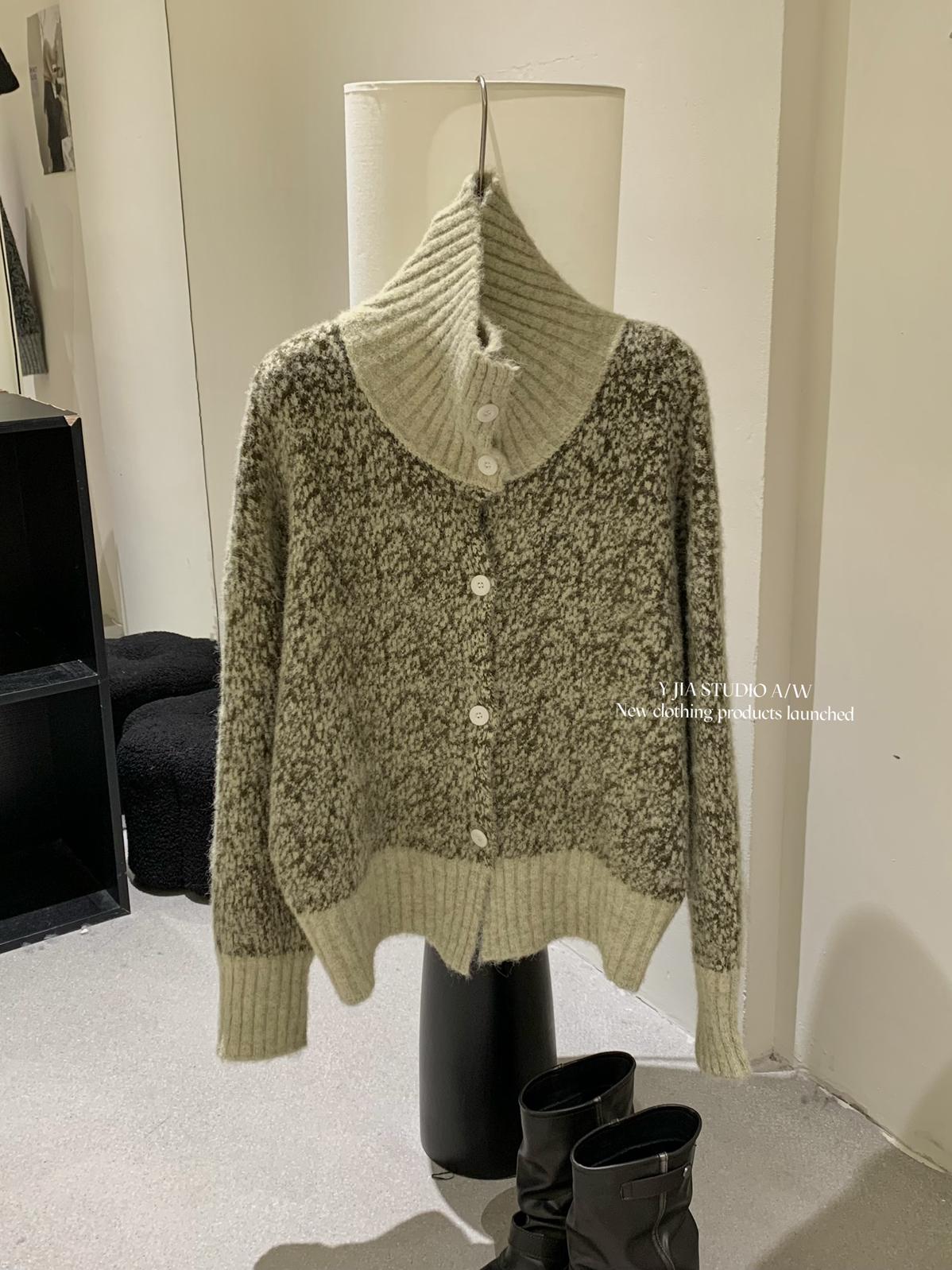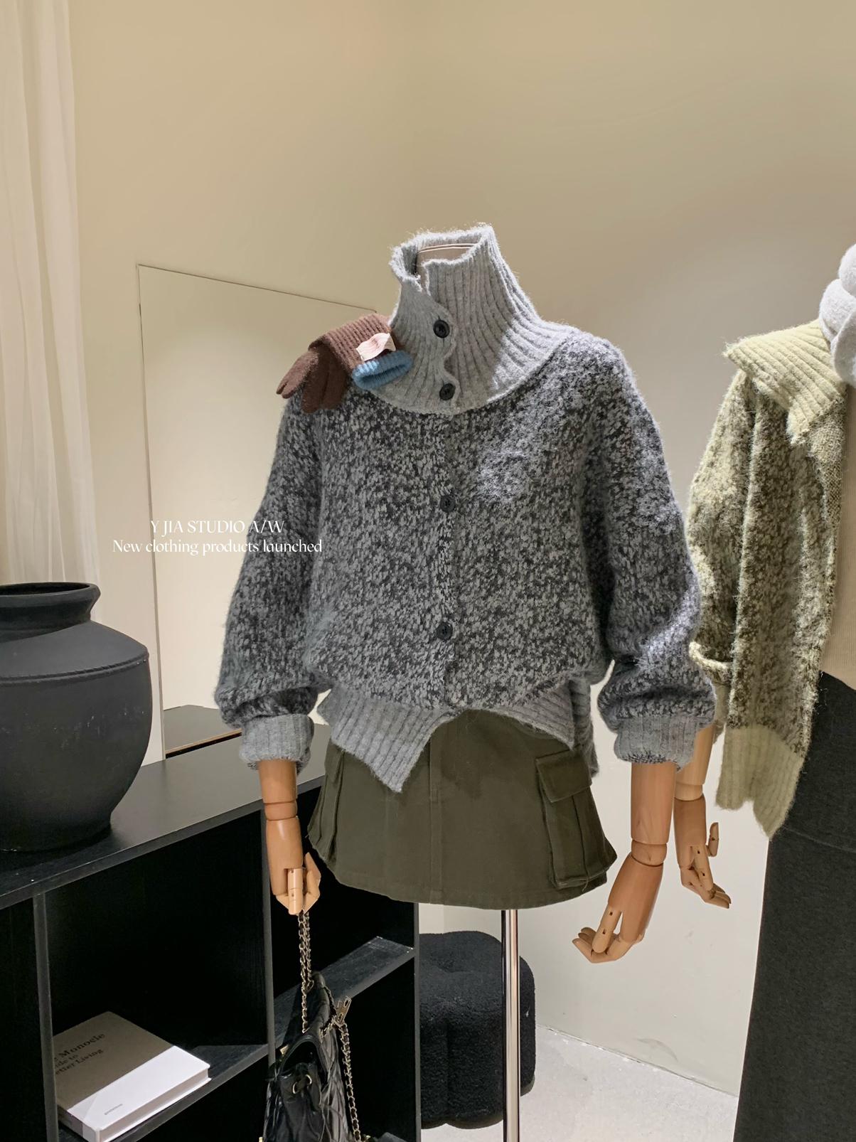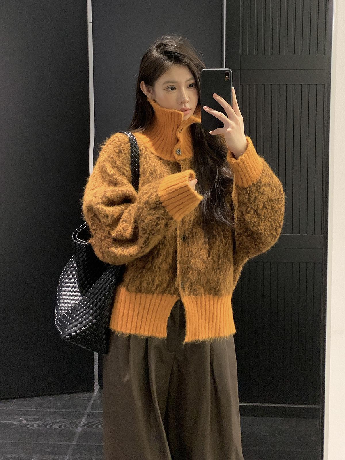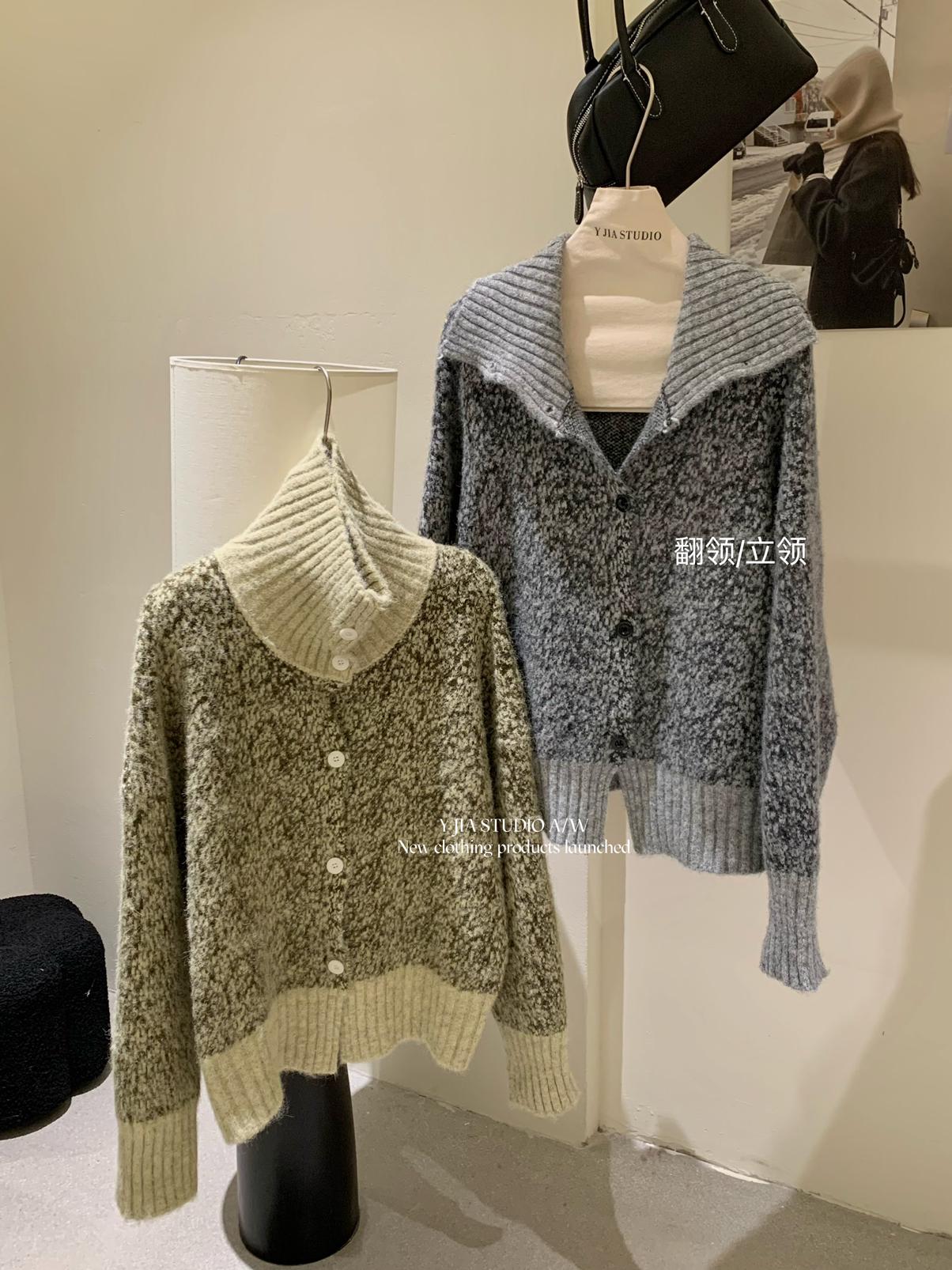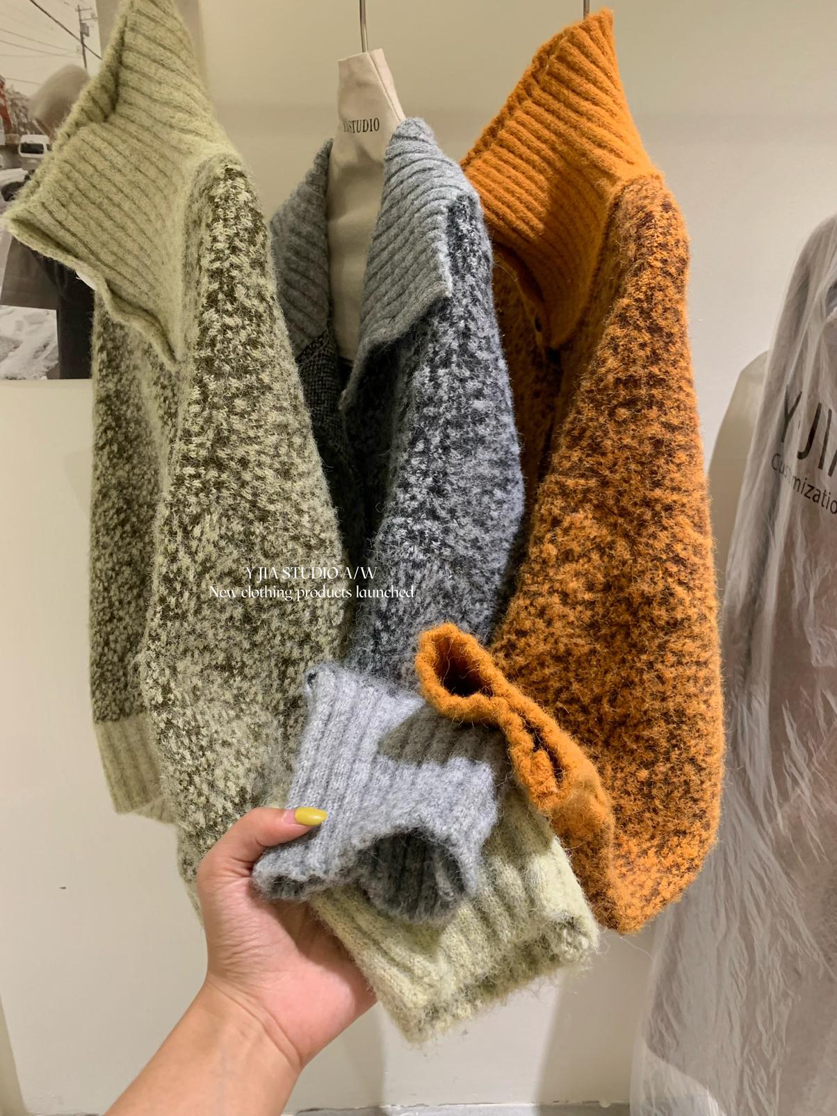 【C7891】鬆弛意式慵懶設計感百搭大翻領立領兩穿混色開衫保暖毛衣