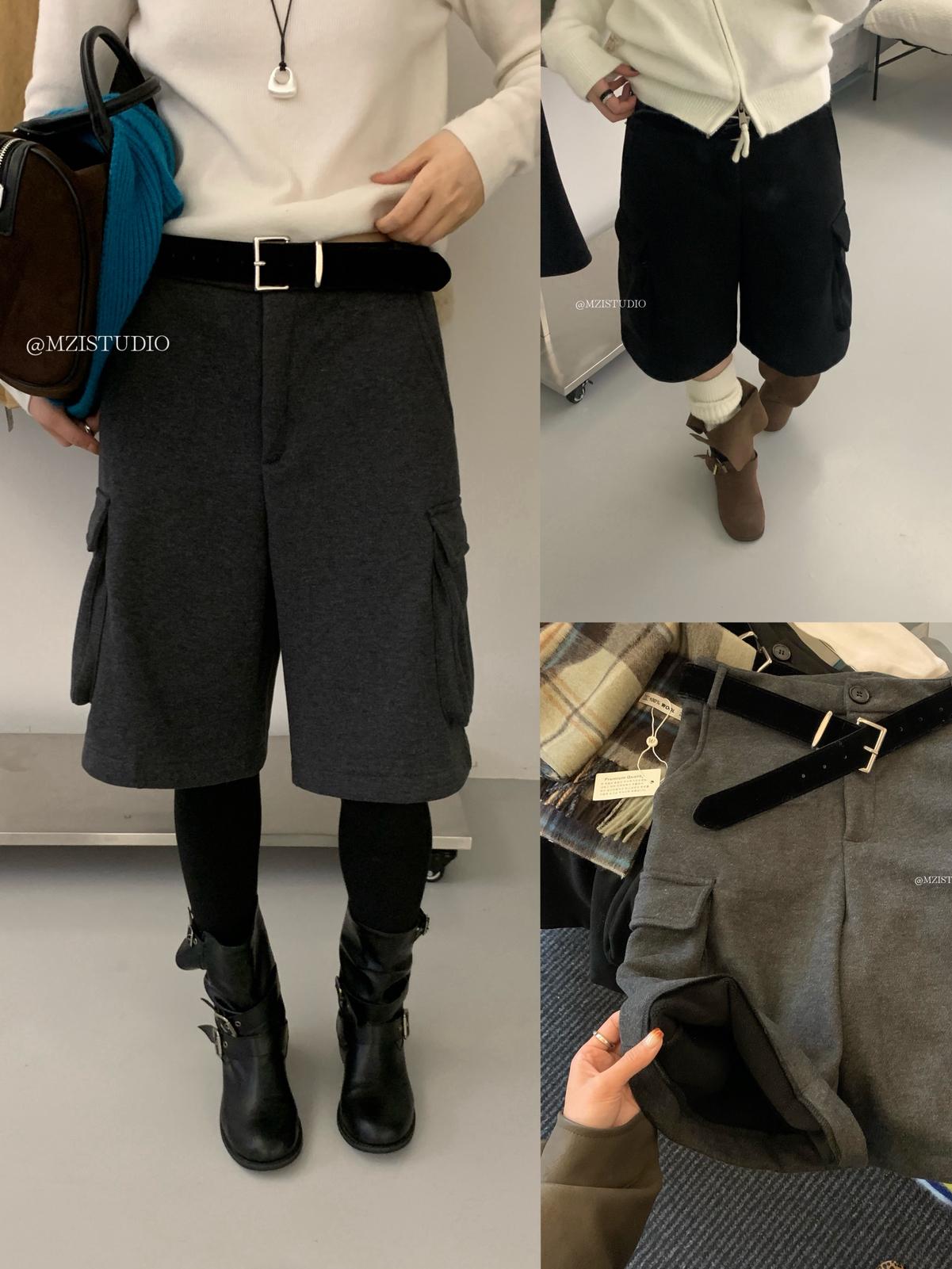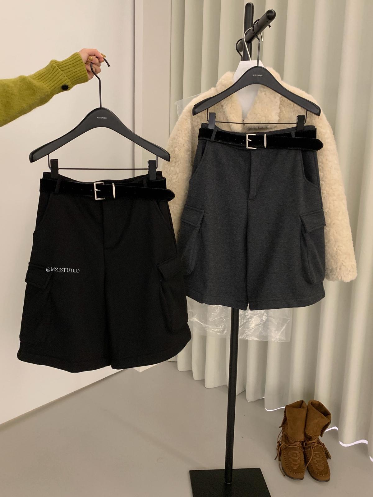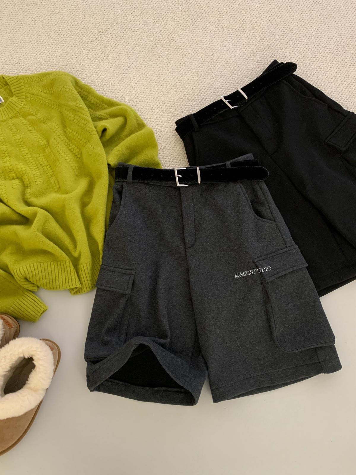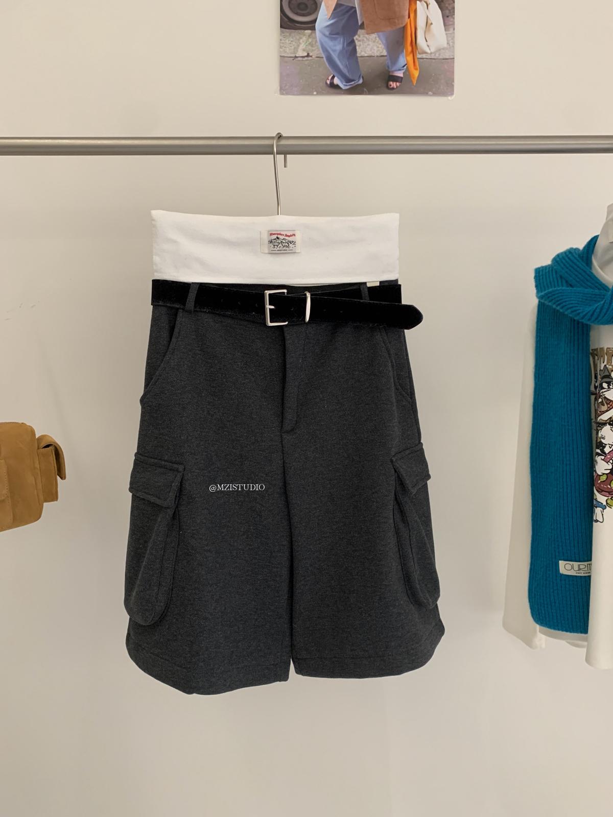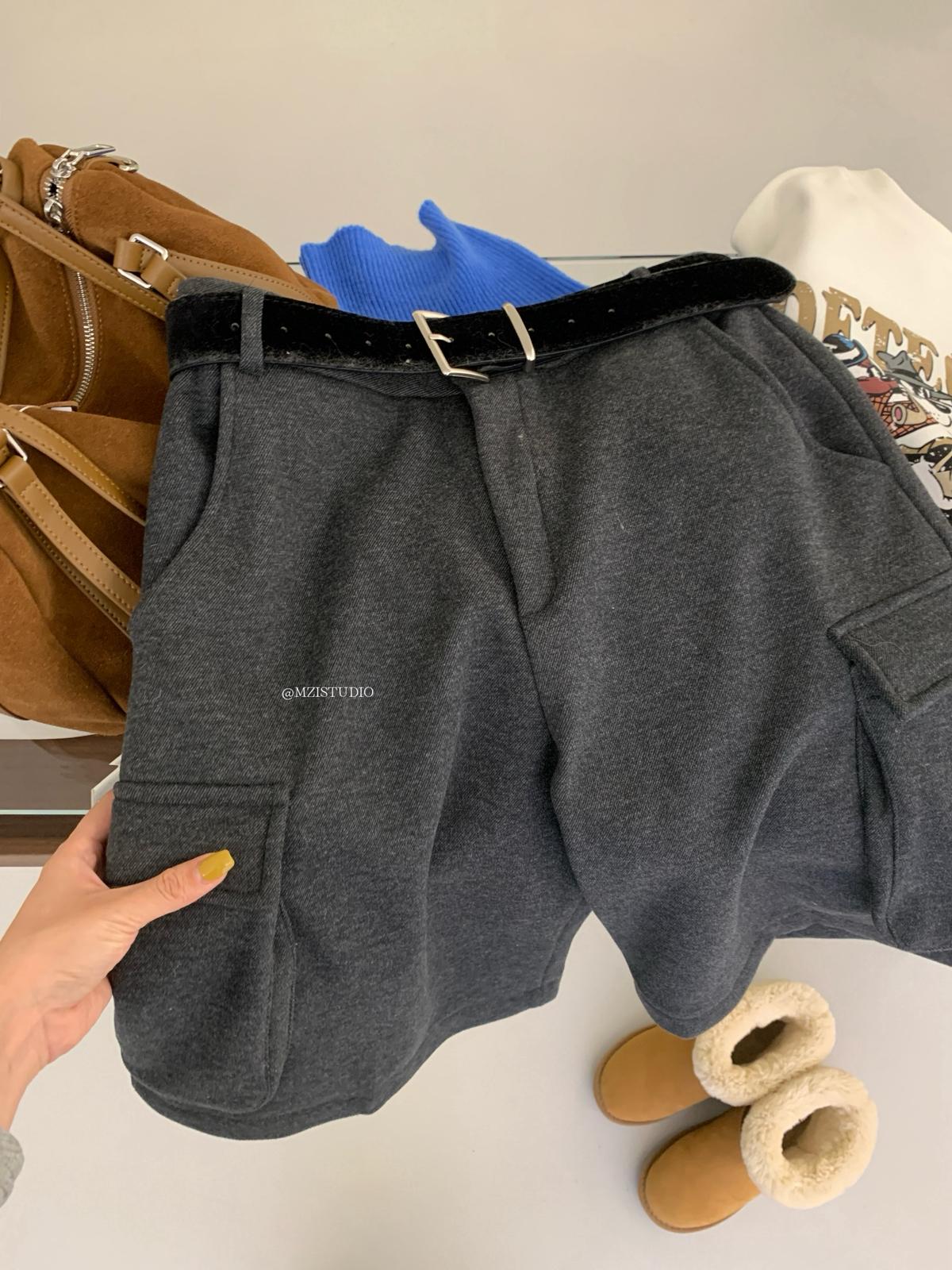 【C7903】首爾高智格雷系冬季加絨加厚大口袋低飽和五分工裝褲(配皮帶)