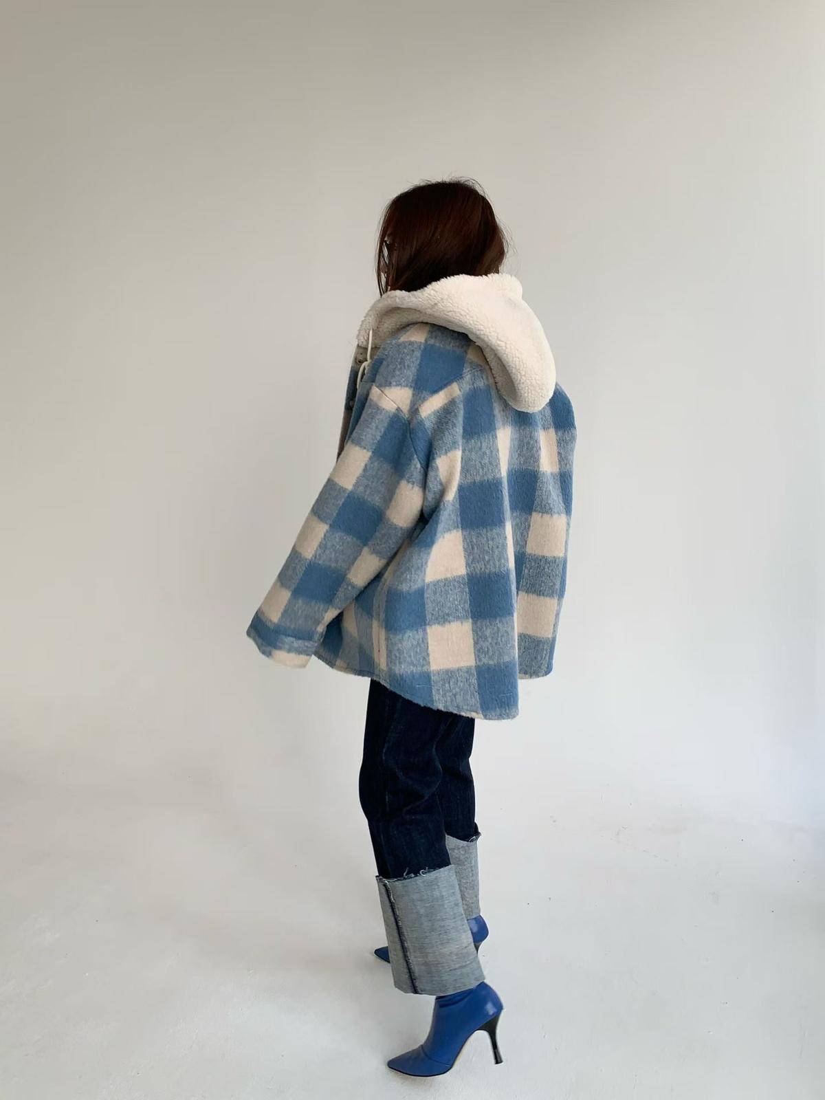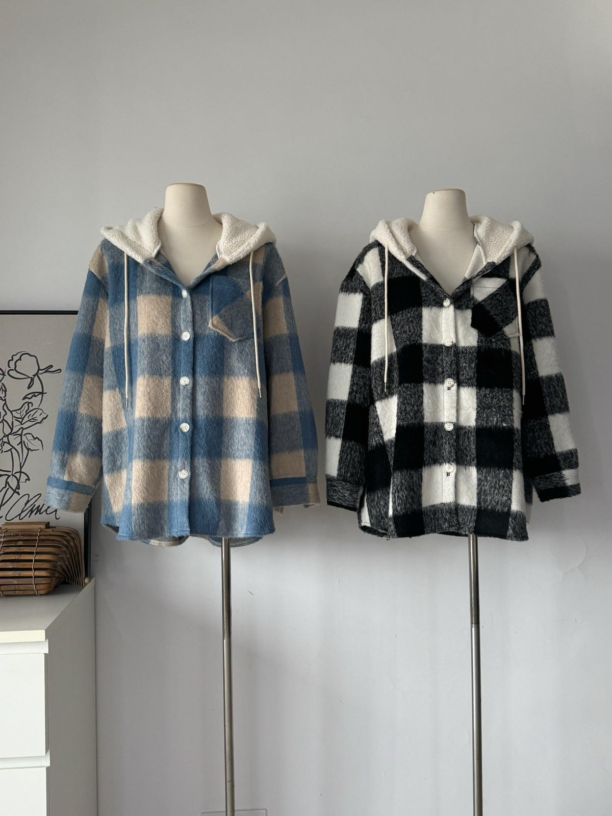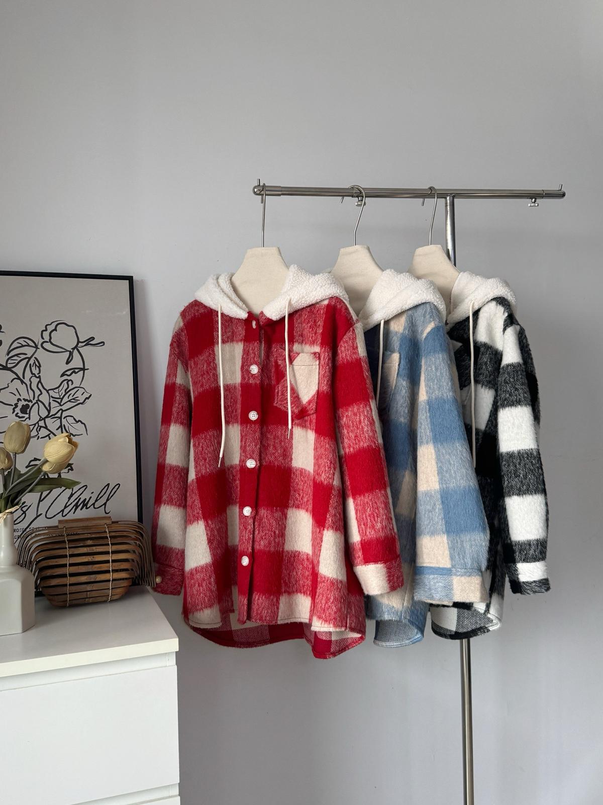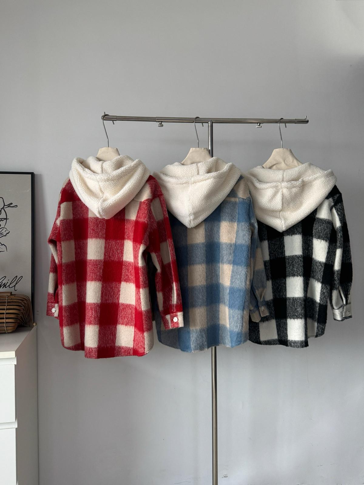 3. 【C7908】冬季新款外套上衣時髦毛絨連帽格子外套短外套