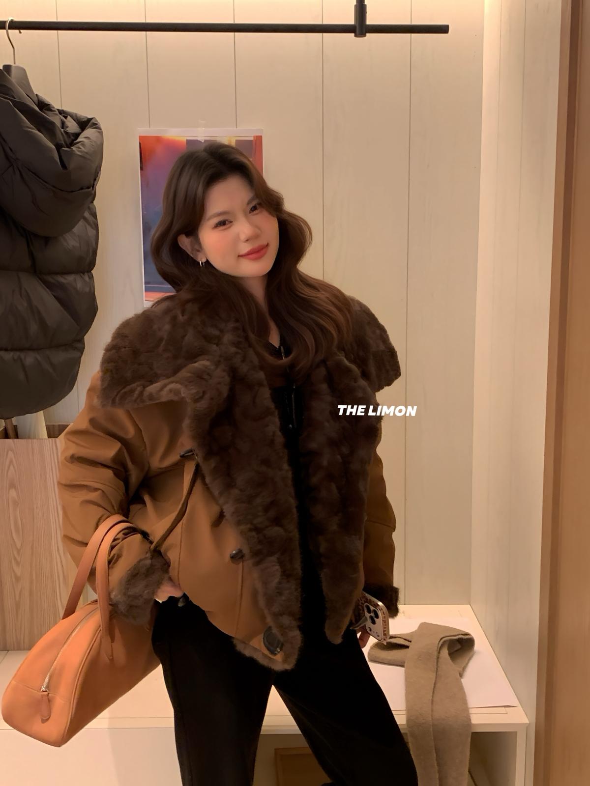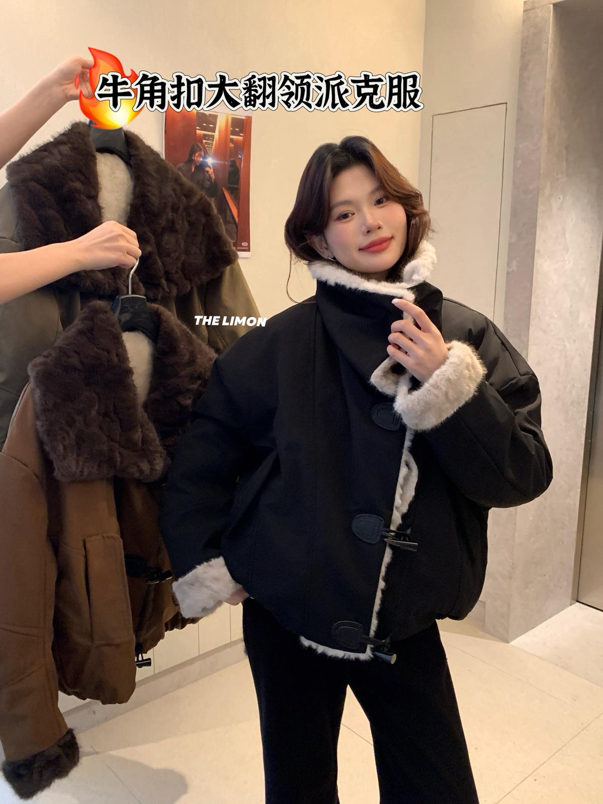 【C7909】環保毛翻領百搭牛角扣毛毛短外套