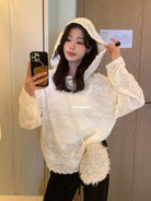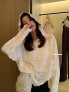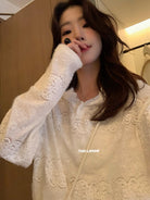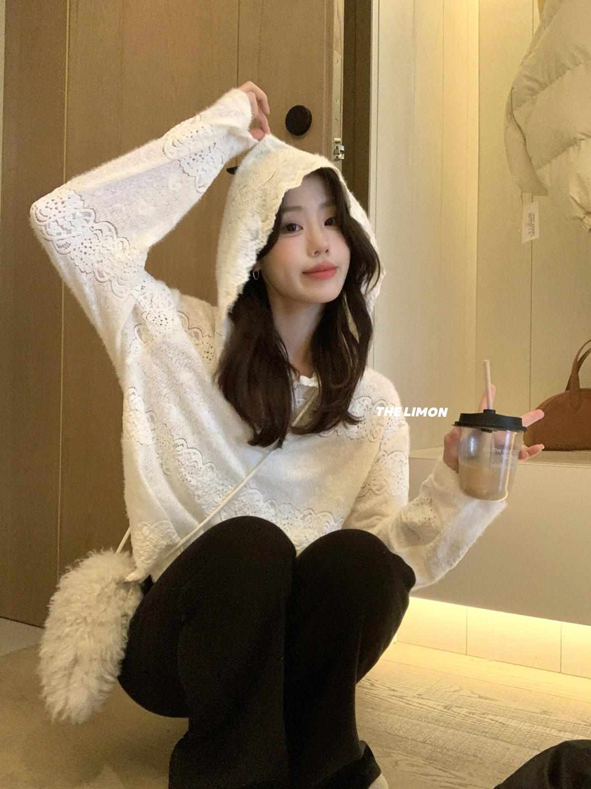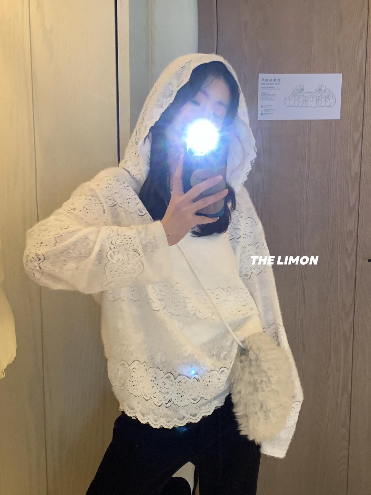 【C7911】重工鉤花蕾絲拼接連帽微彈小衫