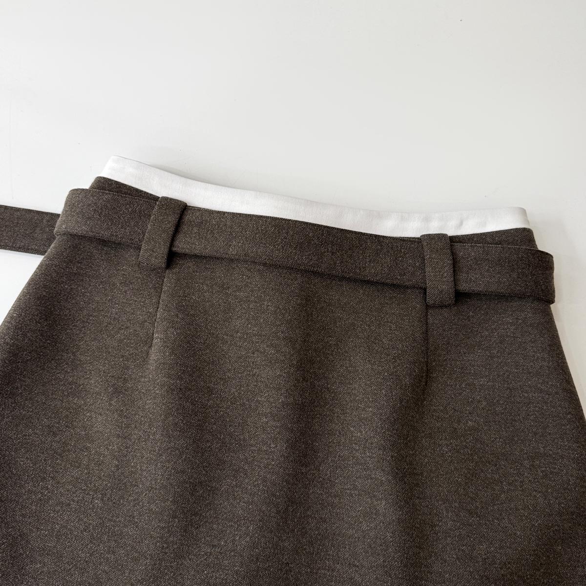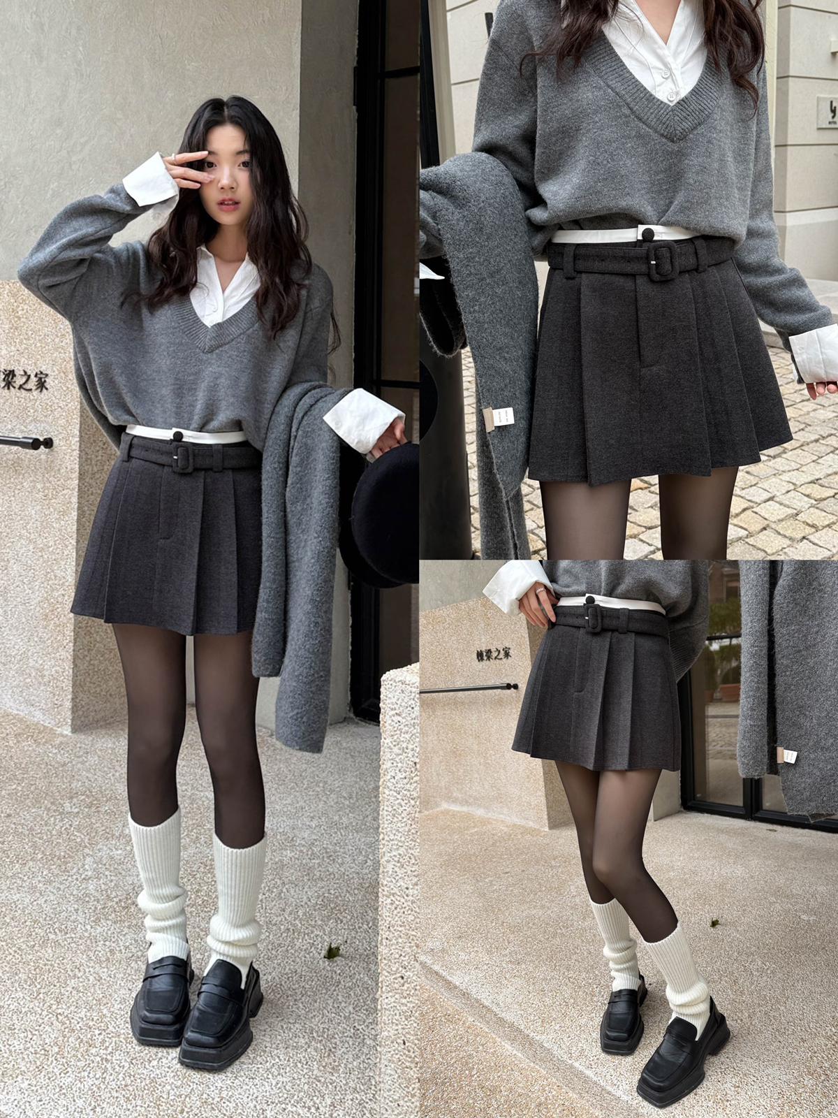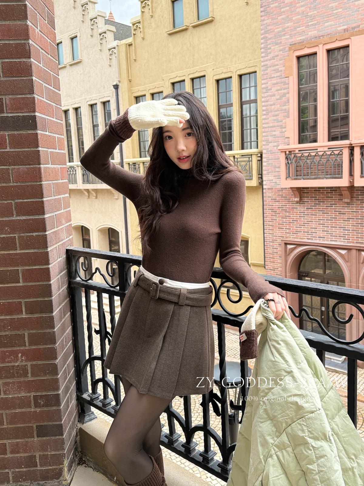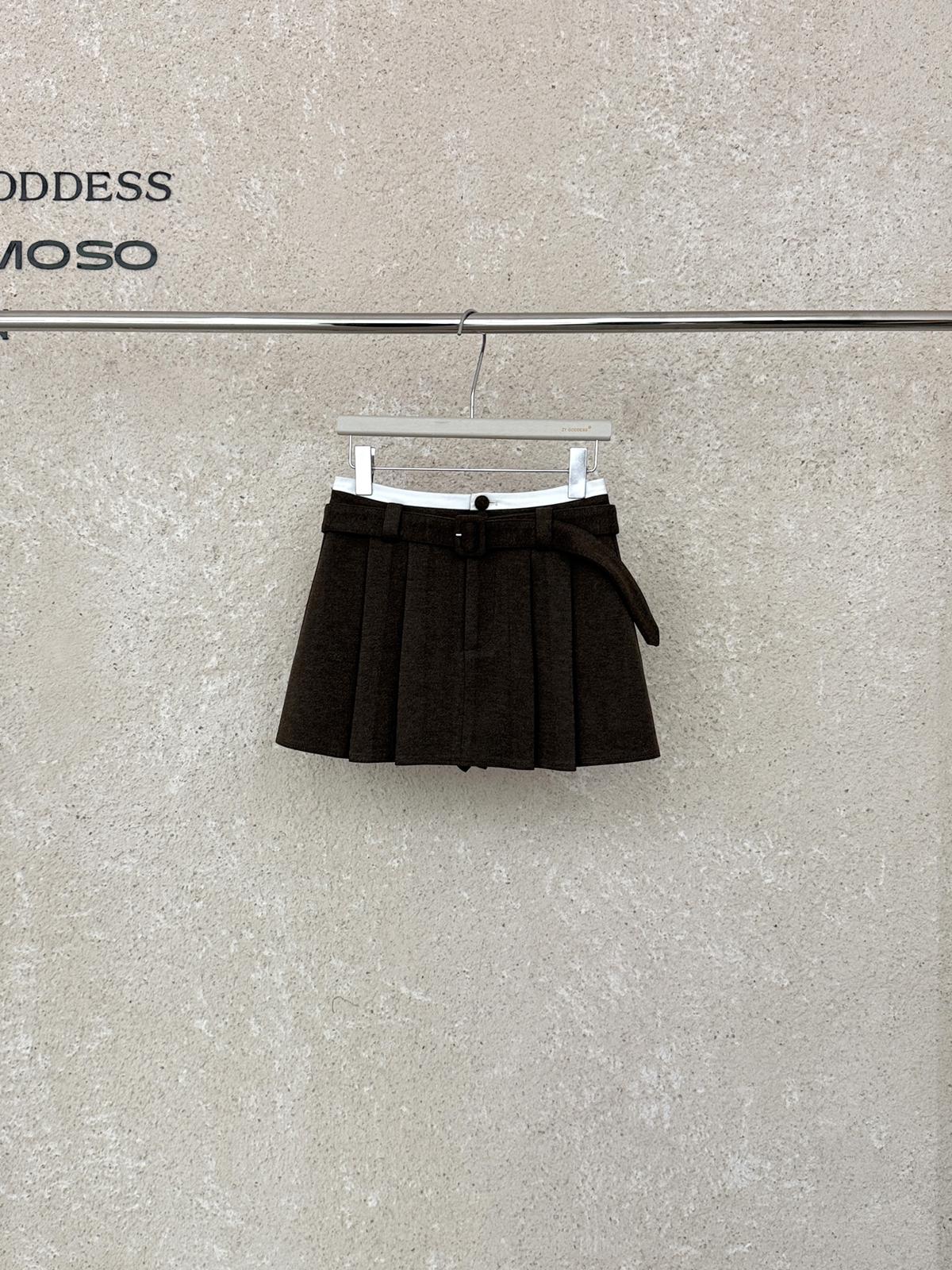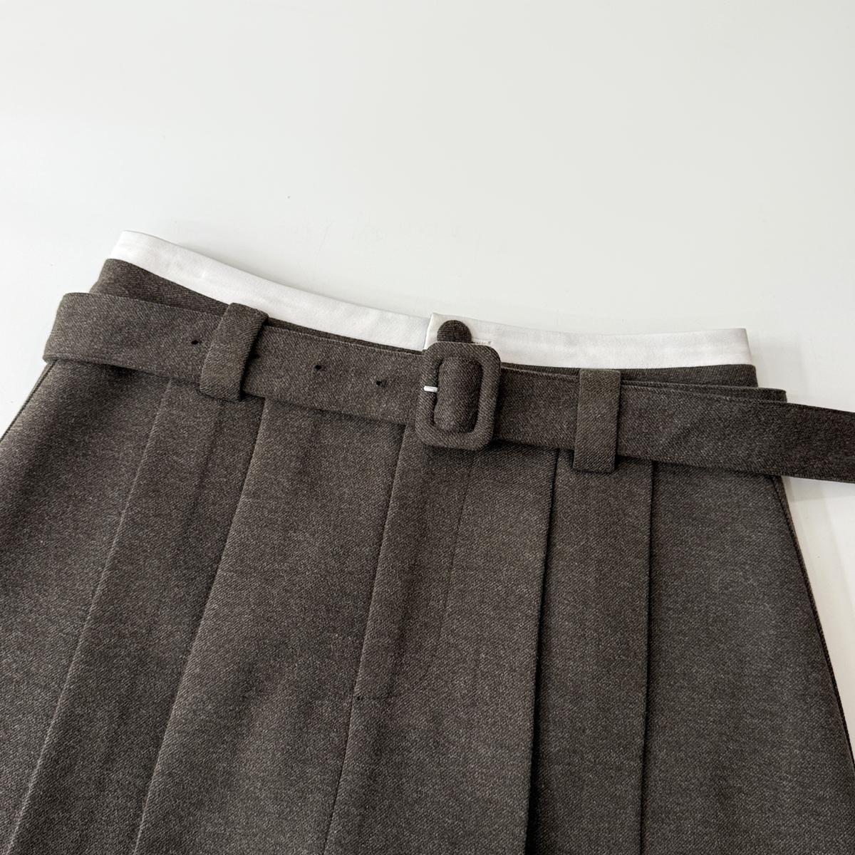 【C7917】韓系甜美學院風復古撞色拼接高腰顯瘦A字羊毛毛呢百褶短裙半身裙(配腰帶)(含10%羊毛)