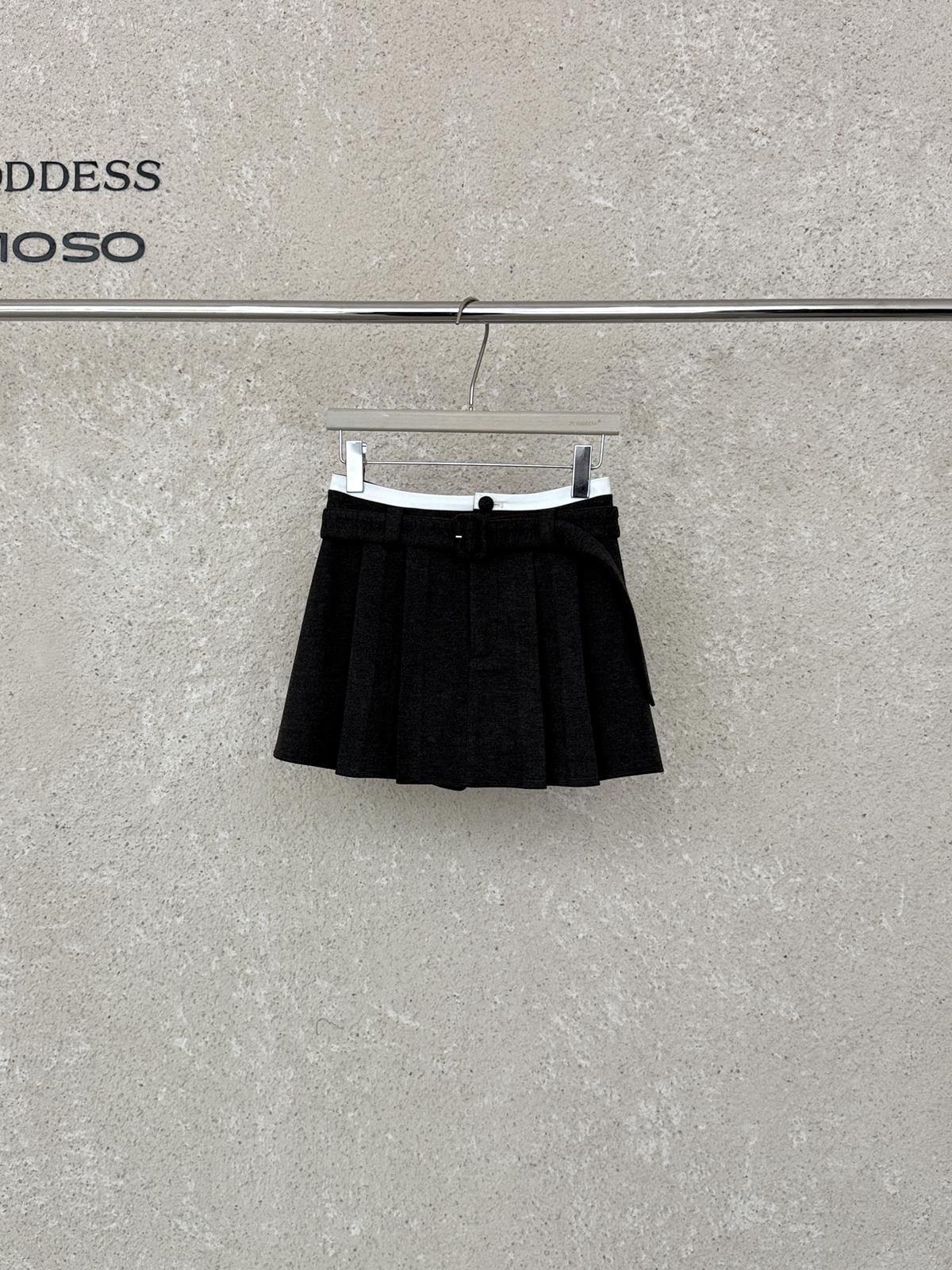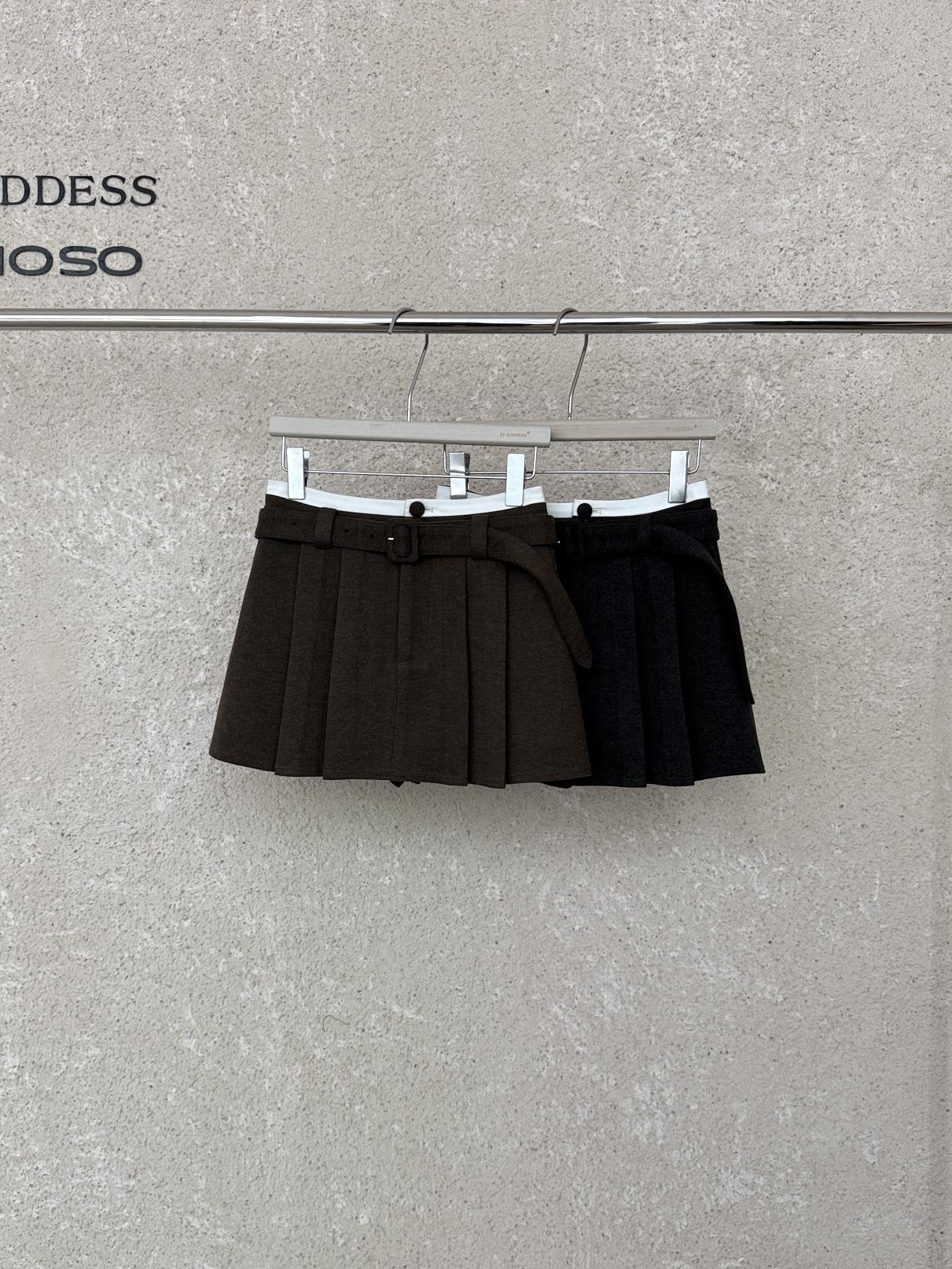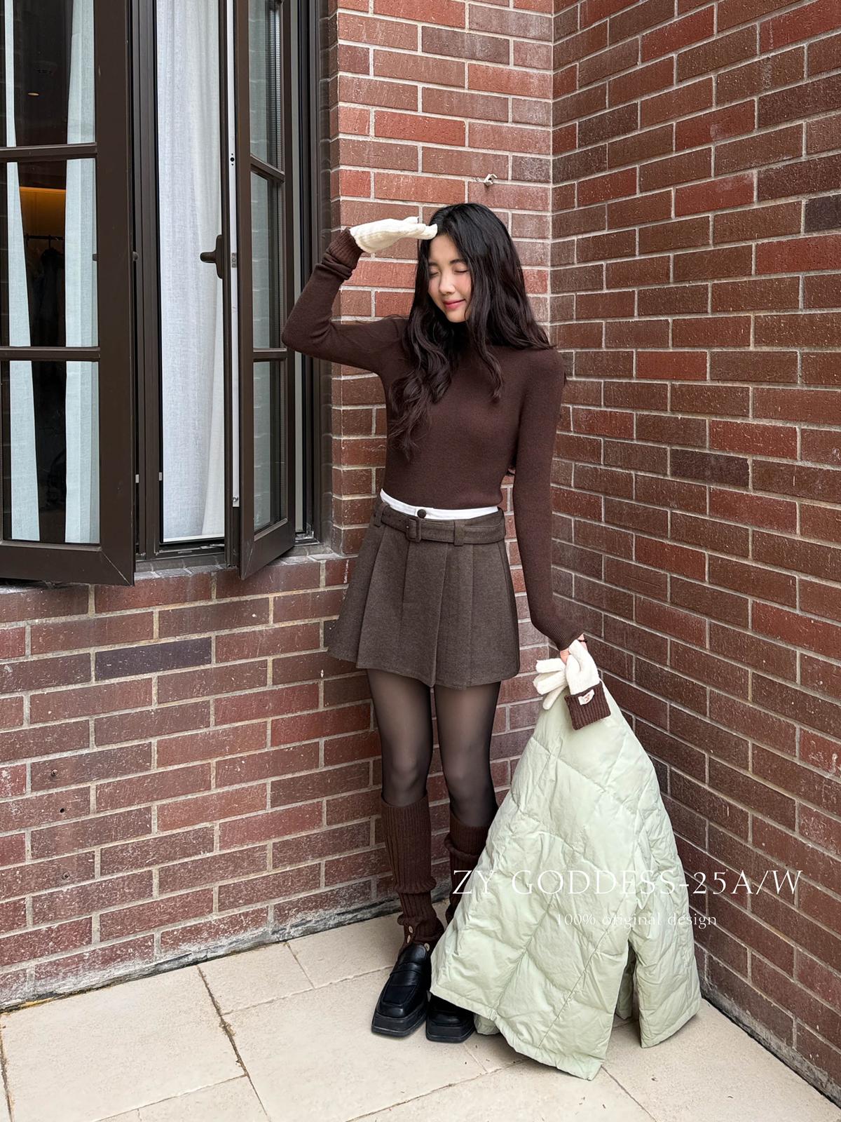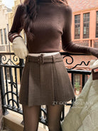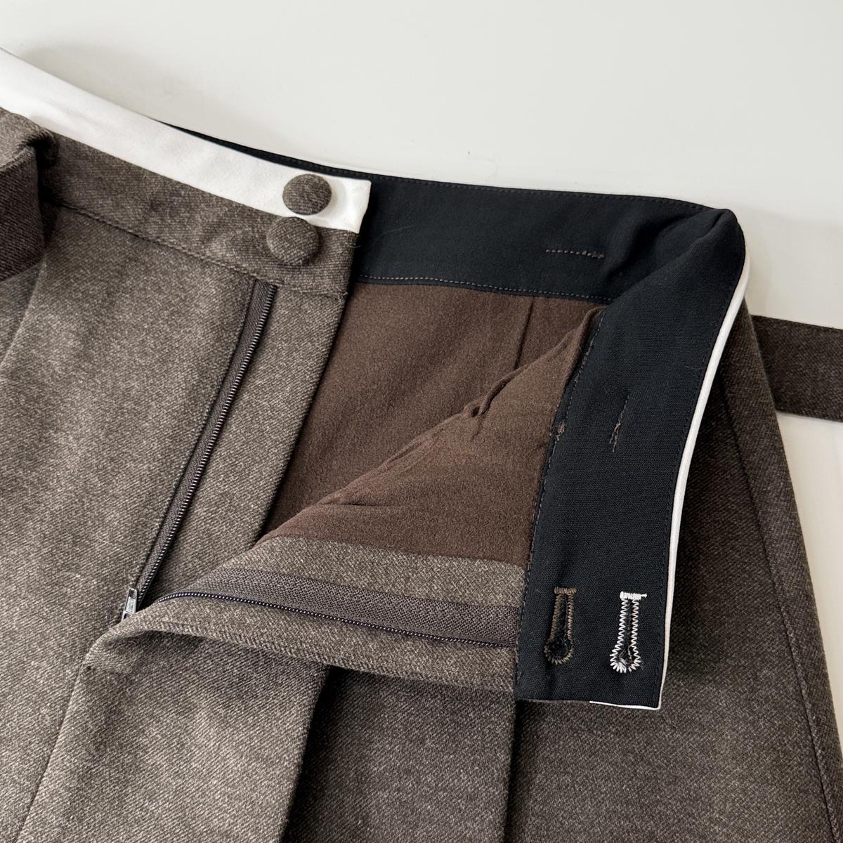 【C7917】韓系甜美學院風復古撞色拼接高腰顯瘦A字羊毛毛呢百褶短裙半身裙(配腰帶)(含10%羊毛)