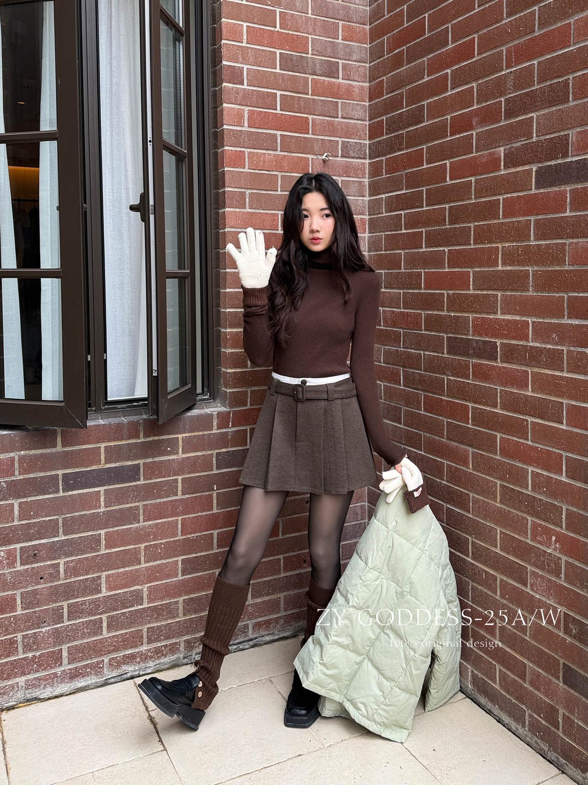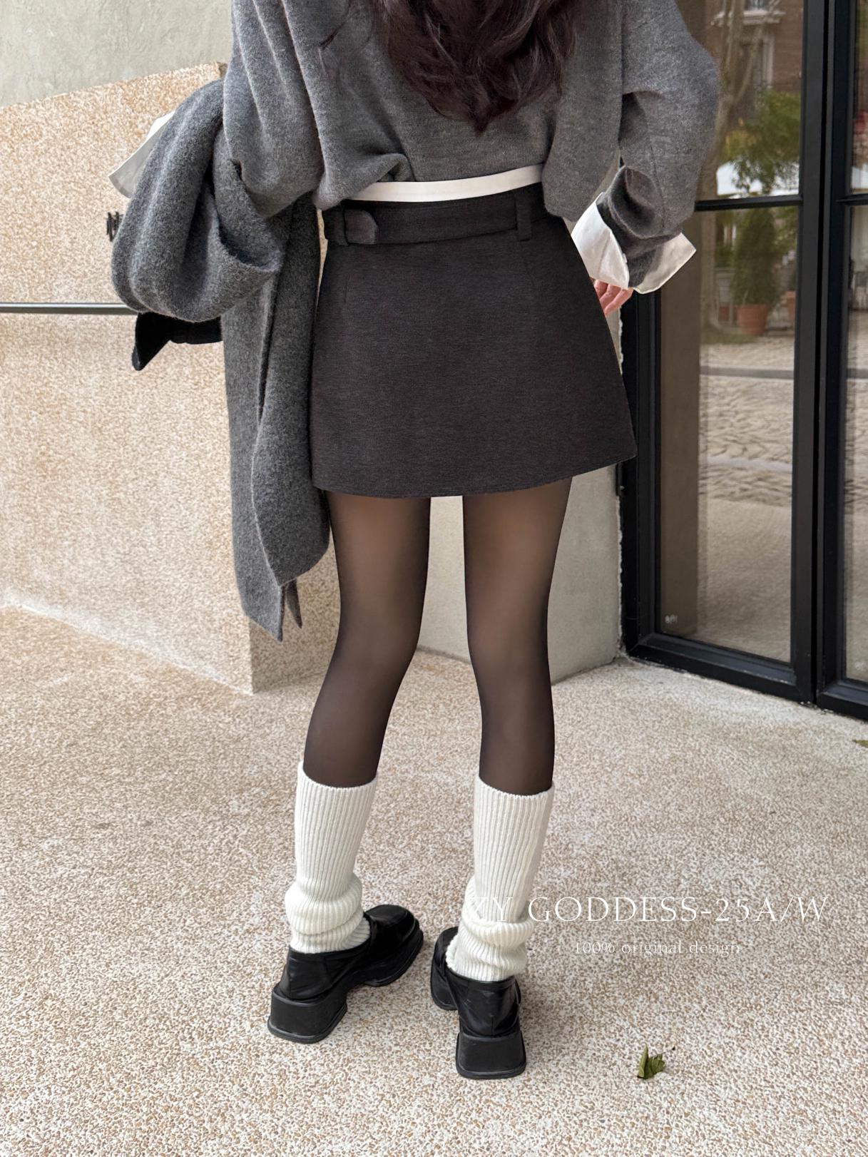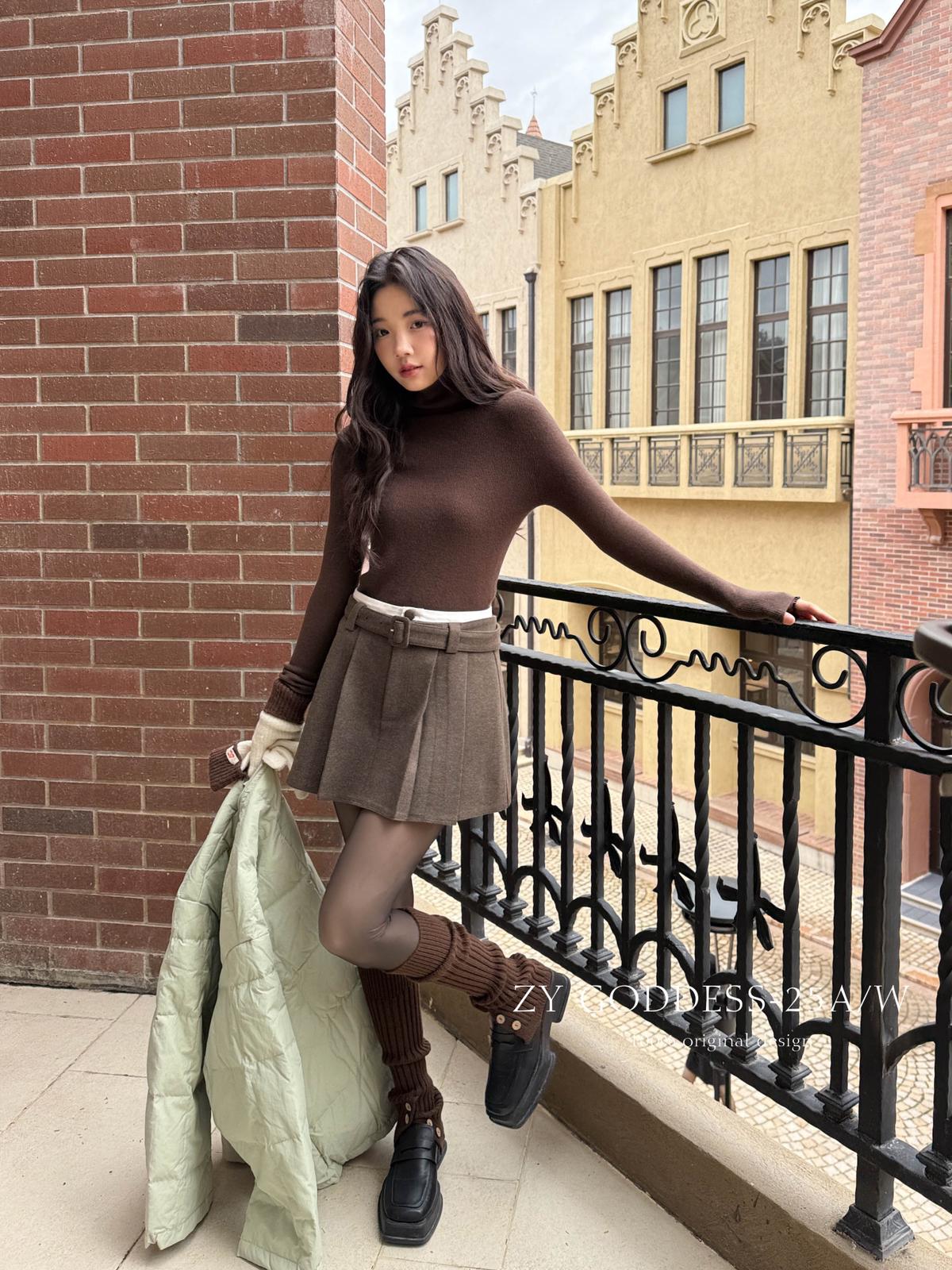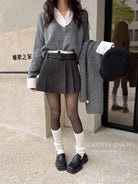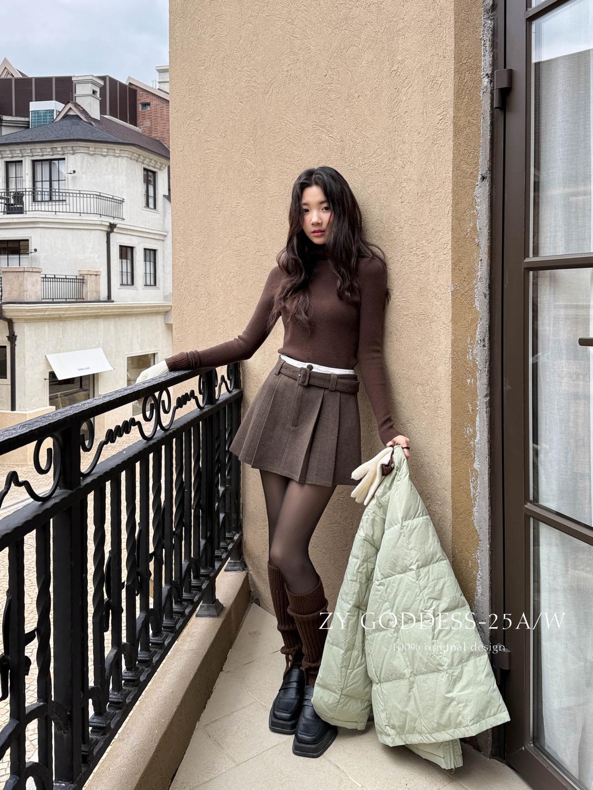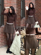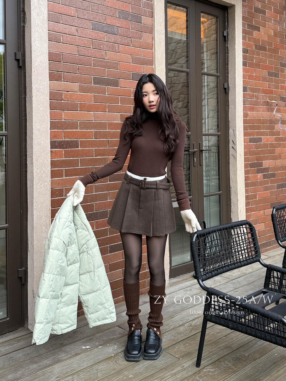 【C7917】韓系甜美學院風復古撞色拼接高腰顯瘦A字羊毛毛呢百褶短裙半身裙(配腰帶)(含10%羊毛)